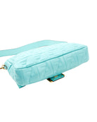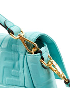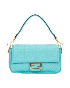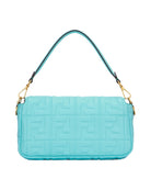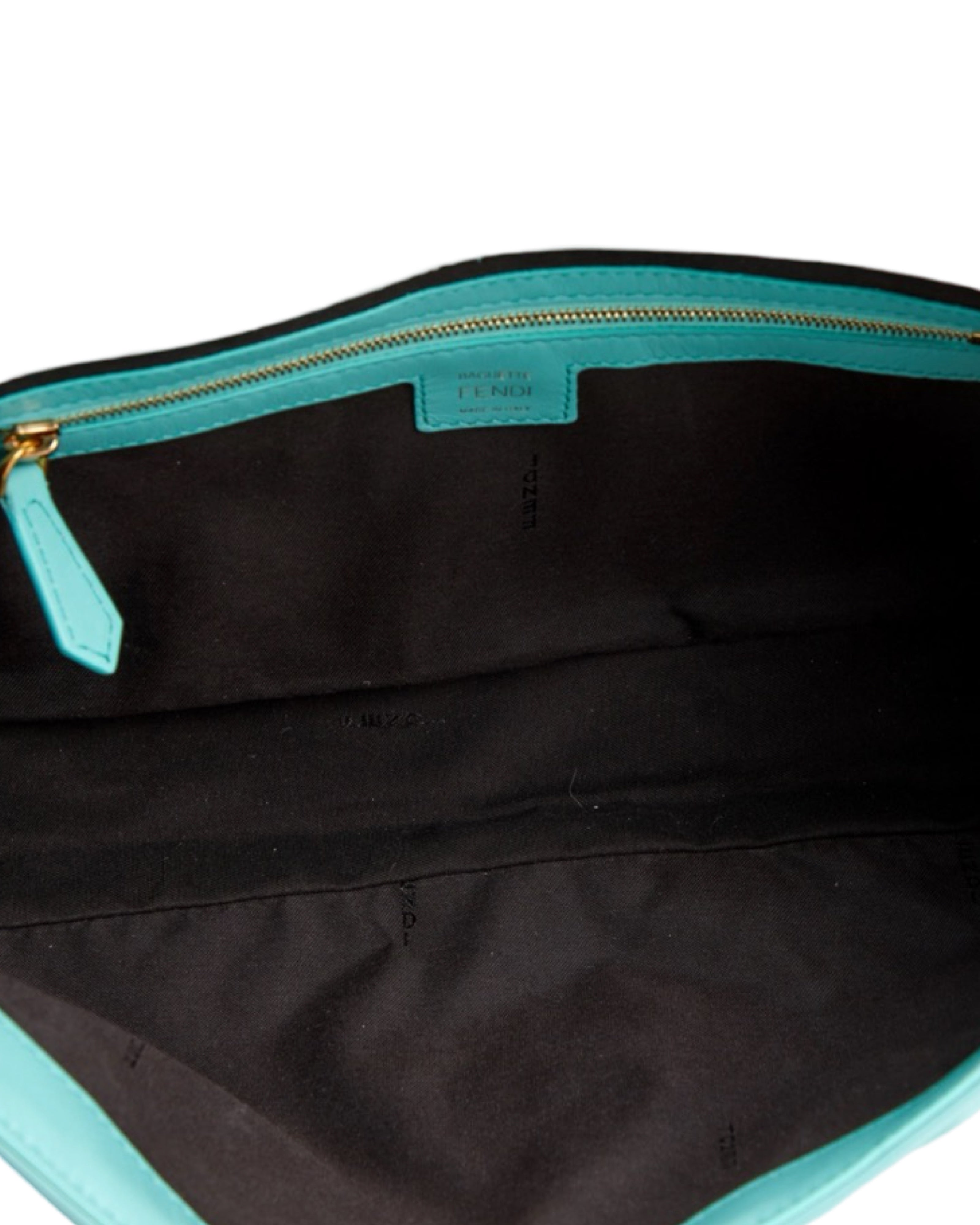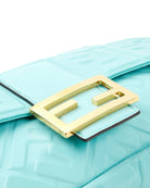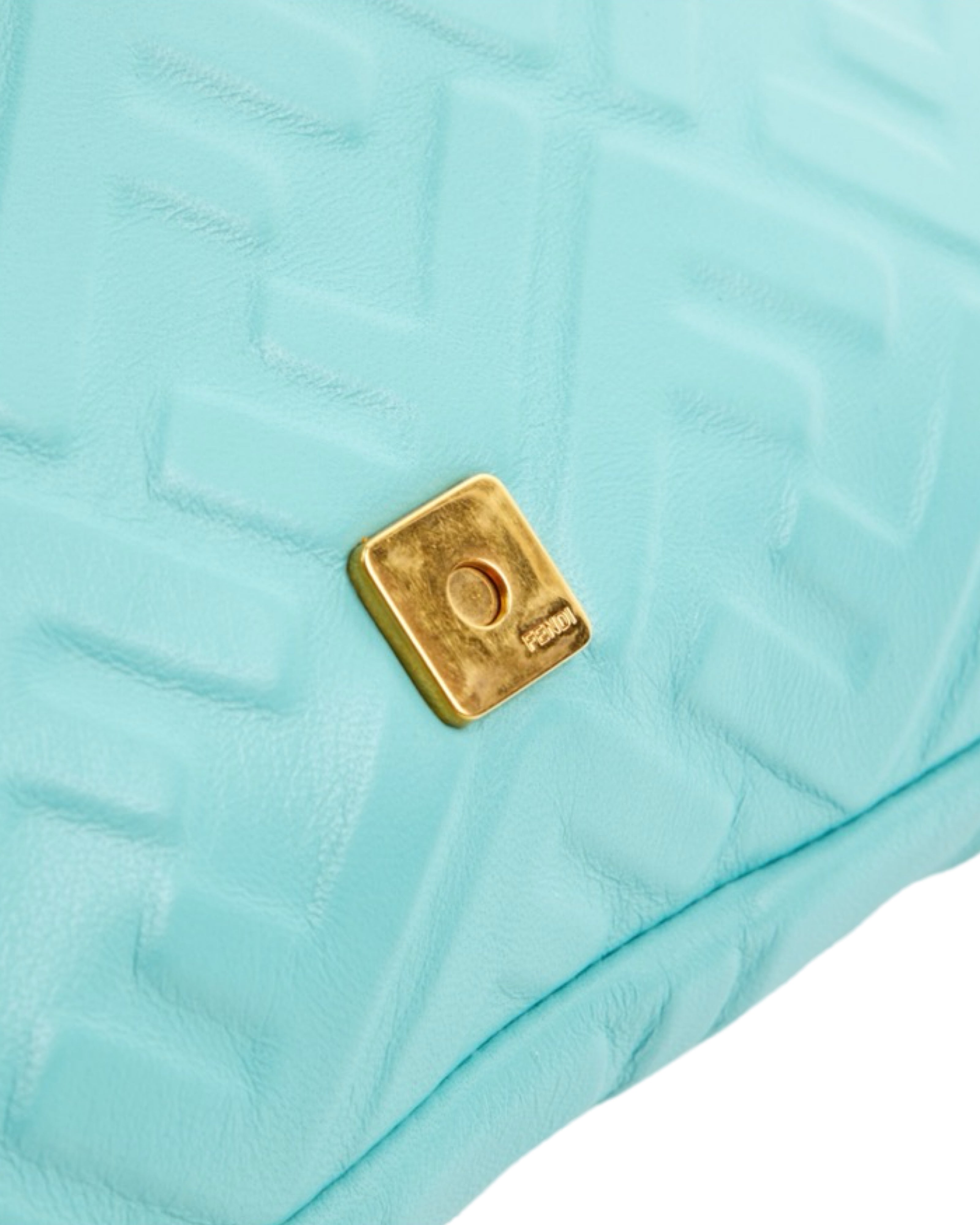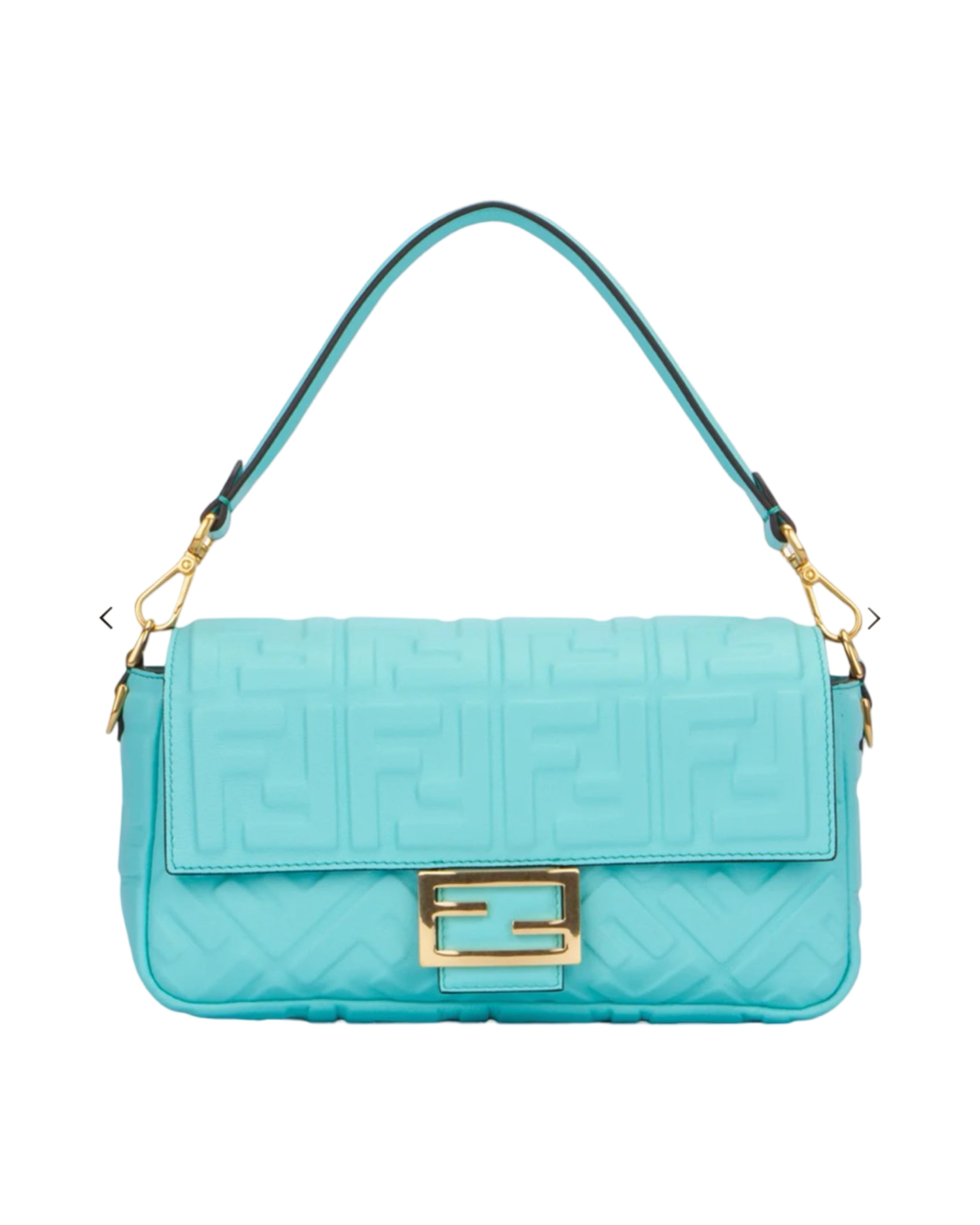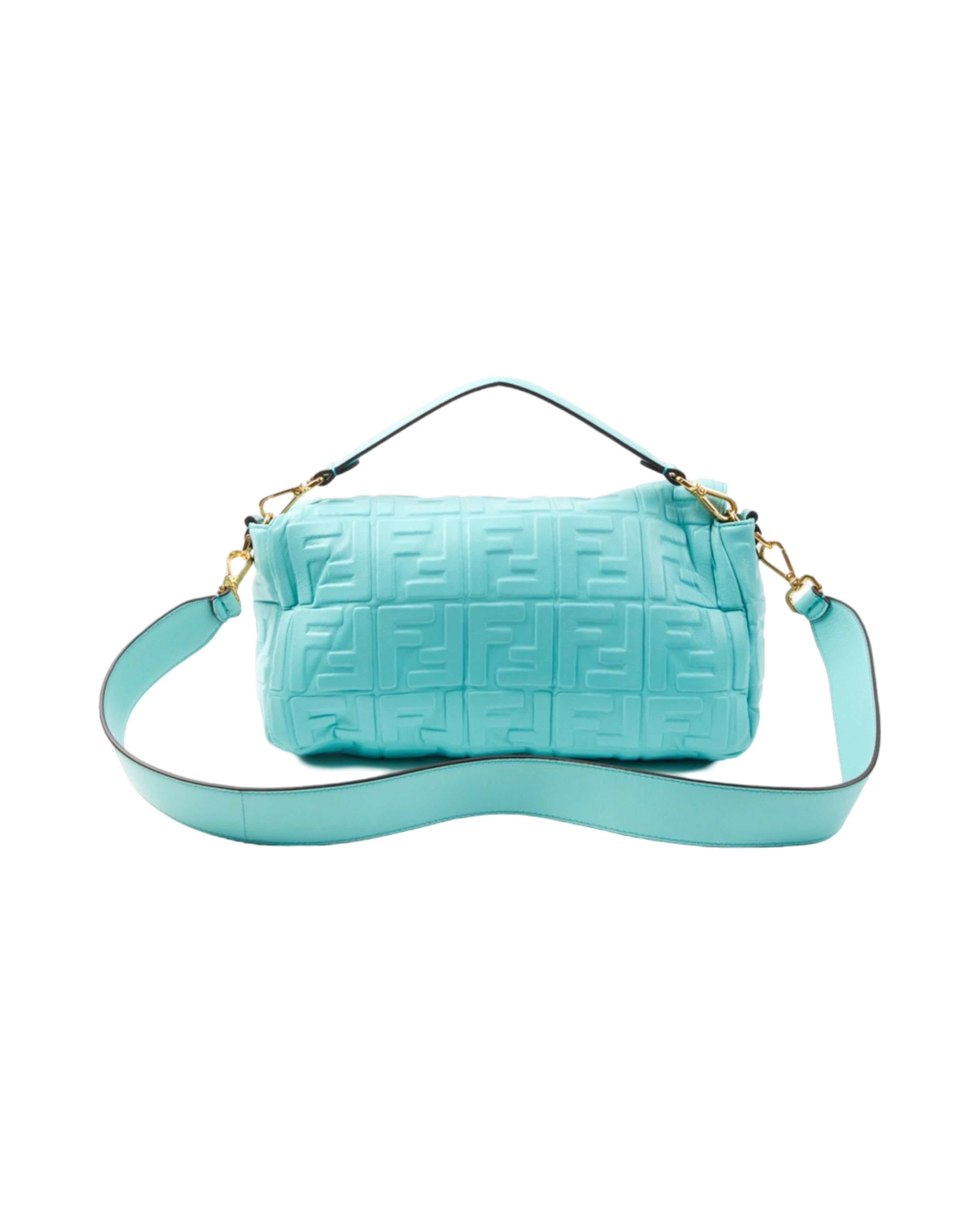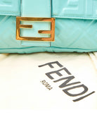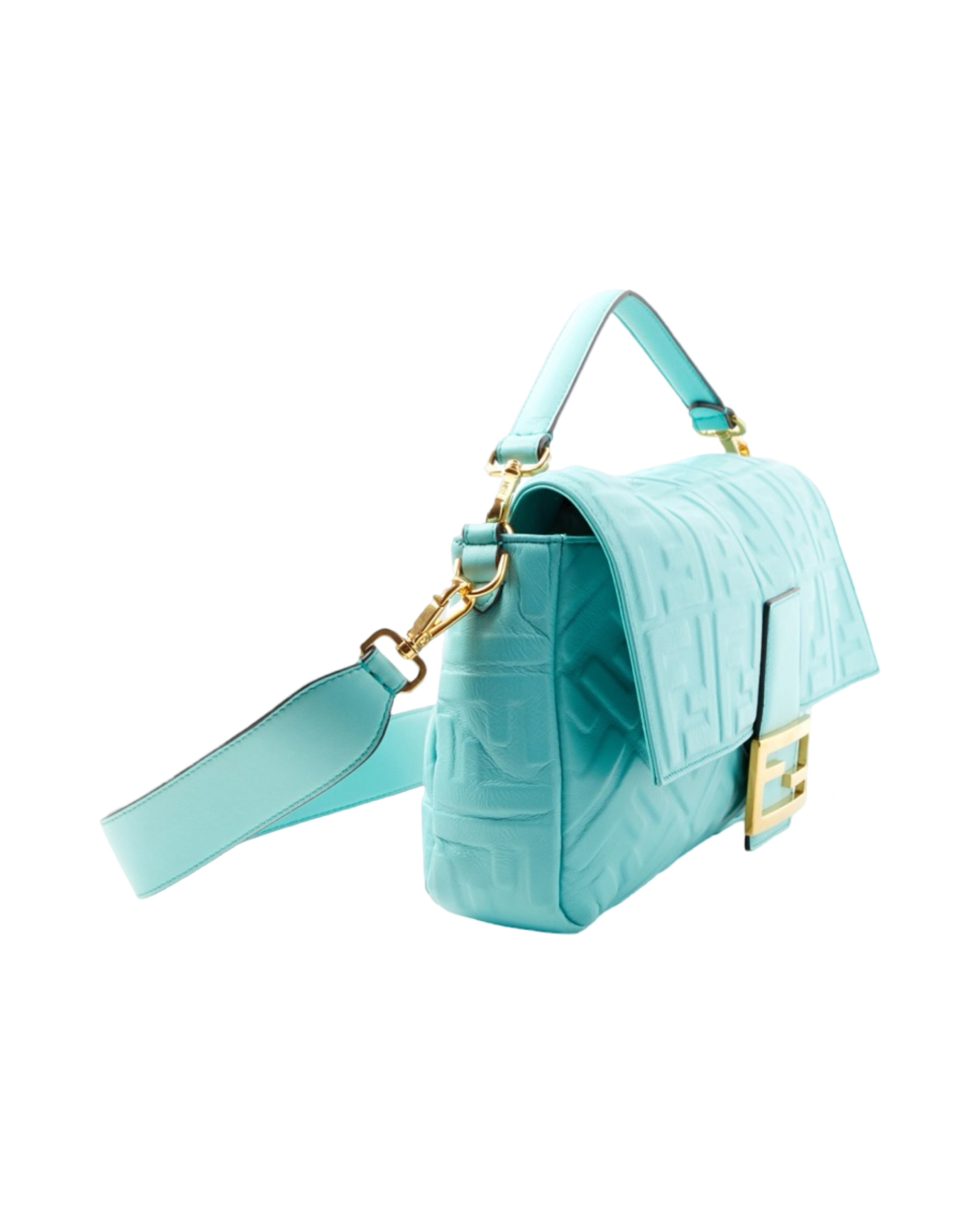 Indulge in luxury with the Fendi baguette bag. The iconic design features monogram F-logo pattern. Made from turquoise lambskin, this bag boasts a natural grain and metal-free tanning process. The front flap, magnetic clasp, and internal compartments provide both style and functionality. An FF clasp and palladium-finish hardware add the perfect finishing touch. Can we worn over the shoulder and crossbody. The bag is in great condition. Will be sold with original dustbag.