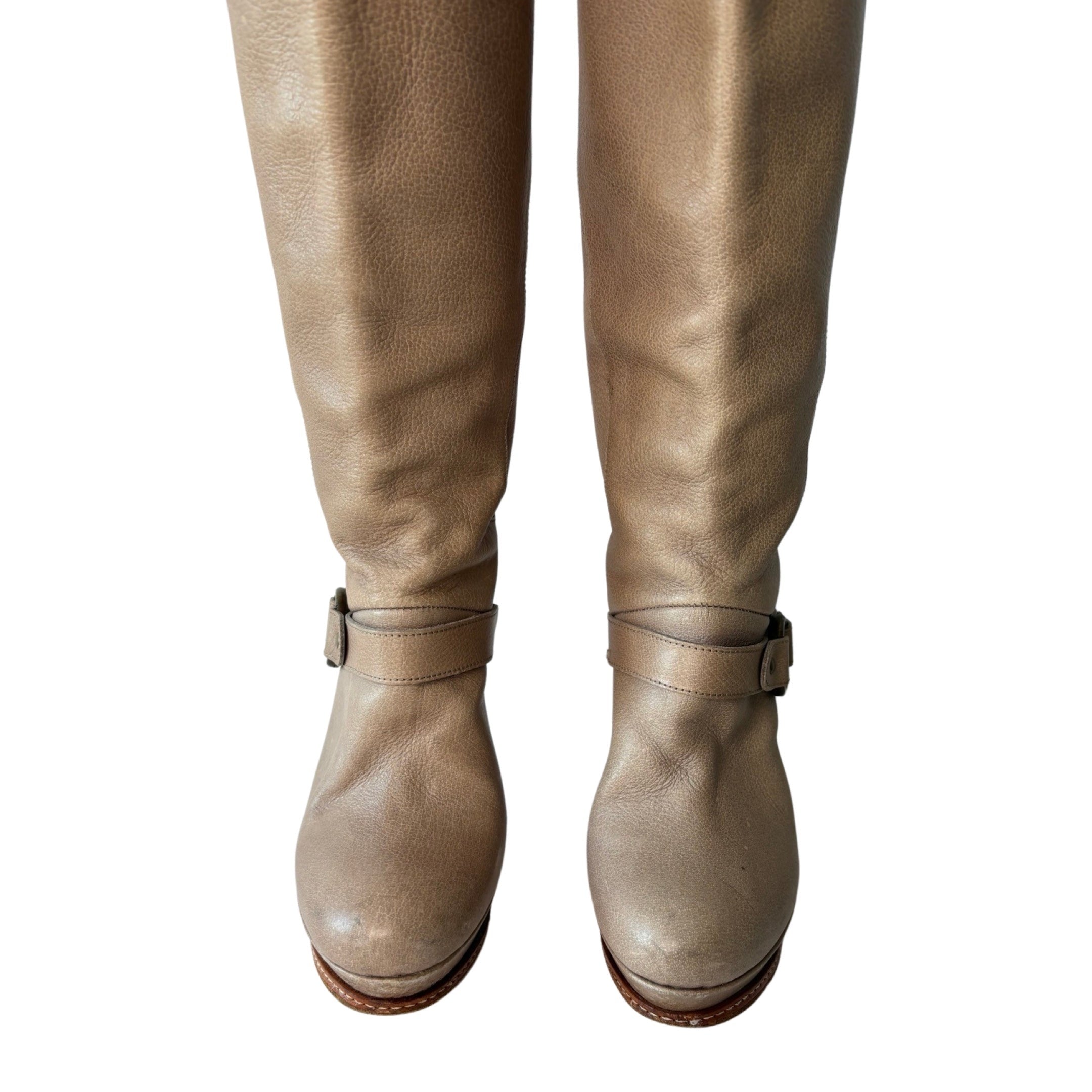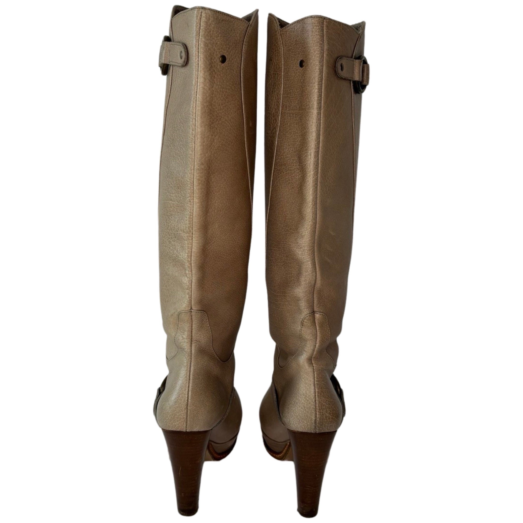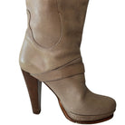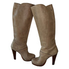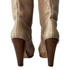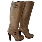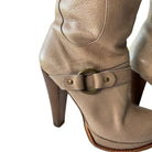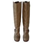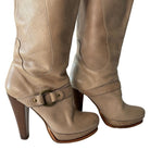 Just Cavalli knee high leather boots add a touch of elegance to any wardrobe. Crafted from beige leather and adorned with a delicate strap on the ankle and calf, these boots are finished with a high heel. In good condition.