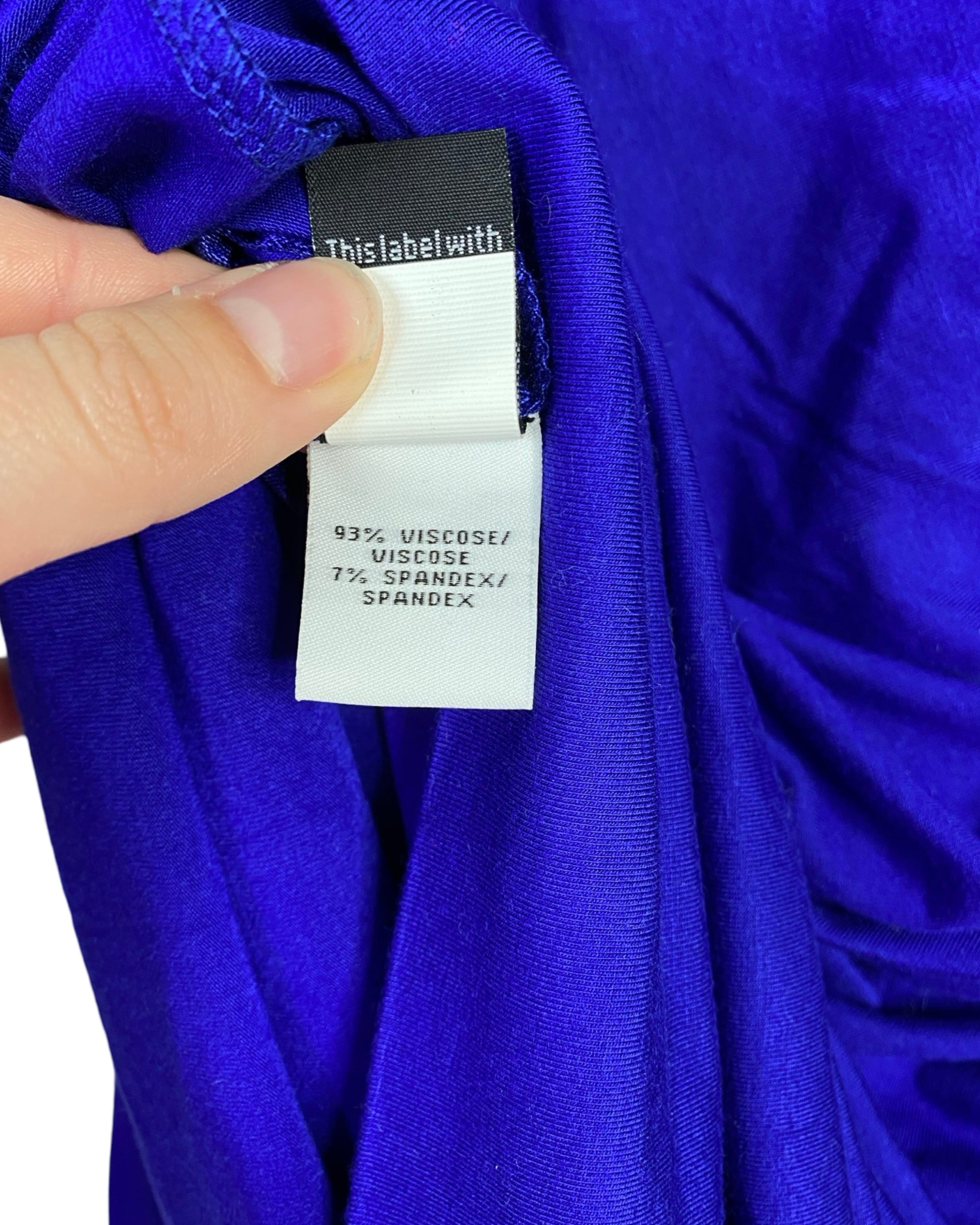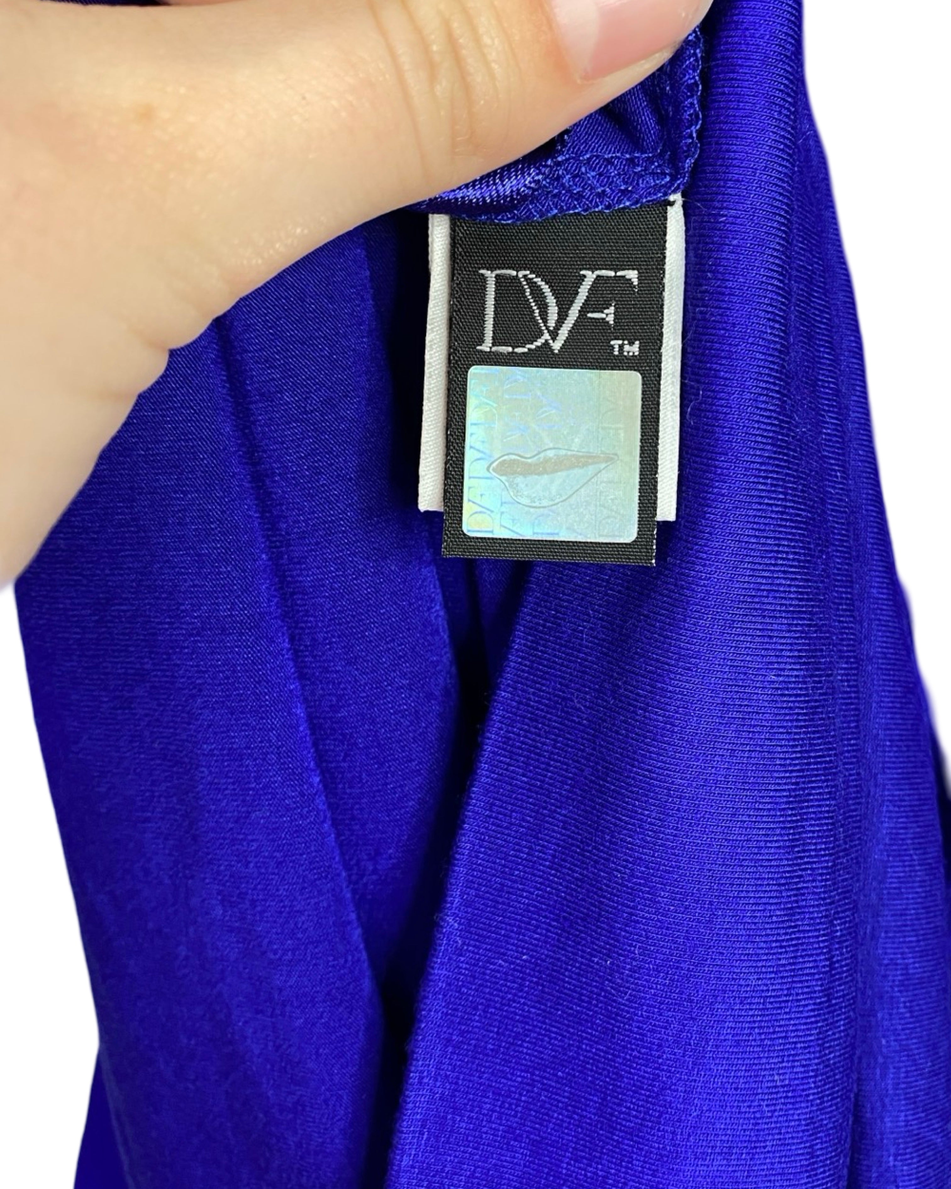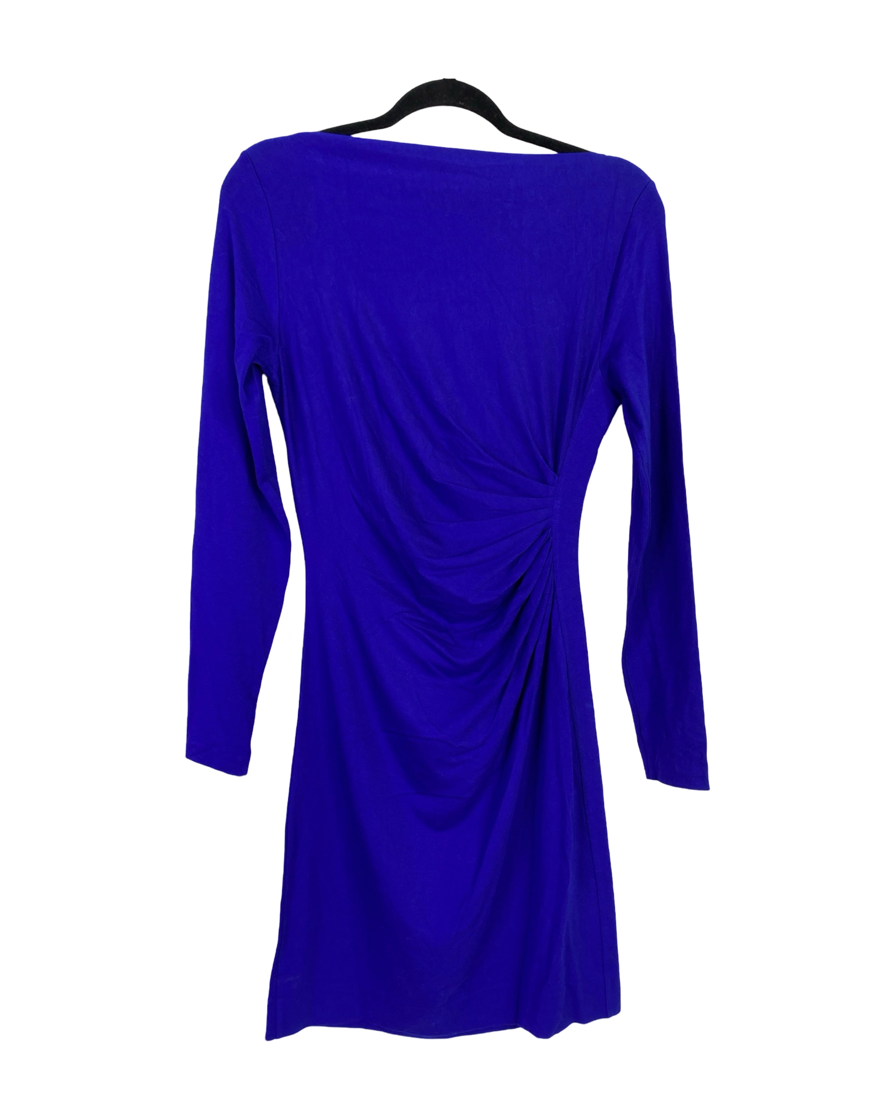 Show off your style in this luxurious Diane von Furstenberg dress. The sleek bodycon fit and ruched side create an elegant silhouette, while the asymmetrical neckline adds a modern touch. Made with a comfortable blend of viscose, it's perfect for any occasion. Available in stunning royal blue, size M.
