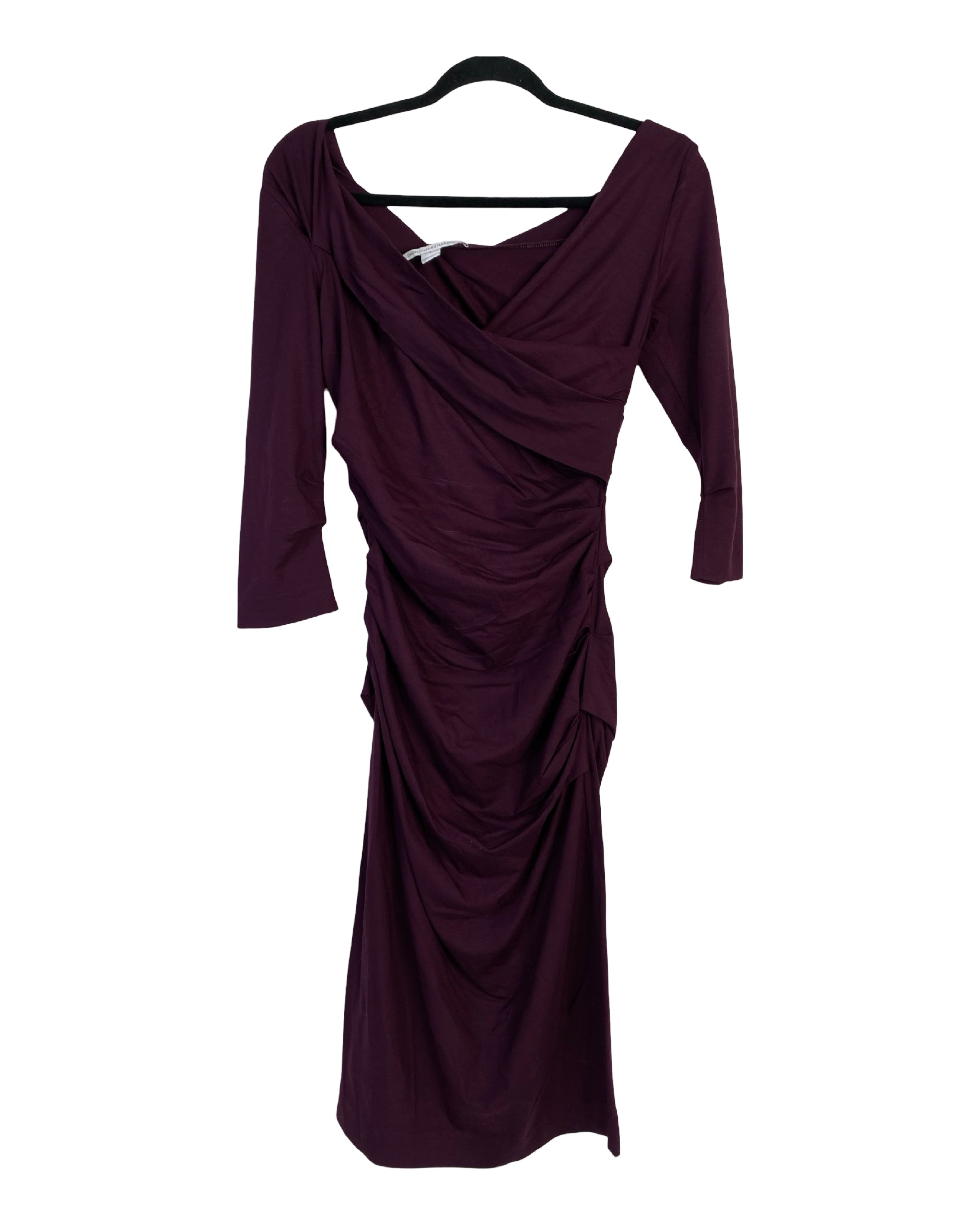 Elevate your wardrobe with this stunning Diane von Furstenberg midi dress. The bodycon fit and ruched side create a sleek and elegant silhouette, while the draped v-neckline adds a touch of sophistication. Made with a comfortable blend of viscose and spandex, it's perfect for any occasion. Available in the season's must-have color, burgundy. Size S.