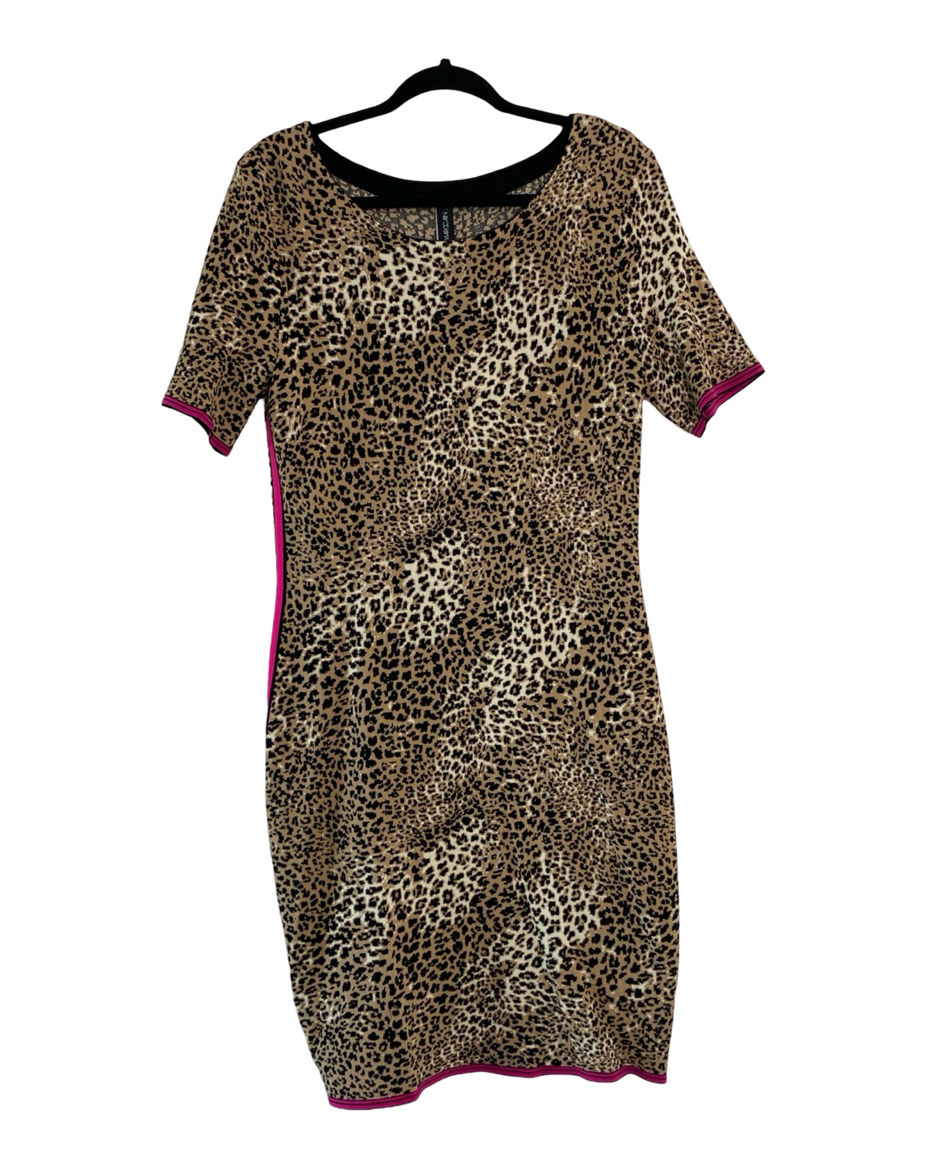 Need a versatile and stylish addition to your wardrobe? Look no further than this dress made from a combination of viscose and polyester, featuring a bold leopard print and subtle pink accents. This piece effortlessly blends casual and chic styles, while providing both comfort and fashion. Perfect for size 36/S.