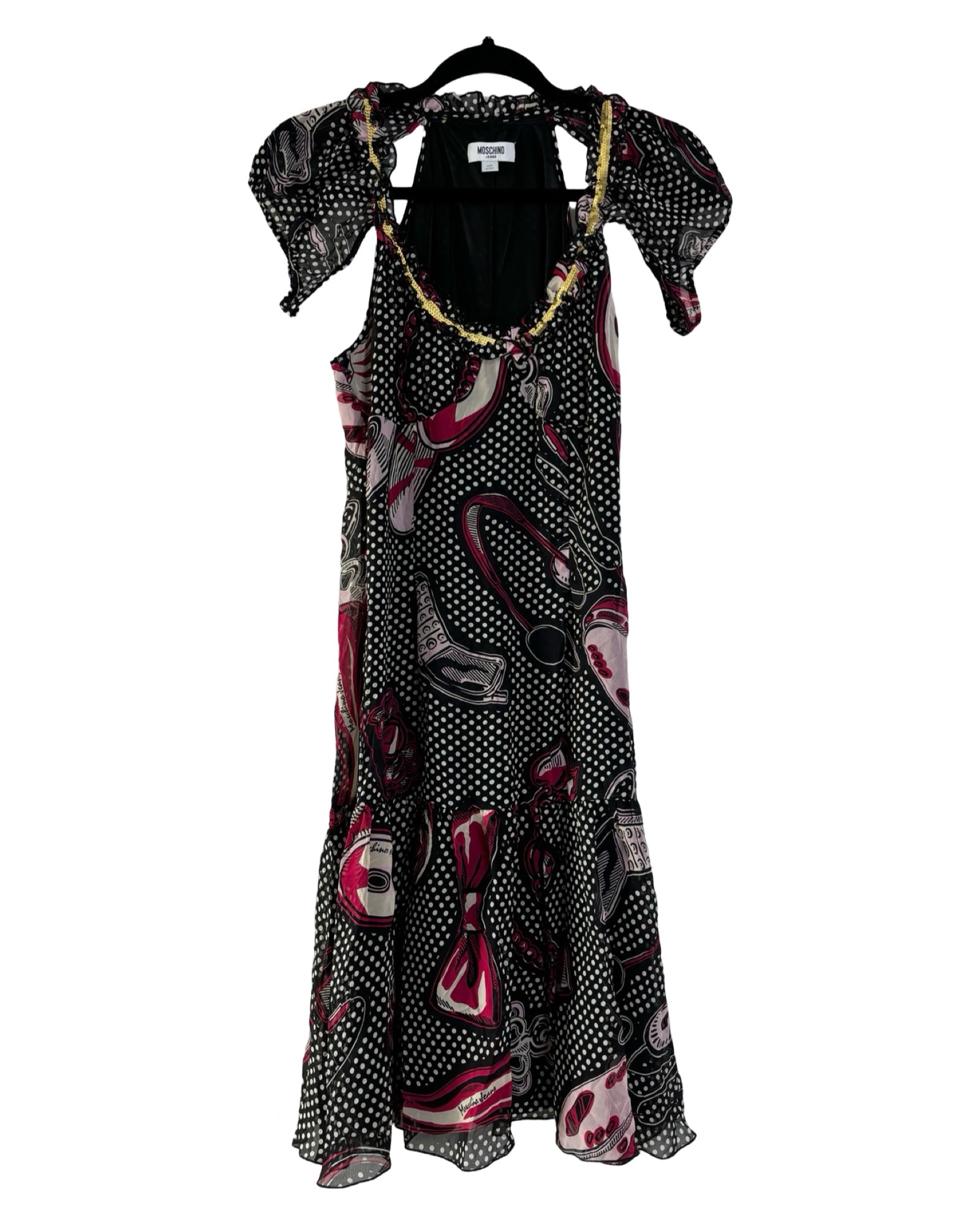 Slip on this whimsical Moschino Jeans dress and let your fun-loving personality shine! Made from silky smooth material, it features a round neckline adorned with sequins, playful polkadot print, unique sleeves, and a side zipper for added convenience. Whether you're out on the town or rocking a casual day look, this dress will add a touch of quirky charm to any outfit. With a length of 100 cm and an armpit to armpit of 45 cm. Dress is new with price tag.
