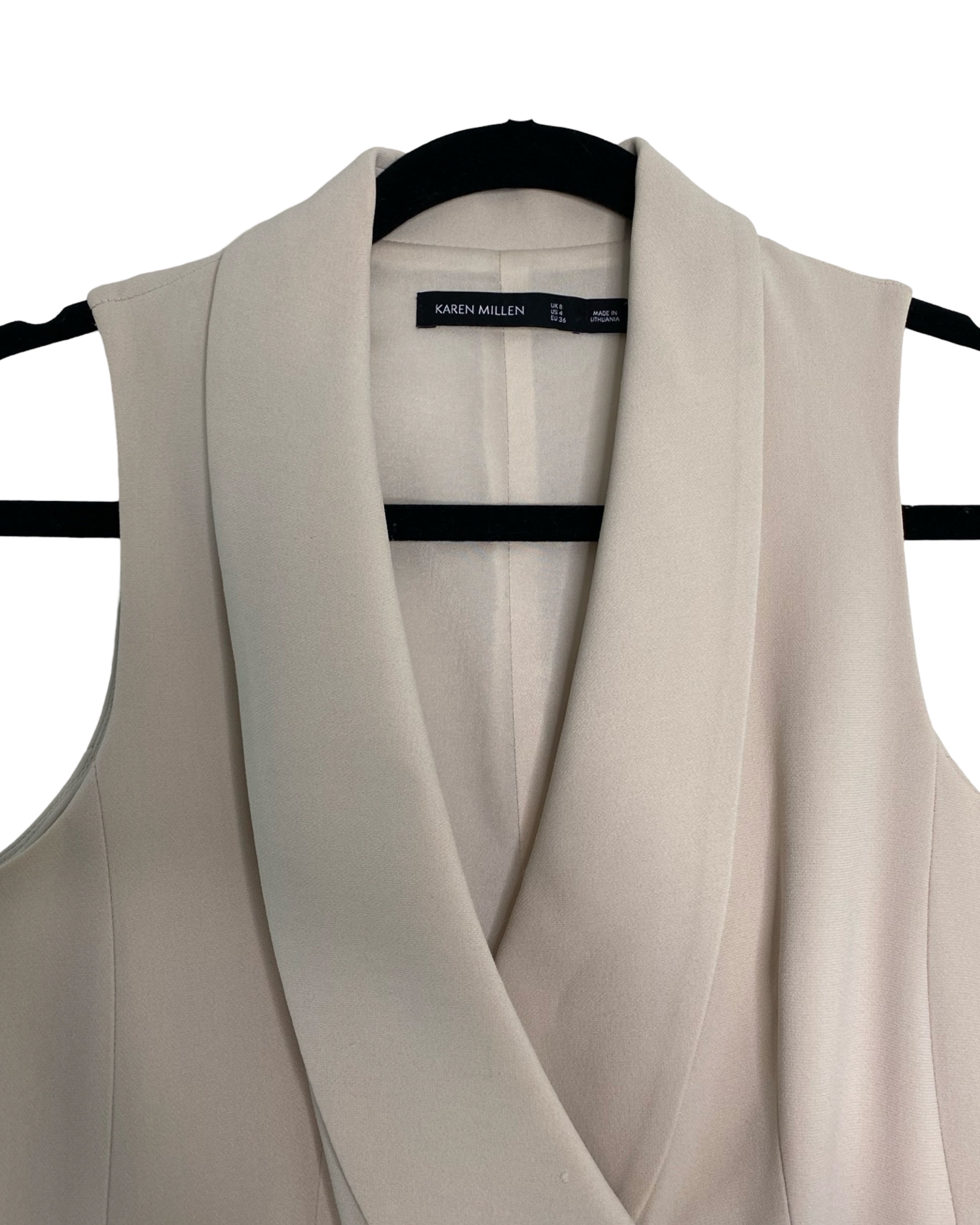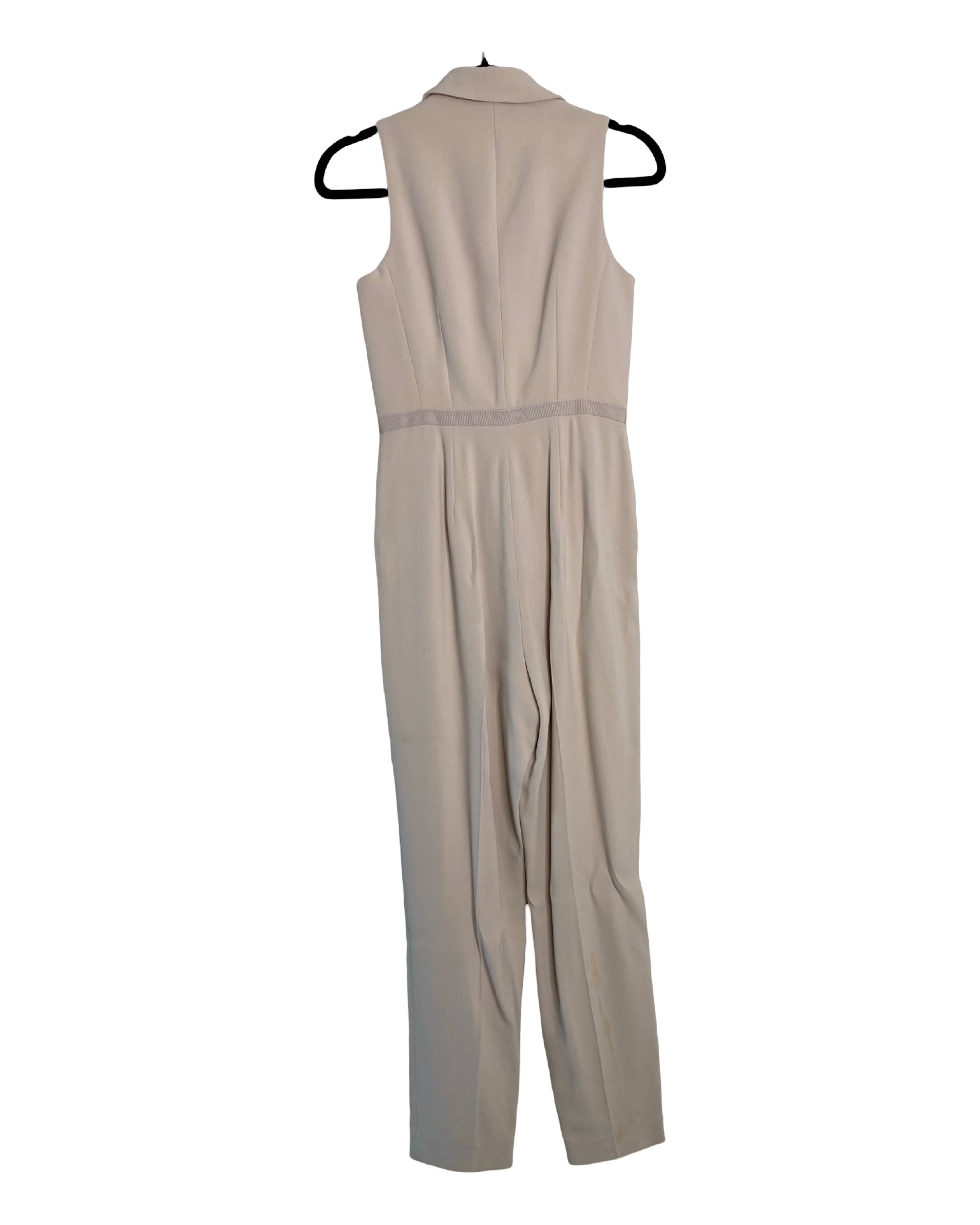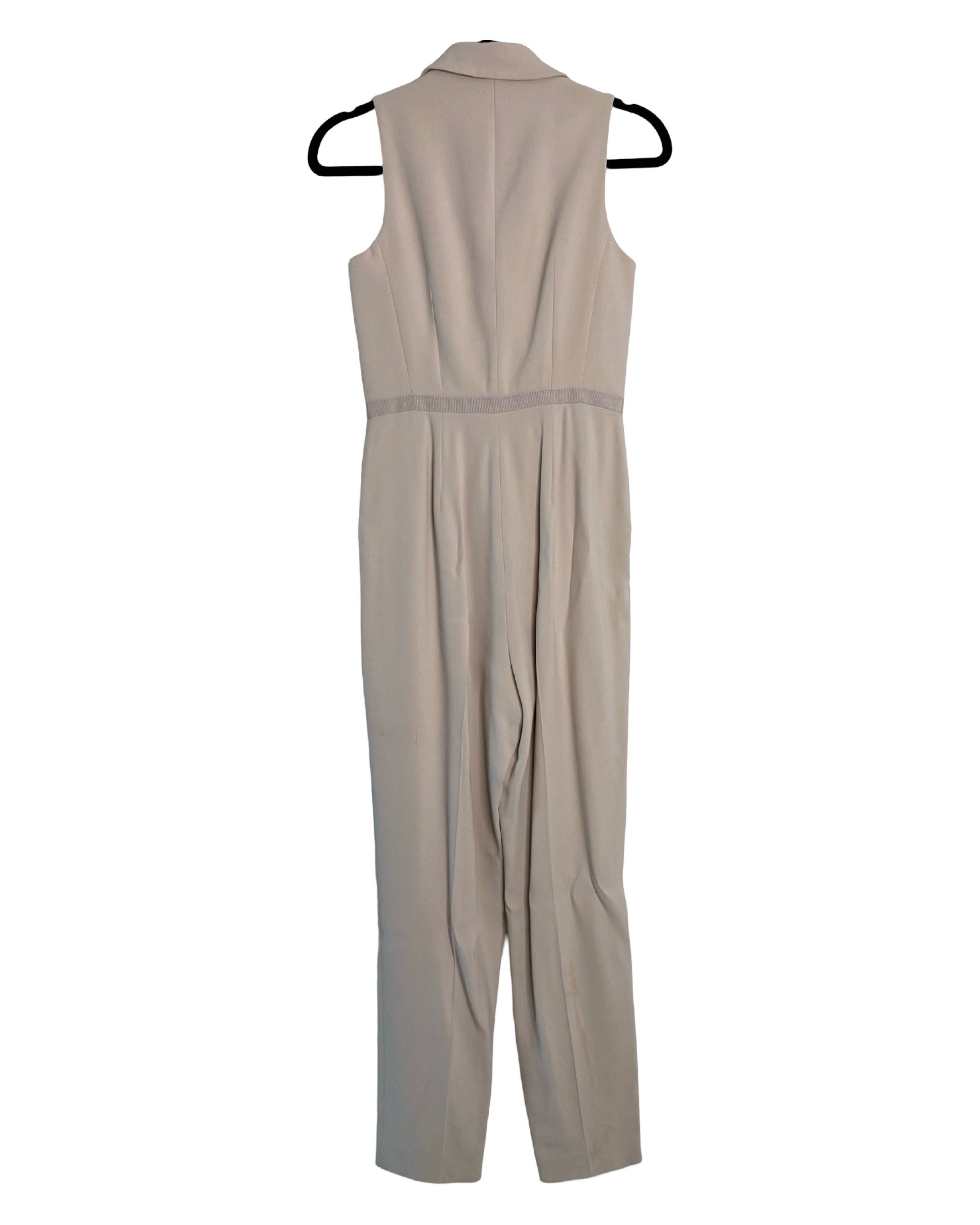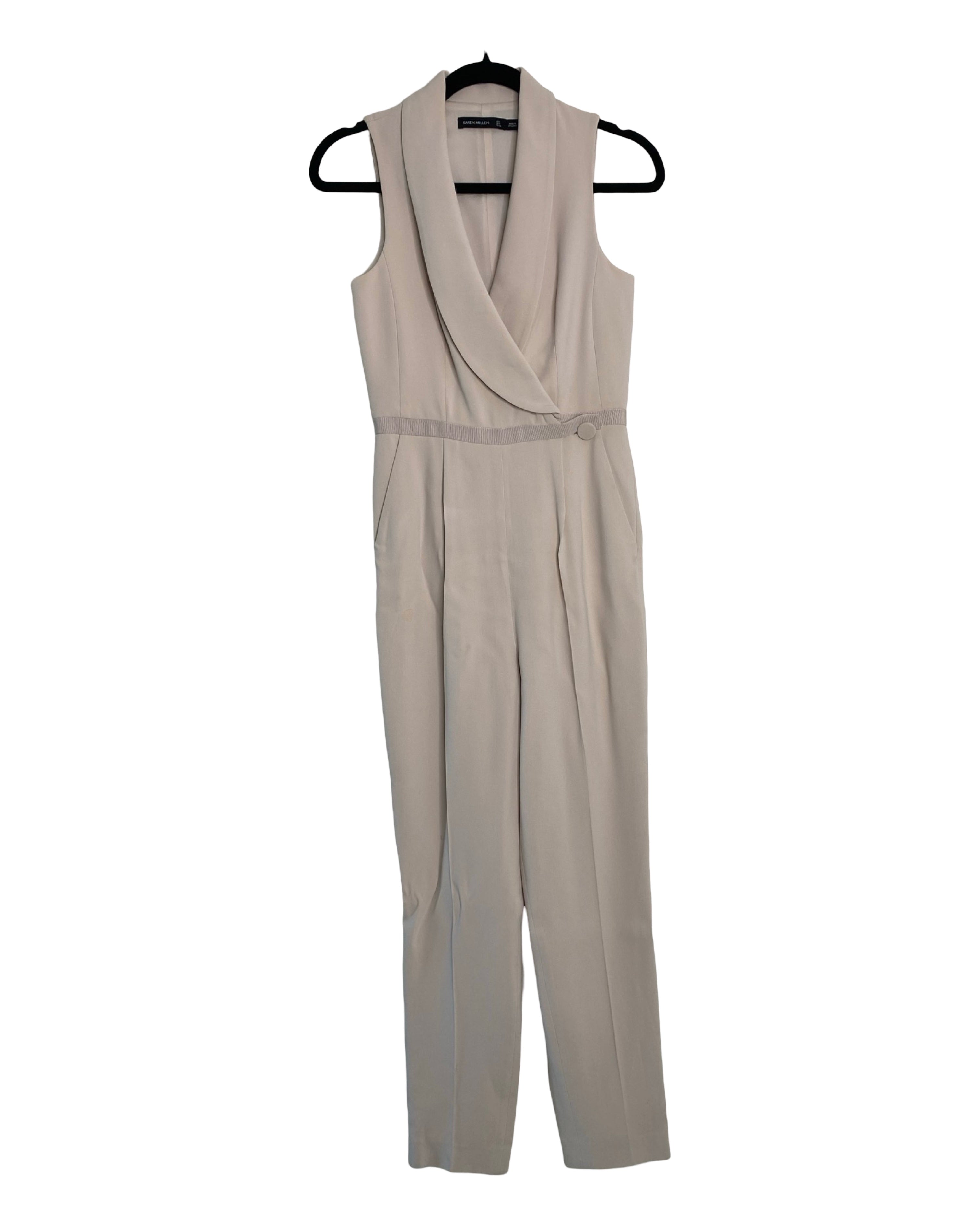 Elevate your style with the beige waist-accentuating jumpsuit by Karen Millen. Made from premium viscose, acetate and elastane its v-neckline strikes the ideal balance of fashion and comfort, available in size S for a flawless fit.