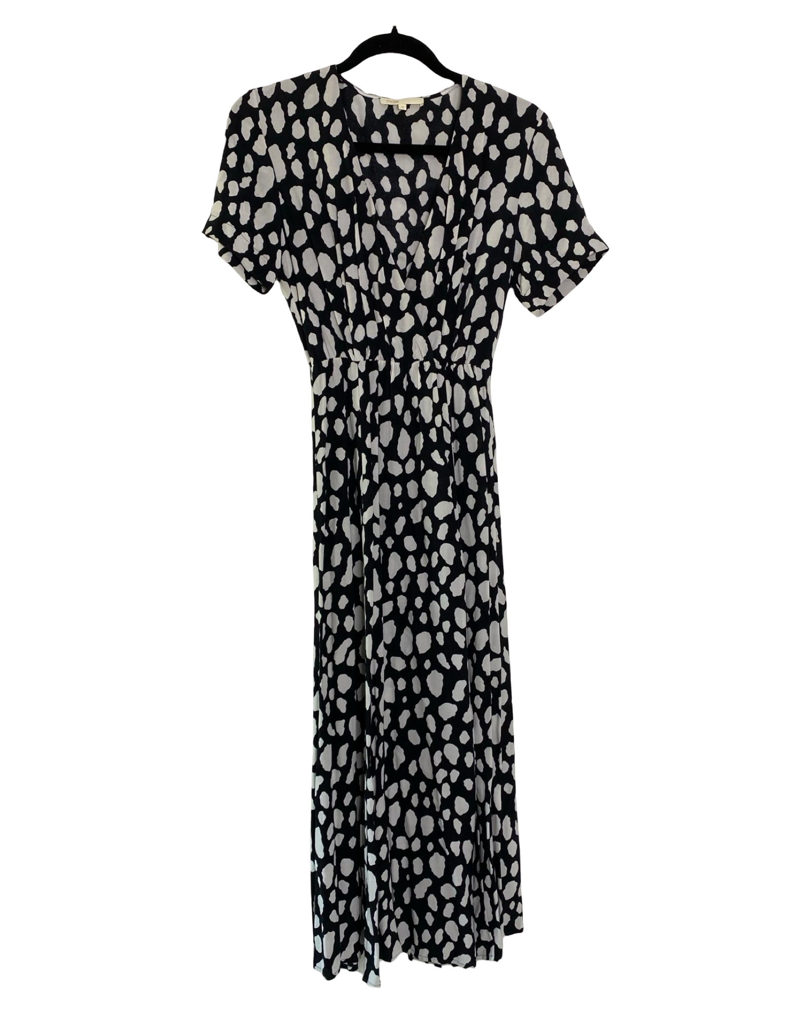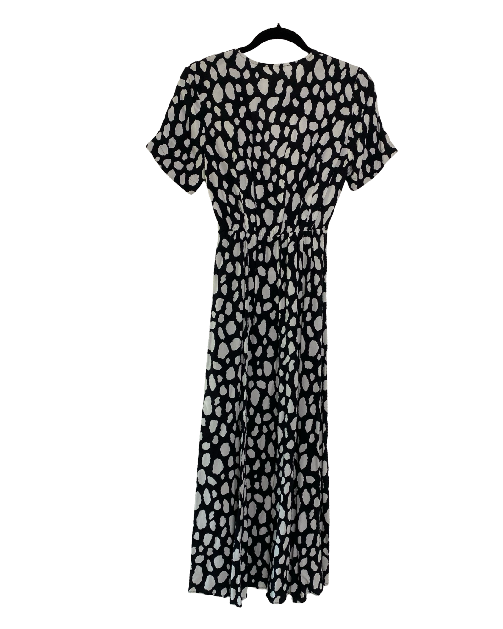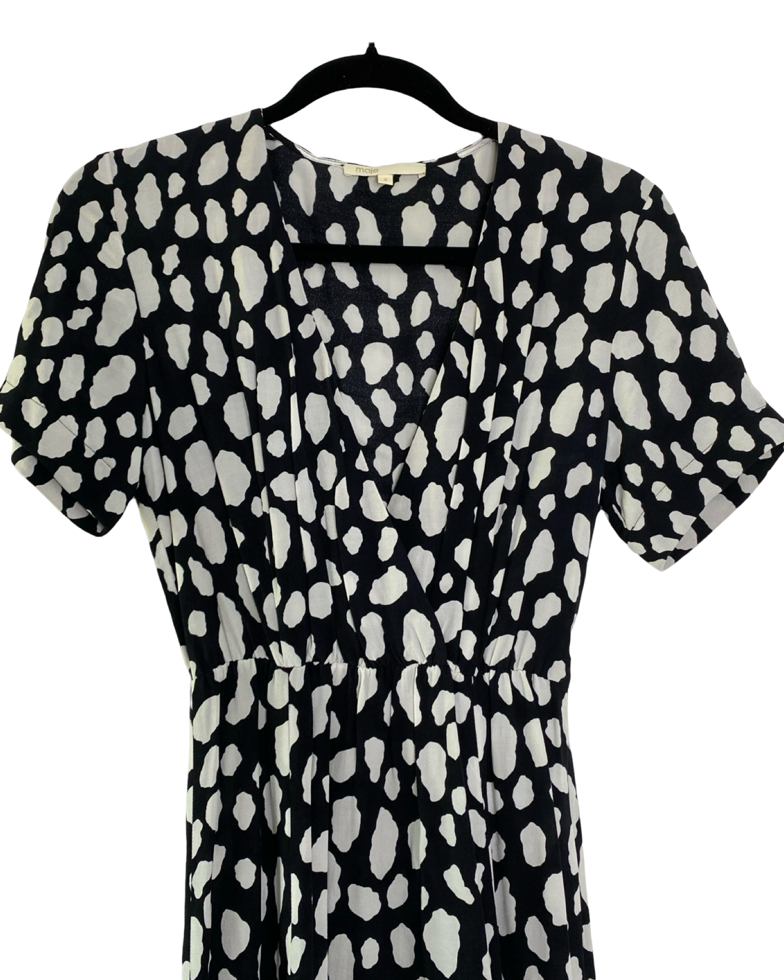Effortlessly elegant and versatile, the Maje dress is a must-have in any wardrobe. Made from a luxurious blend of viscose, it boasts a flattering flowy design with a v-neckline and elastic waist. With a length of 123 cm and an armpit to armpit of 40 cm. The dress comes in a stylish light grey and black color and is in excellent condition, making it a perfect choice for any occasion.