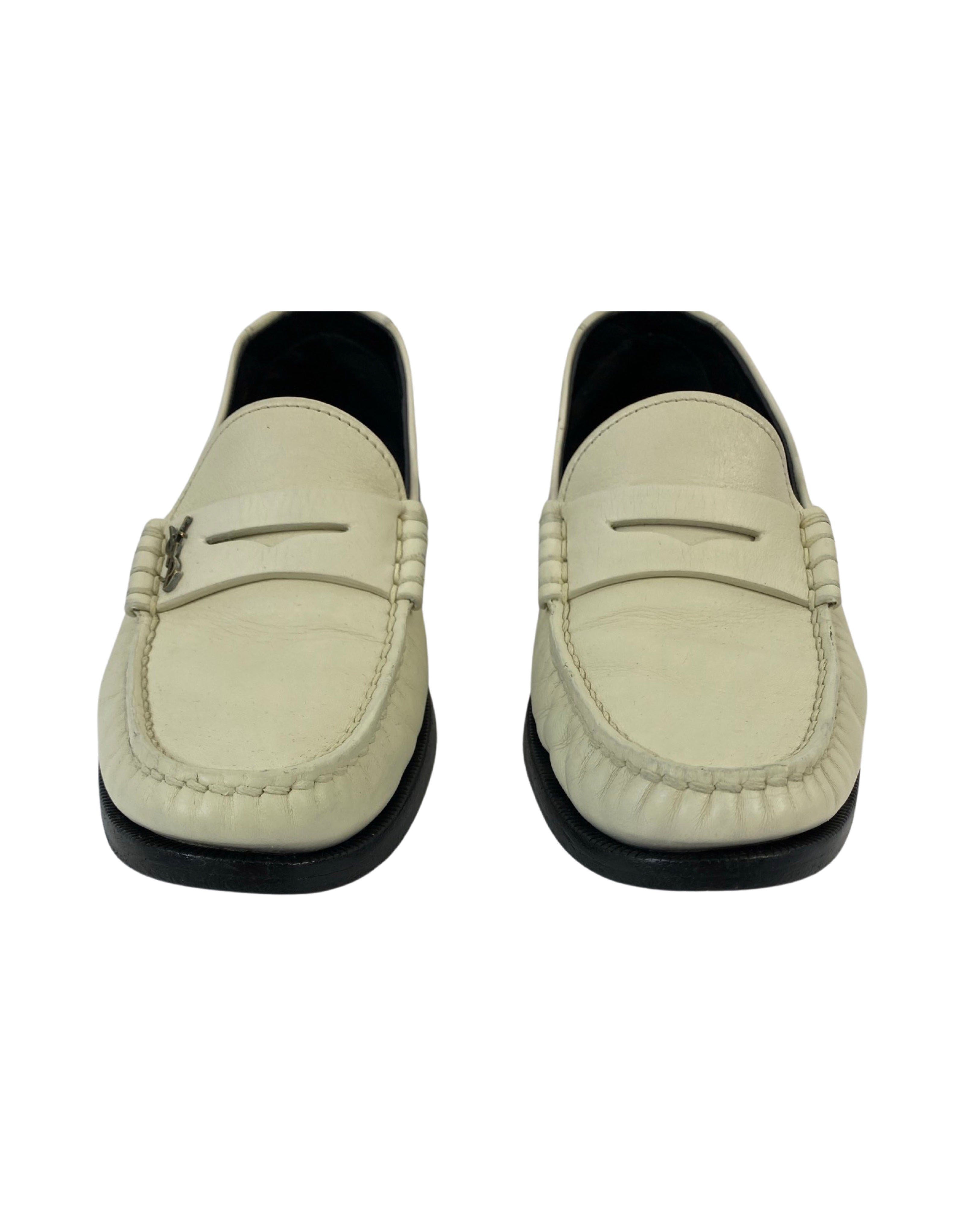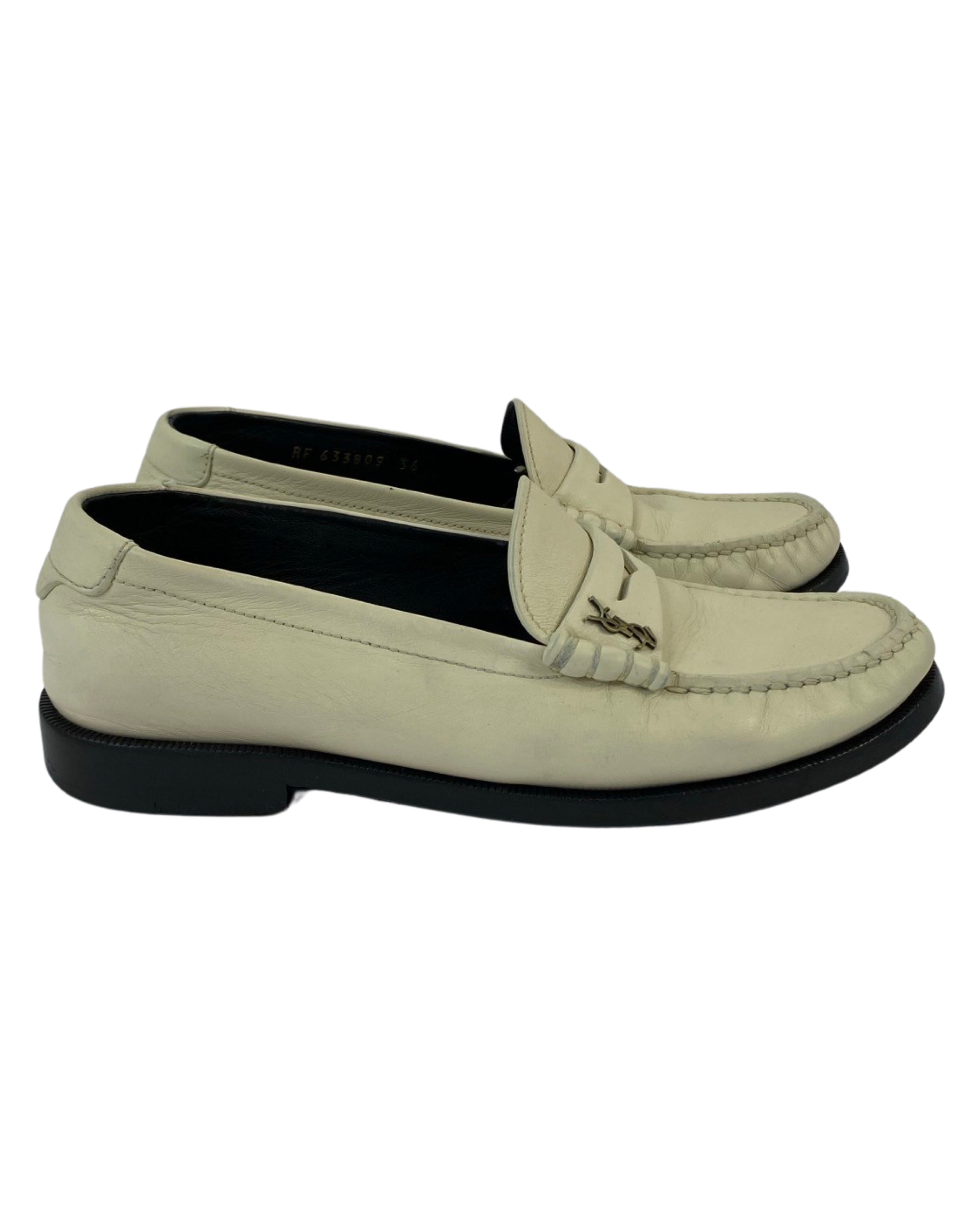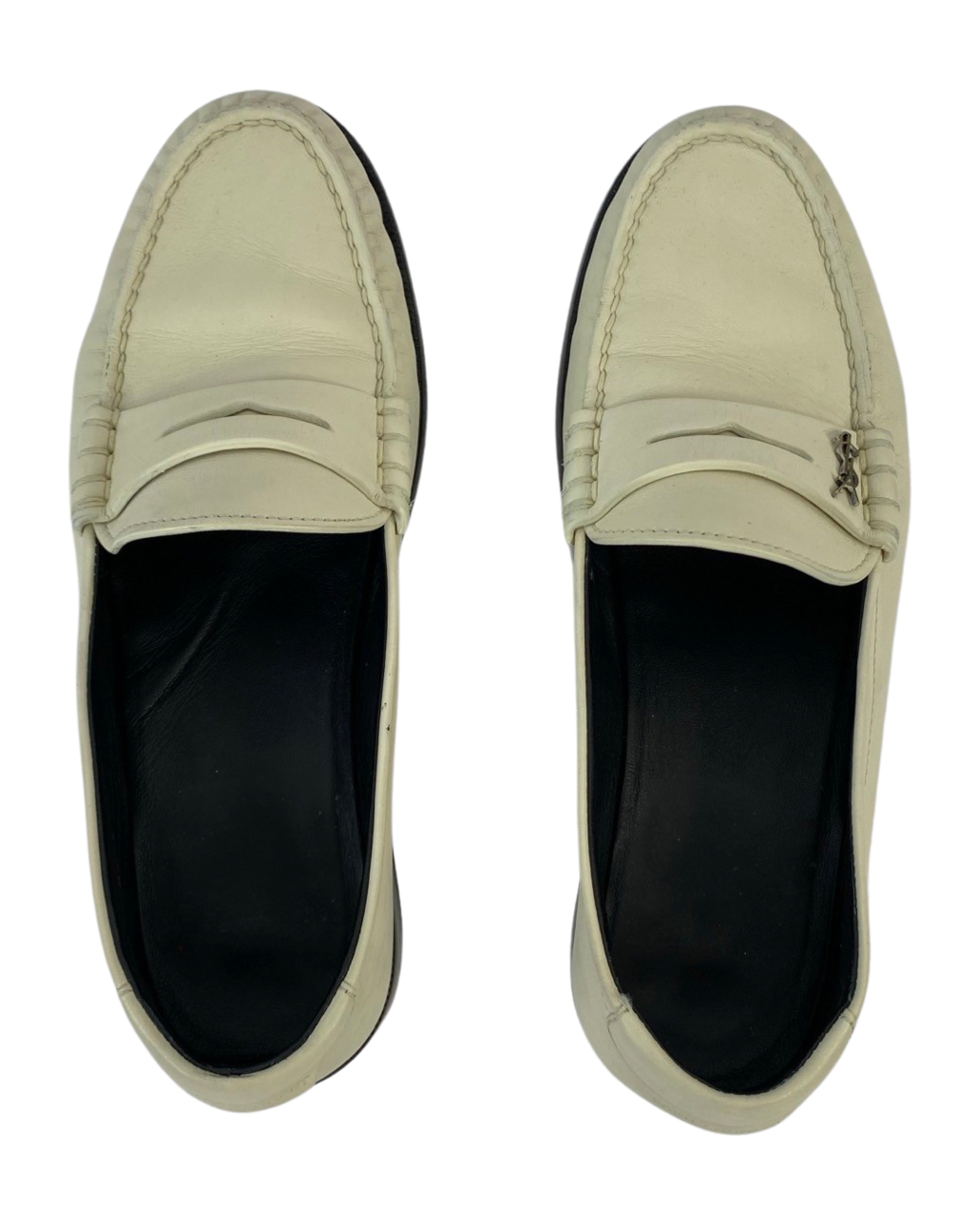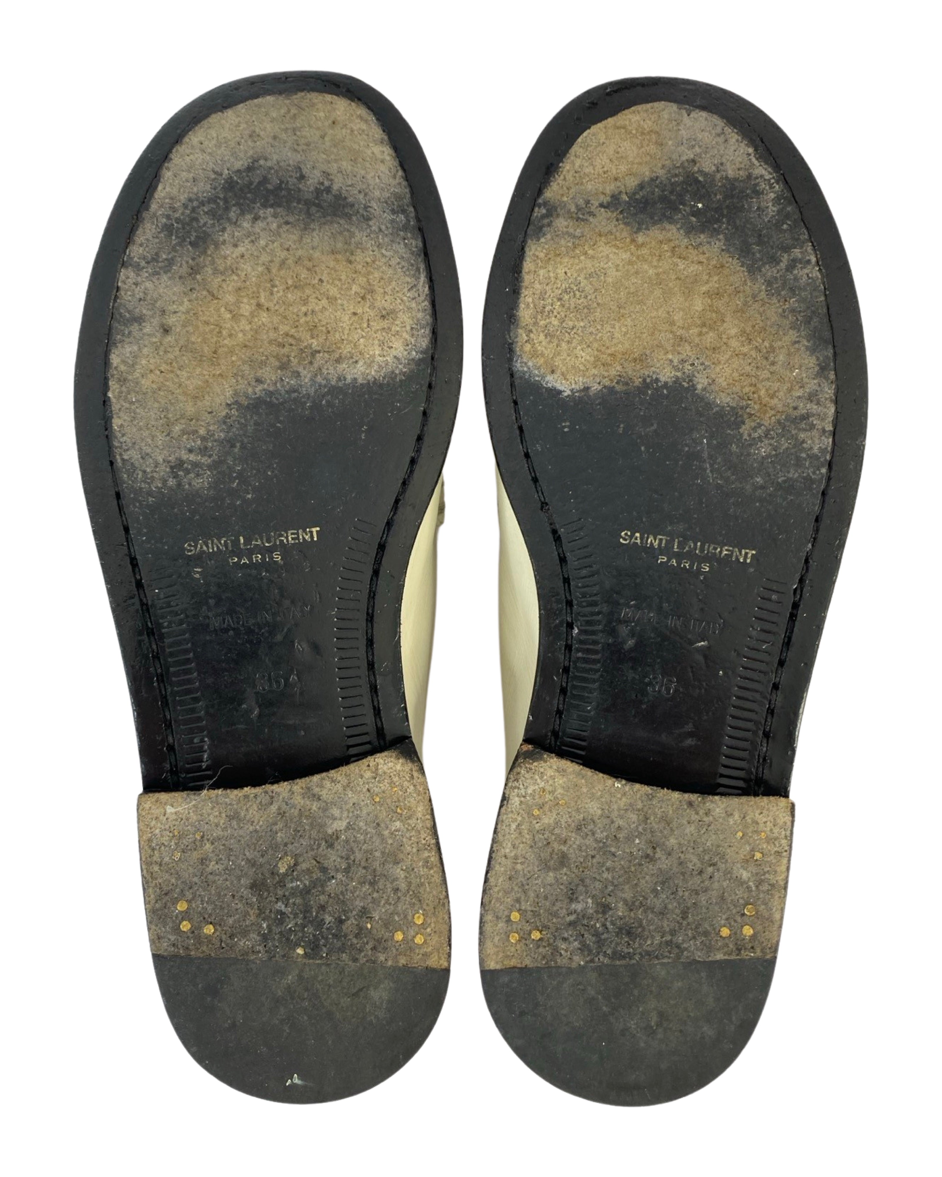 Indulge in luxury with the Saint Laurent cream leather loafers. Adorned with silver-tone hardware, these size 36 loafers are as good as new and will elevate any outfit. The 25.5 cm sole offers comfort while the elegant design exudes sophistication. Complete your wardrobe with these timeless loafers.