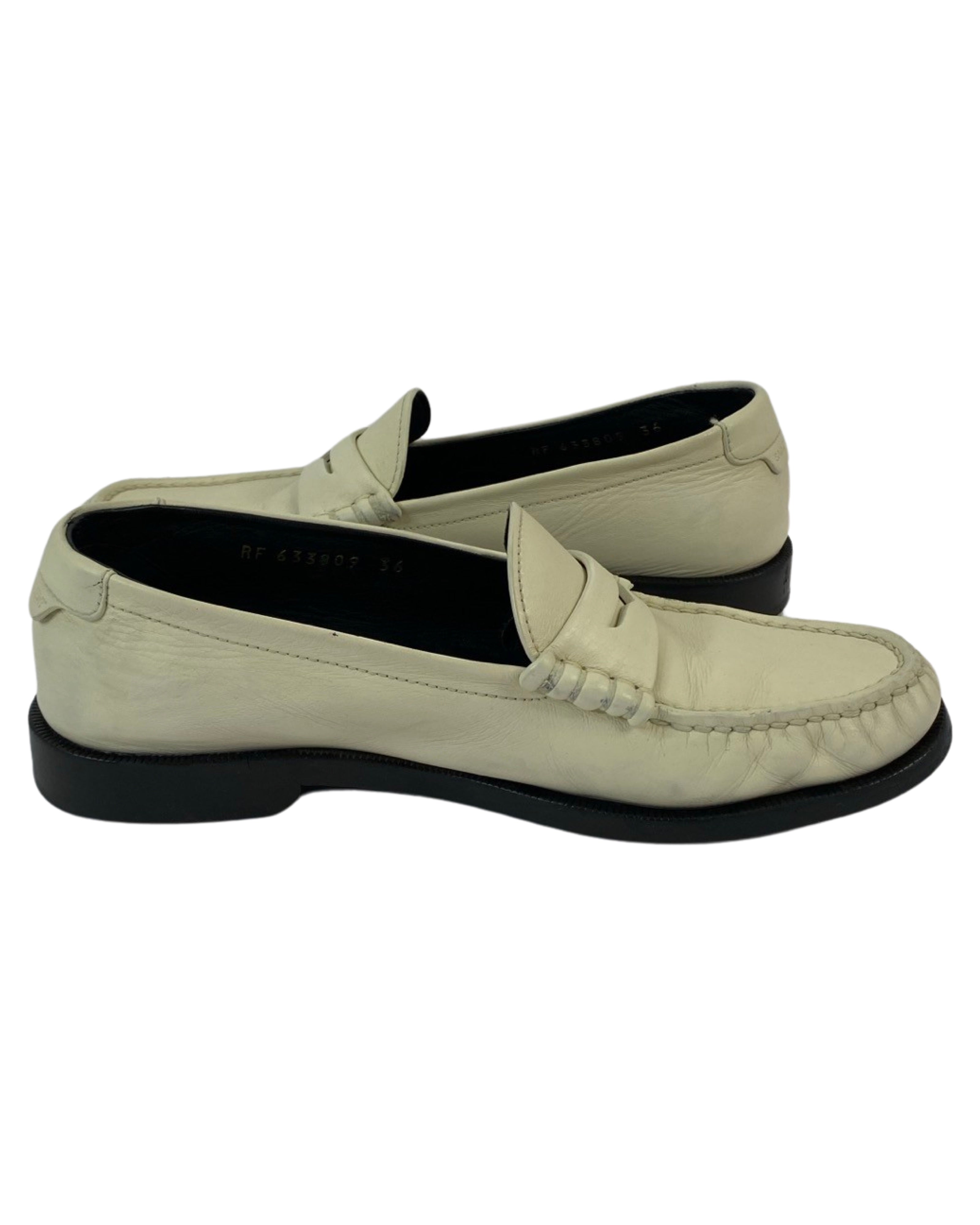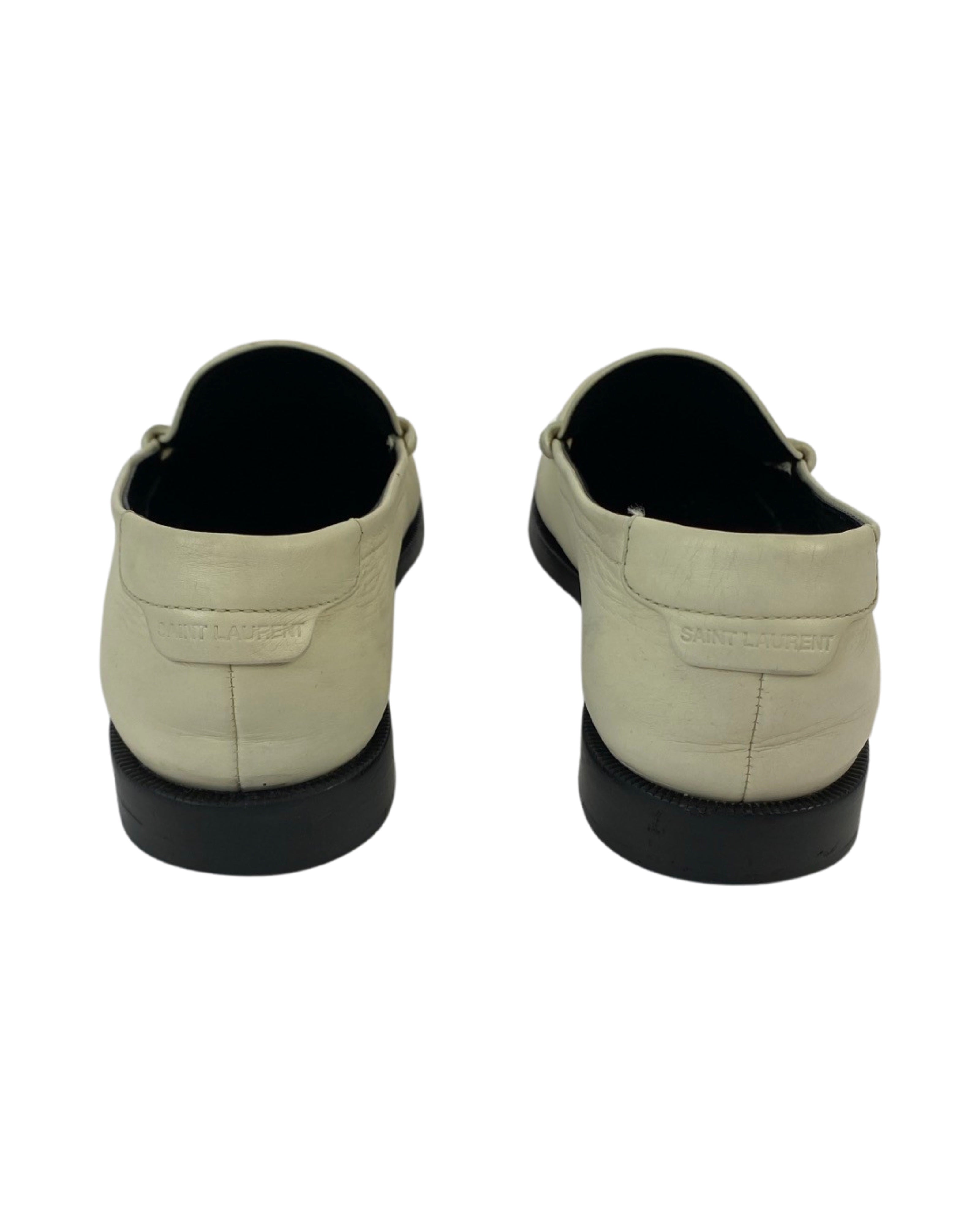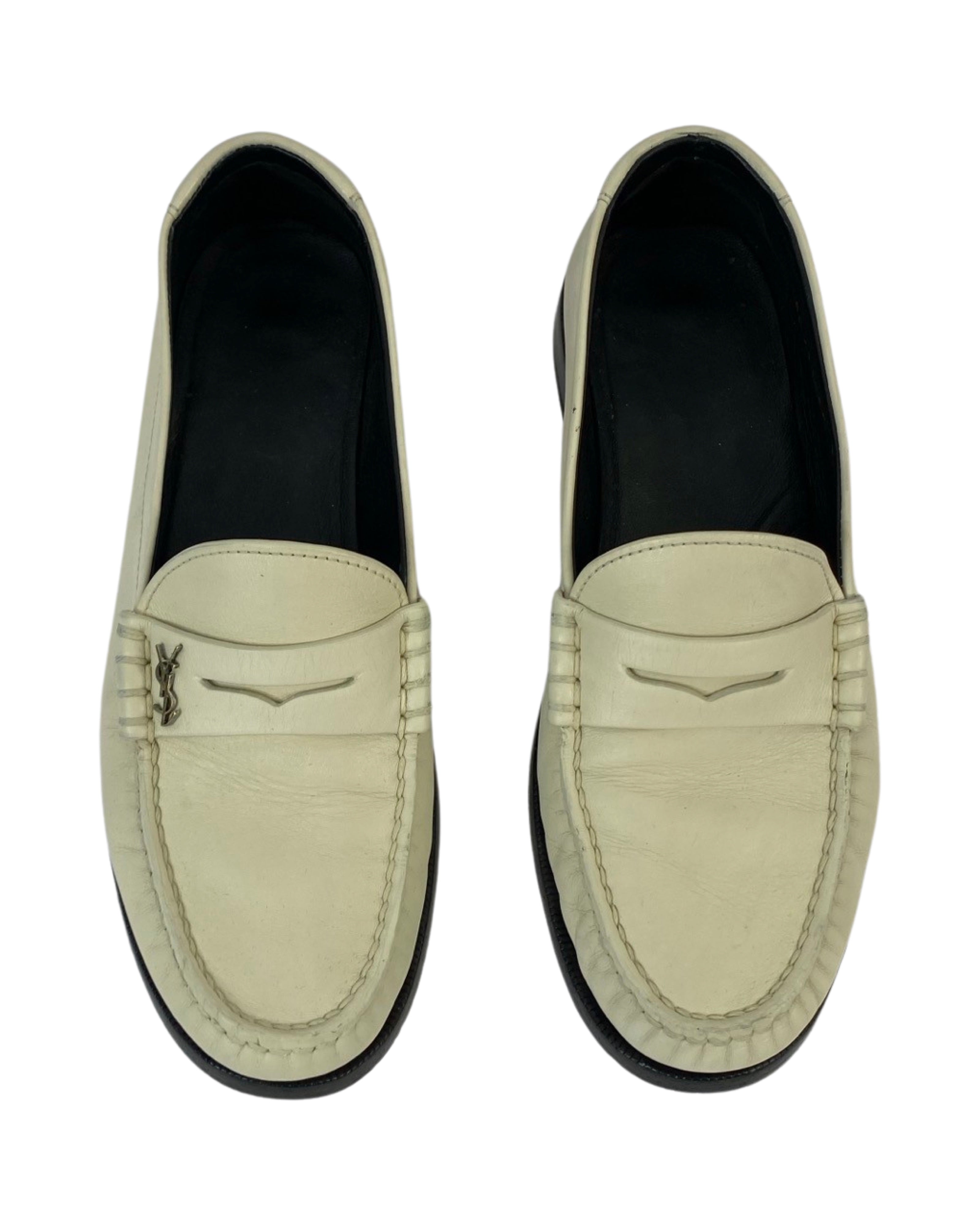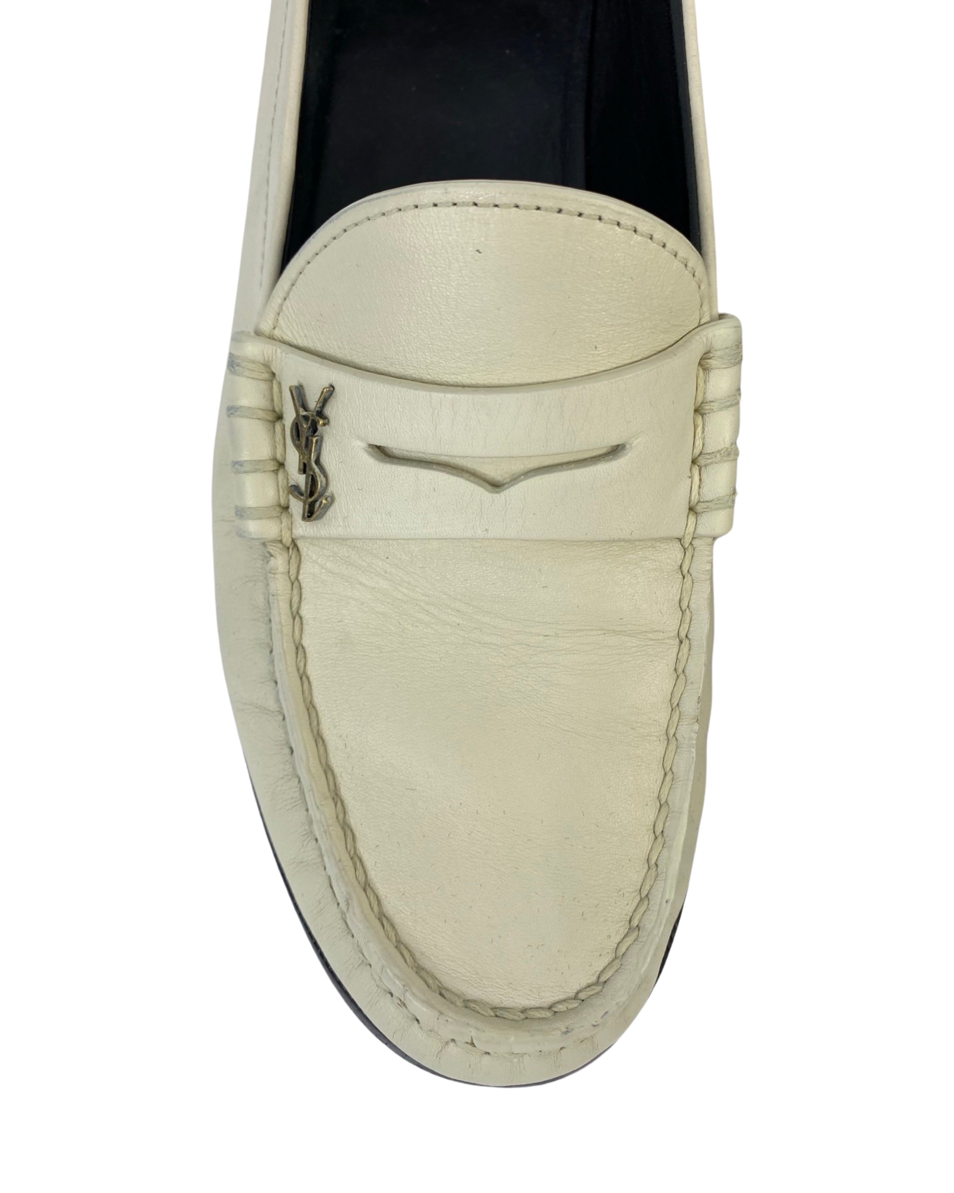 Indulge in luxury with the Saint Laurent cream leather loafers. Adorned with silver-tone hardware, these size 36 loafers are as good as new and will elevate any outfit. The 25.5 cm sole offers comfort while the elegant design exudes sophistication. Complete your wardrobe with these timeless loafers.