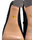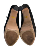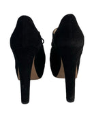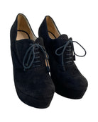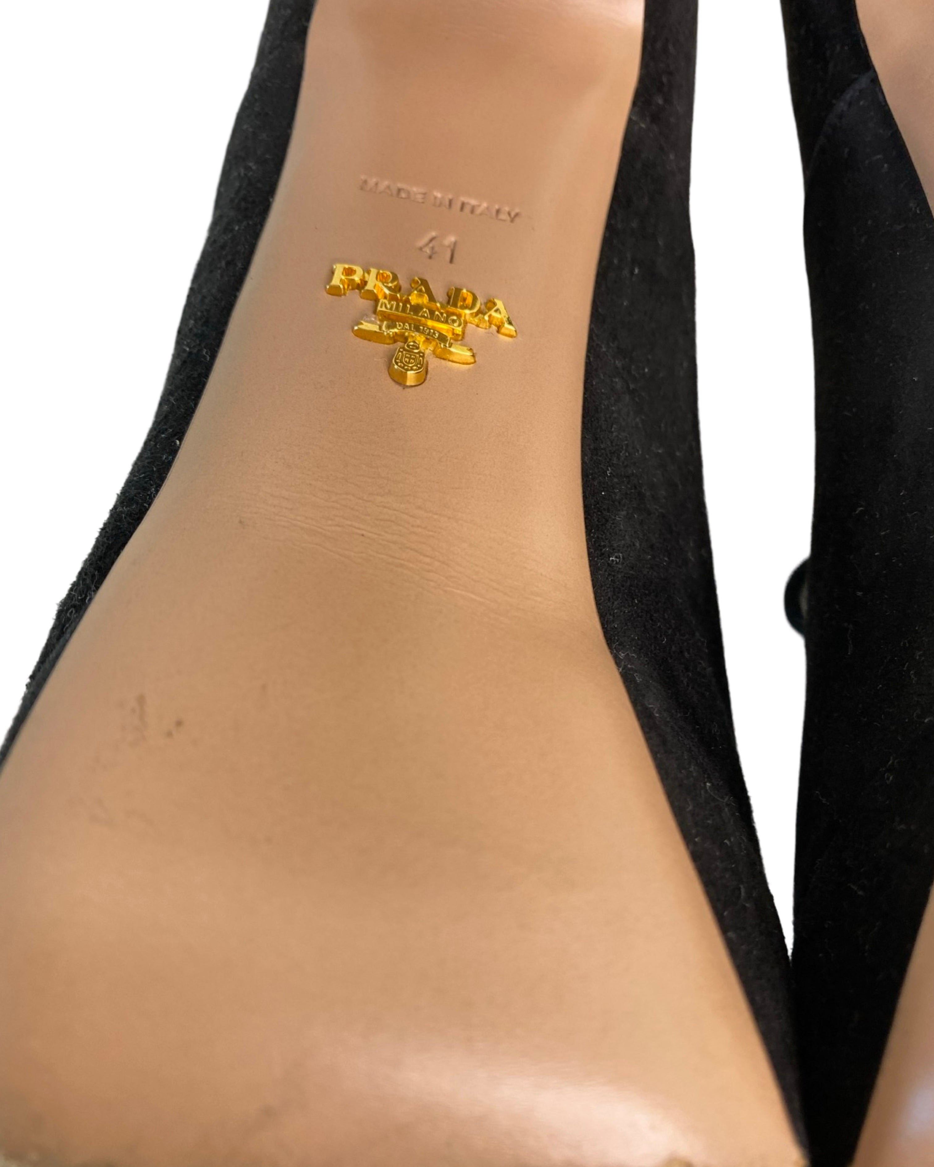 Elevate your look with Prada's platform heels. Made in Italy from black suede, these lace-up ankle boots feature a block heel and platform sole for added height. Stand out in style with the iconic Prada label. Will be sold with original dustbag.
