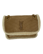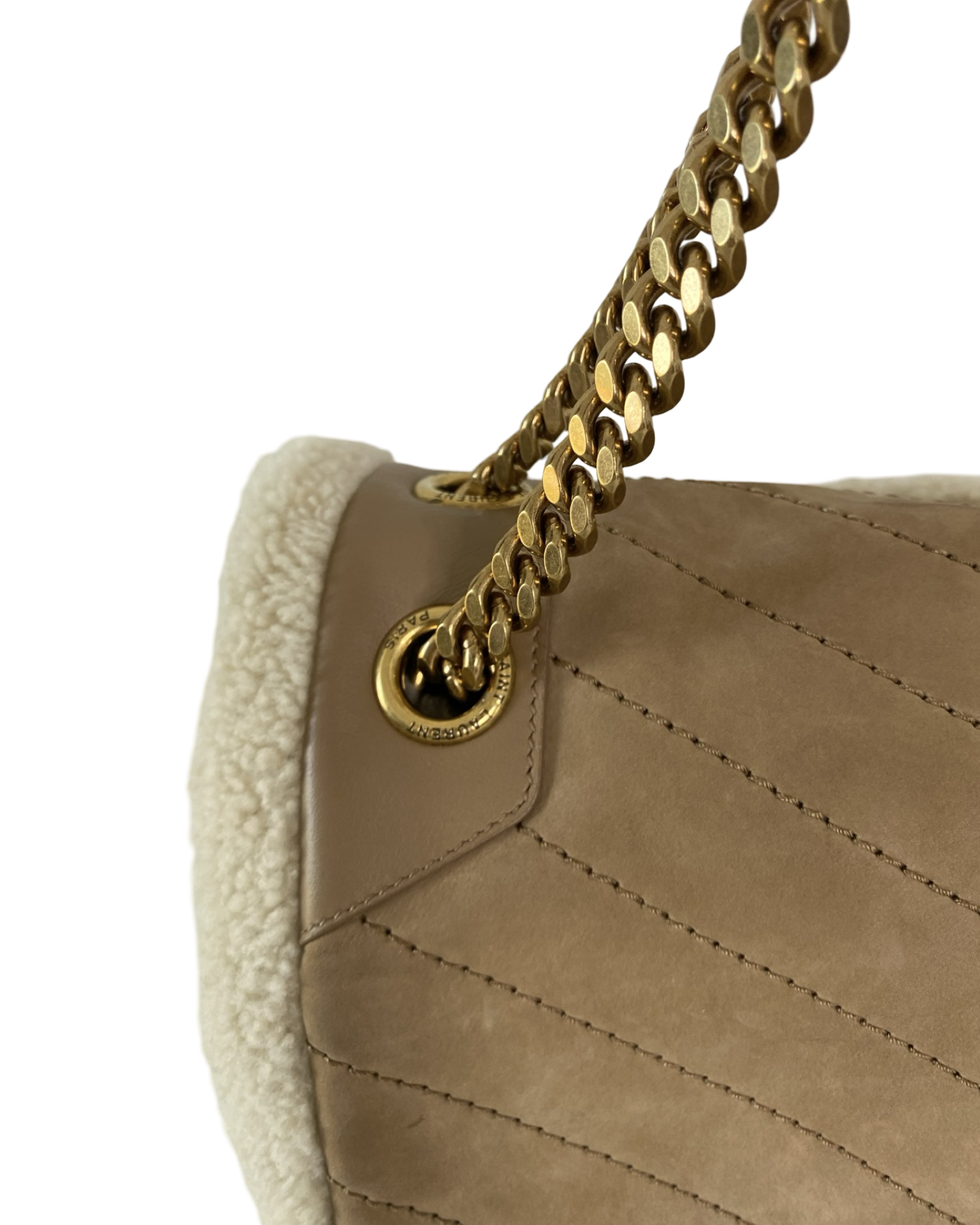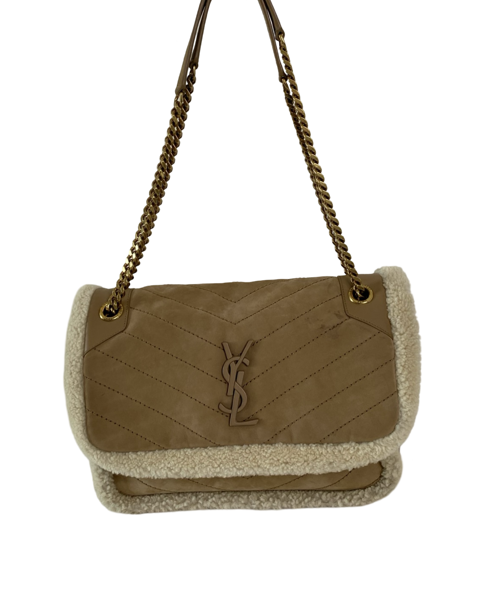 Upgrade your accessory game with the Saint Laurent Niki Shoulder Bag from the Fall/Winter 2021 Collection. Made from luxurious nubuck and adorned with gold-tone hardware and shearling trim, this bag exudes timeless elegance. Complete with a dust bag for safe storage. Serial number GNR633187 0621.
