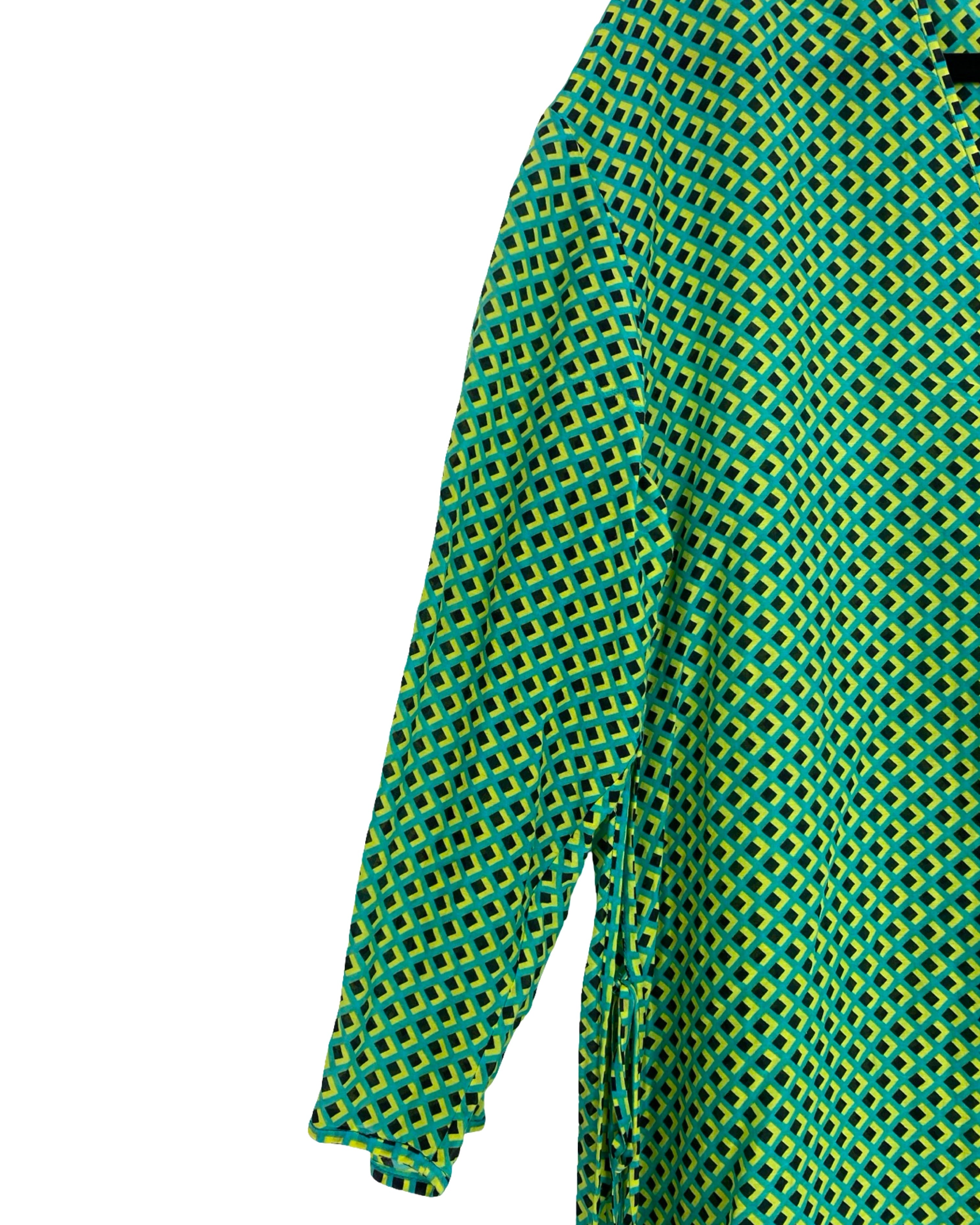 Effortlessly stylish, this Diane von Furstenberg cover-up features a striking mix of green, yellow, and black hues in a bold, modern design. Lightweight and easy to wear, it drapes beautifully over swimwear for chic beachside or poolside layering, while its versatile yet eye-catching style reflects DVF’s iconic blend of elegance and confidence—perfect for adding a touch of luxury to your getaway wardrobe. Made from a cotton-viscose blend, it comes in a size M, measuring 86 cm in full length, 58 cm from armpit to armpit, and 47 cm in sleeve length, with a rich green colour as the base.