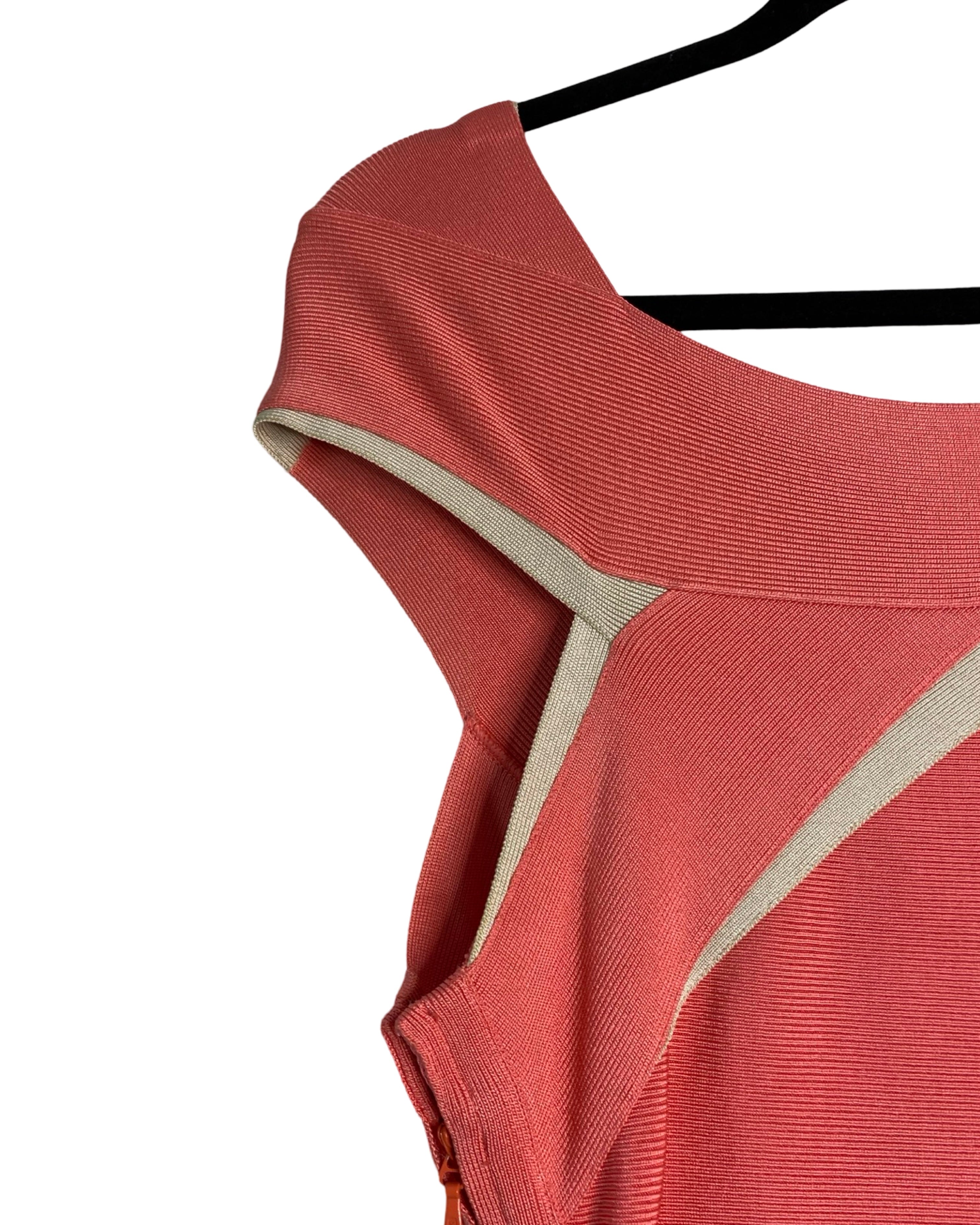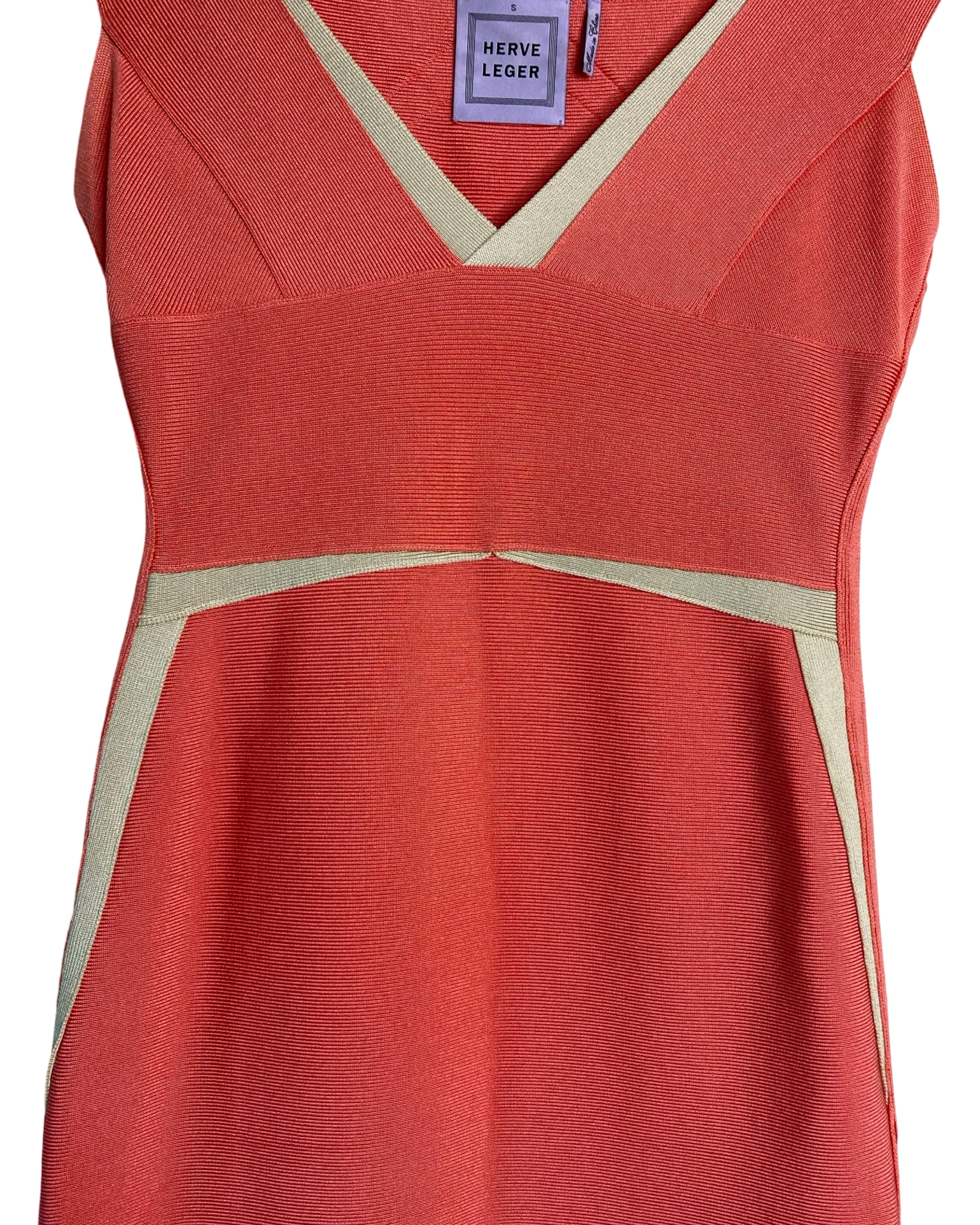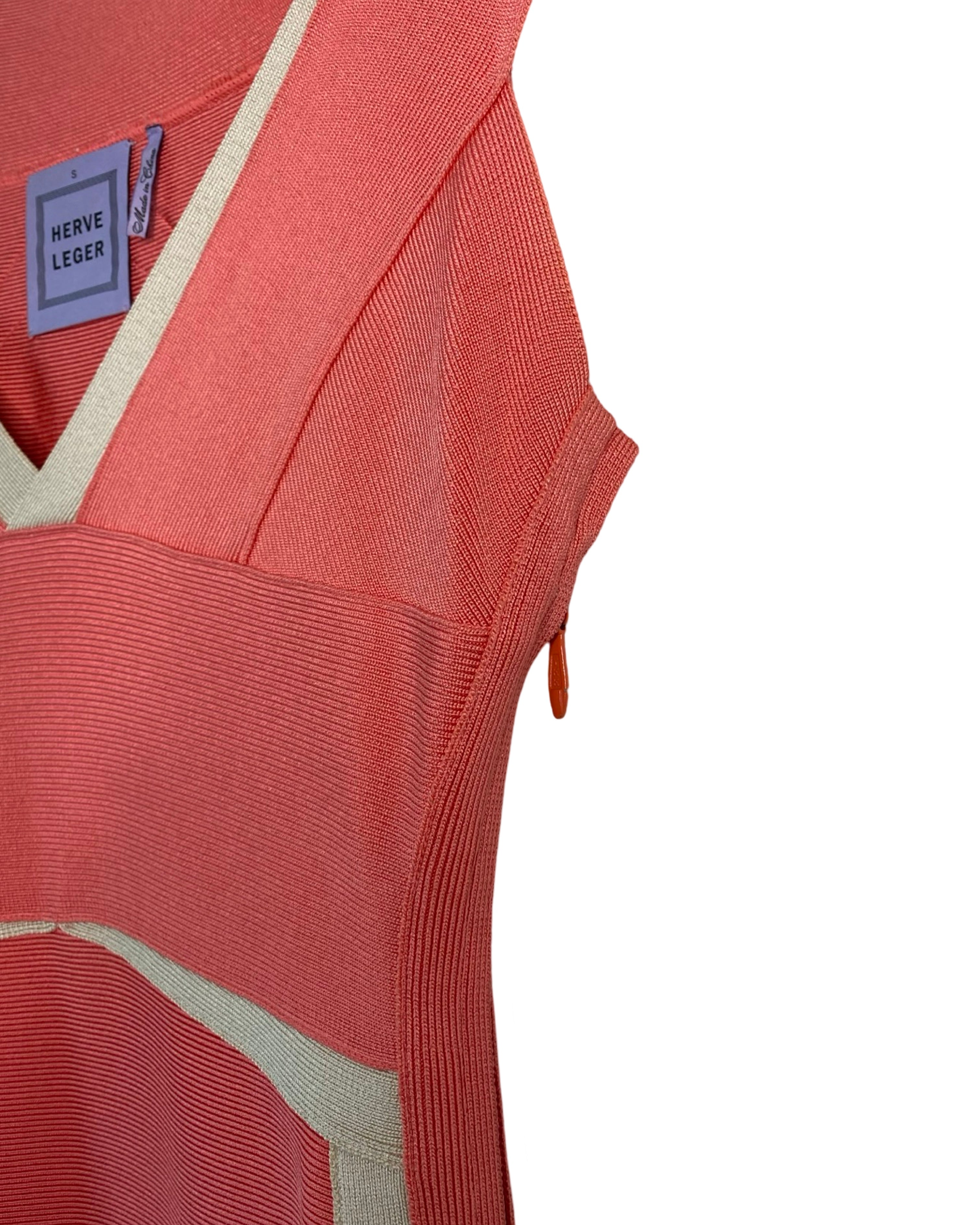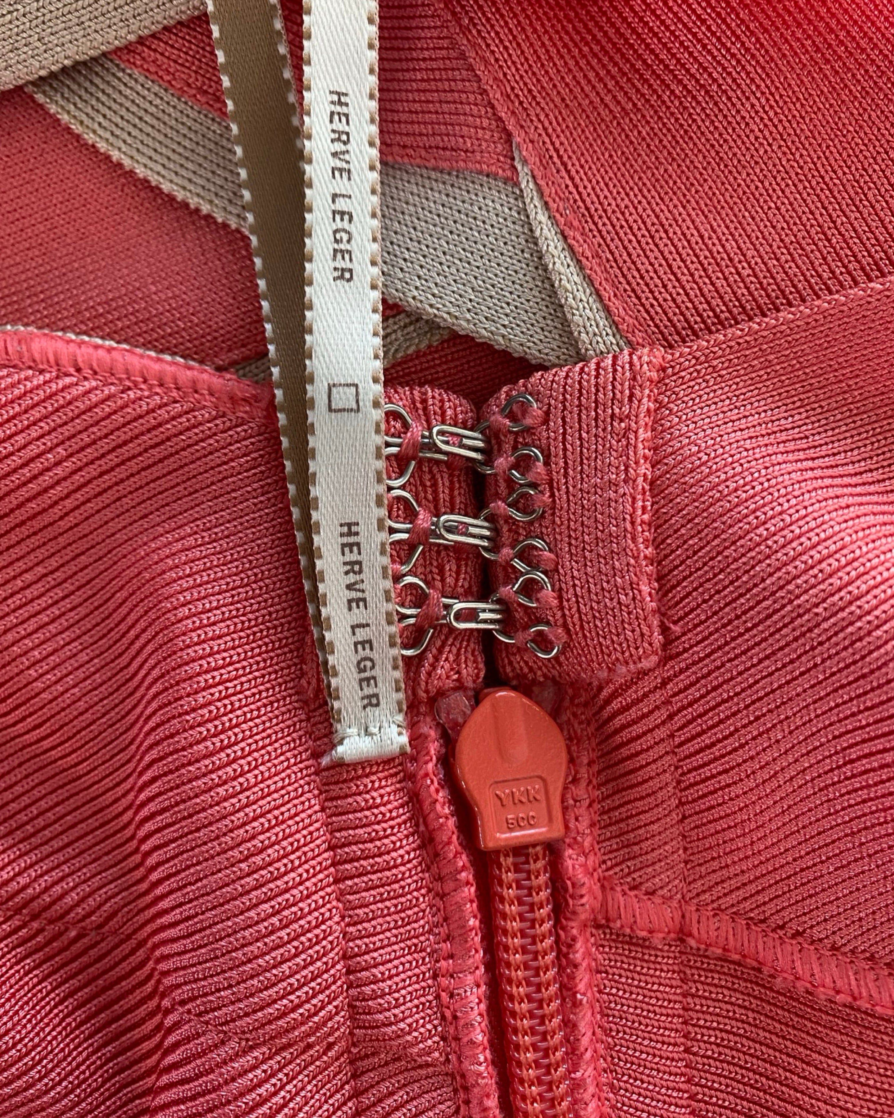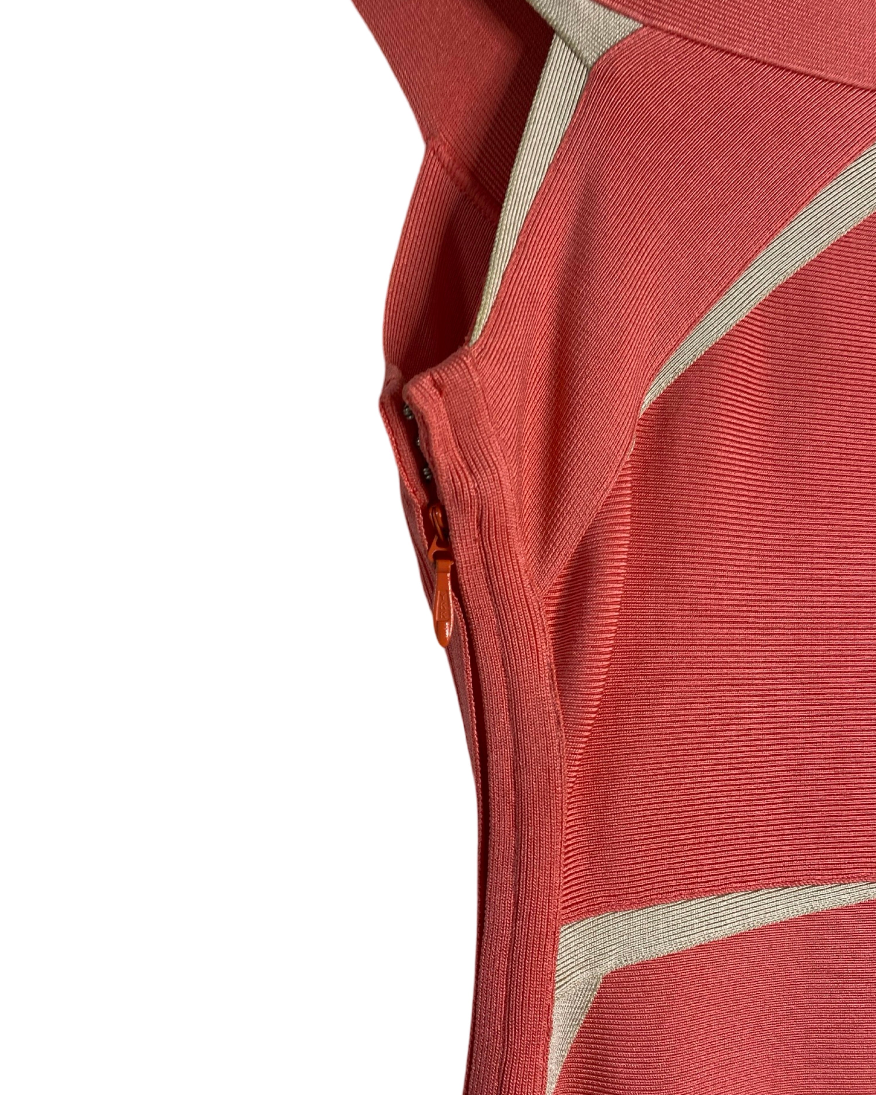Turn heads in this iconic Hervé Leger dress, featuring intricately knit stretch fabric and a body-hugging silhouette. The plunging V-neckline and cap sleeves add a touch of elegance, while the right-side zip ensures a perfect fit. Made with high-quality materials, this dress in peach and beige is perfect for any occasion.