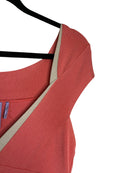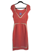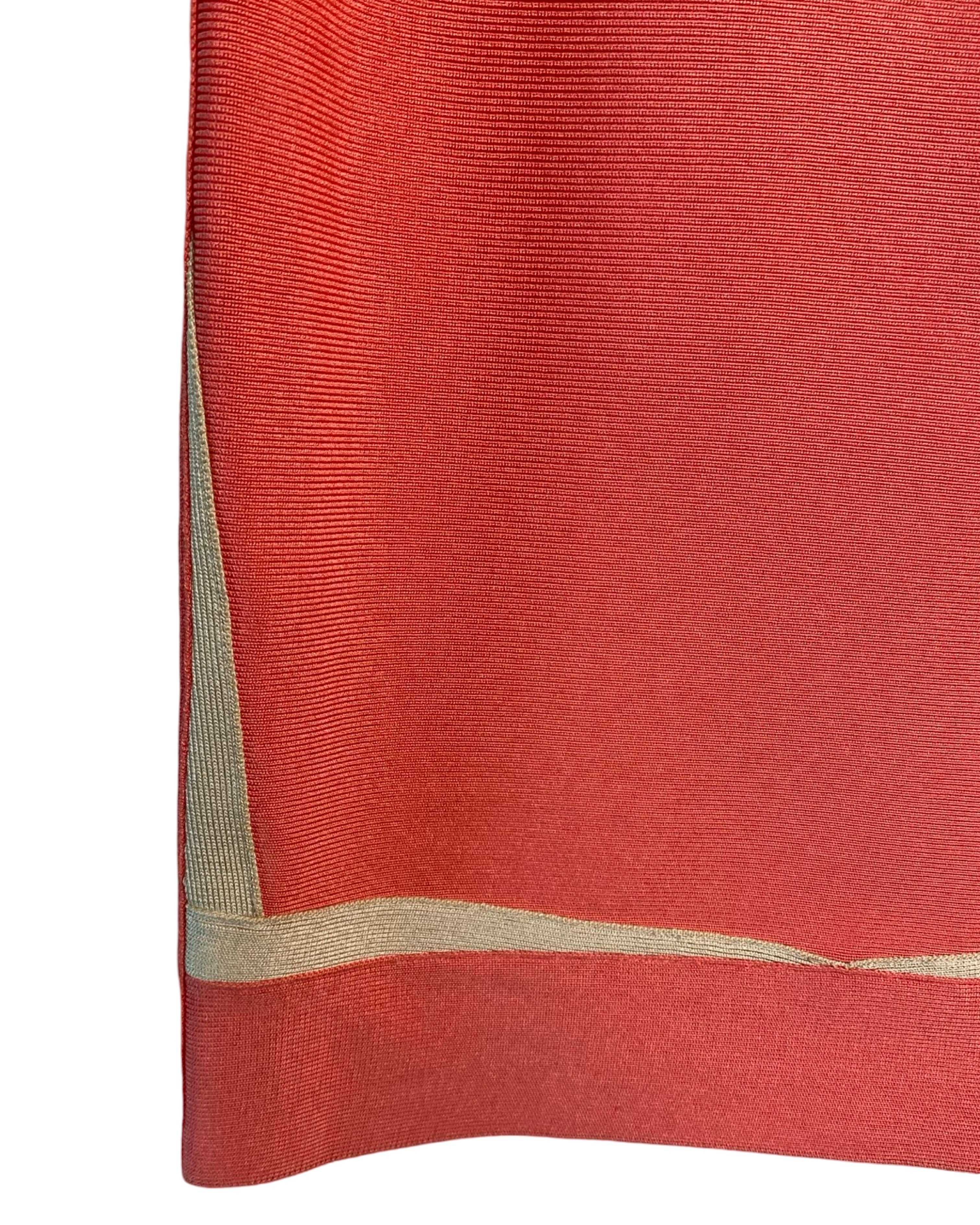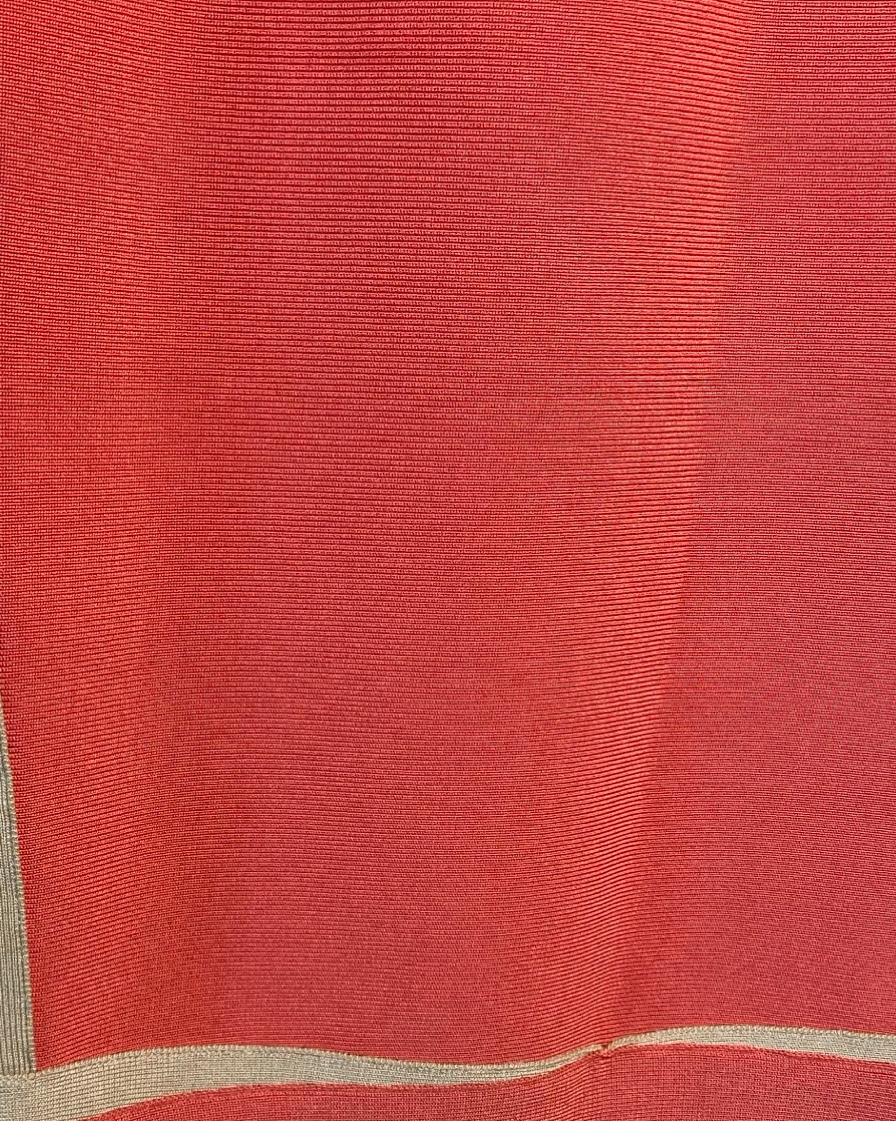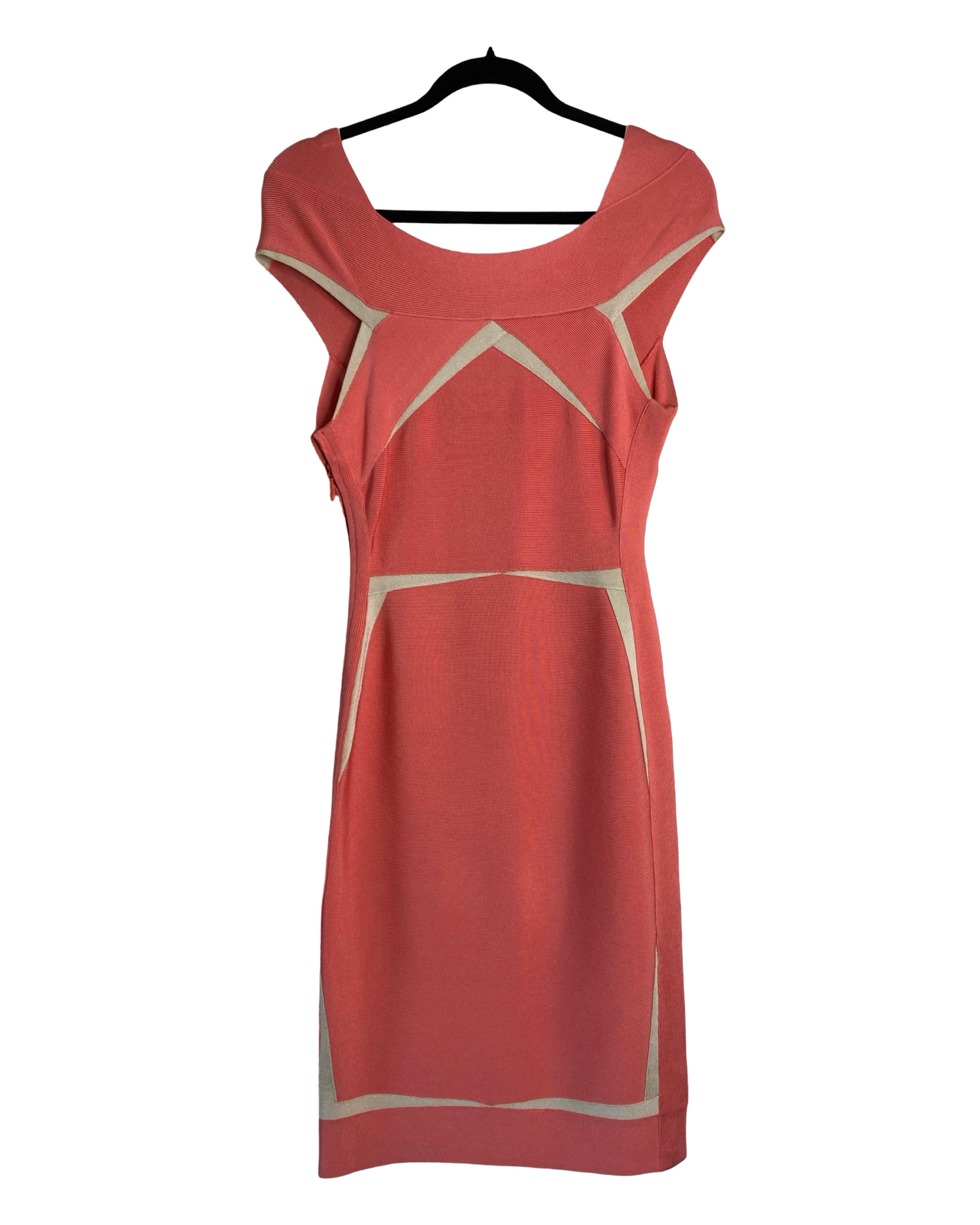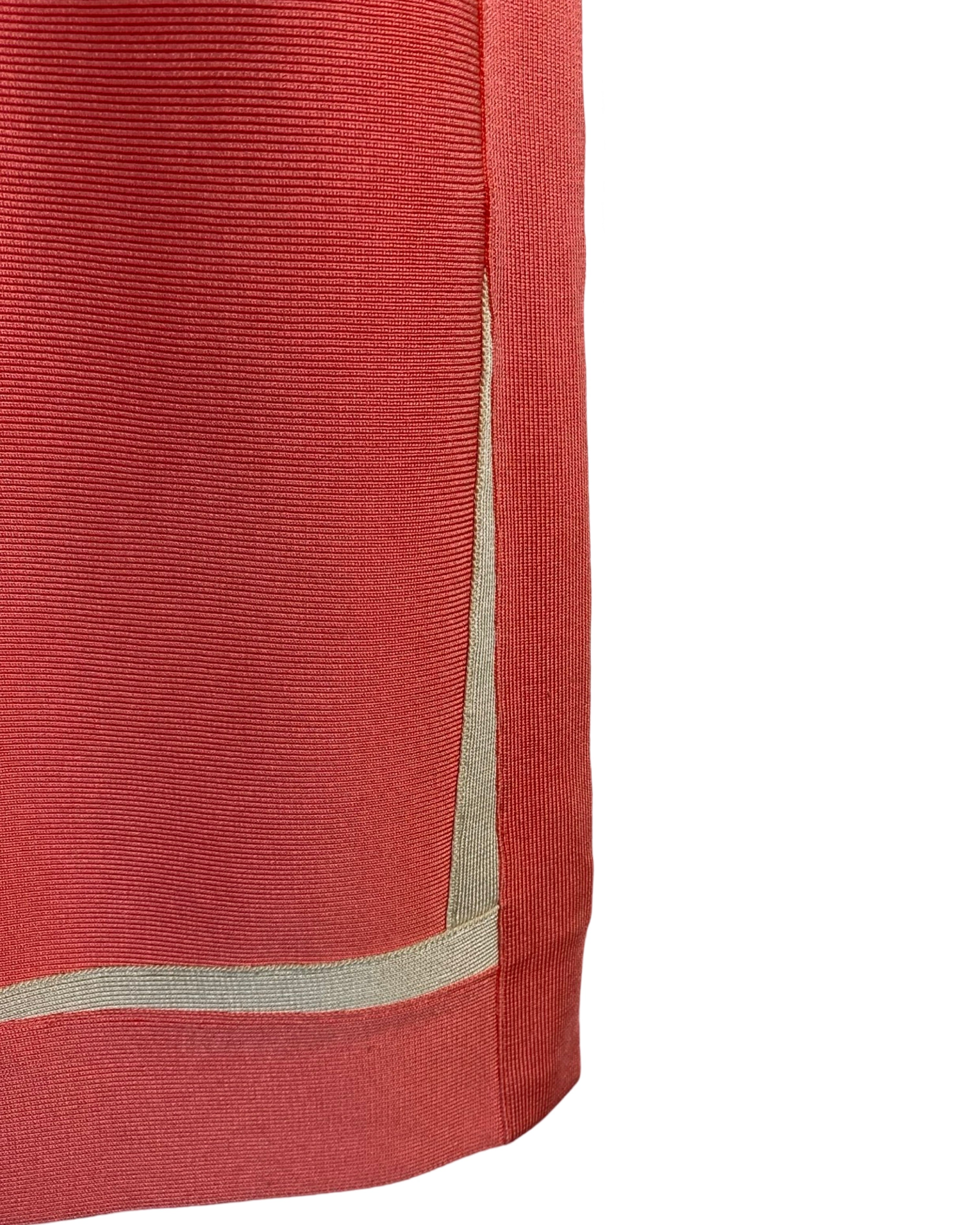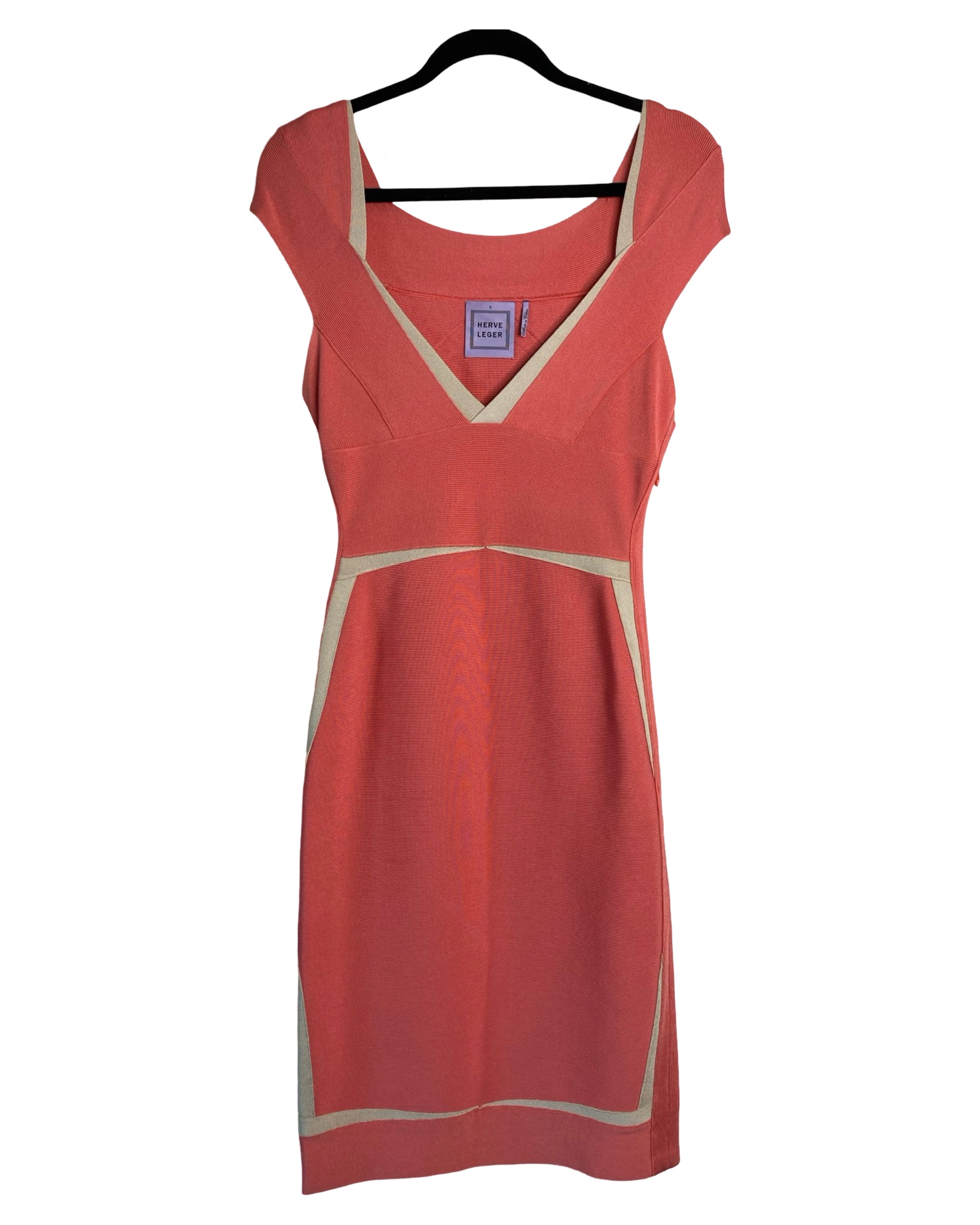 Turn heads in this iconic Hervé Leger dress, featuring intricately knit stretch fabric and a body-hugging silhouette. The plunging V-neckline and cap sleeves add a touch of elegance, while the right-side zip ensures a perfect fit. Made with high-quality materials, this dress in peach and beige is perfect for any occasion.