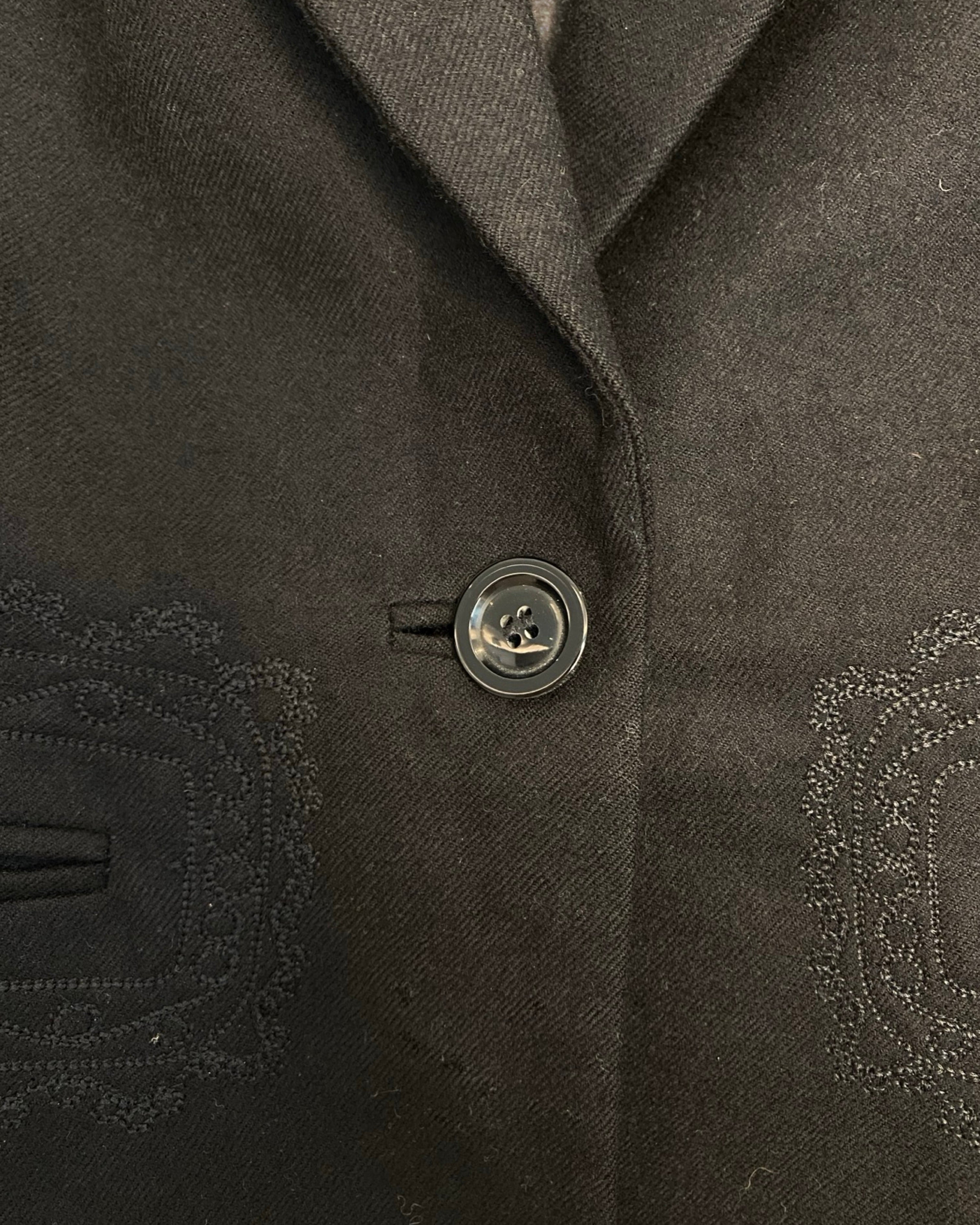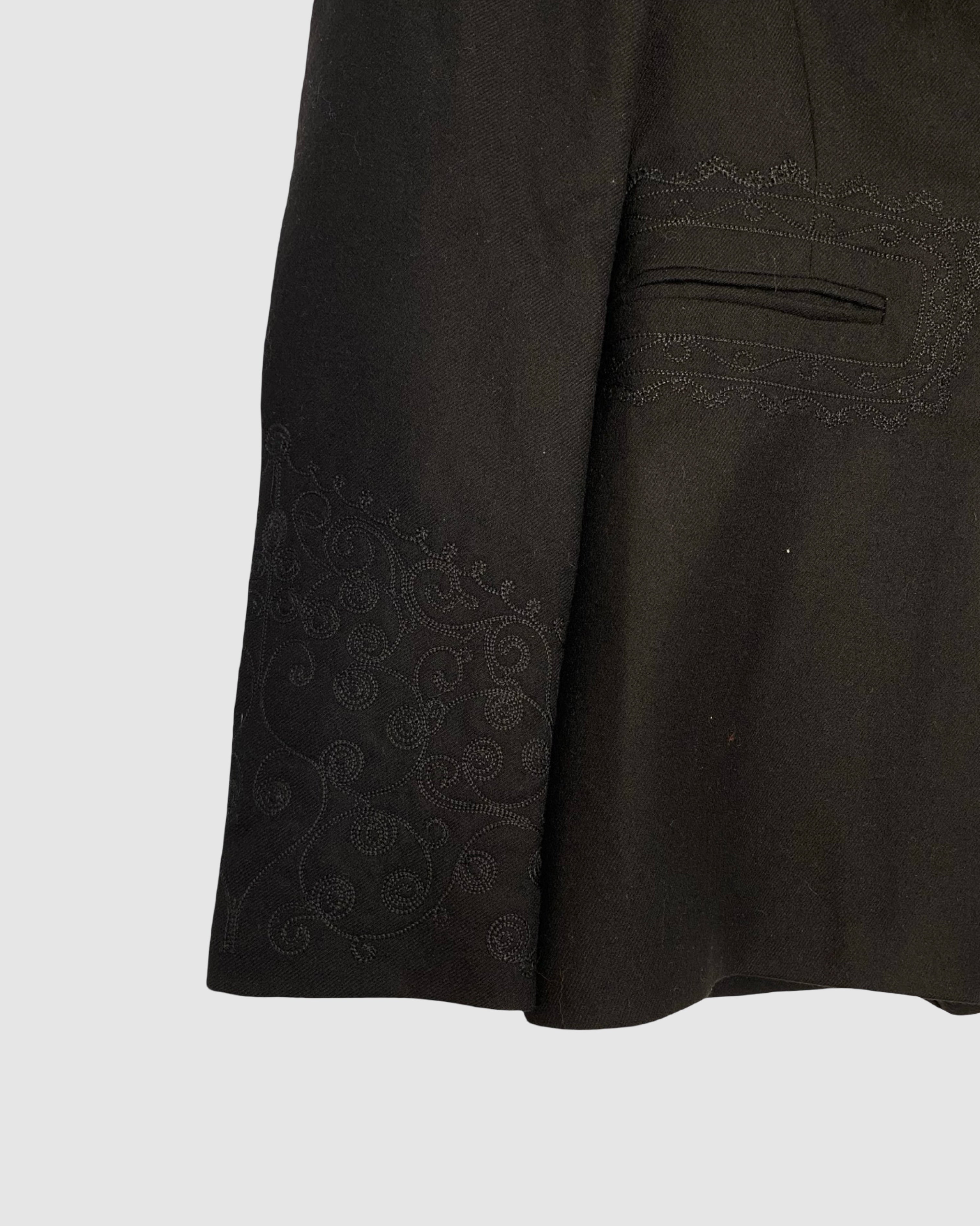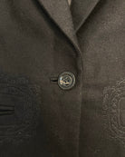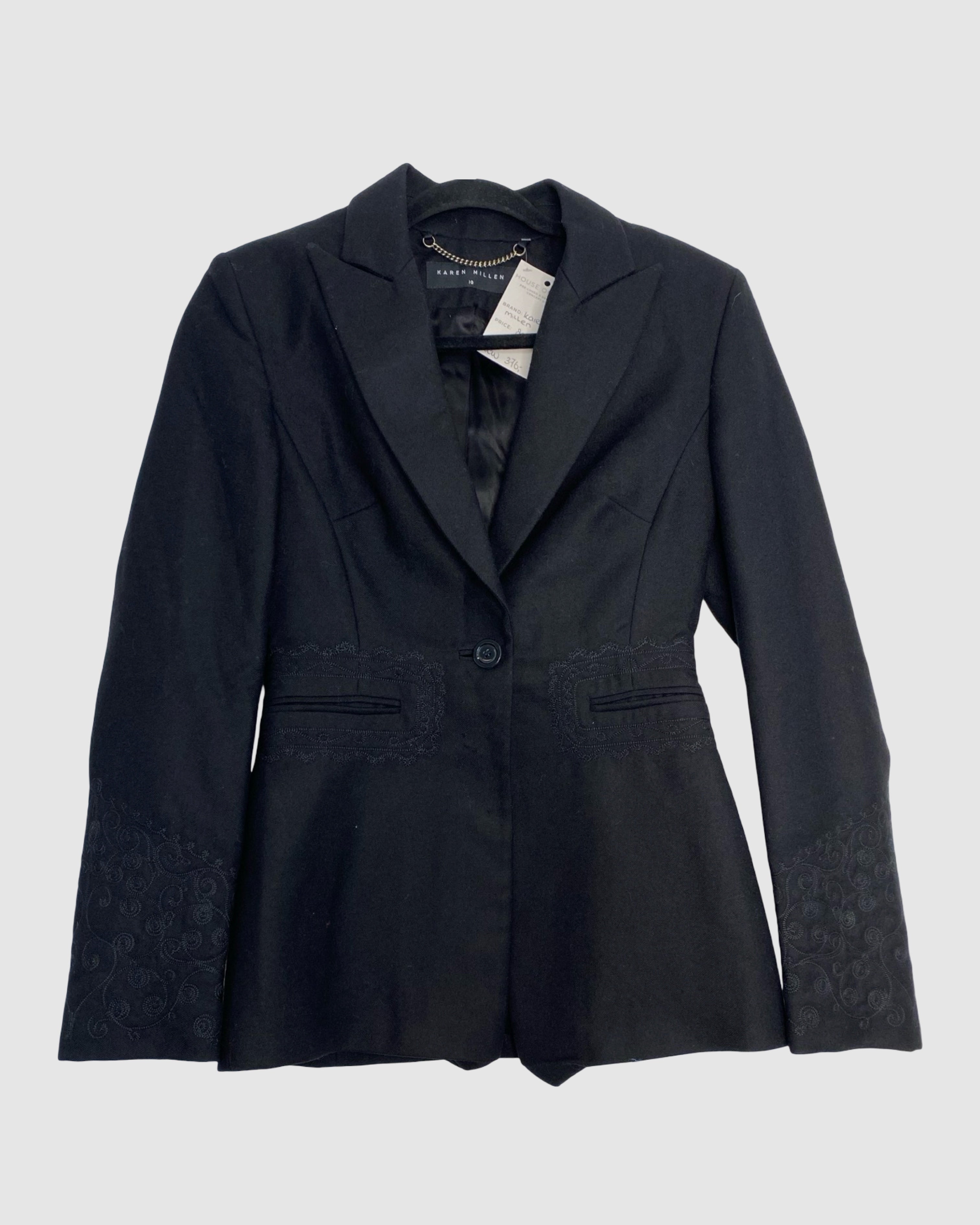 Sophisticated and statement-making, this Karen Millen black blazer features intricate embroidery that adds texture and refined detail to its tailored silhouette. Crafted from wool, it’s perfect for elevating both professional and evening looks with a touch of elegance. Size: S.