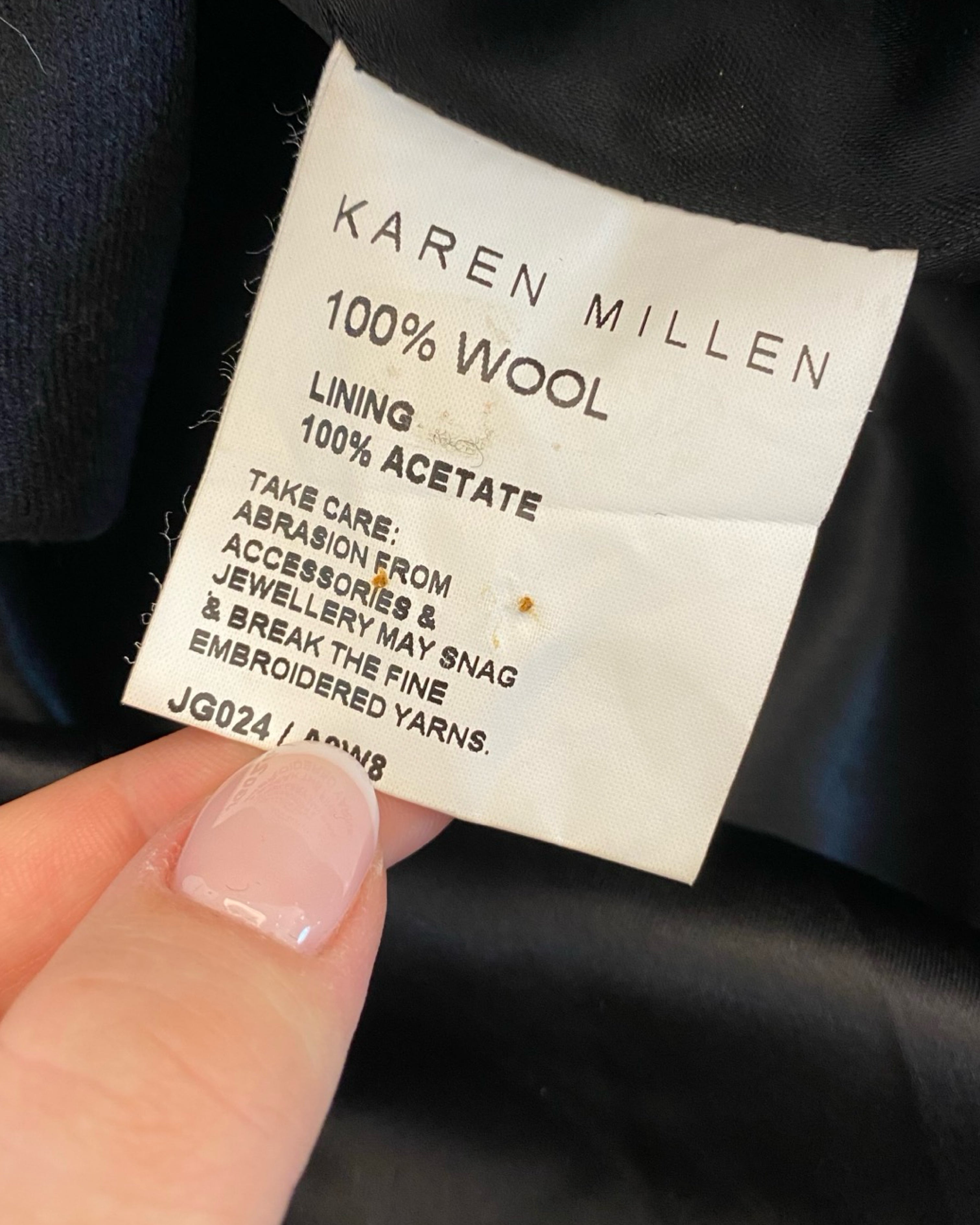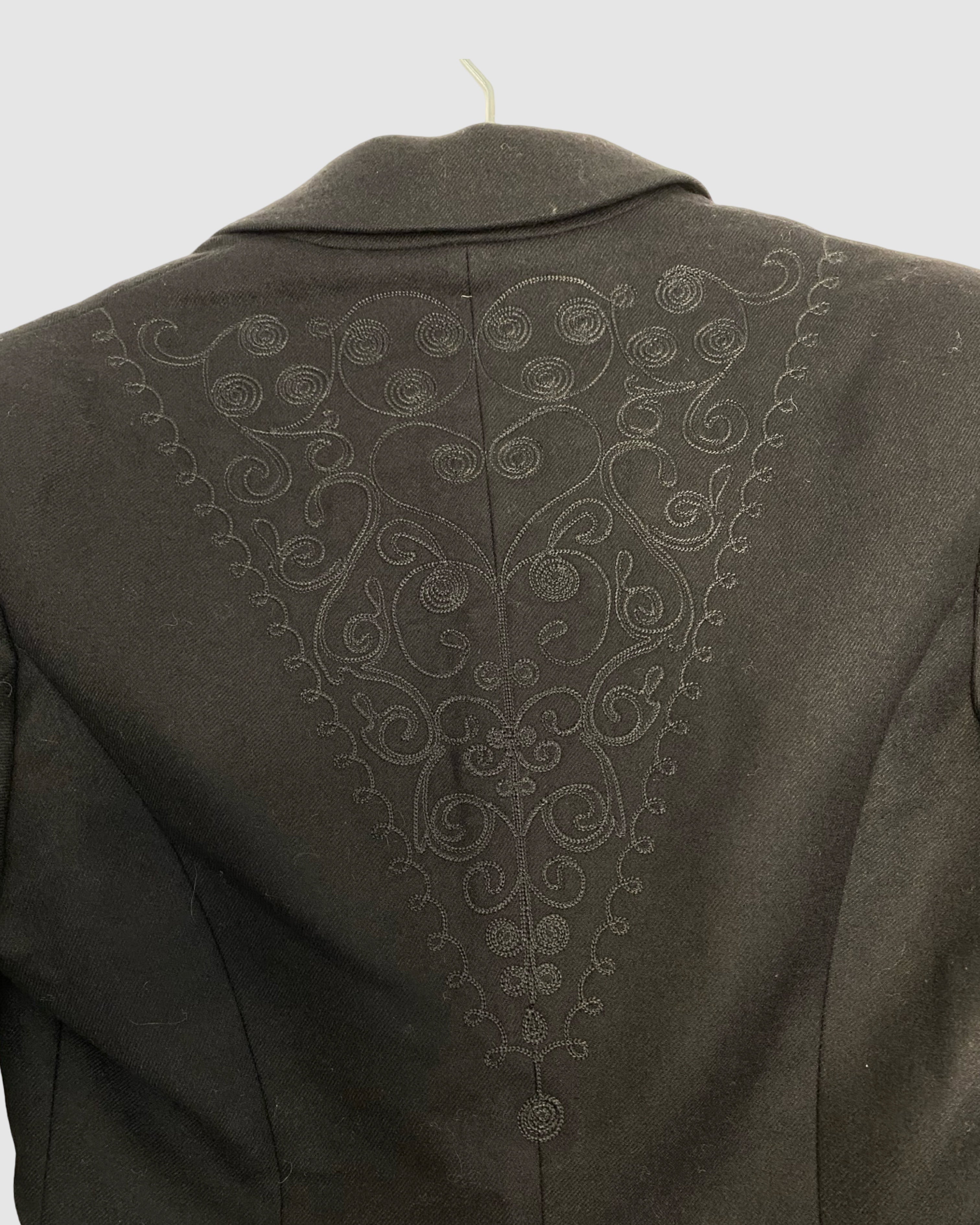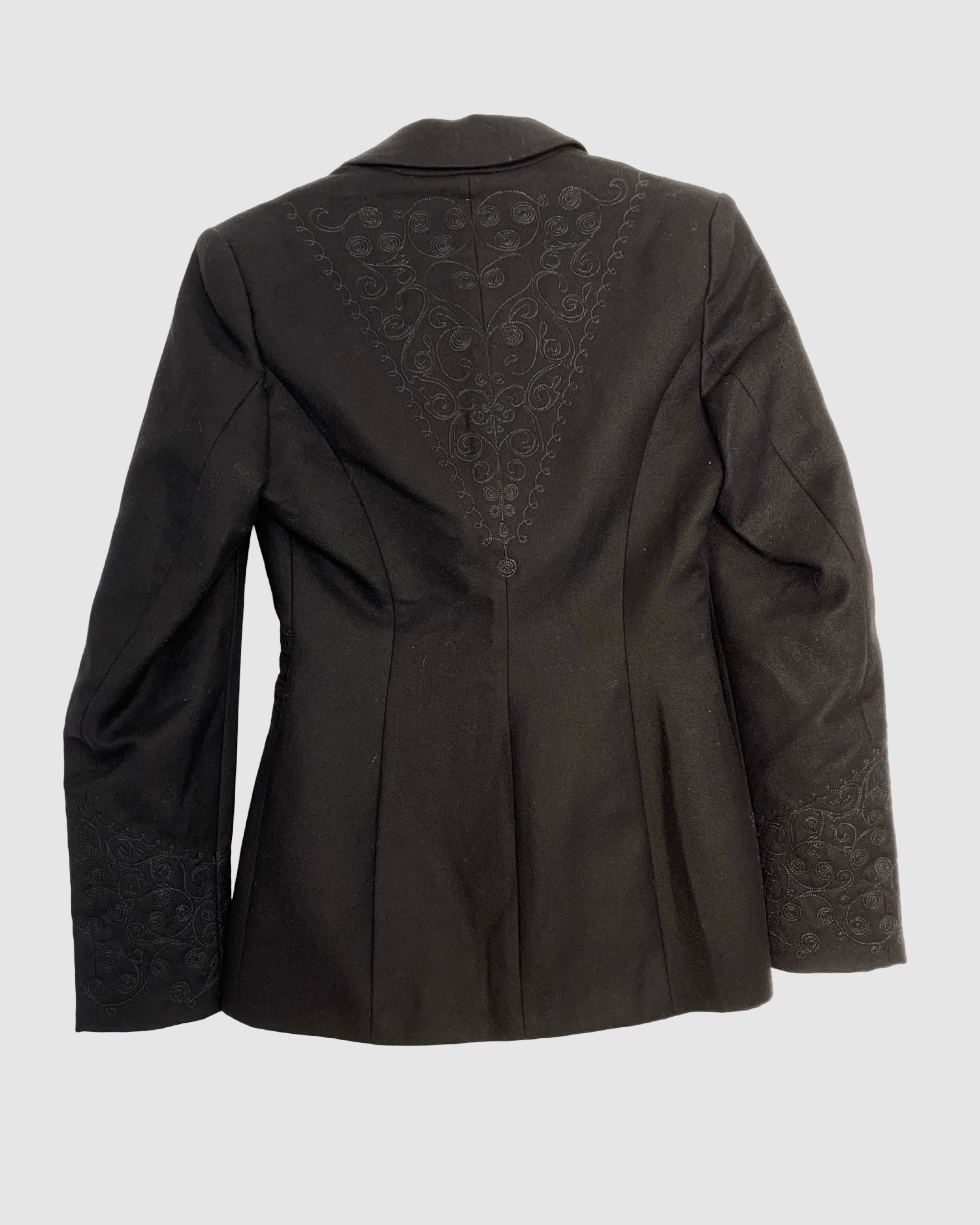 Sophisticated and statement-making, this Karen Millen black blazer features intricate embroidery that adds texture and refined detail to its tailored silhouette. Crafted from wool, it’s perfect for elevating both professional and evening looks with a touch of elegance. Size: S.