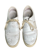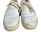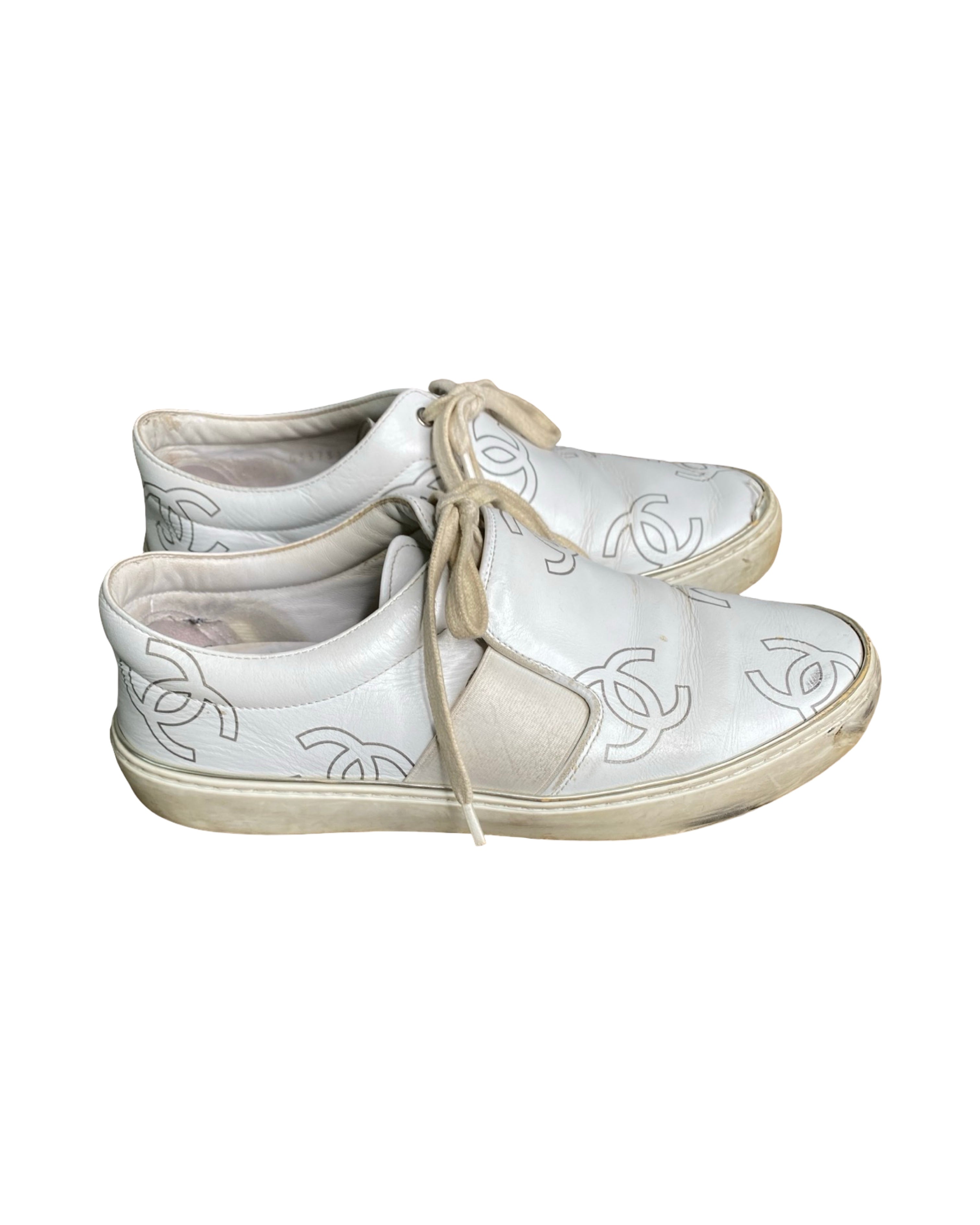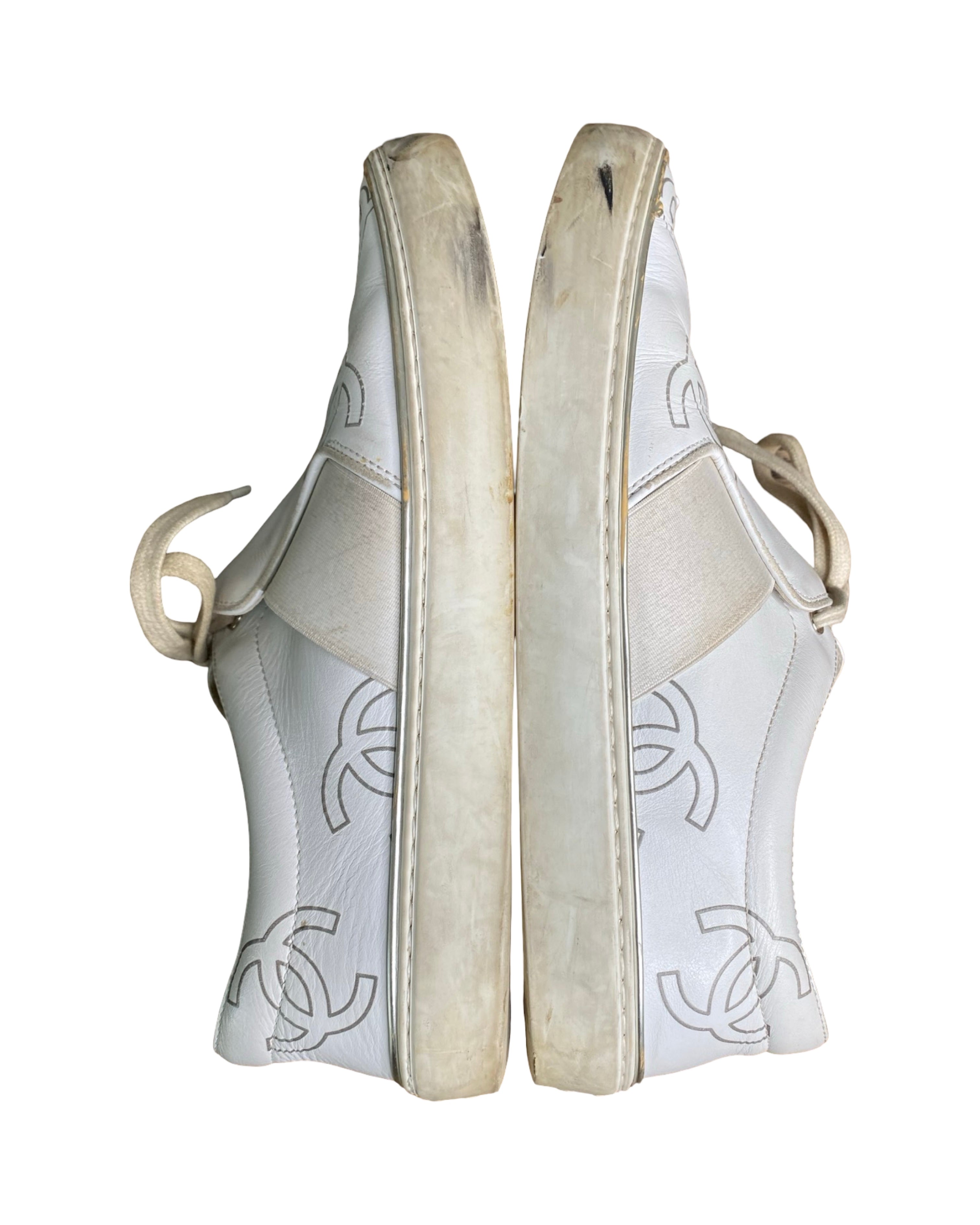 Classic and timeless, these Chanel sneakers in size 39 feature premium white leather adorned with the iconic interlocking CC logo, effortlessly blending luxury with everyday style. The lace-up design ensures a secure fit, while the sleek silhouette offers versatility for both casual and elevated outfits. With a 27 cm foot length and 3 cm heel height, these sneakers provide comfort without compromising on elegance, making them a chic wardrobe staple that embodies Chanel’s signature sophistication.