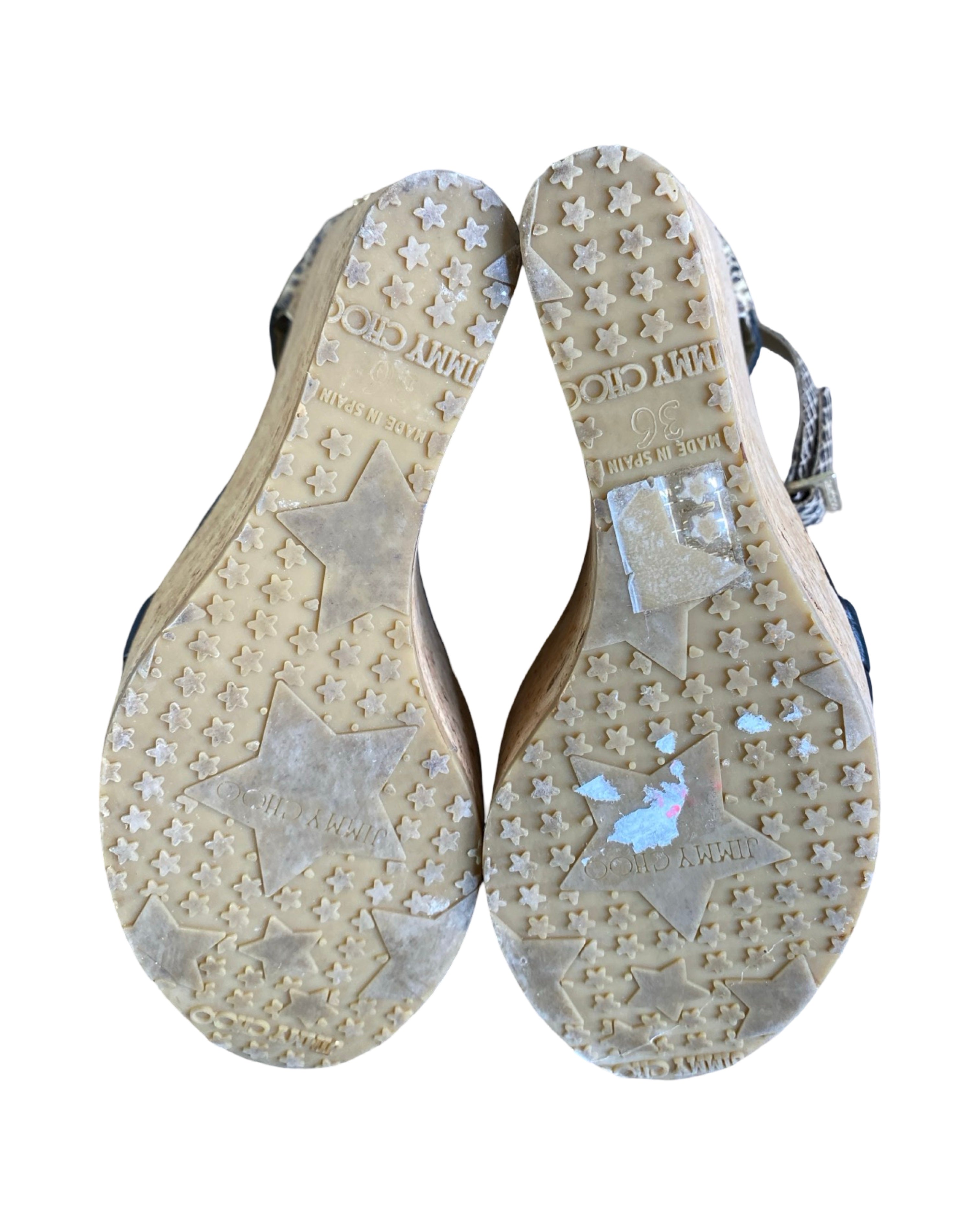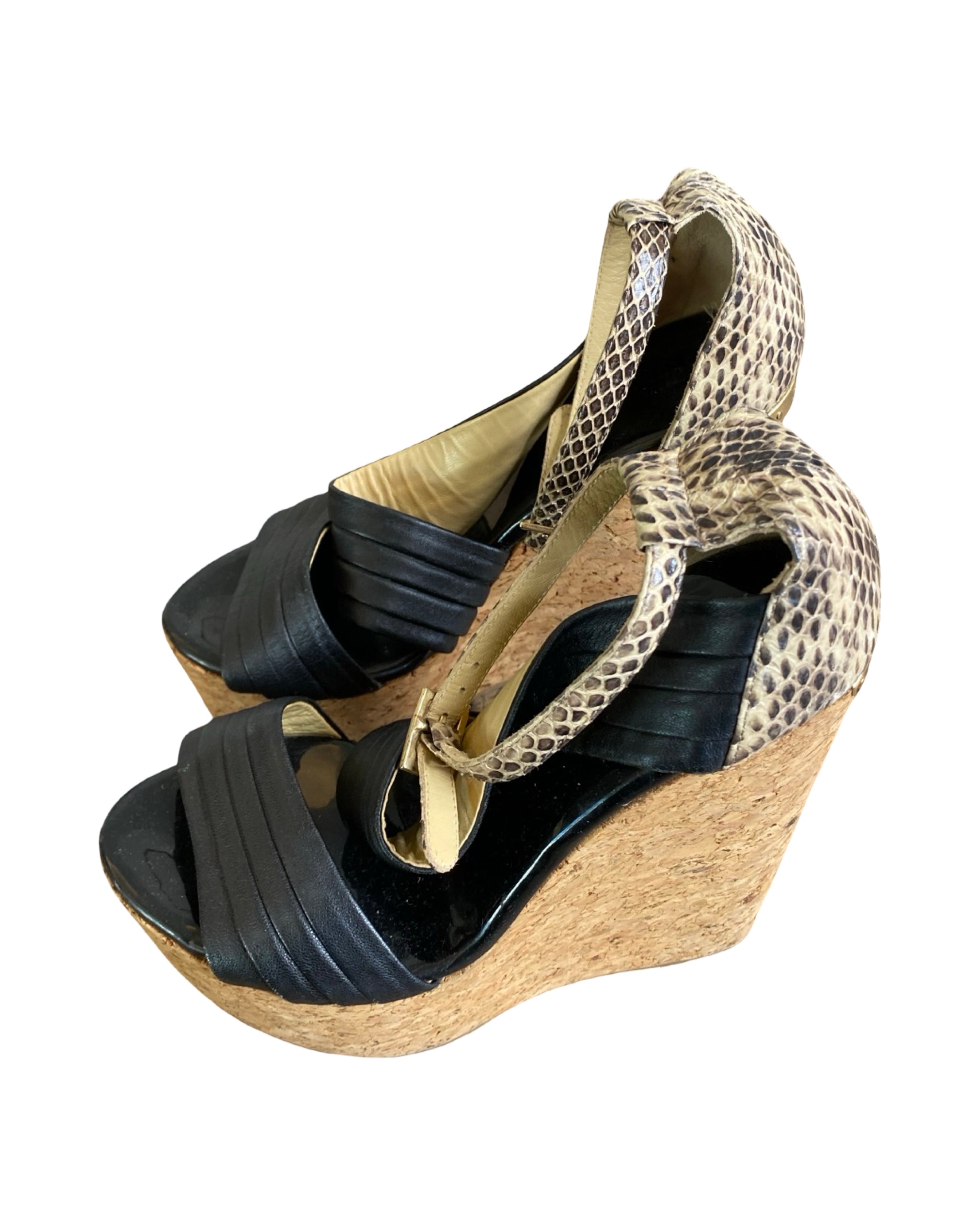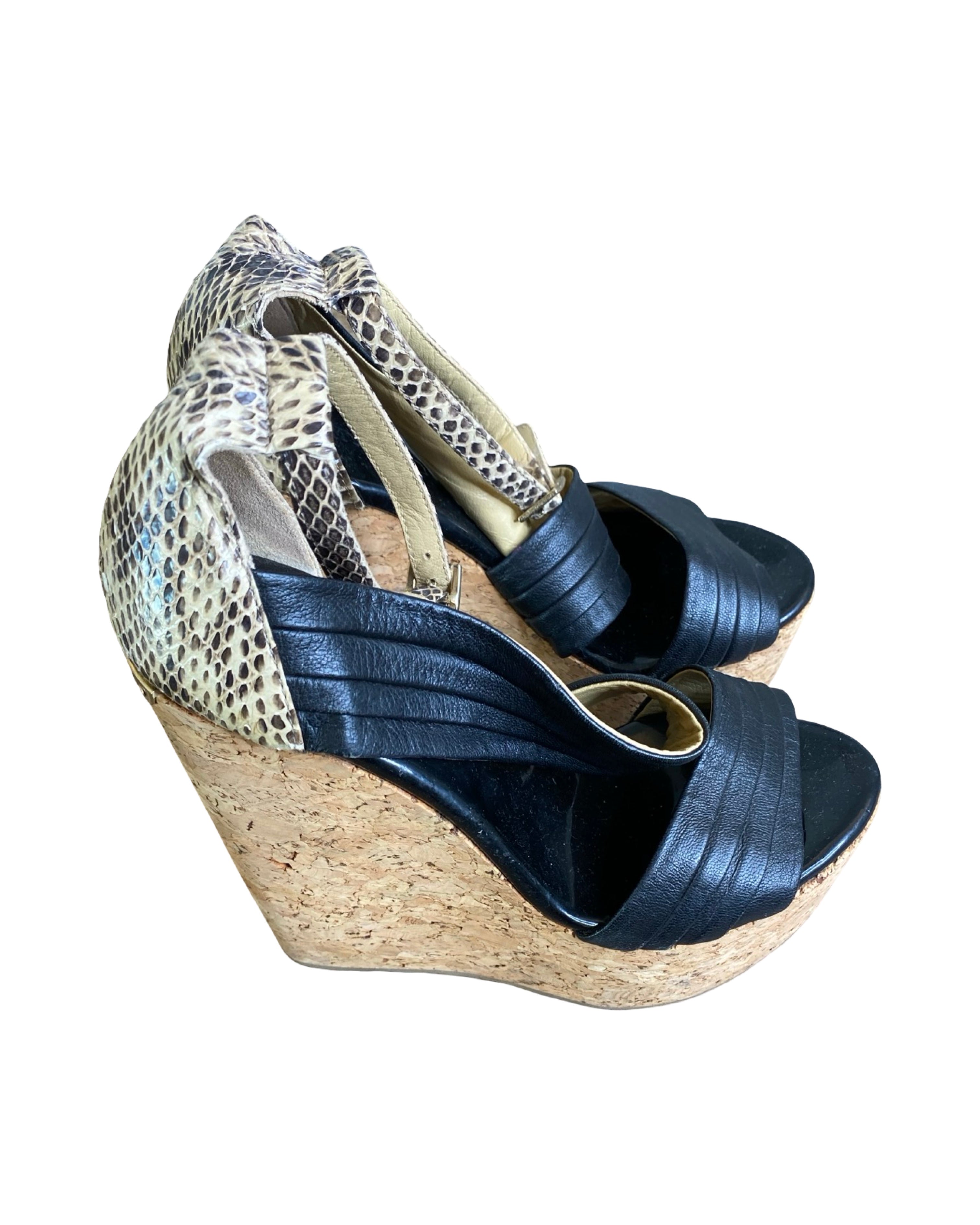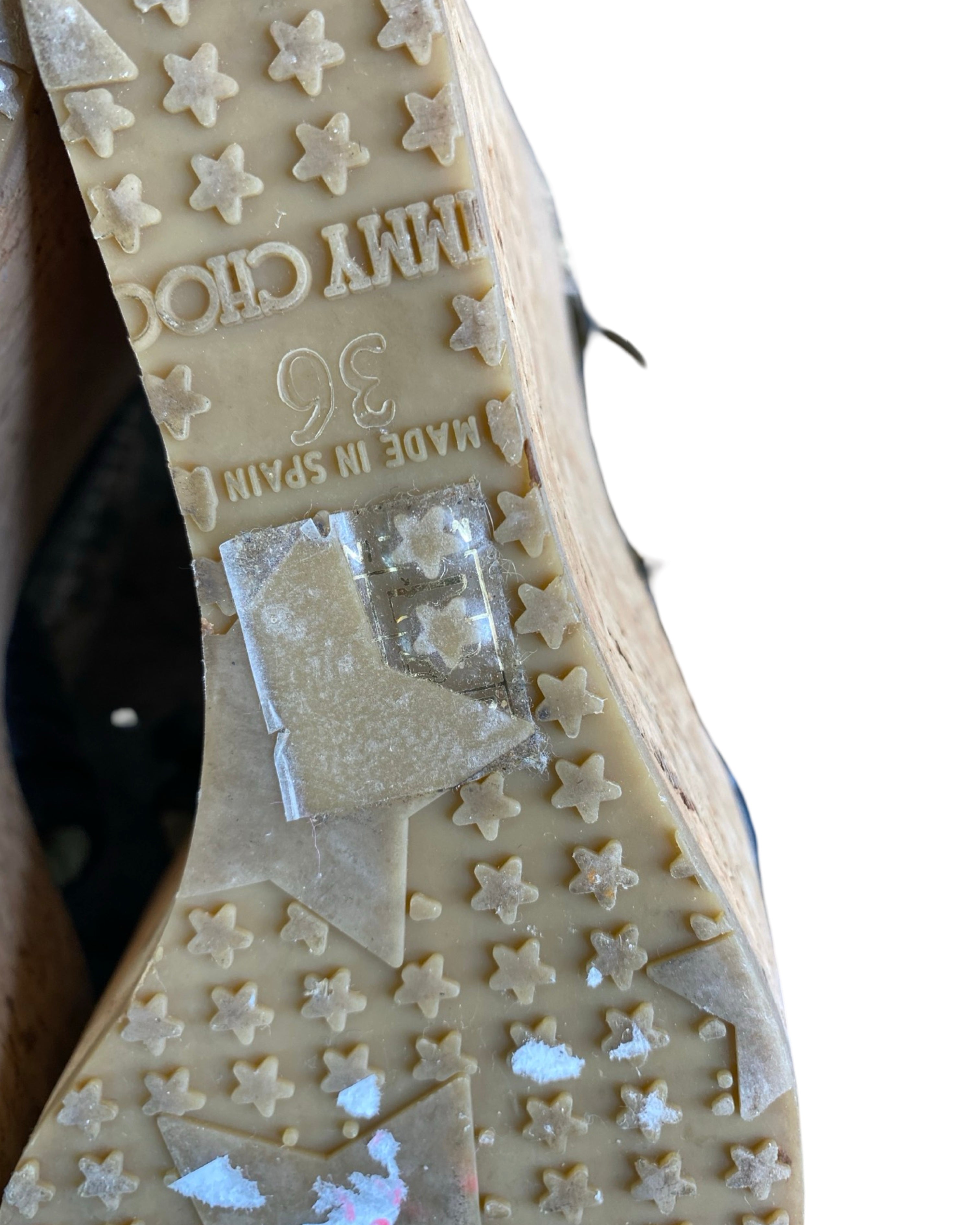 Sophisticated and edgy, these Jimmy Choo wedge heels in size 36 combine classic black leather with a striking snake print accent for a bold, modern statement. Featuring a 14 cm wedge heel and a 24 cm foot length, the comfortable design ensures all-day wear, while the luxurious craftsmanship reflects the brand’s signature elegance. Perfect for elevating both casual and evening looks, these heels add a daring yet refined touch to any wardrobe.