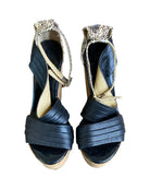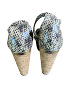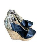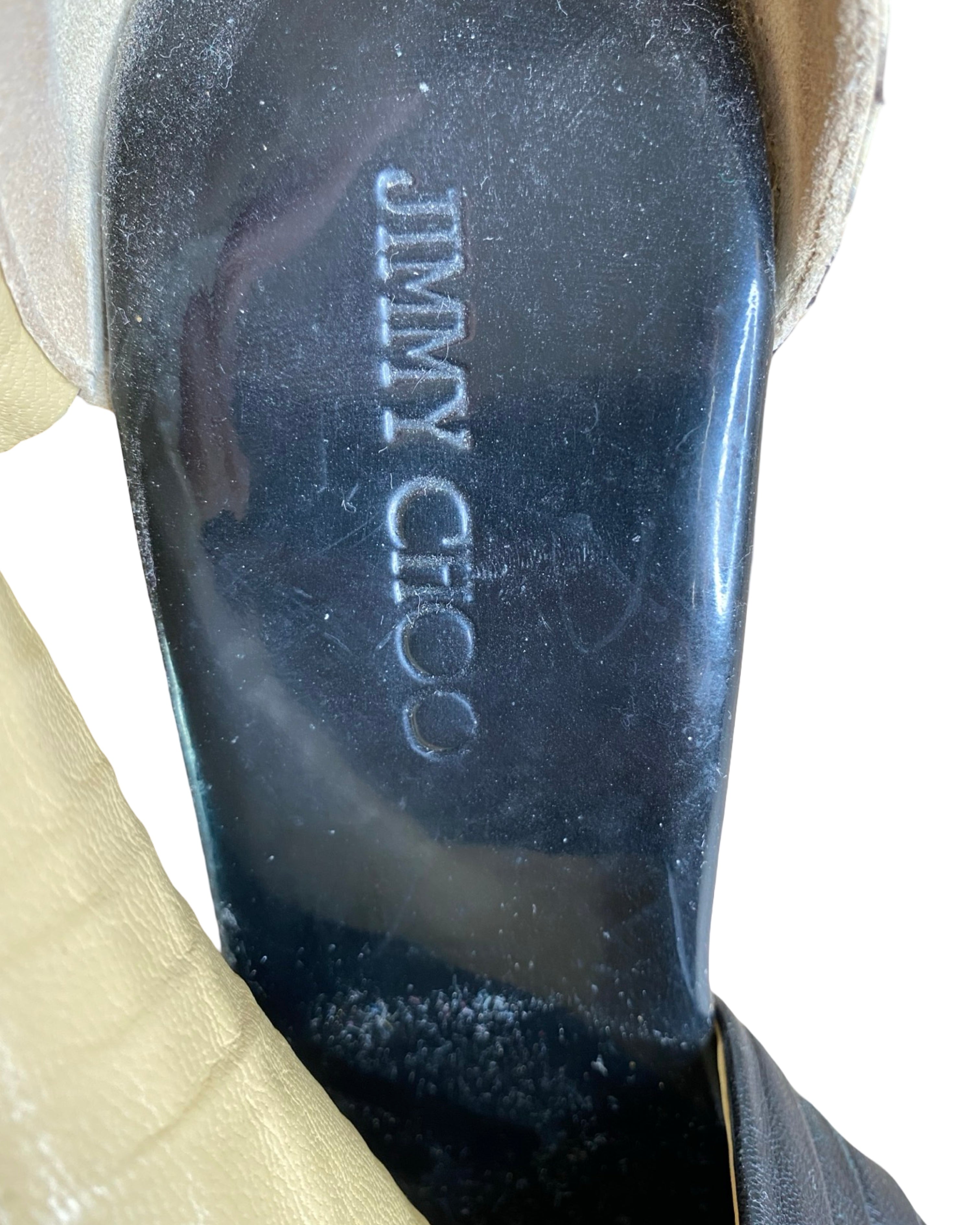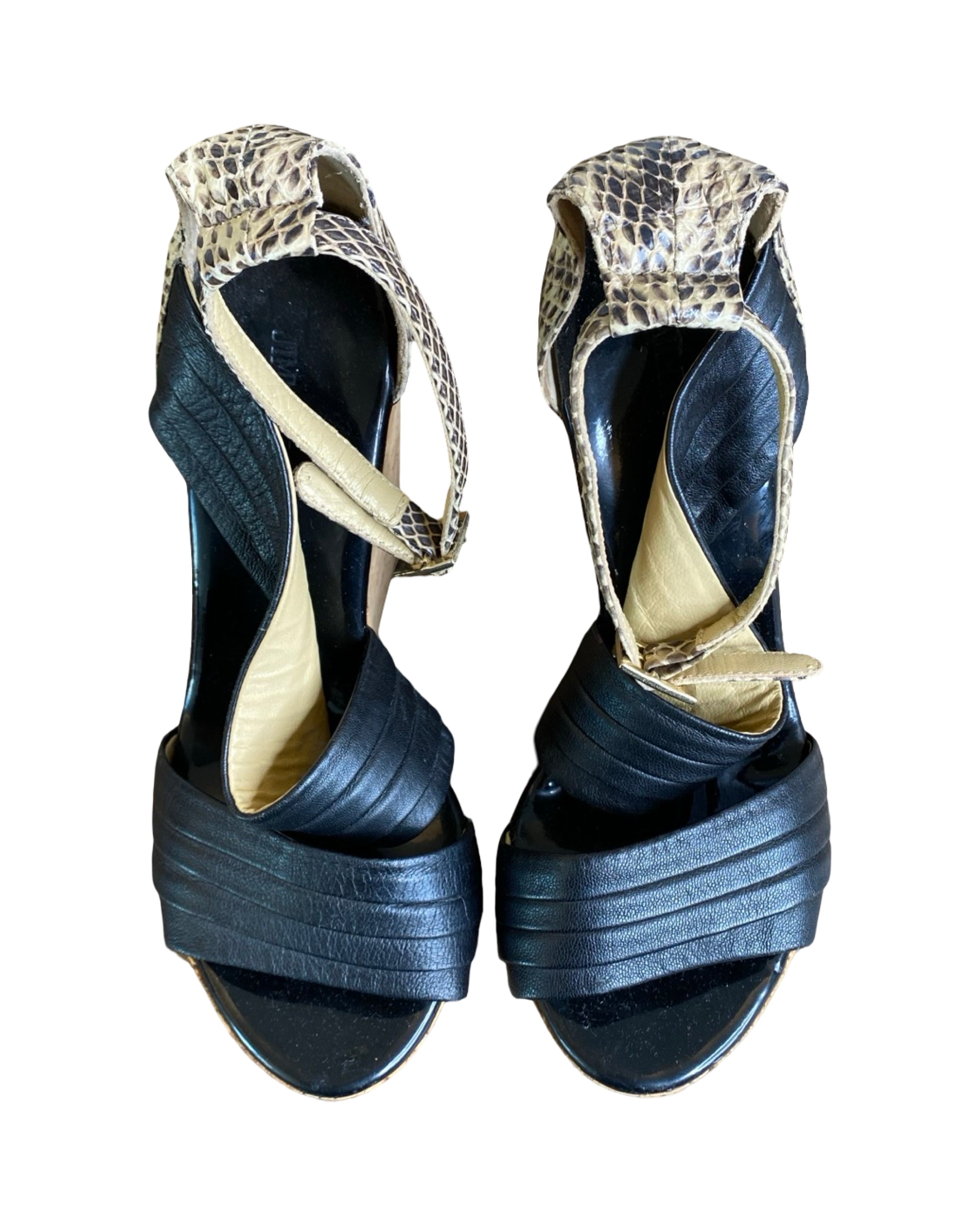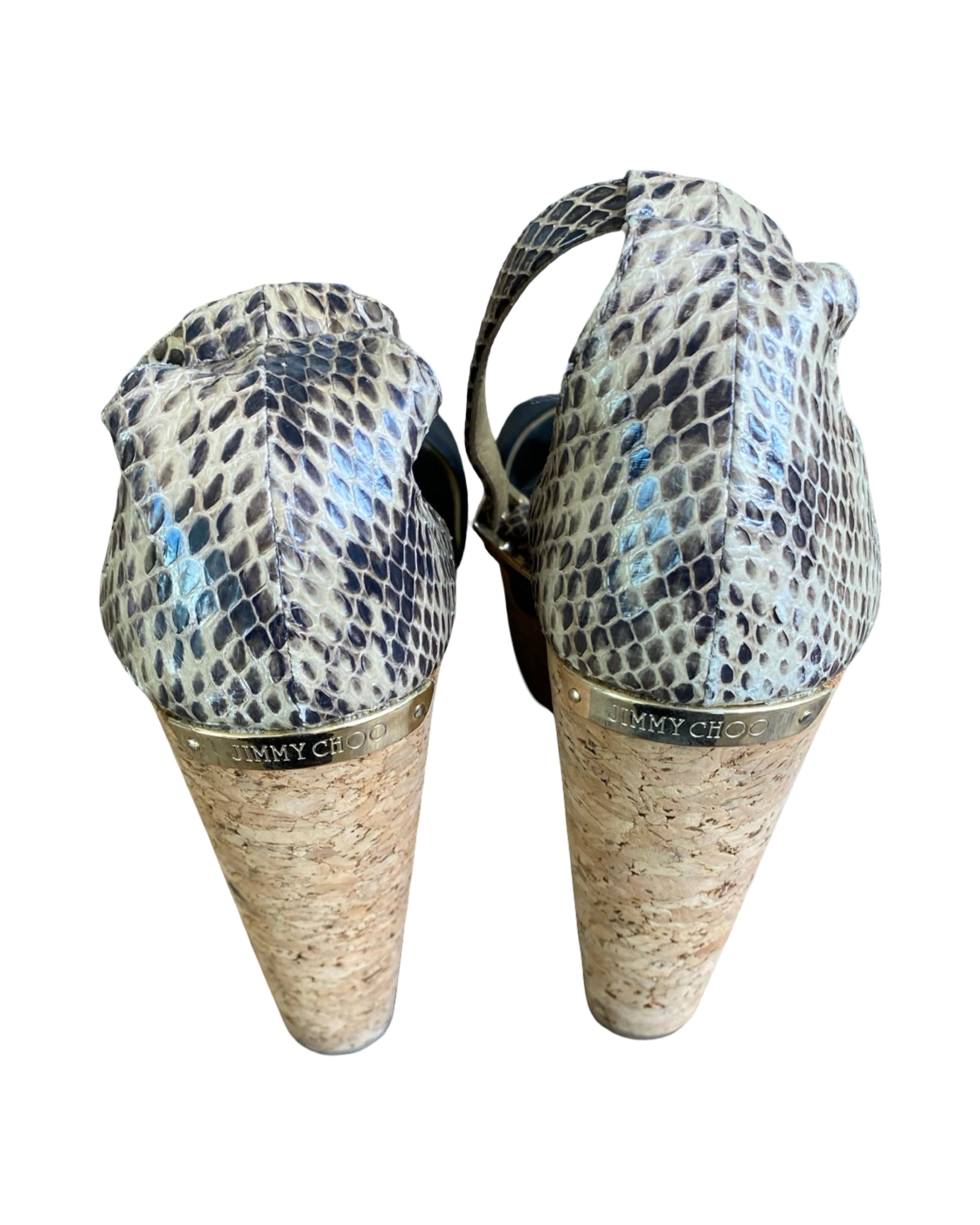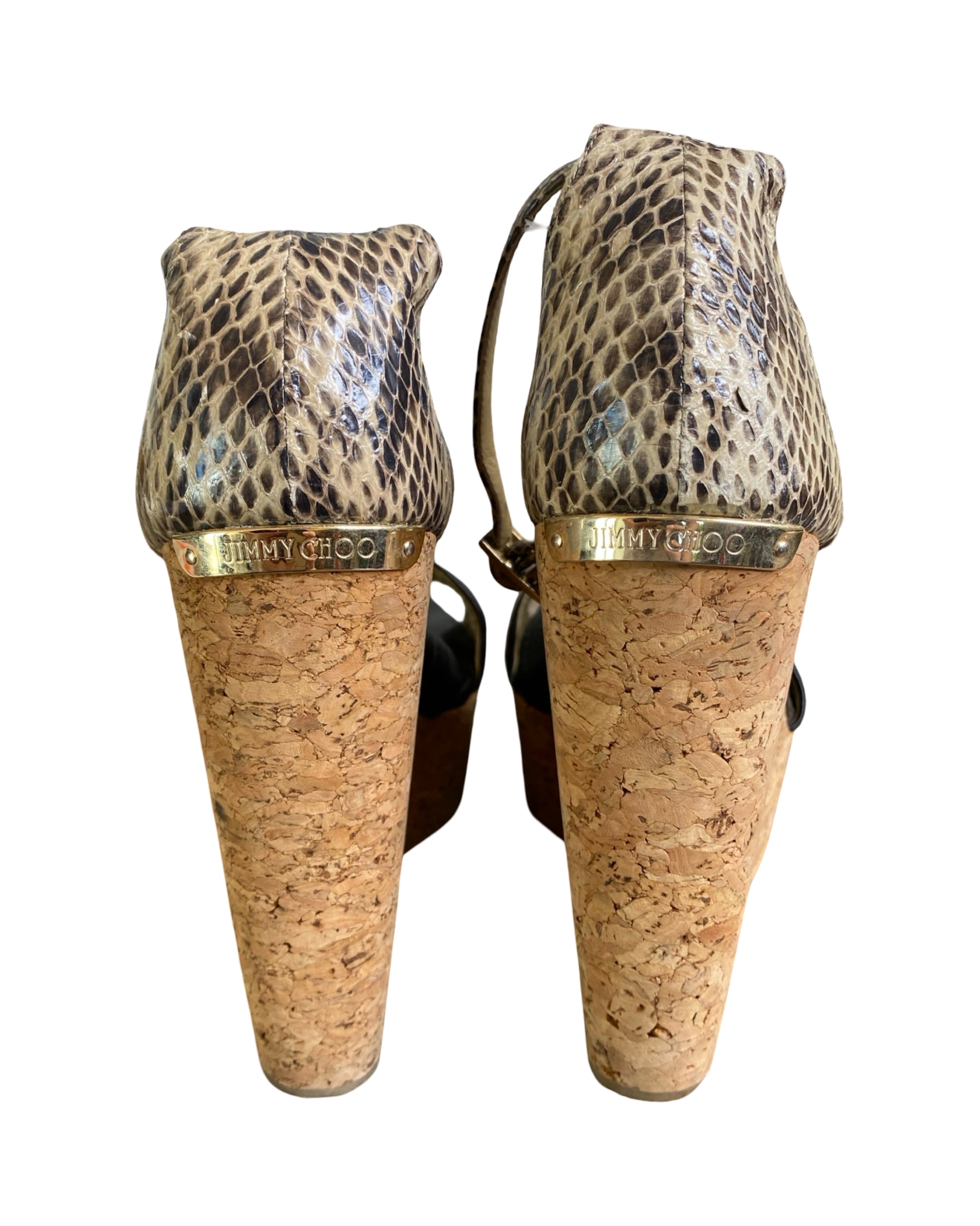 Sophisticated and edgy, these Jimmy Choo wedge heels in size 36 combine classic black leather with a striking snake print accent for a bold, modern statement. Featuring a 14 cm wedge heel and a 24 cm foot length, the comfortable design ensures all-day wear, while the luxurious craftsmanship reflects the brand’s signature elegance. Perfect for elevating both casual and evening looks, these heels add a daring yet refined touch to any wardrobe.