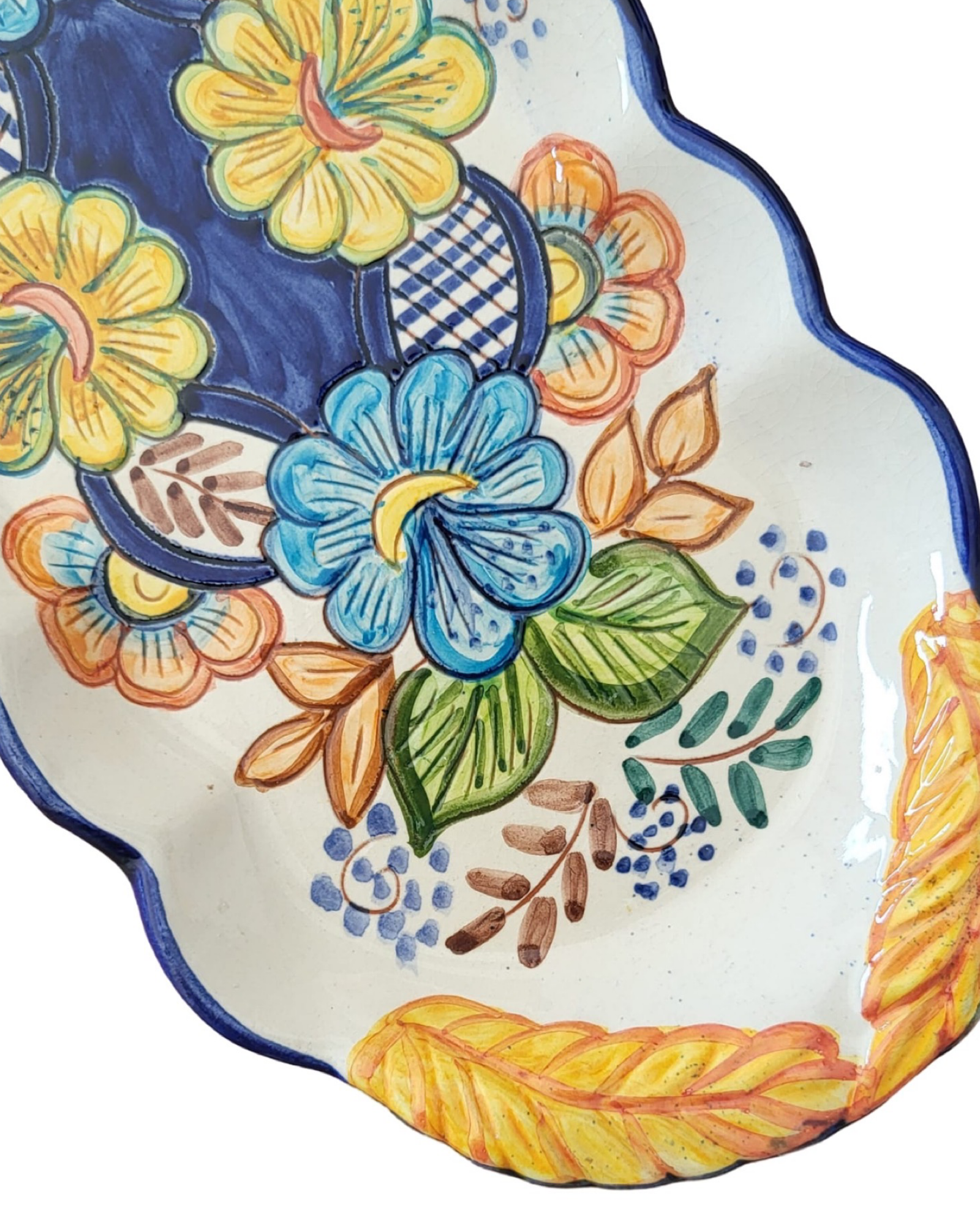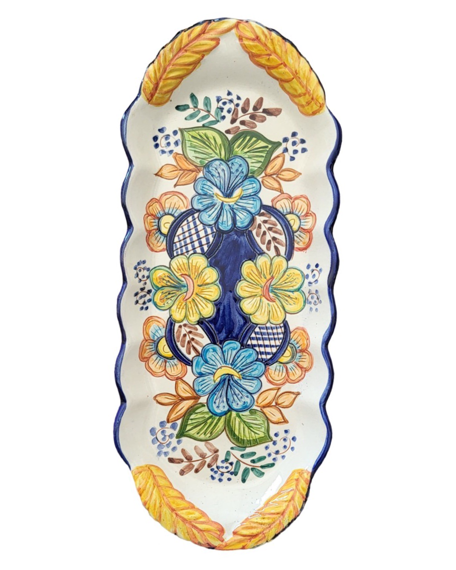 Our handmade traditional floral tray, crafted with 100% ceramic in Portugal. Its intricate floral design and vibrant multicolored palette reflect the beauty of Portuguese craftsmanship. Perfect for coffee table styling or as a decorative piece in the kitchen. Its glossy finish and vintage condition make it a unique and timeless addition to any space. Dimensions: 14 cm (width) x 34 cm (length).