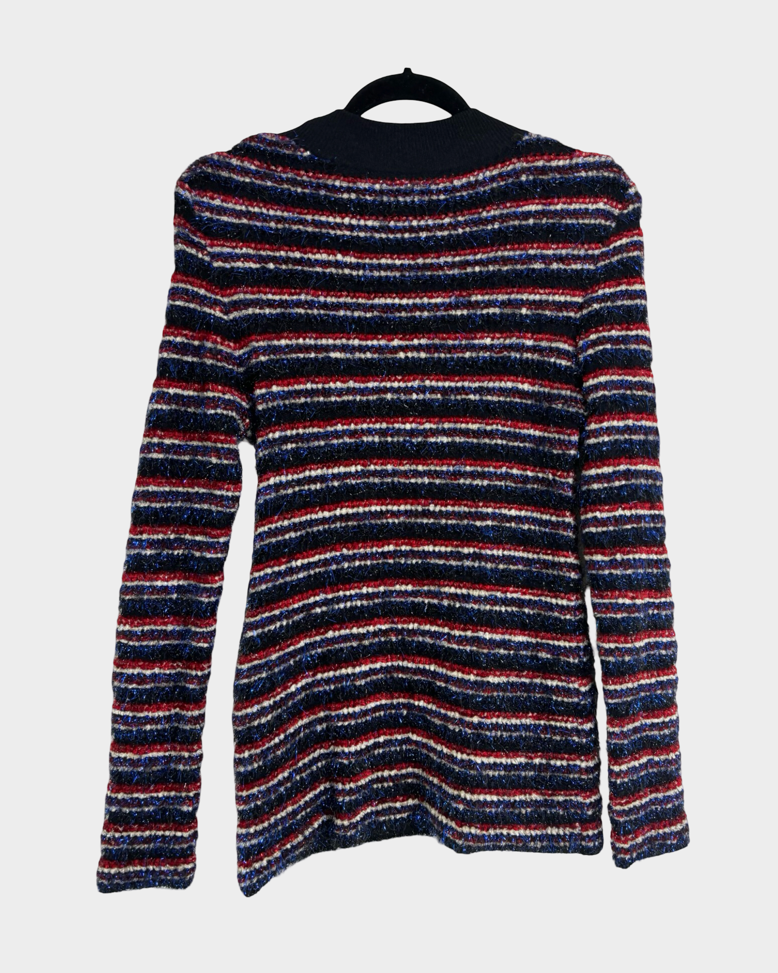 The Balmain Metallic Fiber Jumper is a perfect blend of elegance and artistry, showcasing a striking mix of red, blue, black, and white tones. Crafted from a luxurious combination of viscose, polyamide, polyester, and acetate, this size S (FR 38) piece offers warmth and style, making it ideal for the winter season and holiday occasions. Its metallic fibers add subtle shine, creating a sophisticated statement. Complete your look with the matching skirt for effortless, chic coordination.