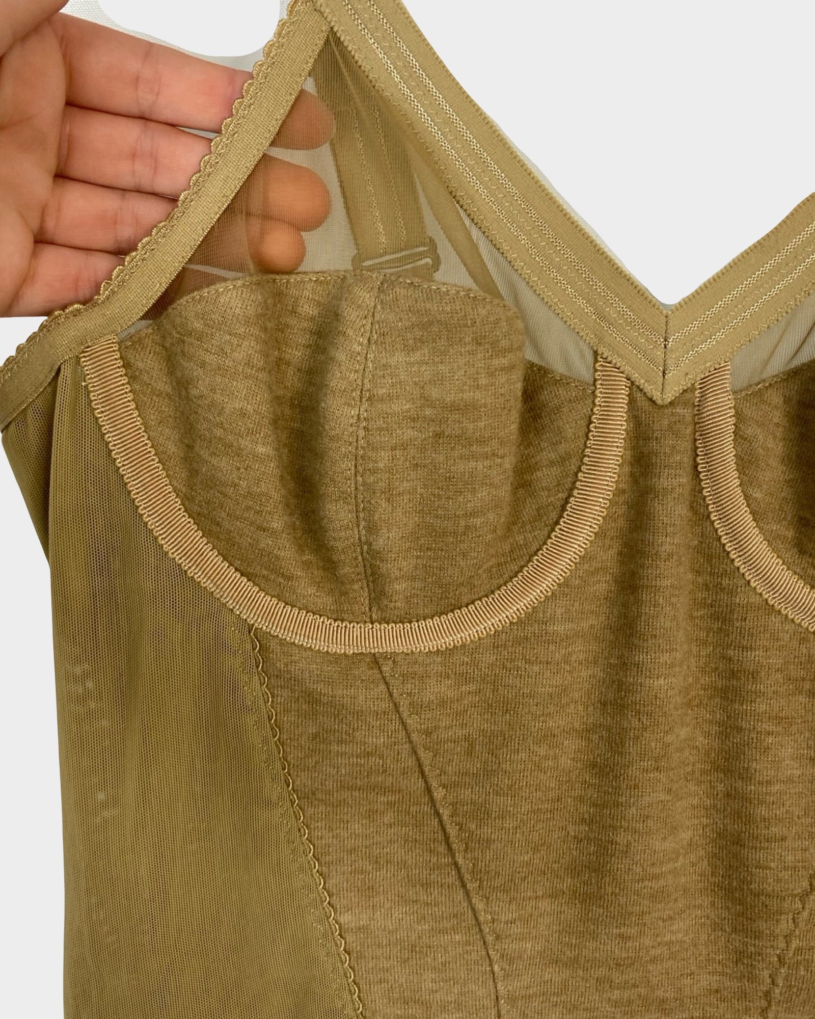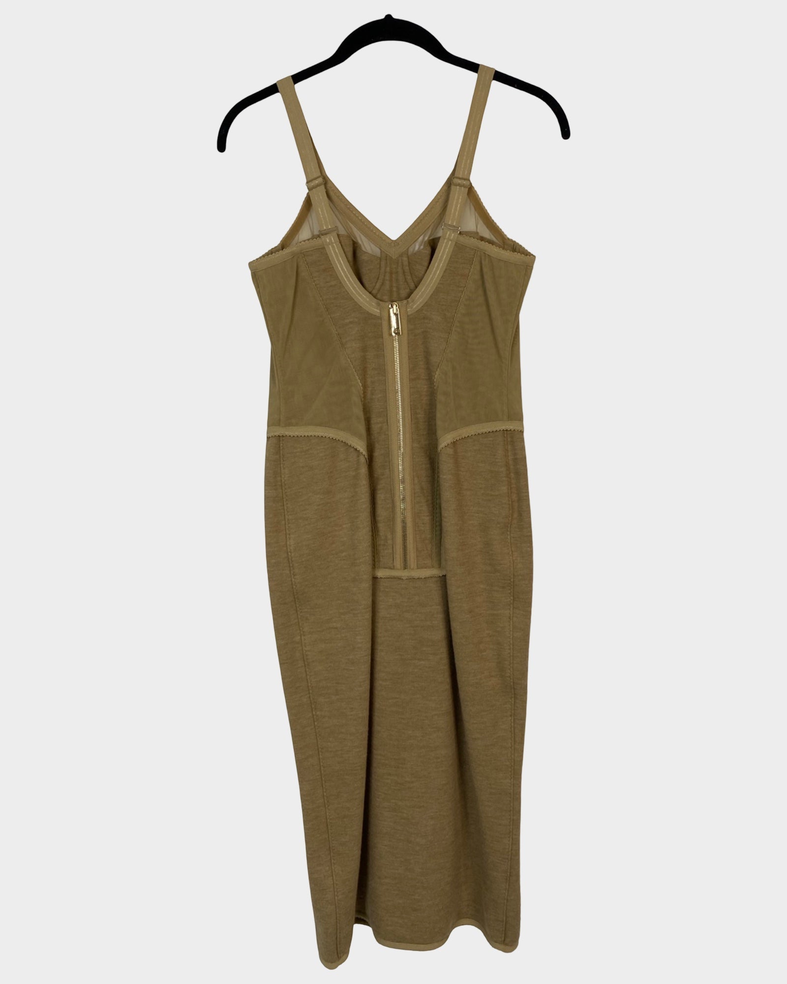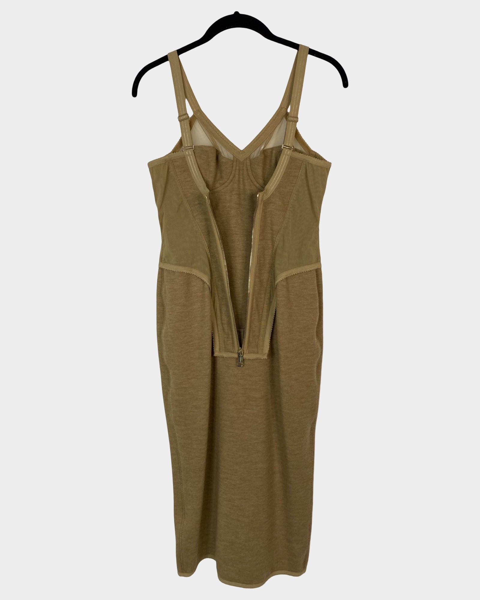 Elevate your wardrobe with this iconic Burberry midi dress, a masterpiece of refined elegance. Crafted from luxurious cashmere and polyamide, the corset-style silhouette features strategic stretch nylon panels that sculpt and flatter your figure beautifully. Sheer mesh inserts at the bust add an alluring sophistication, while the warm camel tone ensures versatile styling for any occasion. This investment piece embodies timeless luxury and impeccable craftsmanship.