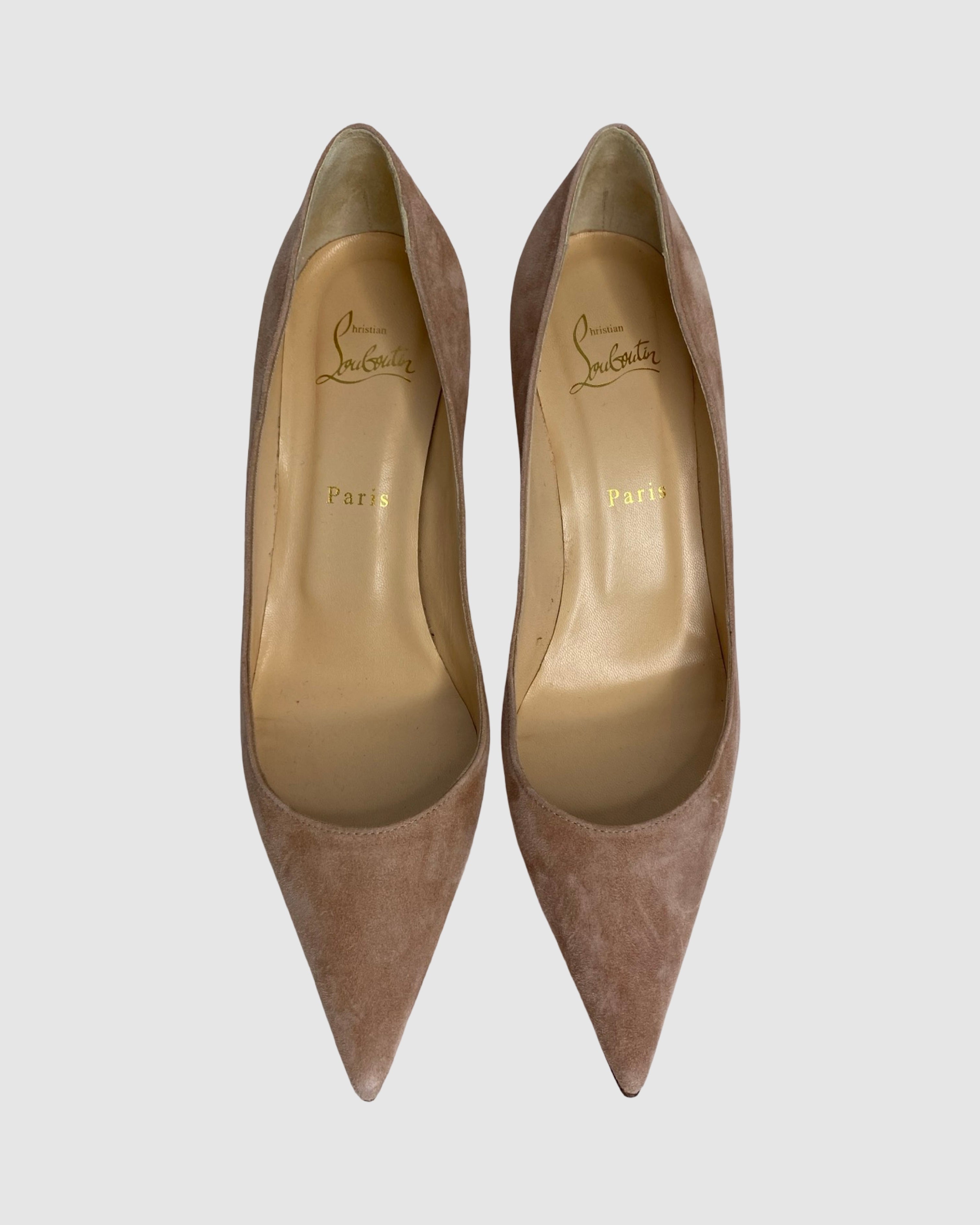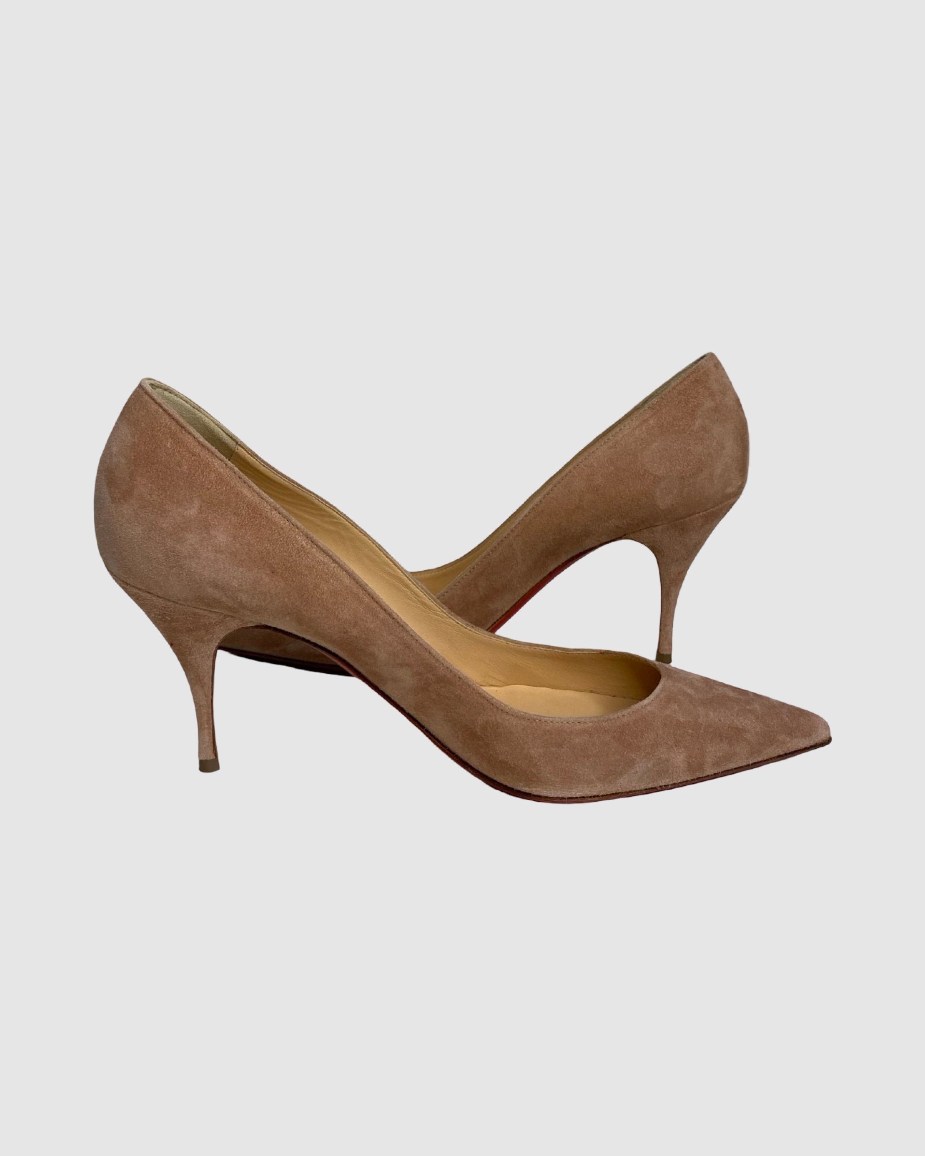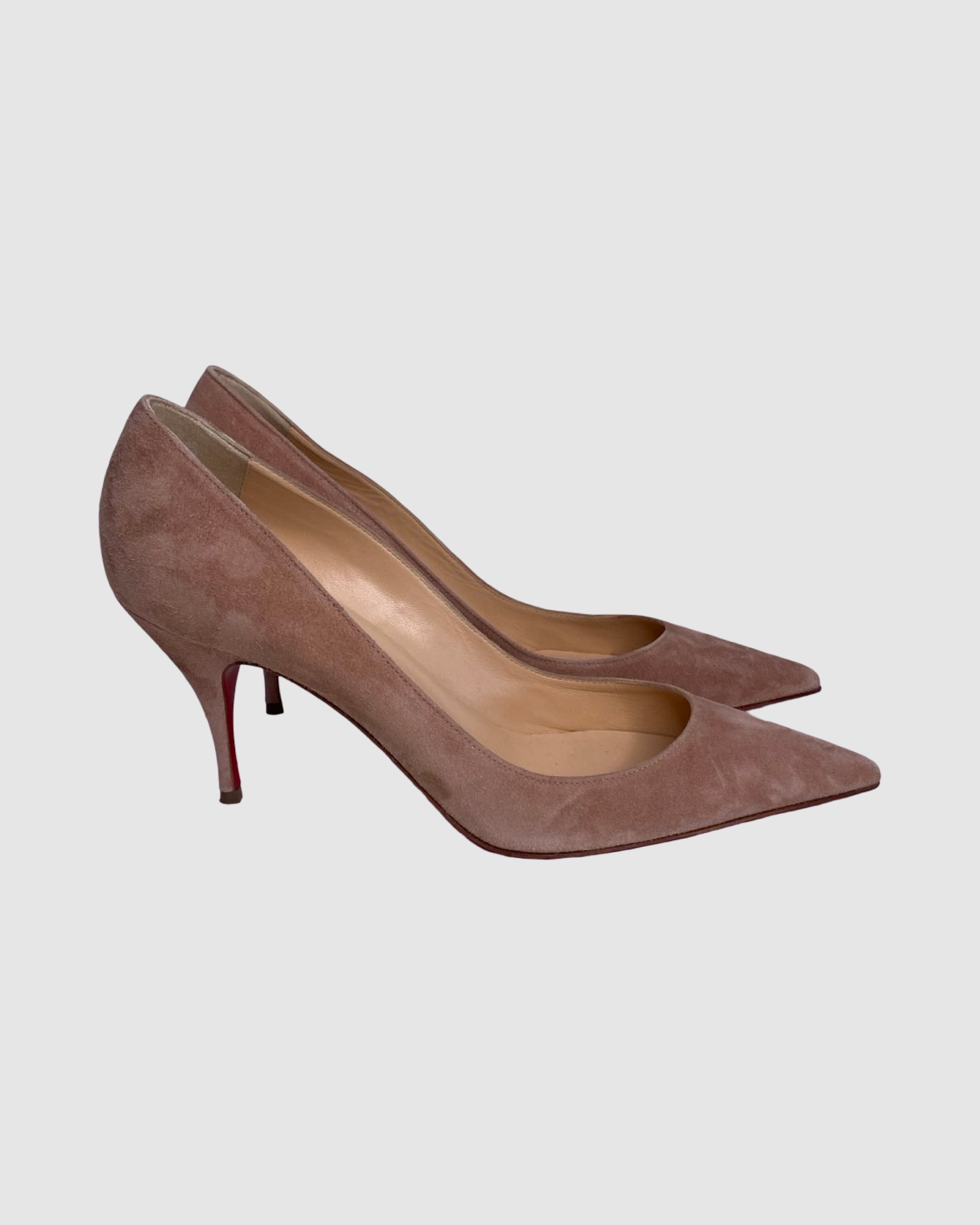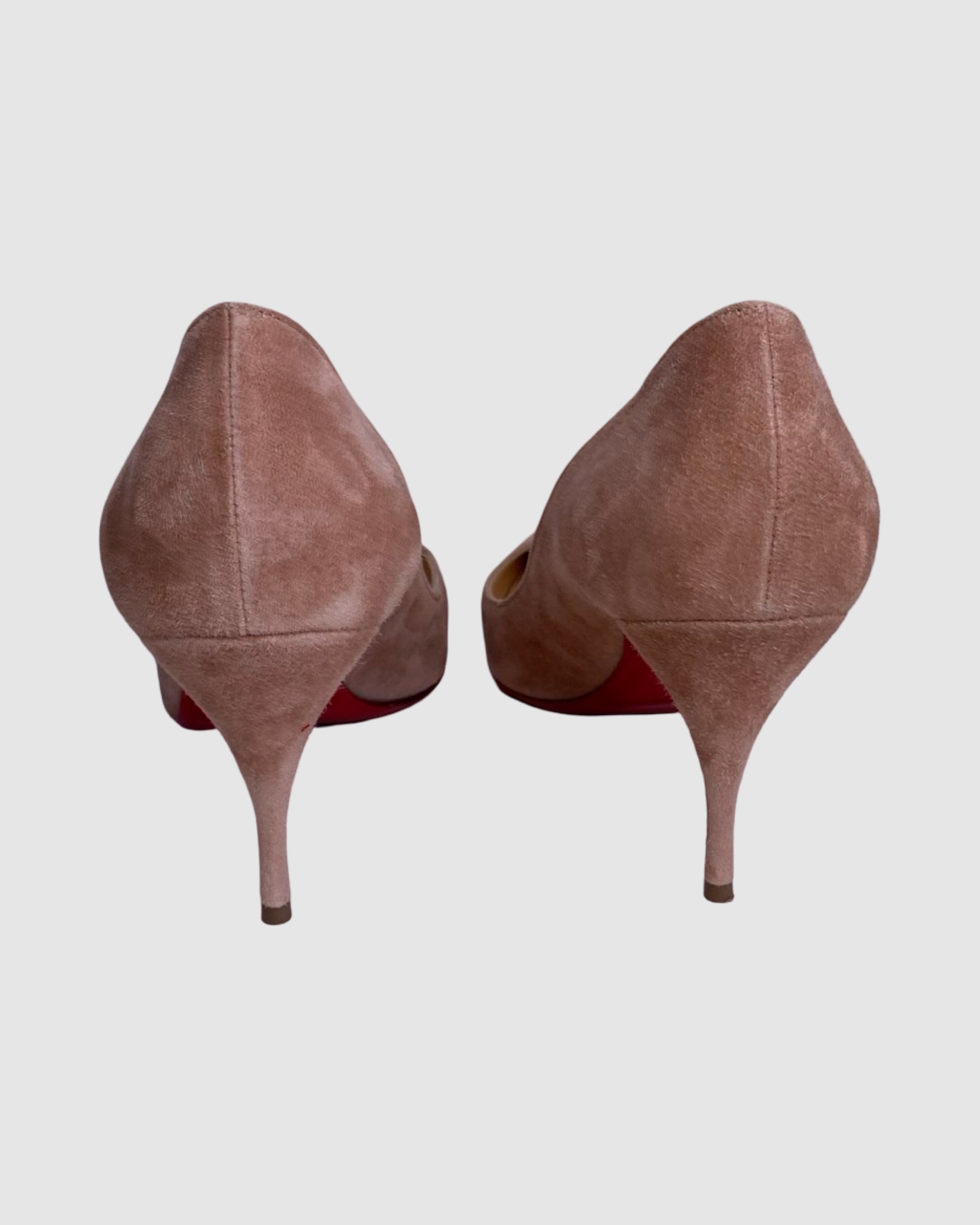 Delicate and feminine, these Christian Louboutin heels come in soft pink suede, adding an elegant touch to any look. With their refined silhouette and signature craftsmanship, they effortlessly elevate both formal and occasion wear—perfect for a timeless, sophisticated finish. Size: 38½.
