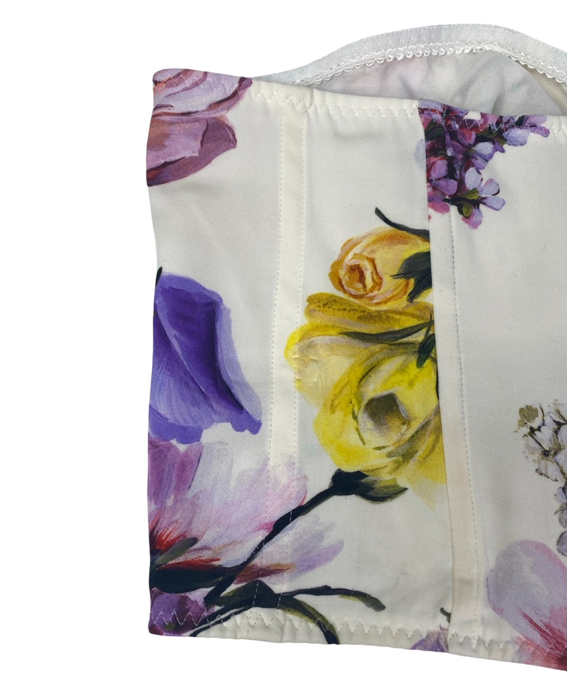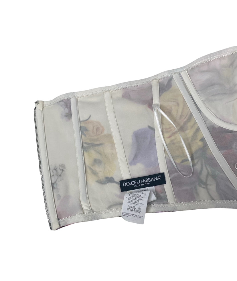 A striking blend of elegance and allure, this Dolce & Gabbana floral corset is crafted from a luxurious silk and elastane blend, offering both softness and stretch for a sculpted, feminine fit. Showcasing the house’s signature romantic florals in vibrant detail, it features structured boning to enhance the silhouette while the silk’s natural sheen adds a touch of opulence. Balancing refinement with sensuality, this size S corset is a timeless statement piece, perfect for both evening glamour and modern daytime chic. It measures 20 cm in full length and 38 cm armpit to armpit.