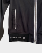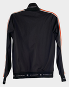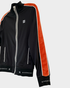 This Givenchy track jacket features the signature Givenchy logo on the chest and an elastic band with branding for a sleek, modern look. Its side pockets and vibrant orange stripe along the black and white sleeves combine practicality with eye-catching style. Crafted from a comfortable and durable blend of polyester, cotton, polyamide, and viscose, this jacket offers lasting wear with a soft feel. Available in size XS (FR 36), it is an ideal choice for those seeking a stylish, functional outerwear piece.
