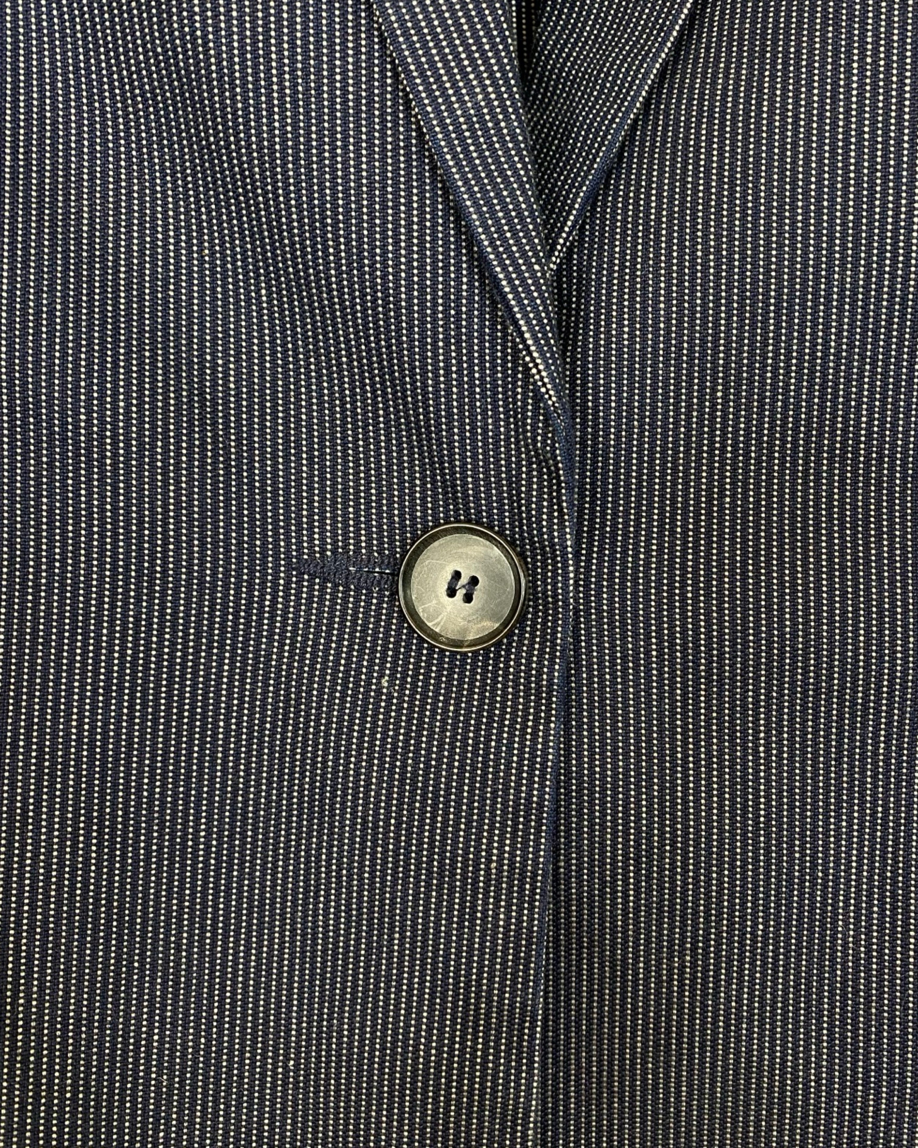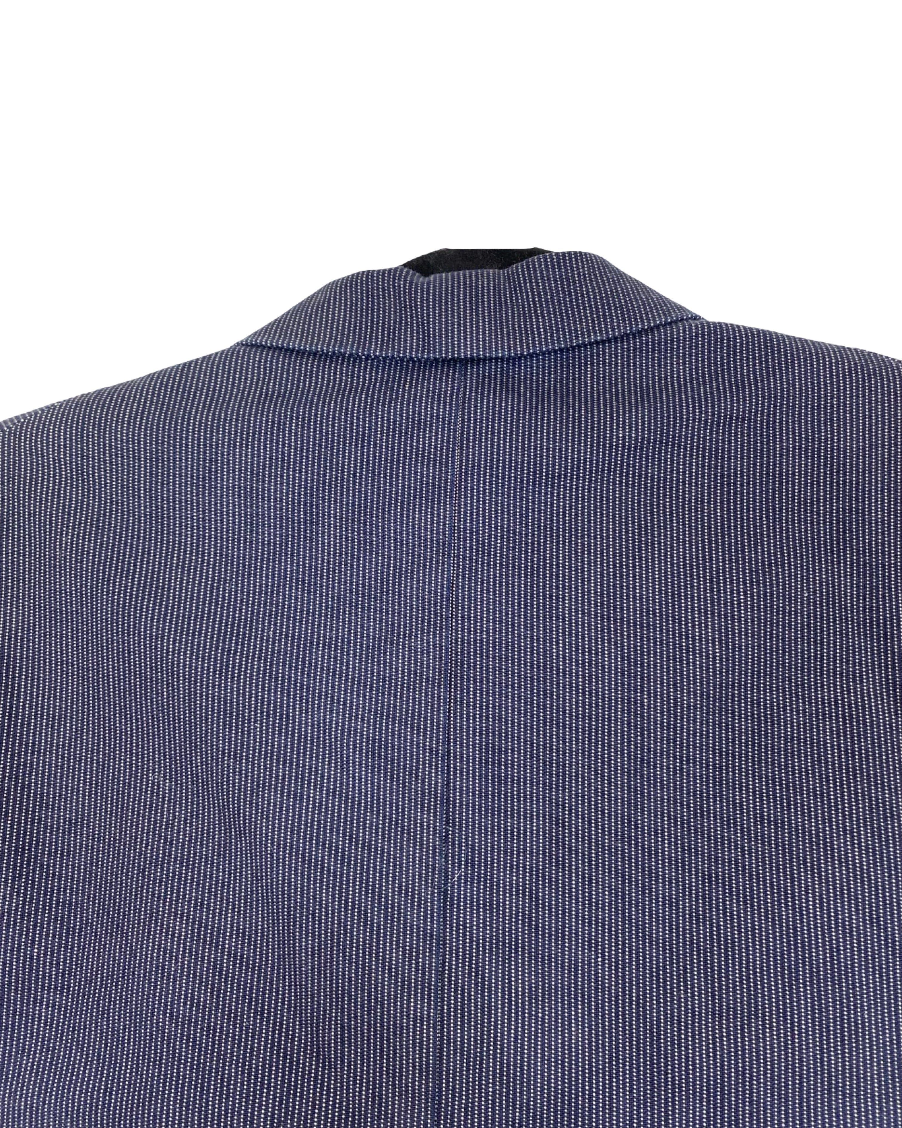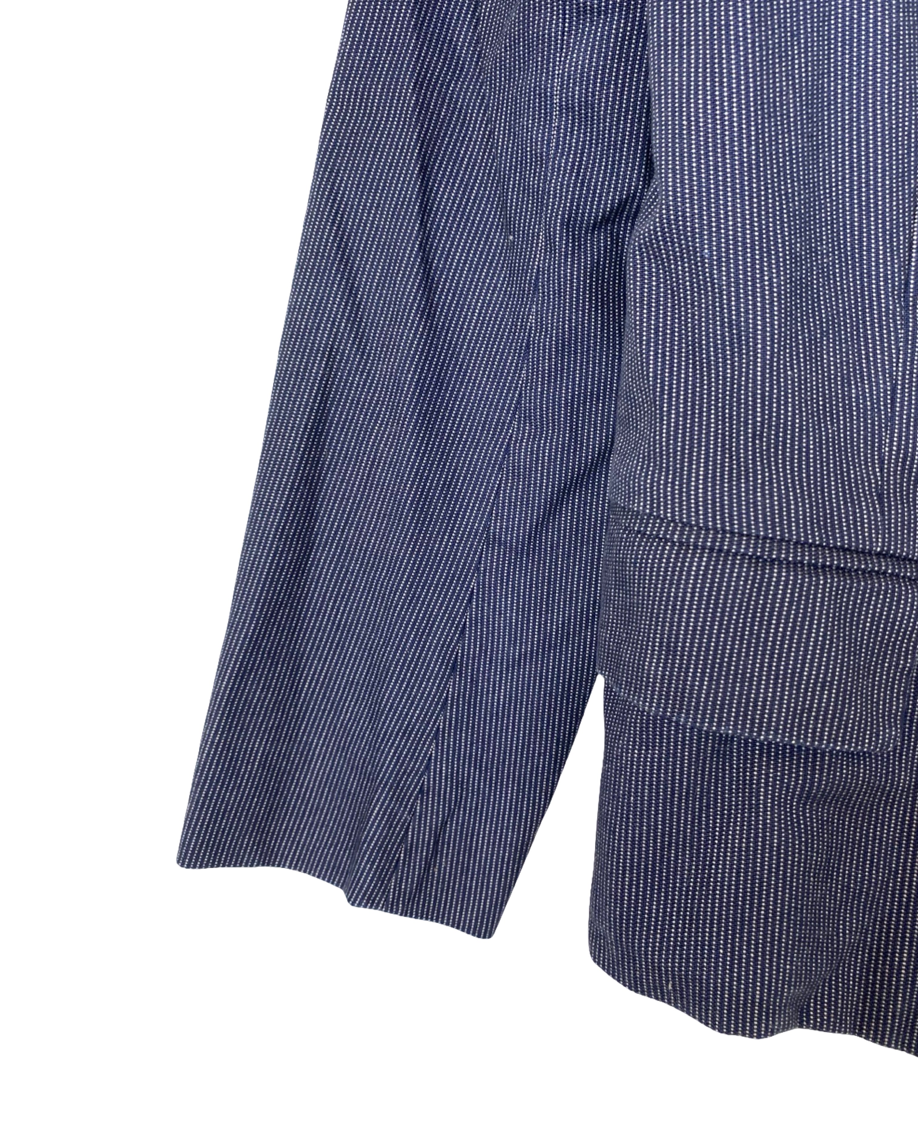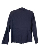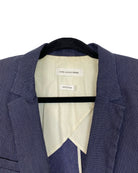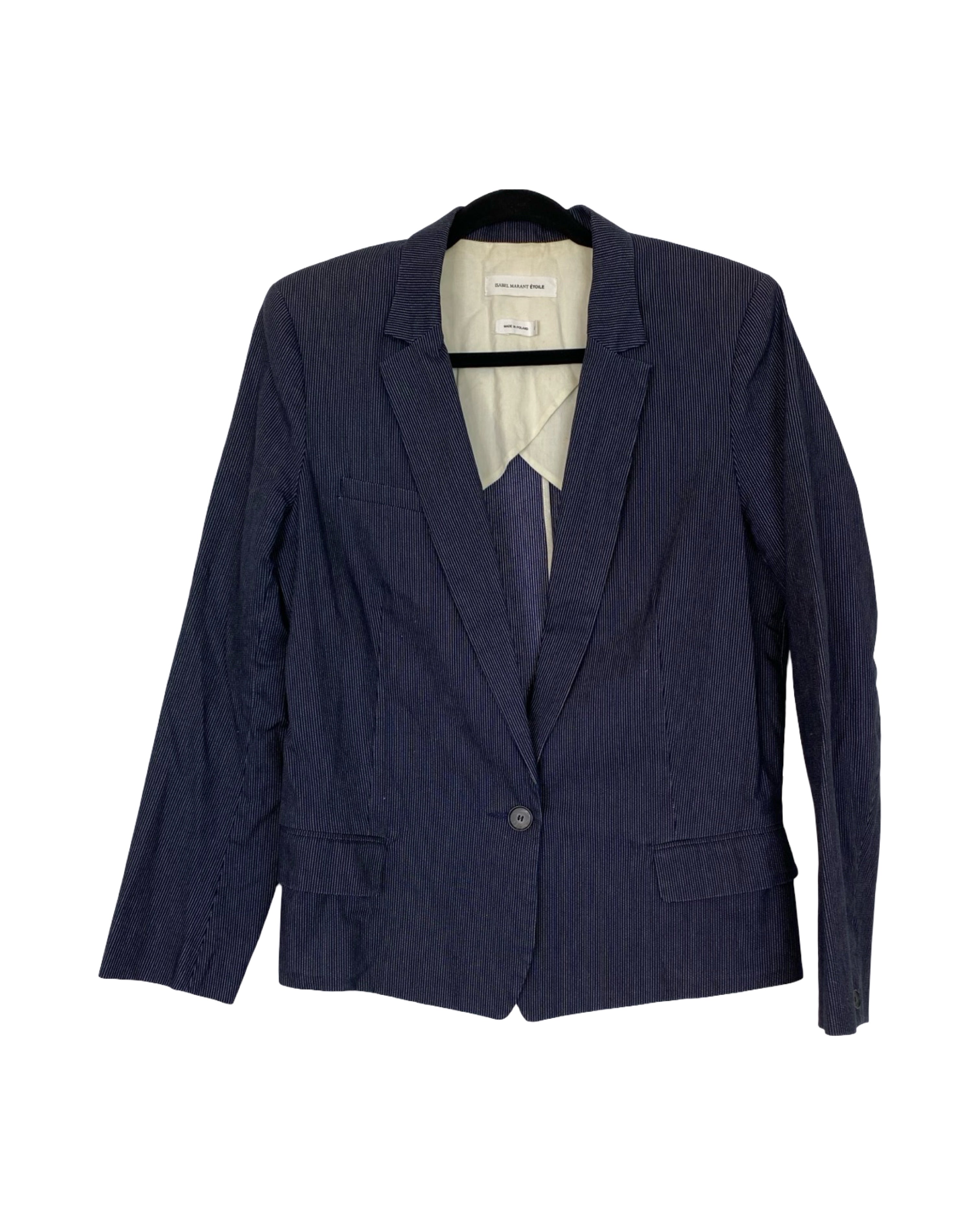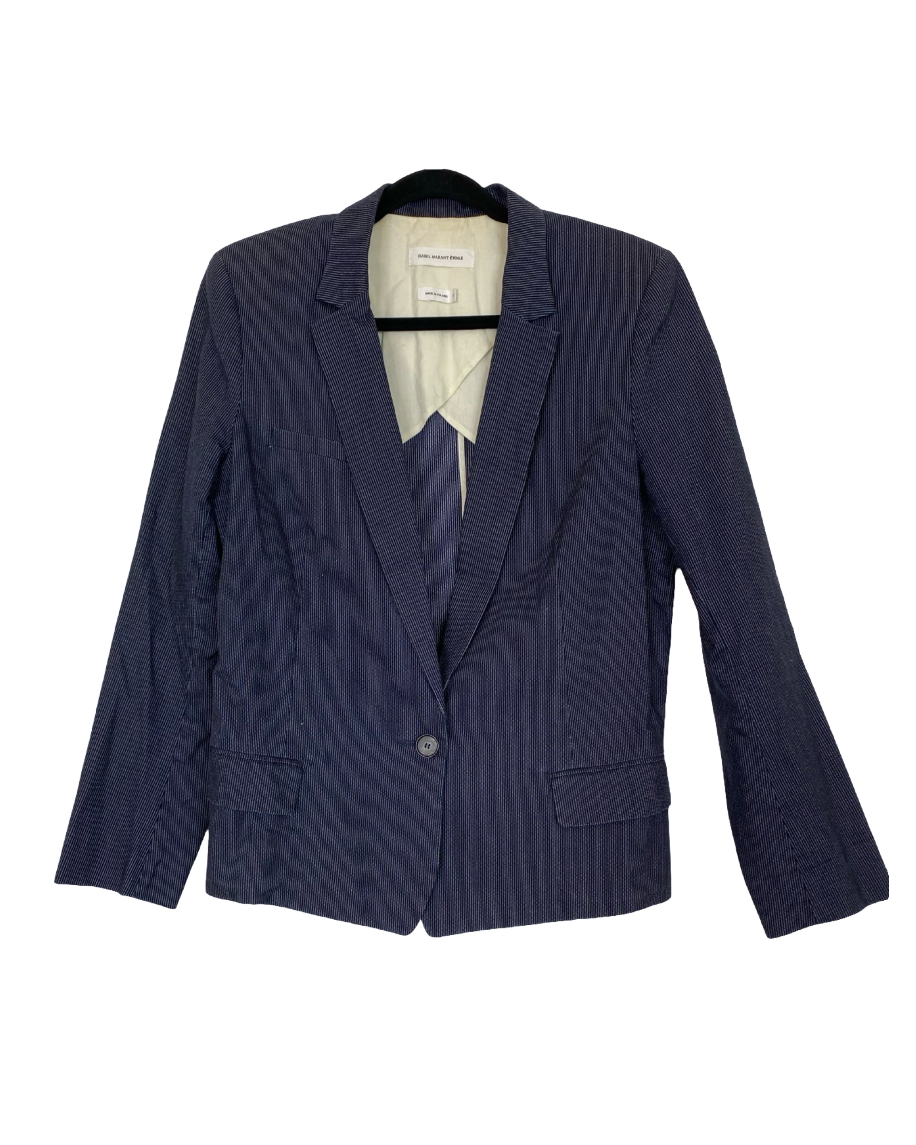 This Isabel Marant blazer is crafted from soft cotton in classic navy blue, subtly detailed with delicate white stripes for a refined, textured finish. Tailored for a flattering fit, it blends effortless sophistication with contemporary style, making it ideal for both professional settings and elevated casual wear. In size M/L, it measures 70 cm in full length, 50 cm armpit to armpit, and 62 cm in sleeve length.