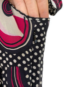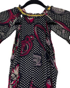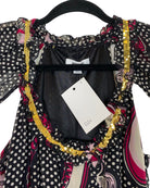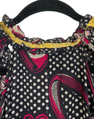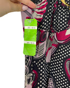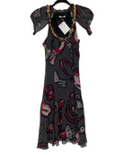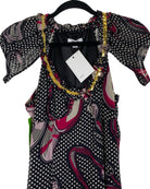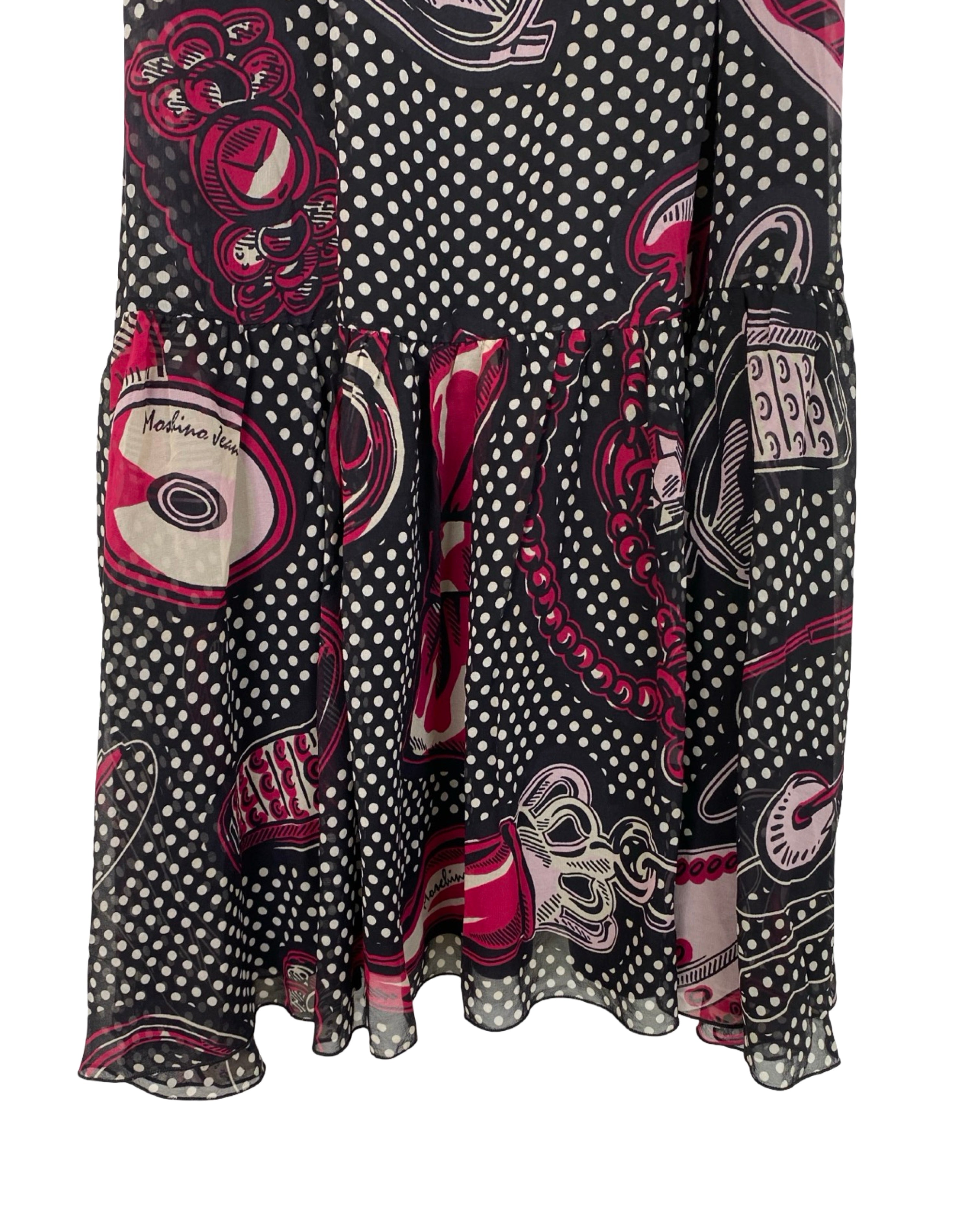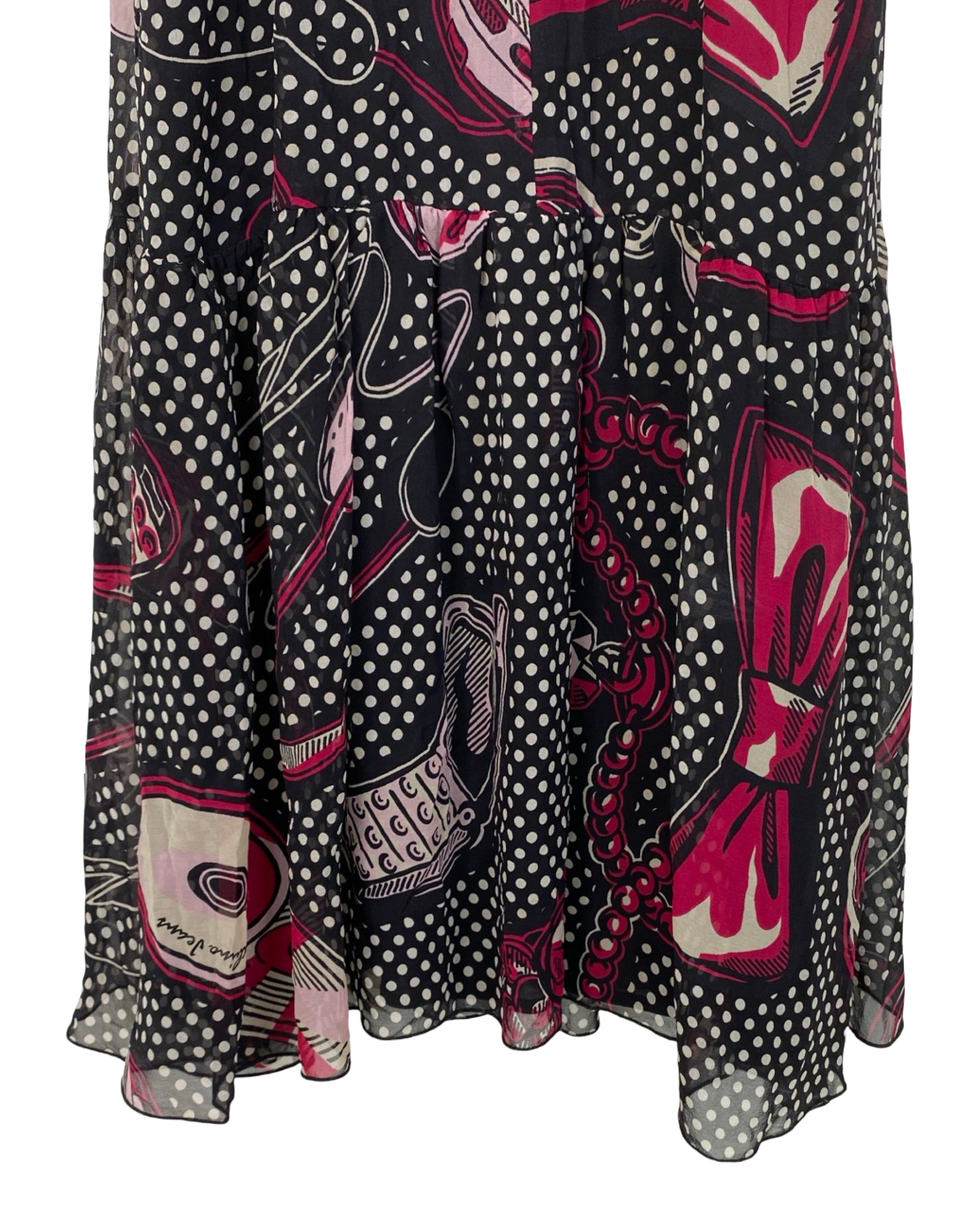 This Moschino midi dress is a striking statement piece, featuring a bold black base accented with intricate gold and pink detailing. Crafted from silk, the tailored silhouette and midi length create a sophisticated, elegant shape, while the vibrant accents add a touch of playful luxury. Perfect for special occasions, this size M/L dress measures 101 cm in full length, 43 cm armpit to armpit, and 15 cm in sleeve length, combining contemporary design with a dramatic, eye-catching aesthetic.