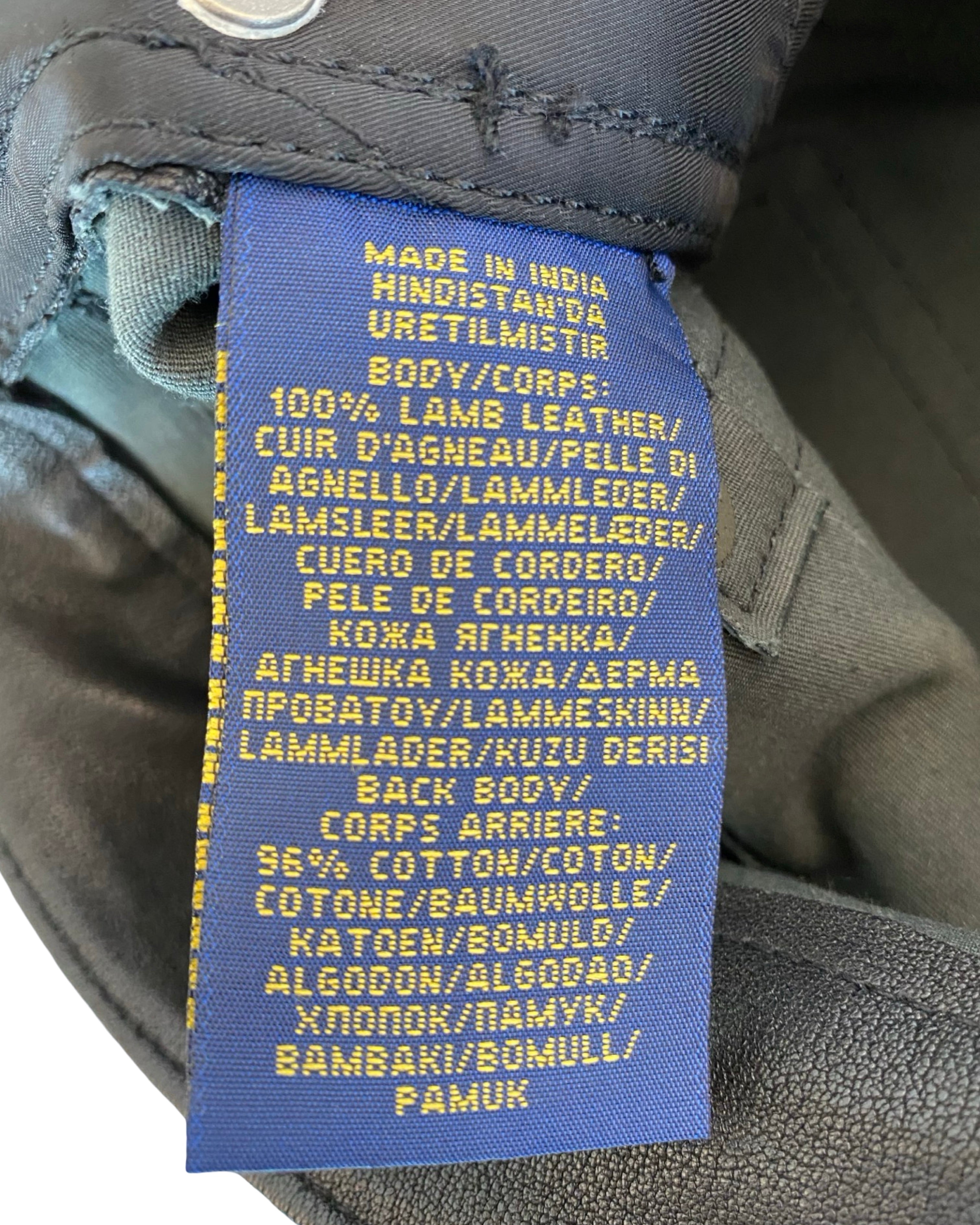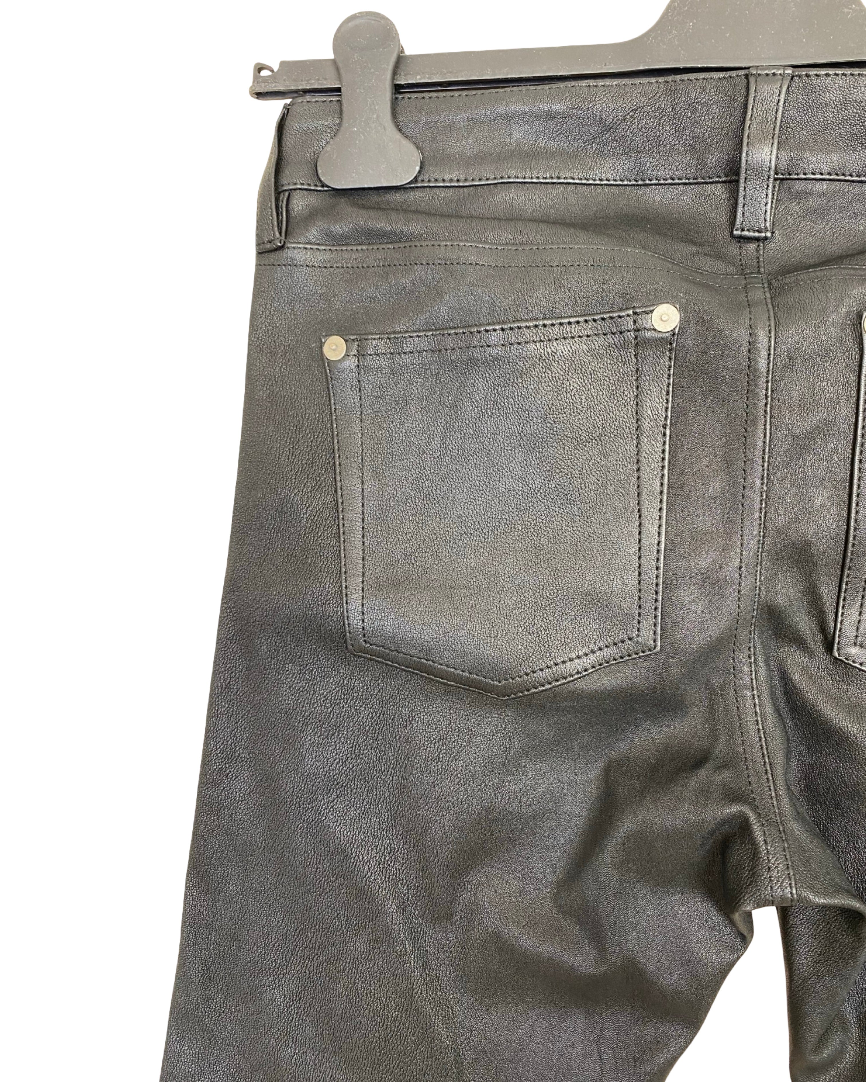 The Polo Ralph Lauren Black Leather Jeans are sleek, high-quality lamb leather jeans that combine contemporary edge with classic tailoring. They offer a structured yet comfortable fit, making them versatile for both casual and elevated looks, and perfect for adding a bold, stylish statement to any outfit. These jeans come in size S and measure 102 cm in full length, 76 cm in crotch length, 38 cm at the waist, and 14 cm in leg width.