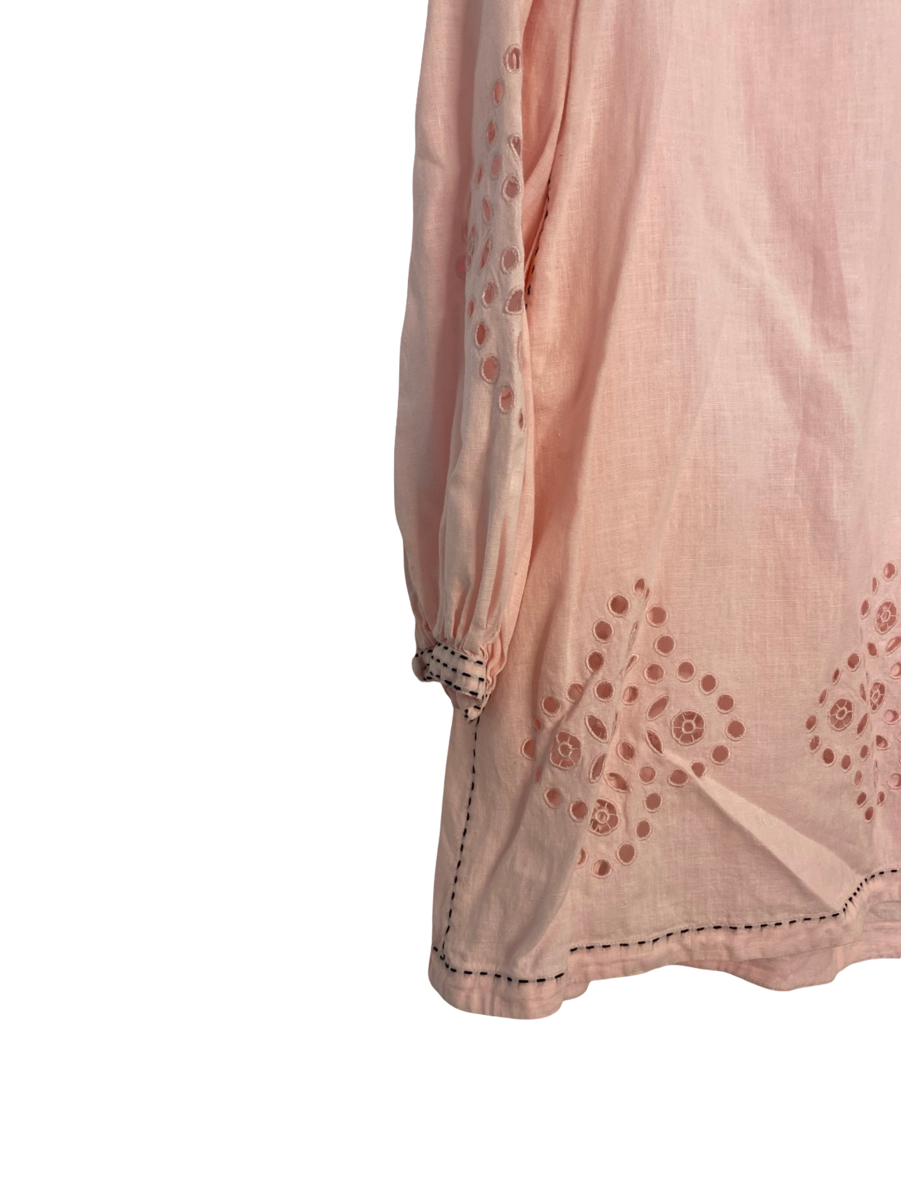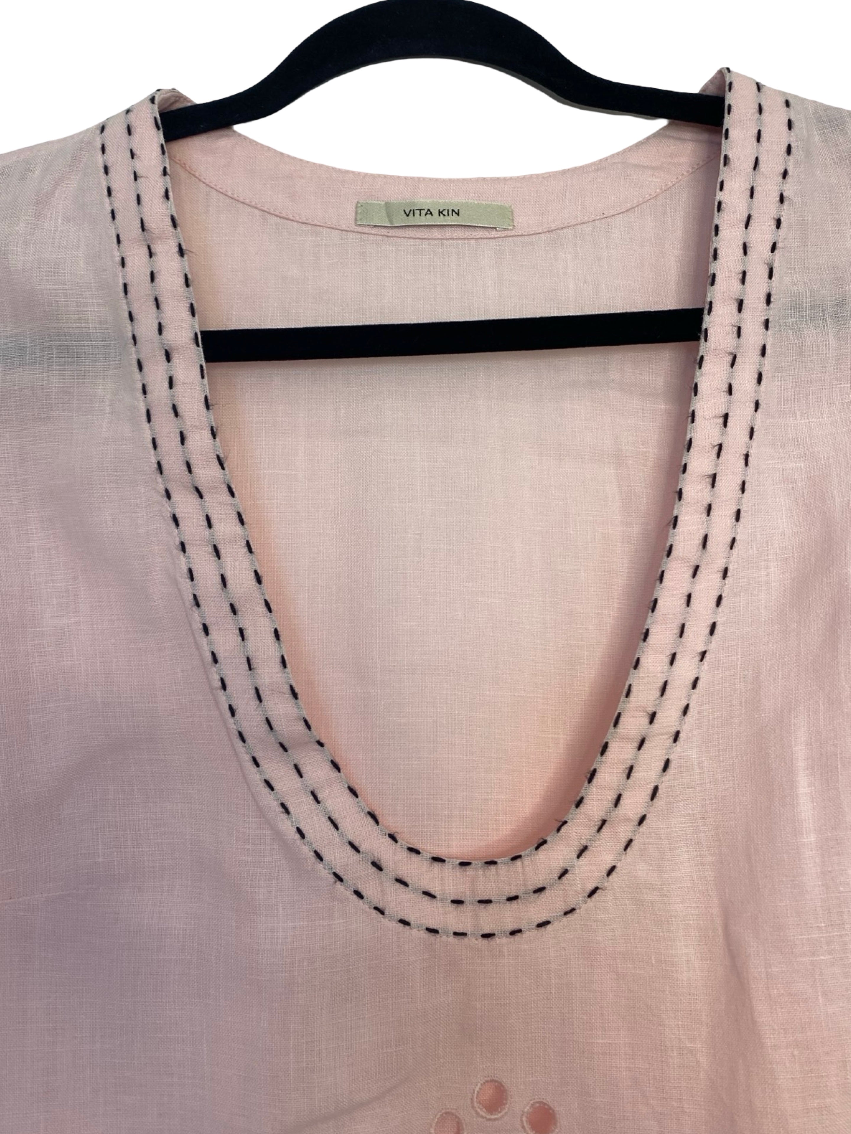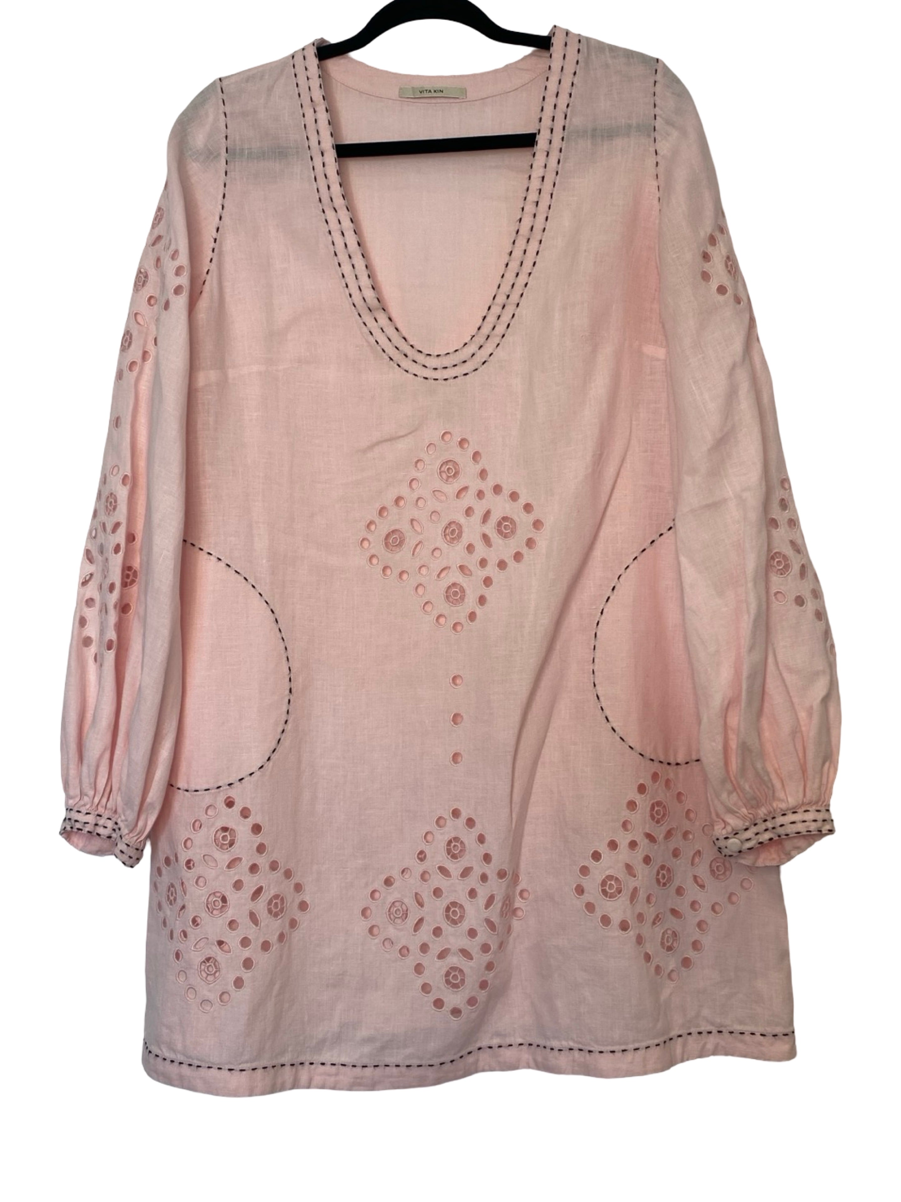 Effortlessly elegant and artisanal, this Vita Kin dress comes in a beautiful pink shade, showcasing the brand’s signature style. Designed with a relaxed, flowing silhouette, it offers both comfort and a feminine feel—perfect for warm days or statement styling. Size: L.