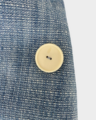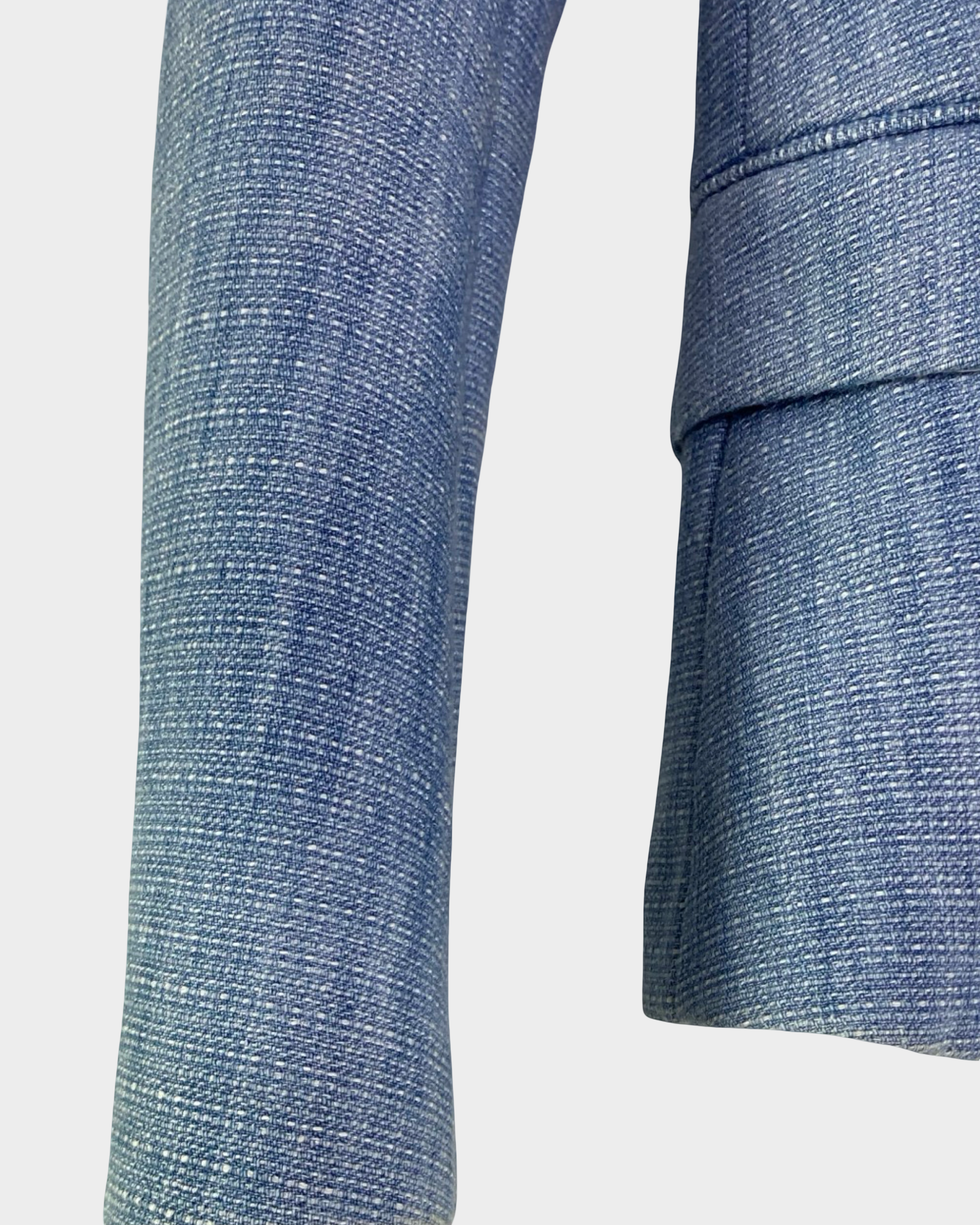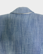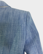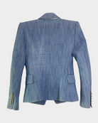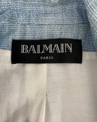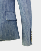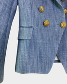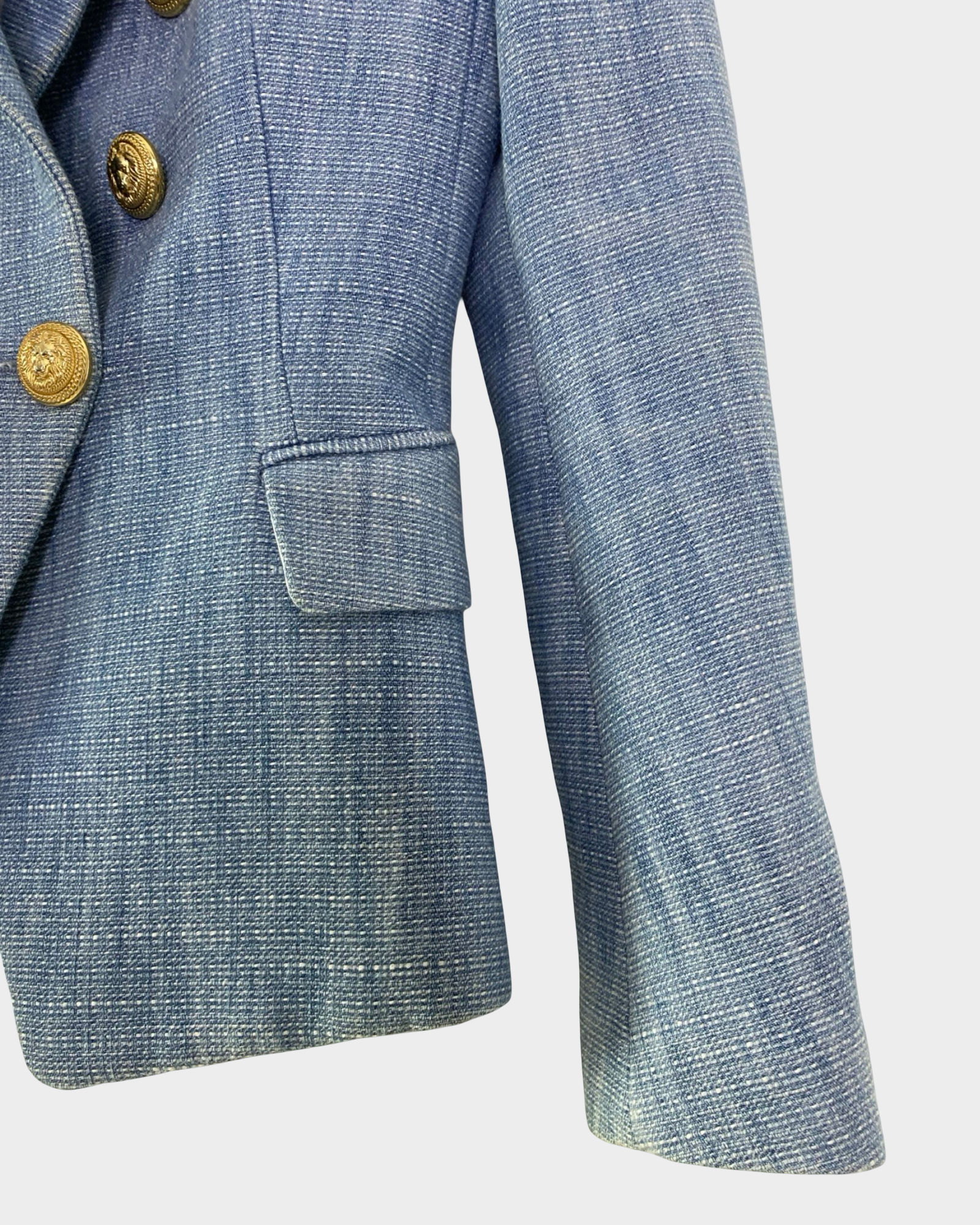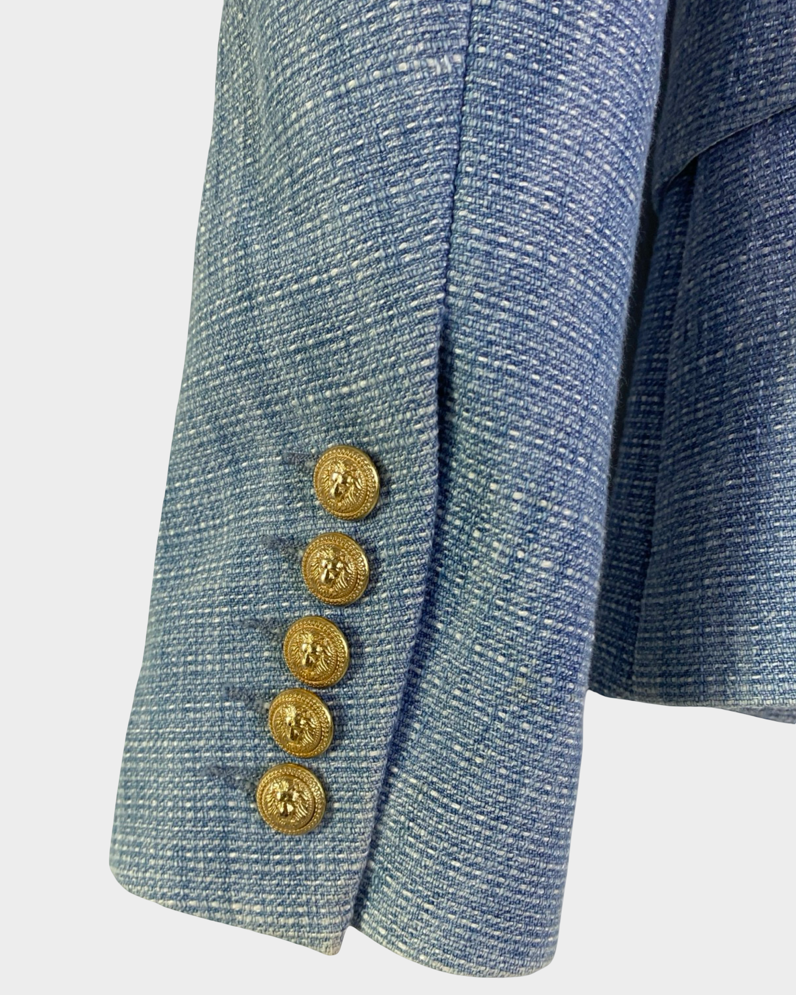 Balmain blazer in light blue, expertly tailored from a refined cotton, viscose, and linen blend. This double-breasted design features a timeless lapel collar and distinctive gold-embossed buttons that capture the brand's signature aesthetic. Perfect for elevating everyday styling with understated luxury and polished sophistication.