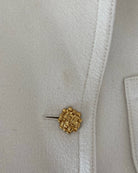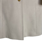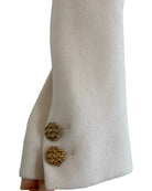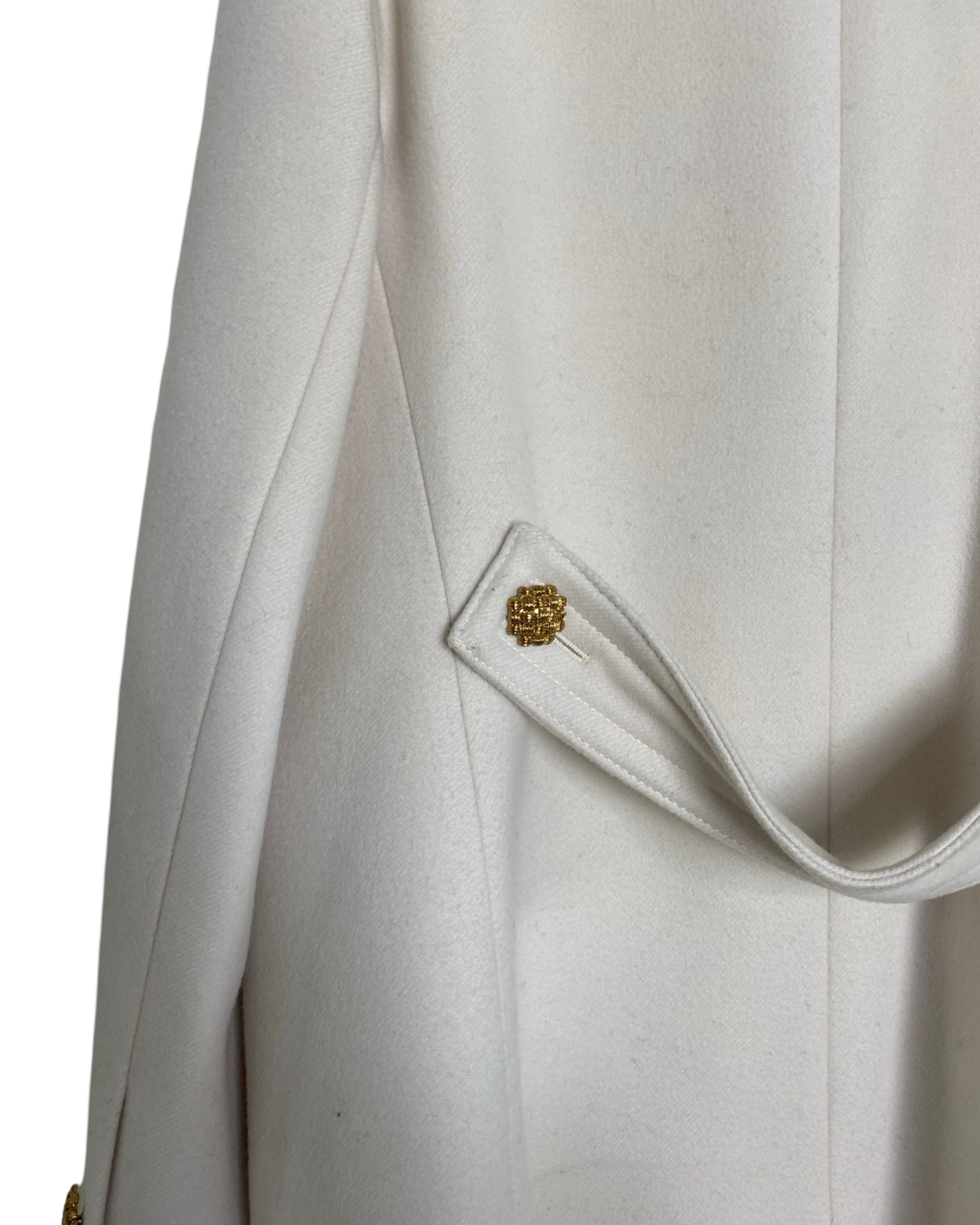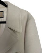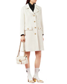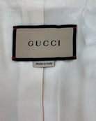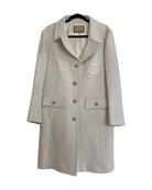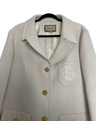 Experience the timeless elegance of Gucci with this off-white wool coat. Enriched by tonal Double G embroidery and gold-toned buttons, it features a single-breasted design with wide lapels and multiple pockets for a retro yet modern look. Perfect for cooler days, this coat combines luxury and functionality. Coat still available in the stores!