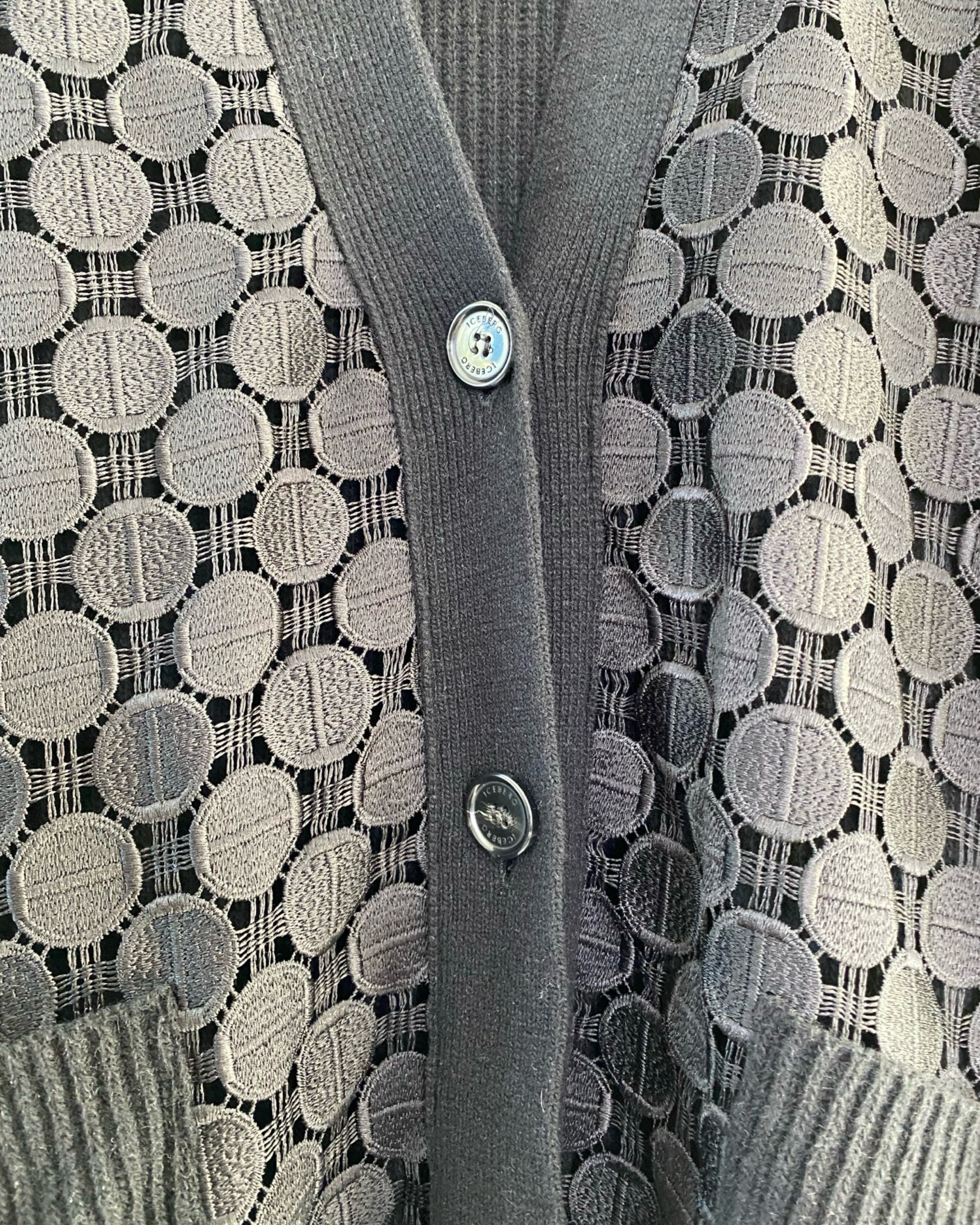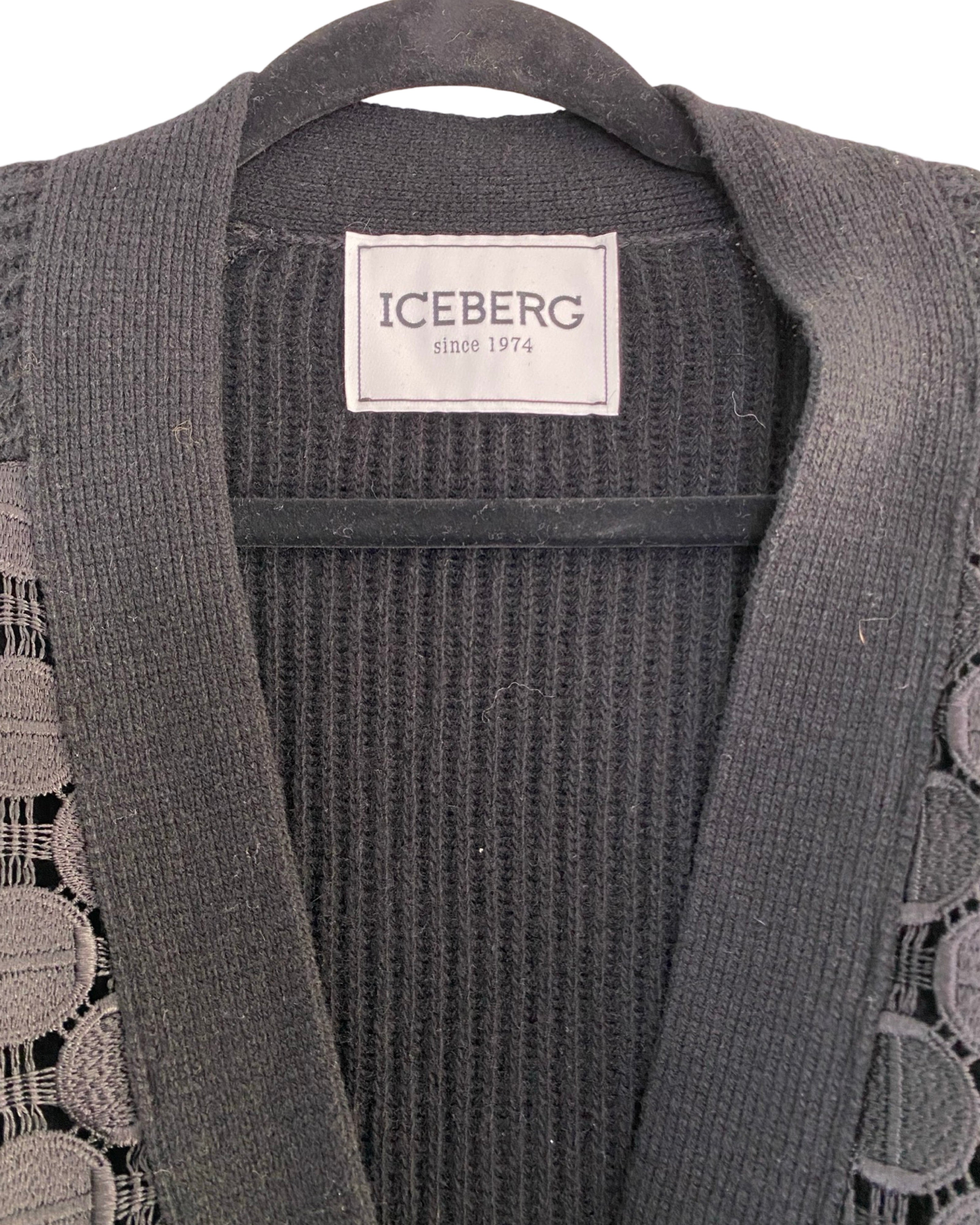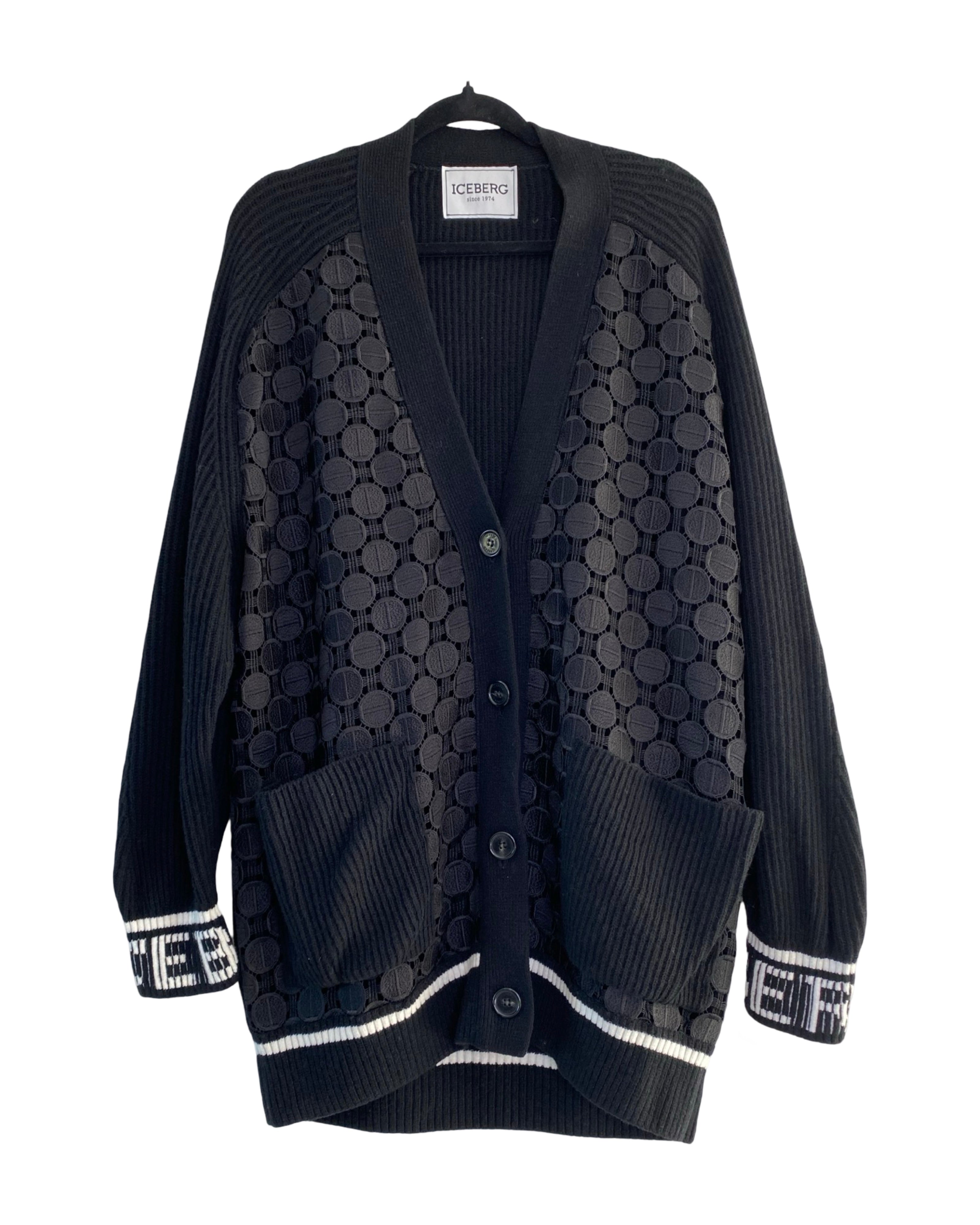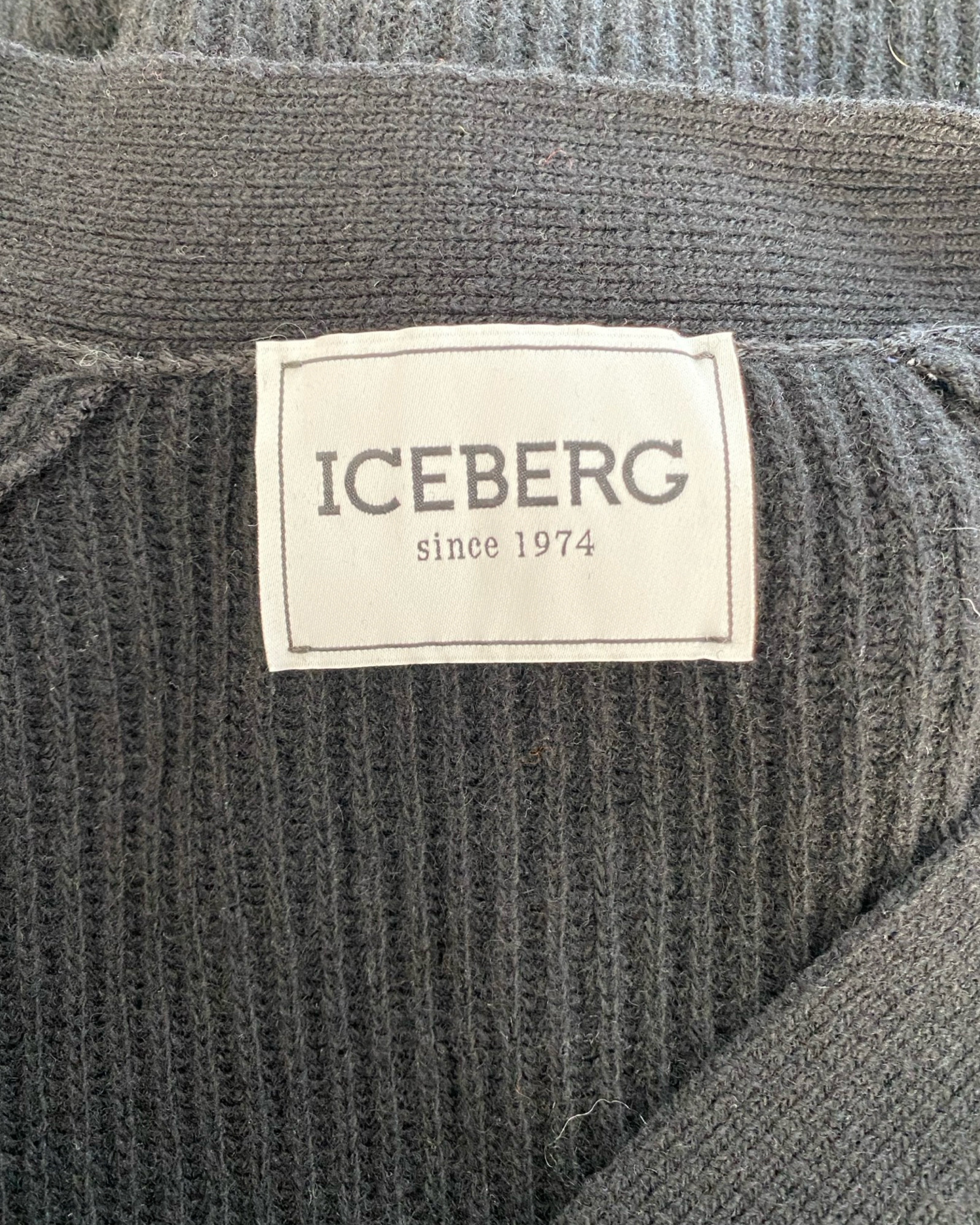 Dropped cardigan in mouliné wool, a distinctive and refined garment. The cob stitch ribbing, alternating with open embroidery pattern, creates a unique and sophisticated texture, adding depth and visual interest to the design. This cardigan is personalized with an embroidered Iceberg logo patch in tone colour, which offers a touch of discreet and distinctive elegance. Ideal for those seeking comfort and style, this garment is perfect for any occasion, from casual to formal. Available in size S.