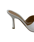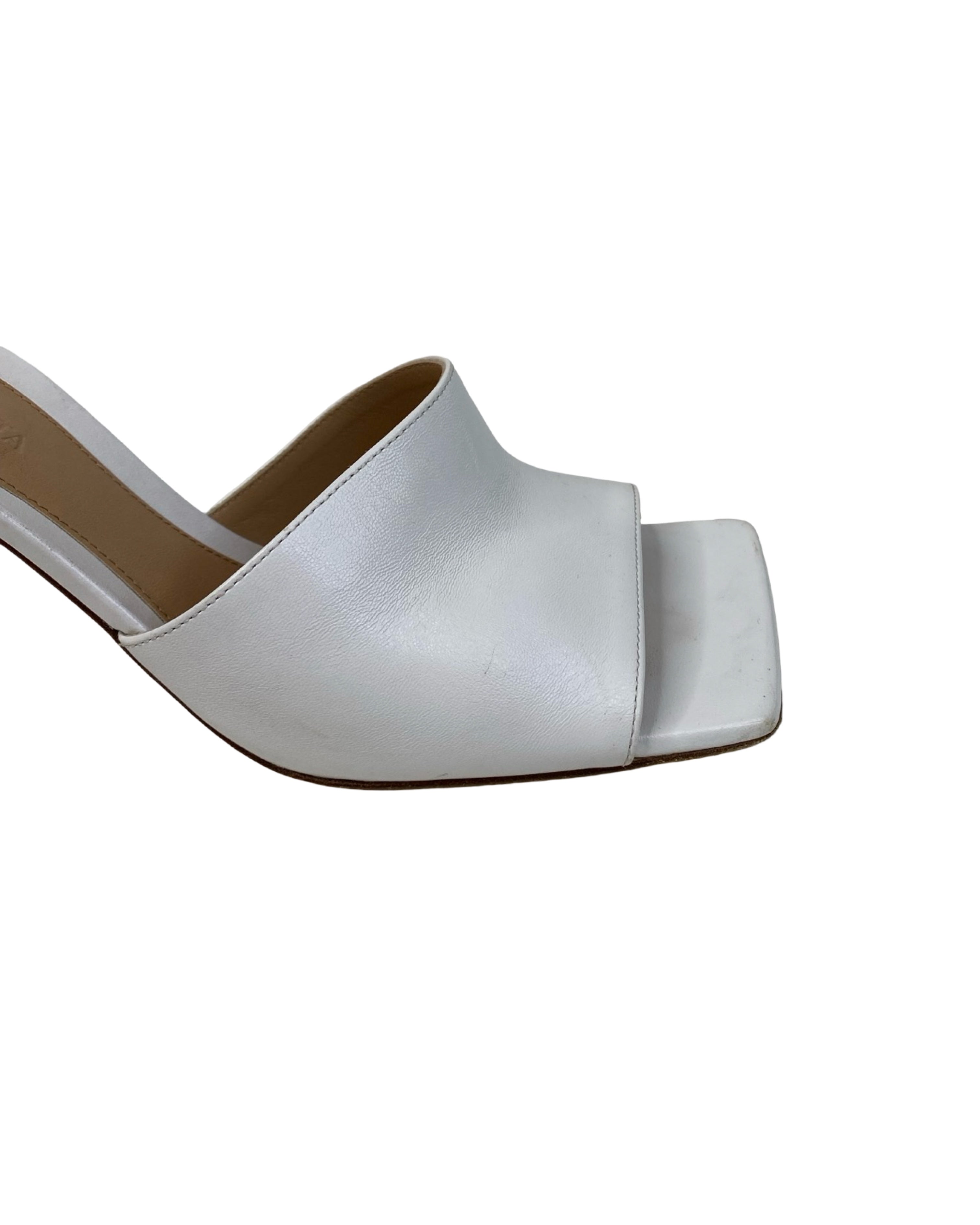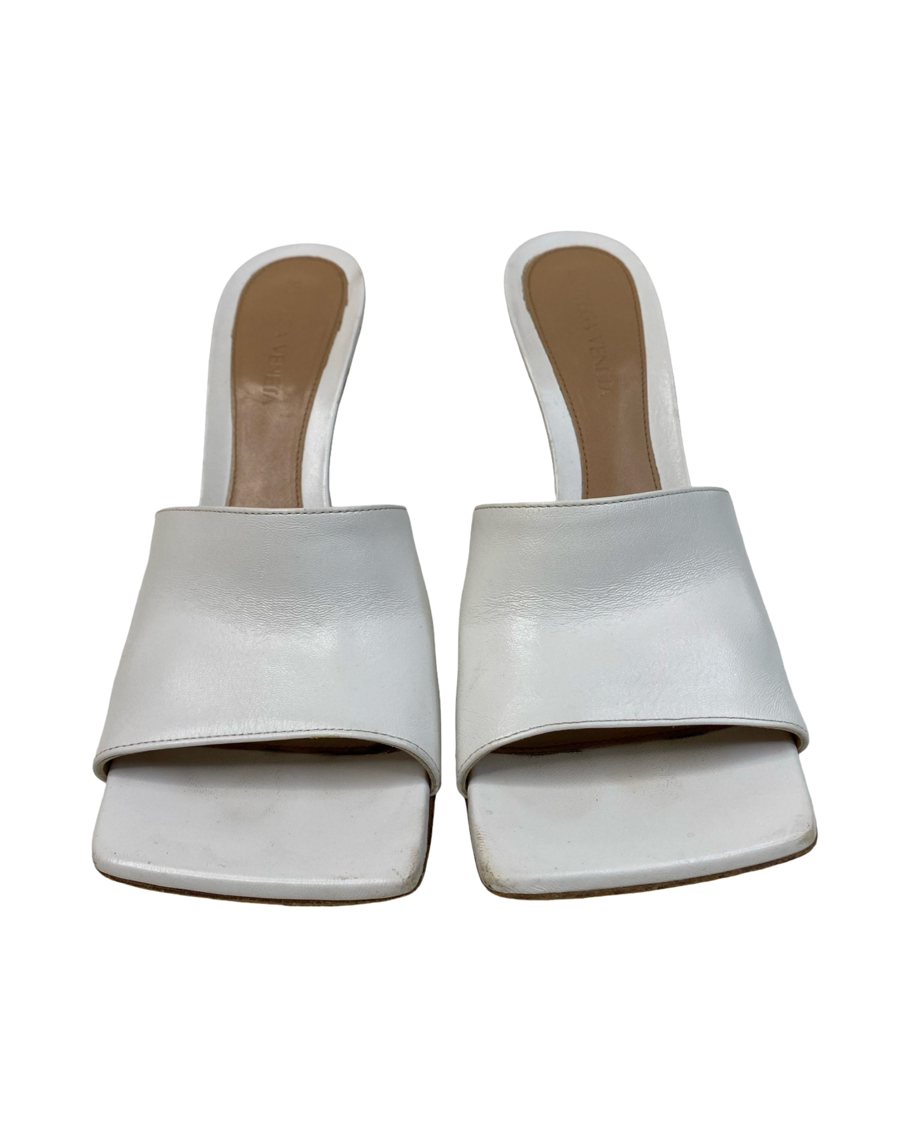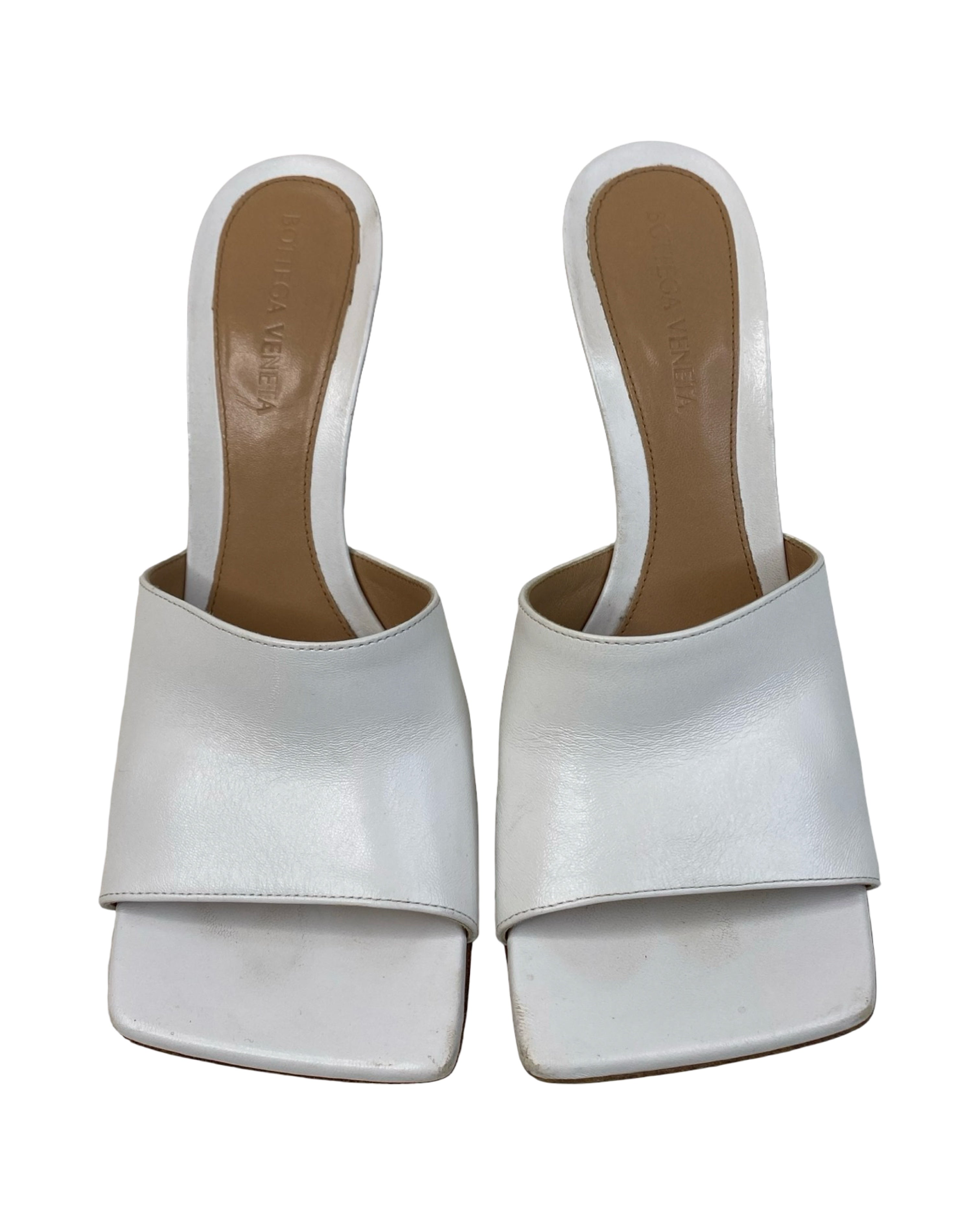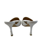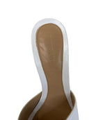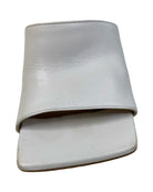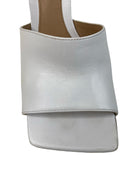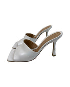 These Bottega Veneta heels feature a sleek square-toe design crafted from soft optic white lambskin leather. Made in Italy, they stand on a 90mm stiletto heel and have a gripped rubber sole for added traction. Their minimalist style pairs effortlessly with tailored outfits or casual denim, making them a versatile addition to your wardrobe. Available in size 37, these mules combine elegance with comfort for everyday wear. Will be sold with original box.