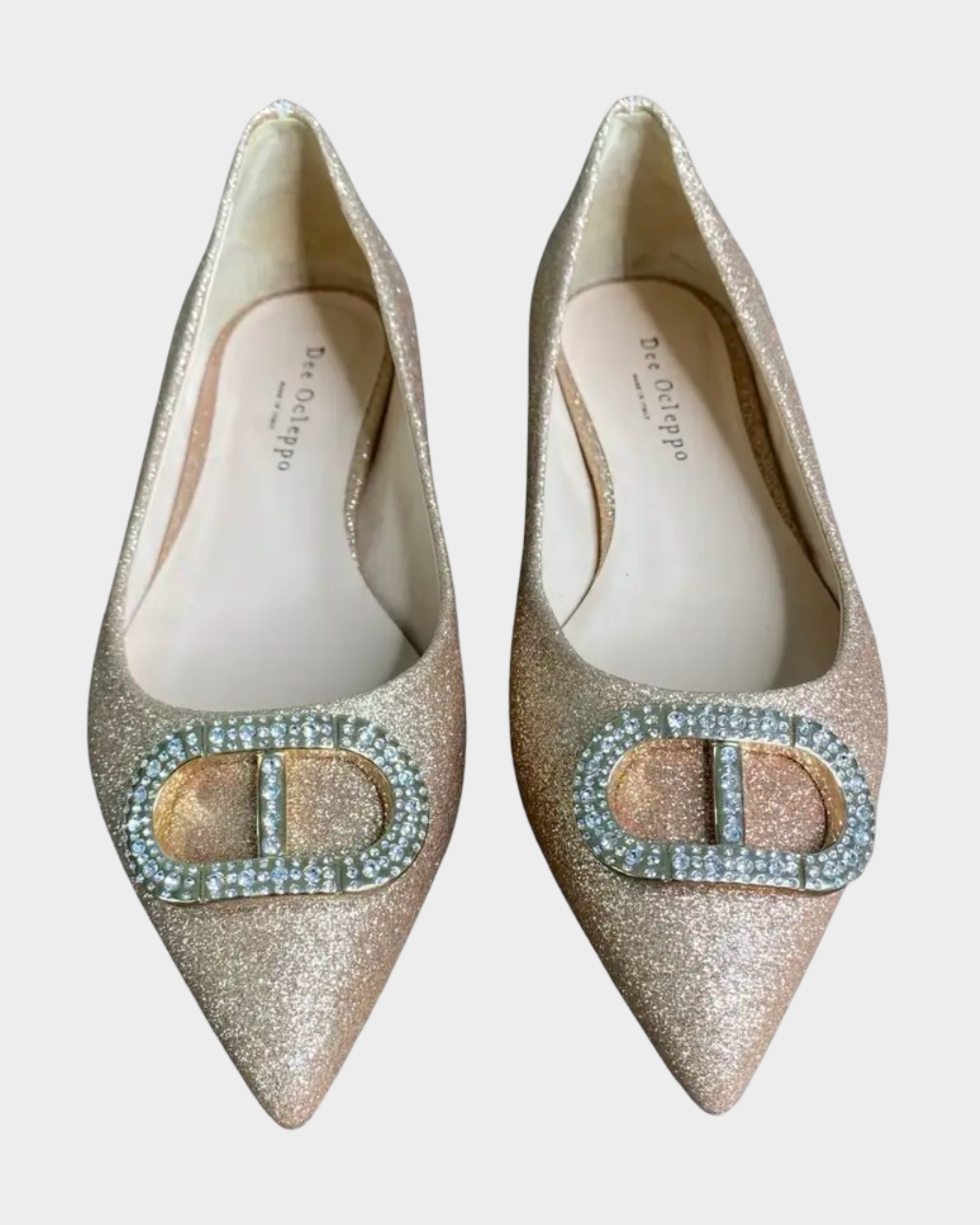 Dee Ocleppo ballet flats in glitter leather offer understated glamour with everyday wearability. The rounded toe and refined silhouette deliver classic sophistication, while subtle sparkle adds personality to any ensemble. Crafted from quality leather in size 39, these lightweight flats transition seamlessly from day to evening, whether paired with jeans or dresses. A versatile investment piece that brings effortless elegance to your wardrobe.