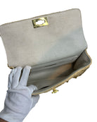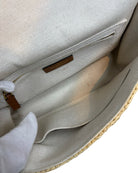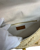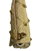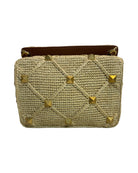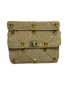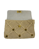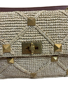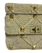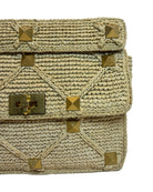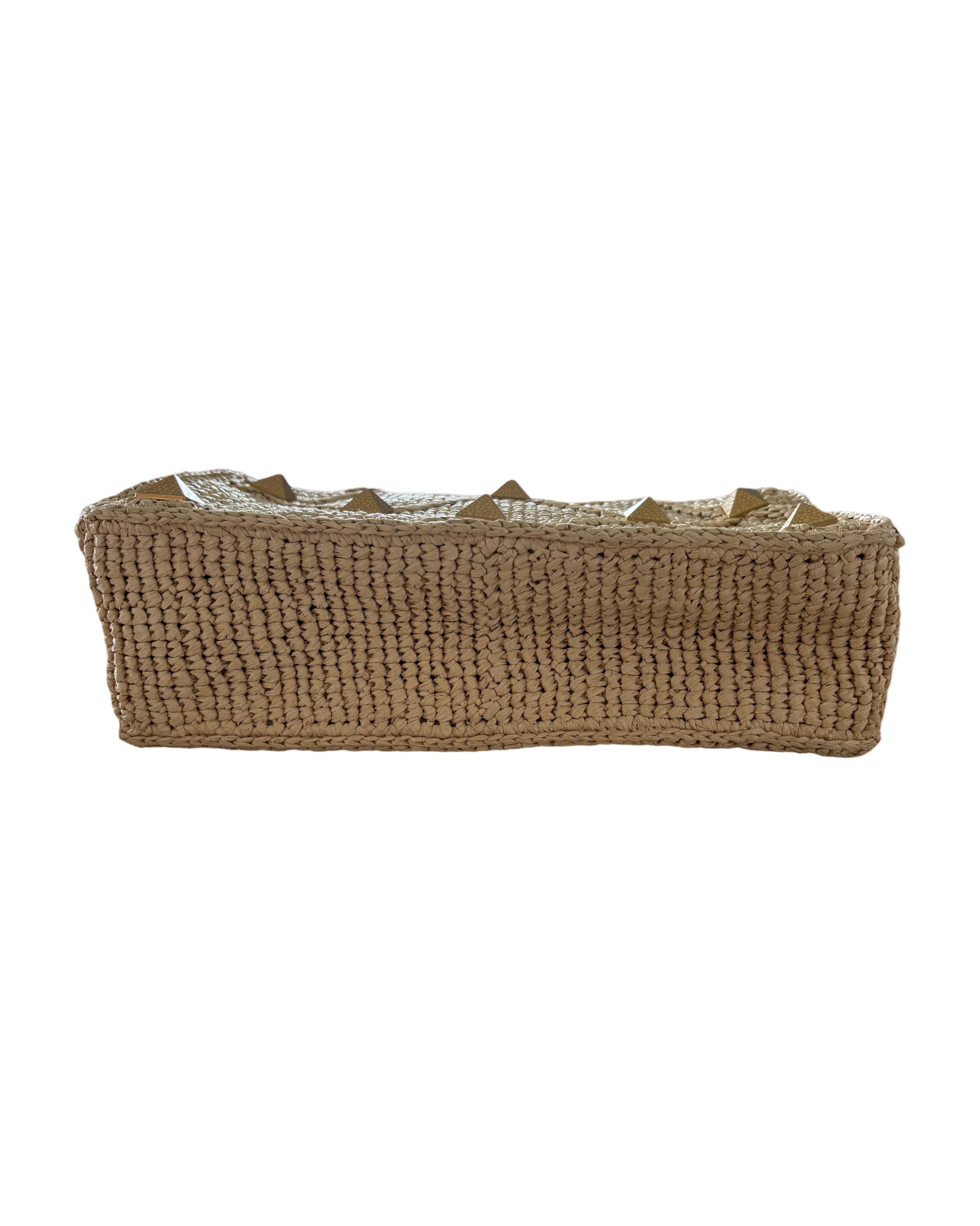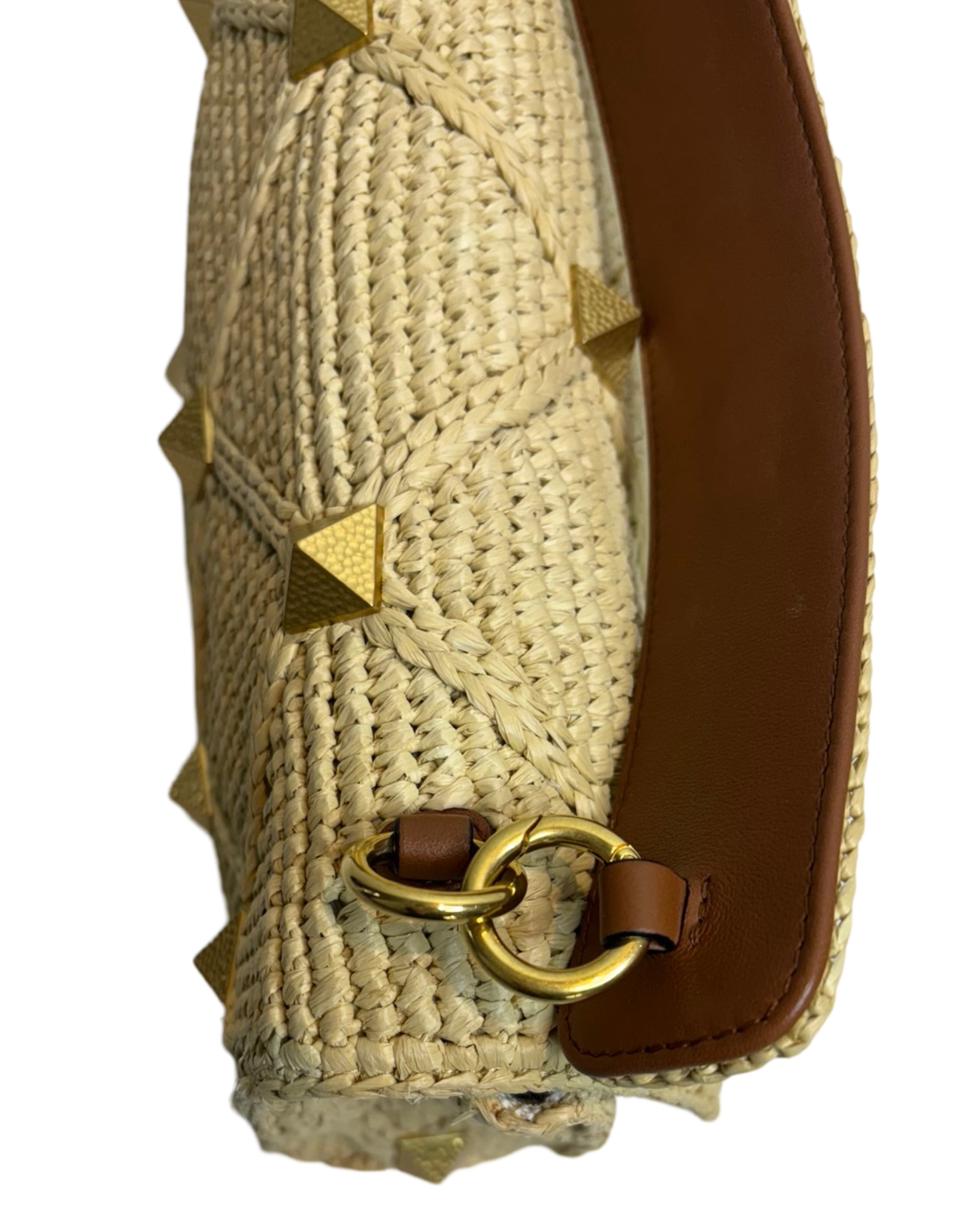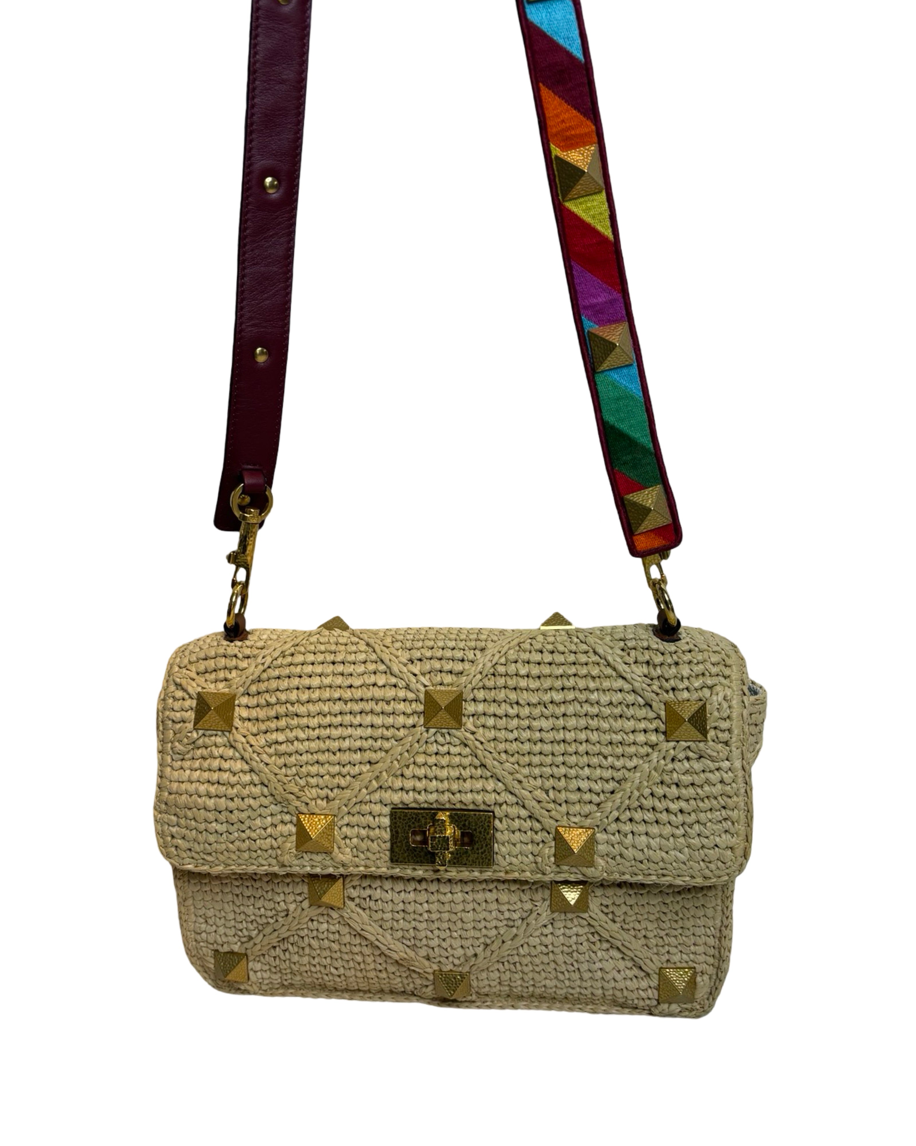 Add a touch of luxury to your ensemble with this Valentino Garavani handbag. The beautiful raffia material and vibrant colors make it a statement piece, while the maxi studs and gold-tone hardware add a touch of elegance. With multiple straps for versatile wear, this Italian-made bag will elevate your look. Will be sold with original dustbag.
