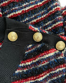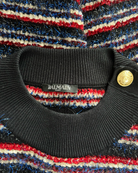 The Balmain Metallic Fiber Jumper is a perfect blend of elegance and artistry, showcasing a striking mix of red, blue, black, and white tones. Crafted from a luxurious combination of viscose, polyamide, polyester, and acetate, this size S (FR 38) piece offers warmth and style, making it ideal for the winter season and holiday occasions. Its metallic fibers add subtle shine, creating a sophisticated statement. Complete your look with the matching skirt for effortless, chic coordination.