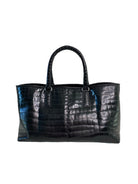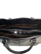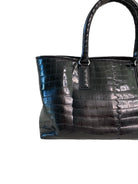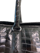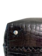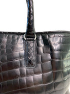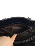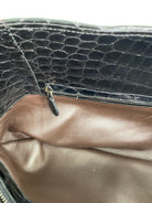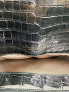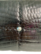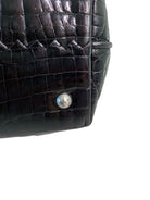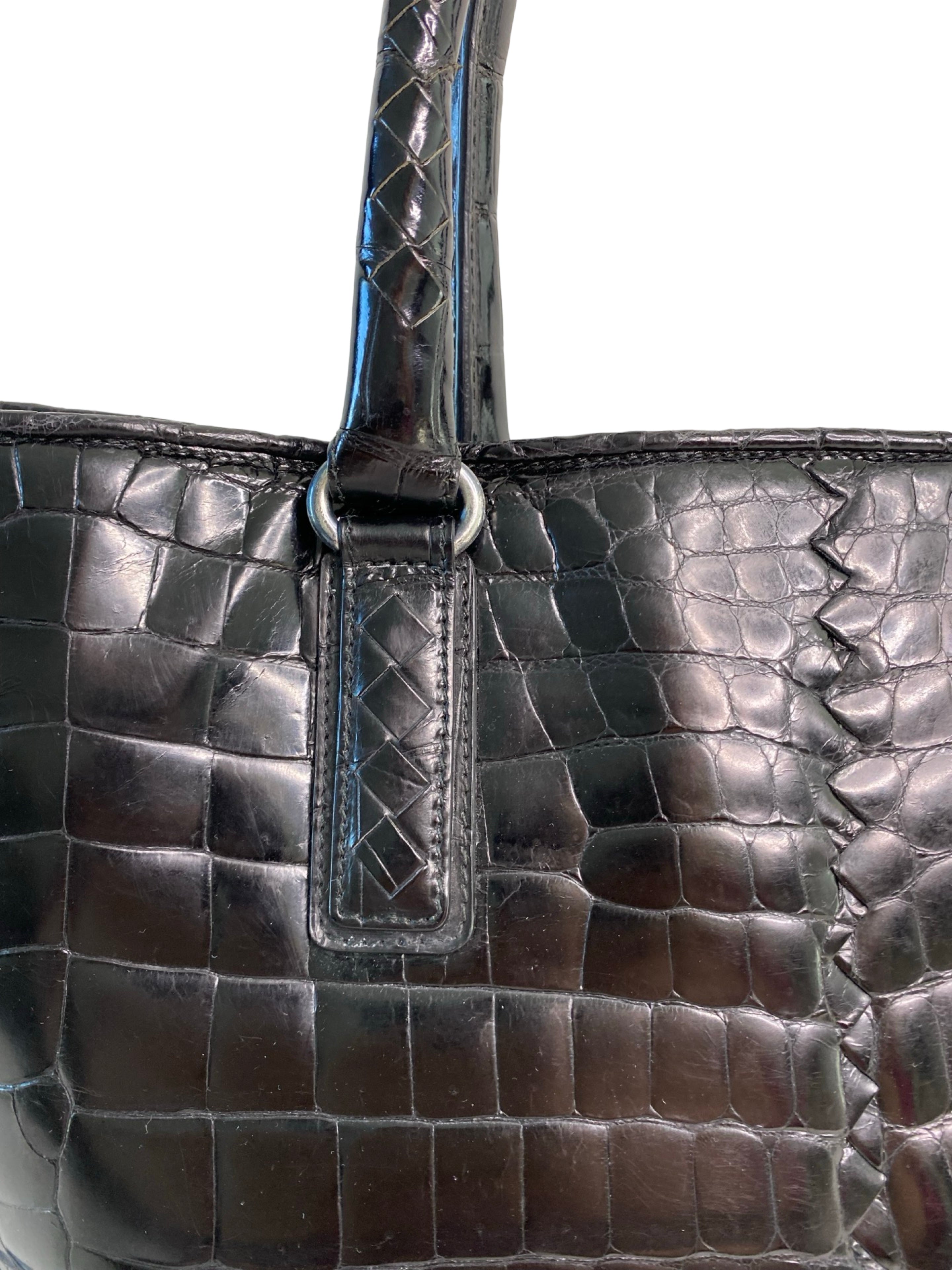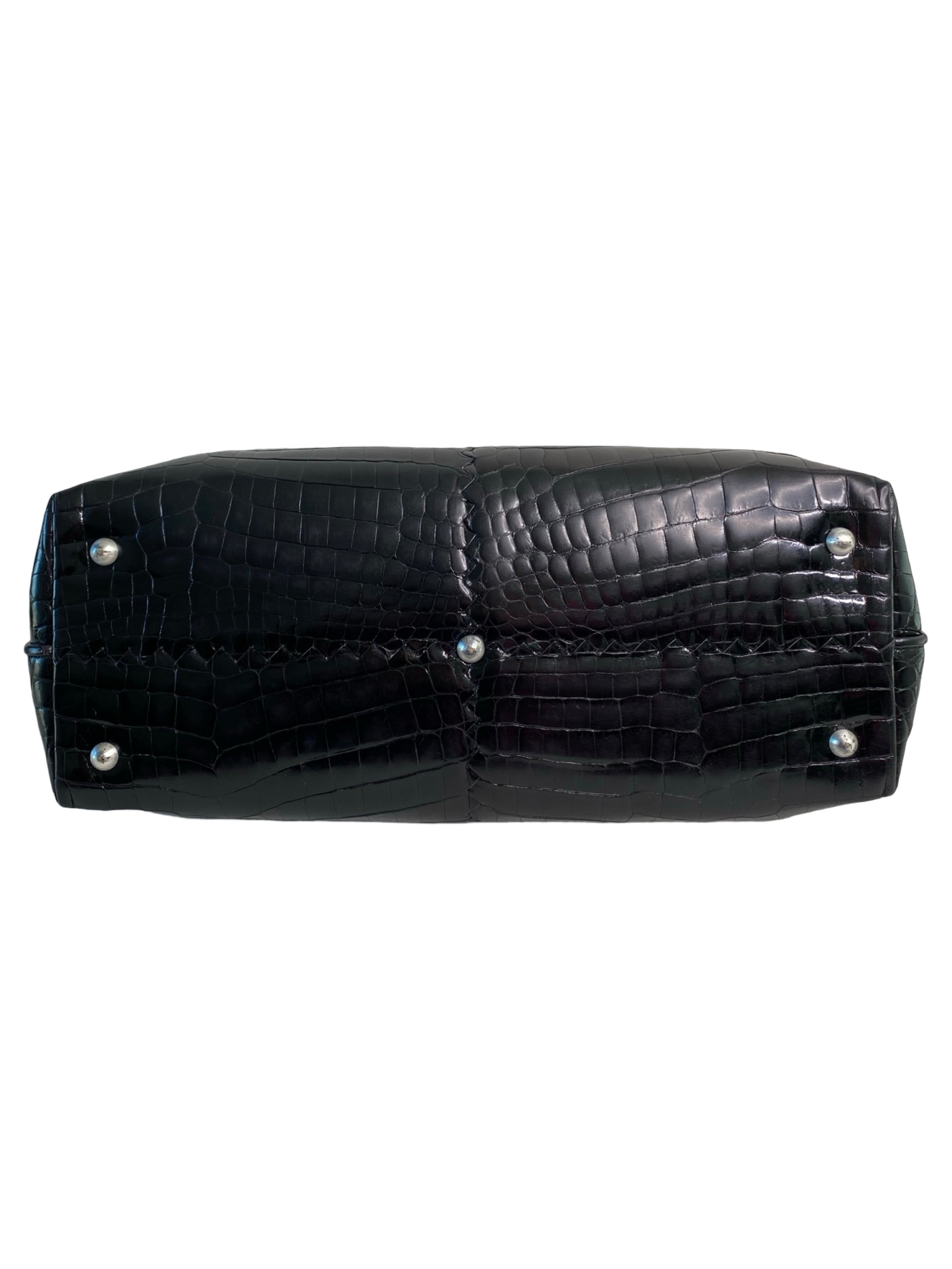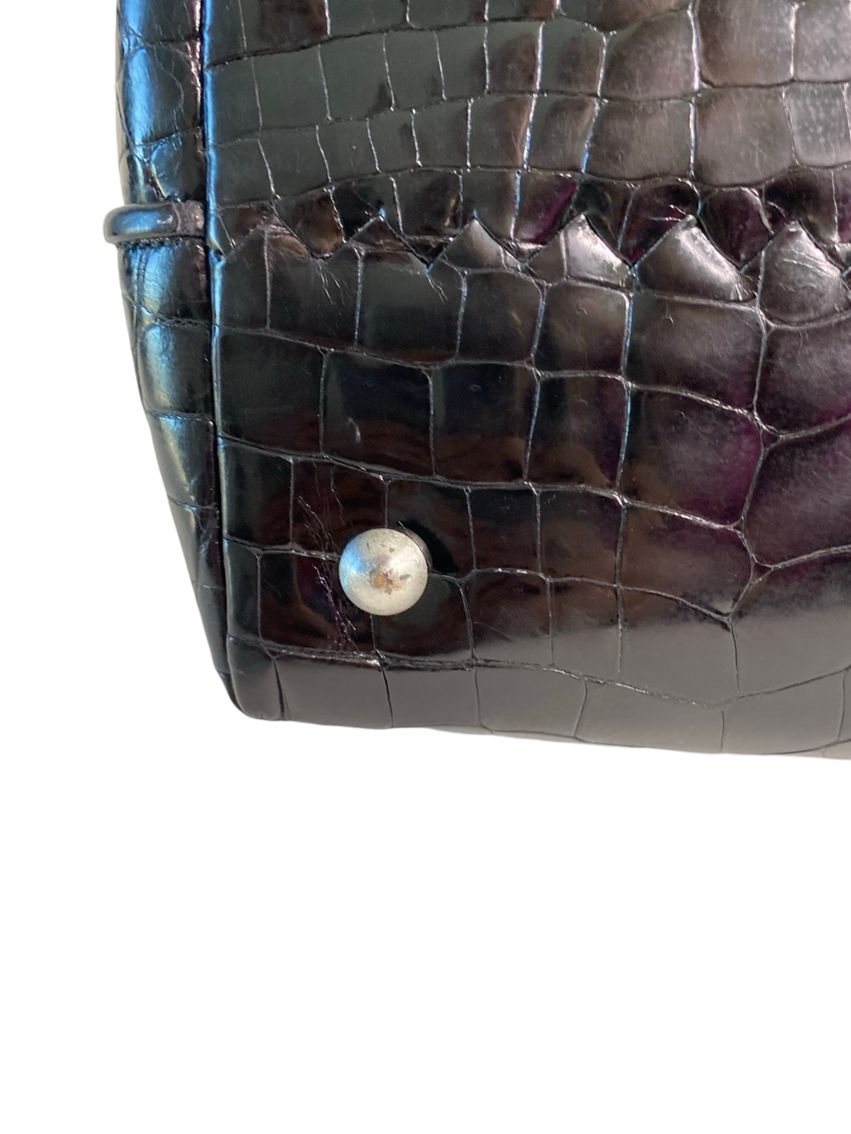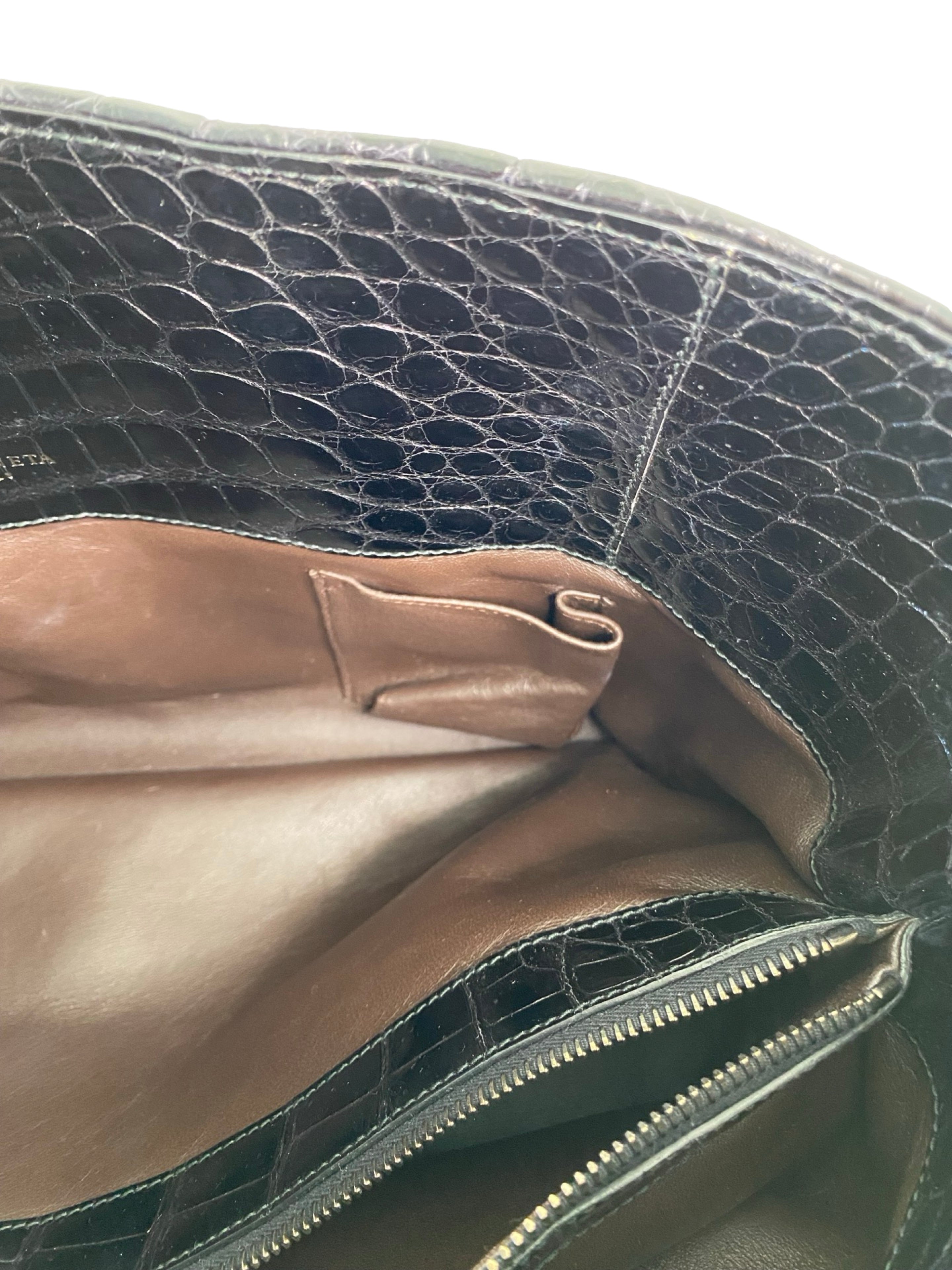 The luxurious Bottega Veneta handbag, featuring black patent crocodile leather and silver hardware. With a spacious main compartment, zipper pocket, and slip pocket, this vintage model offers both elegance and practicality. Comes with original dustbag.