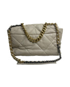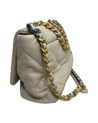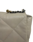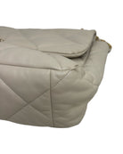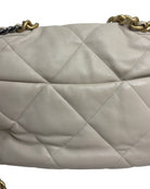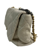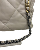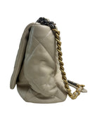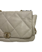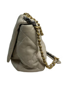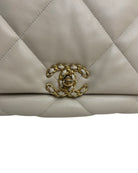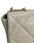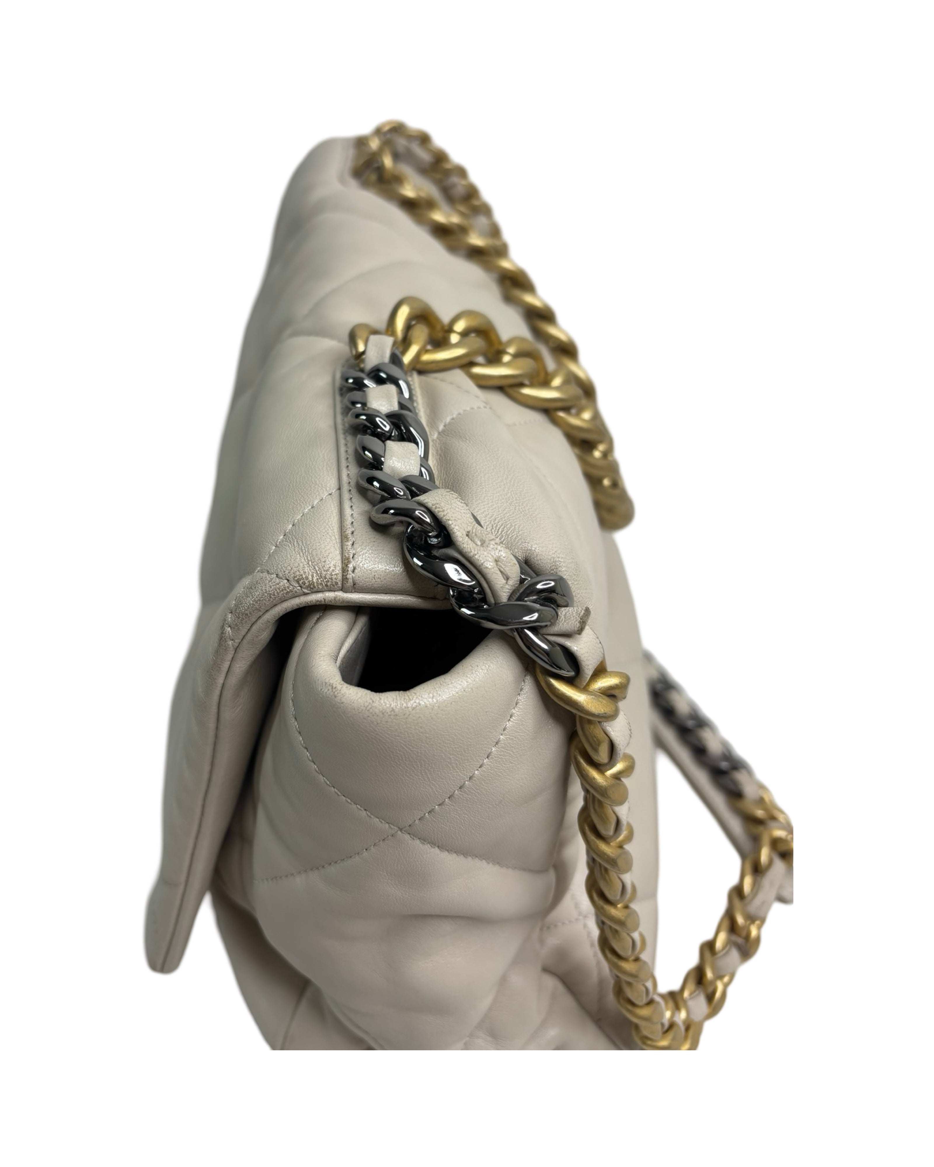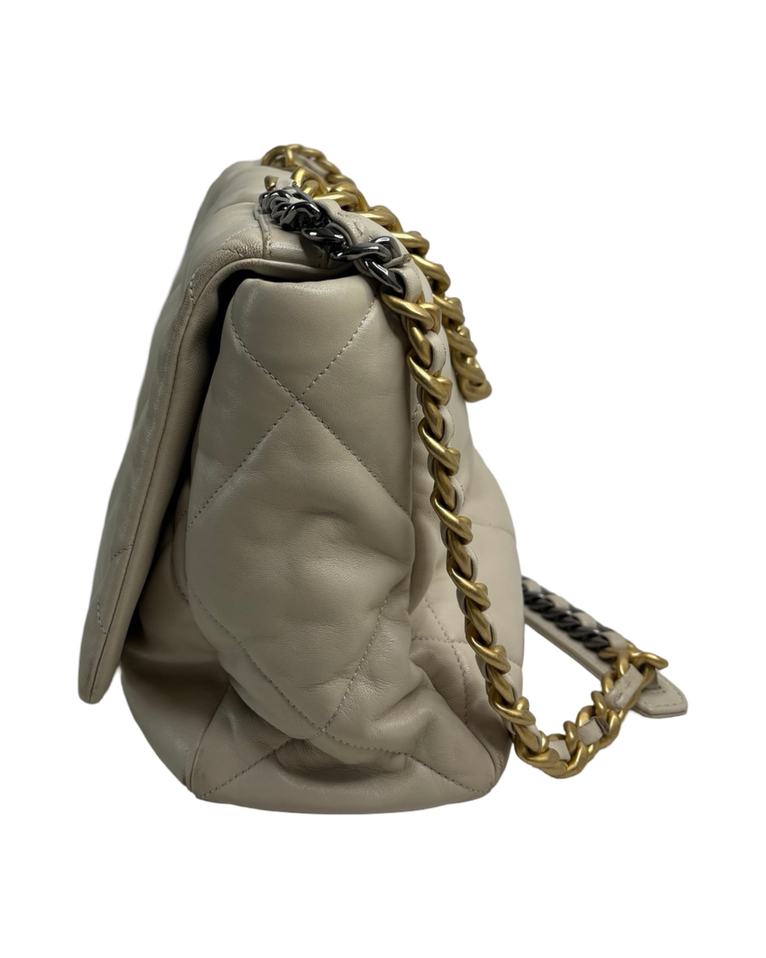 Introducing the elegant Chanel 19 Maxi handbag in beautiful beige tone. Crafted with shiny lambskin and adorned with gold-tone, silver-tone, and ruthenium-finish hardware, this timeless piece also features a big flap closure with the iconic CC-logo. Versatile to wear in multiple ways, it's perfect for any occasion and will hold its value. Will come with original dustbag.