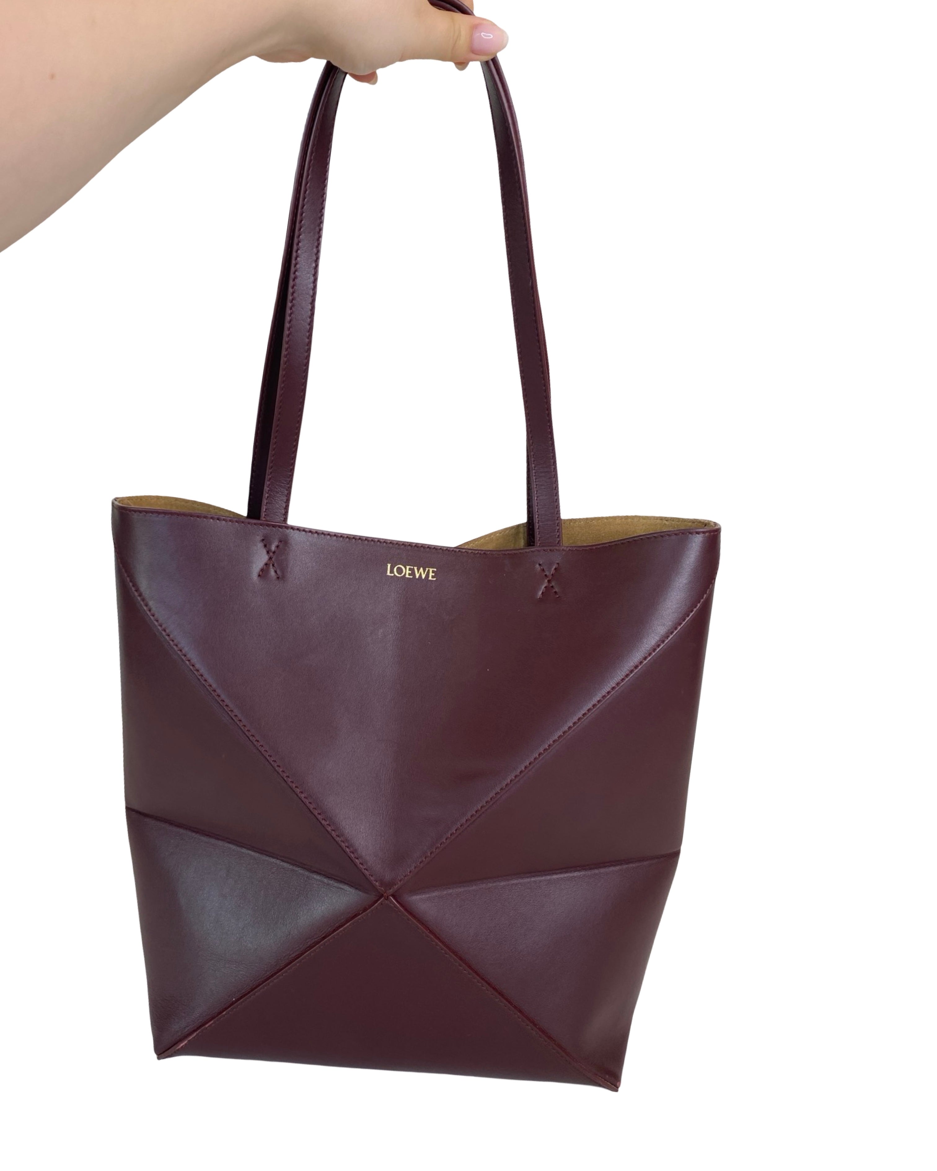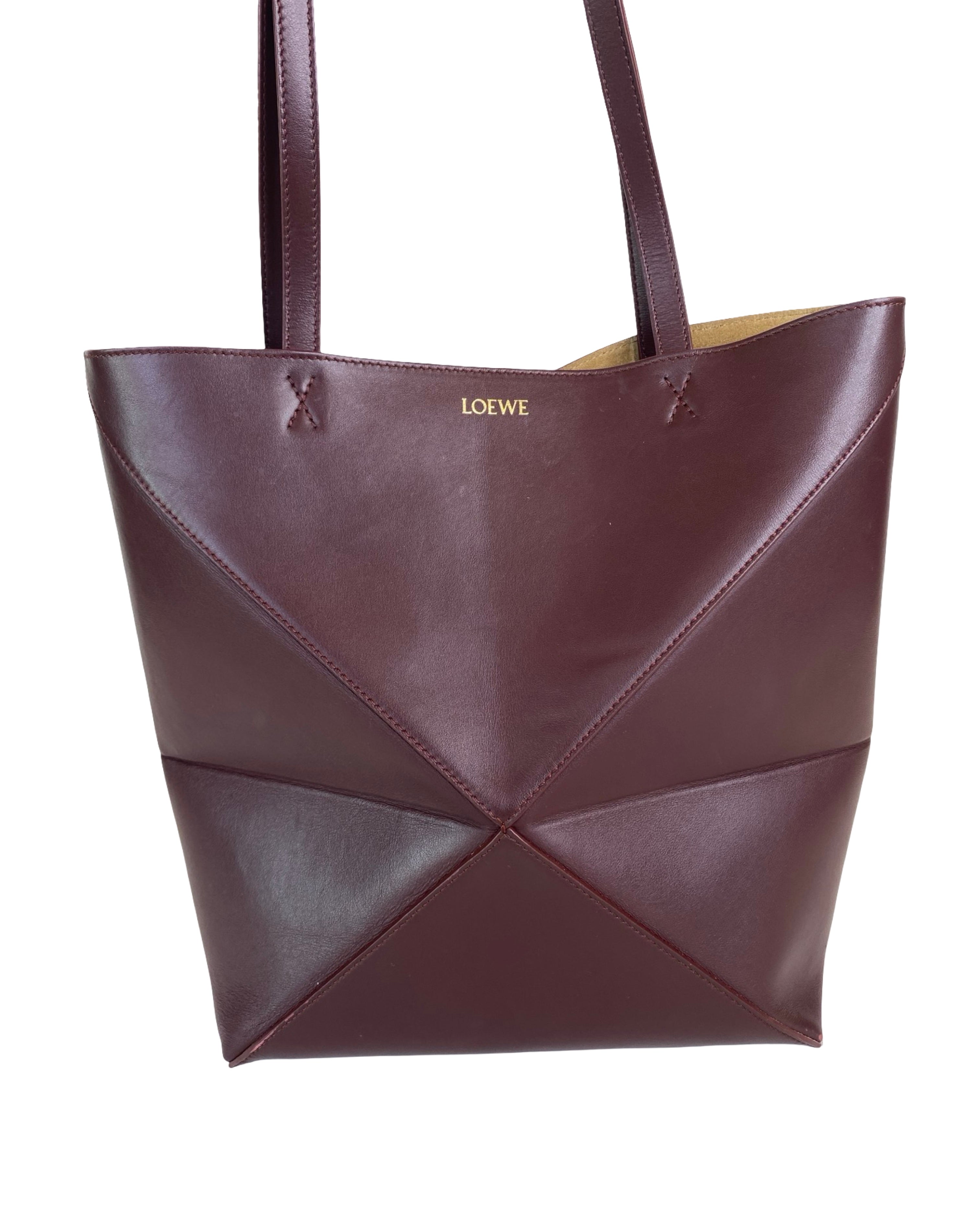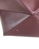 The Loewe Puzzle Fold Tote Bag in burgundy leather showcases the brand’s signature geometric design with a refined, foldable silhouette. Crafted from supple, smooth-grain leather, it combines structure and softness for effortless sophistication. Lightweight and versatile, the bag folds completely flat for easy storage and features discreet embossed Loewe branding along with comfortable top handles, offering a perfect balance of innovation and timeless elegance. Made from high-quality leather, the bag comes in a rich burgundy colour and measures 31 cm in height, 27 cm in width, and 13 cm in depth.