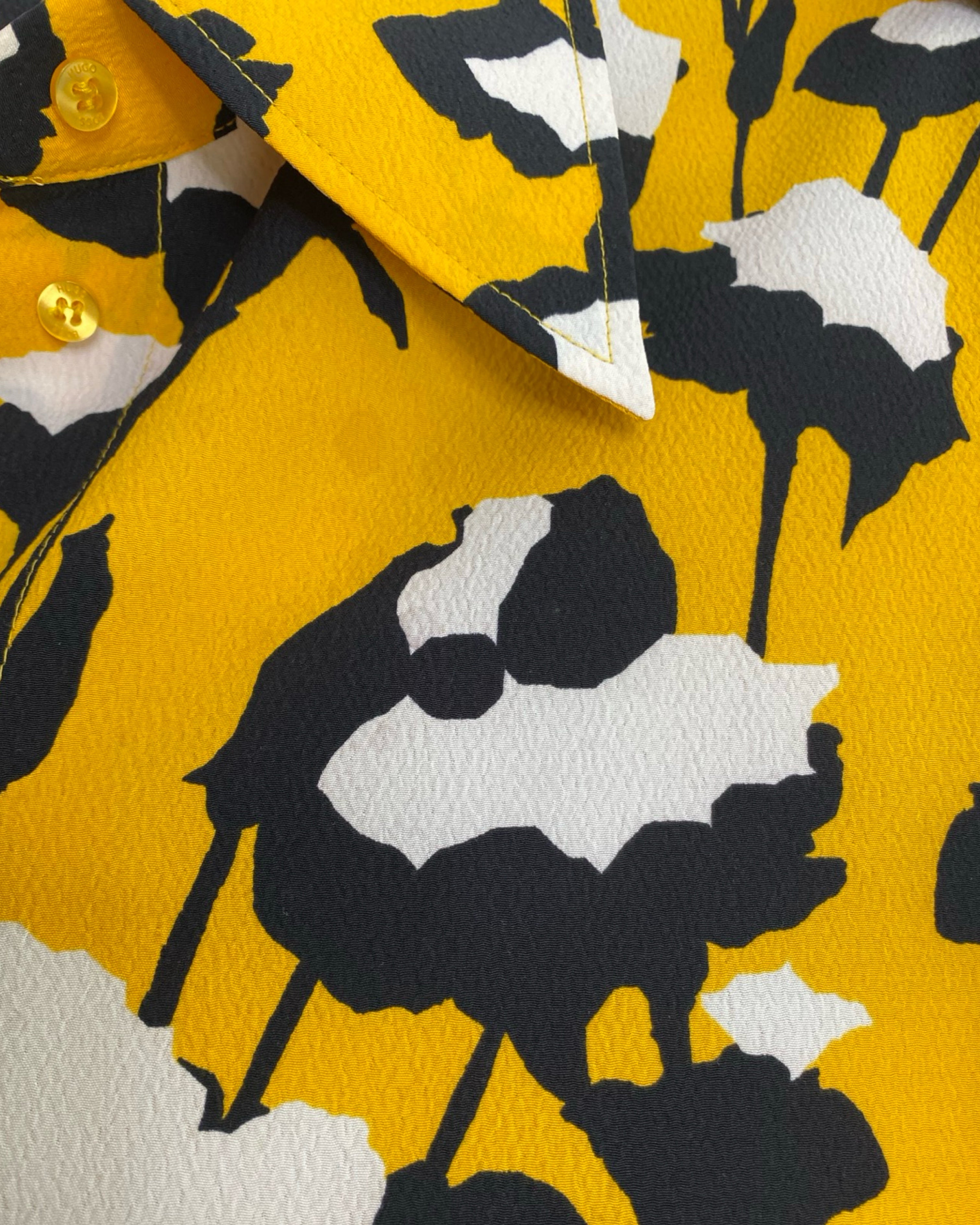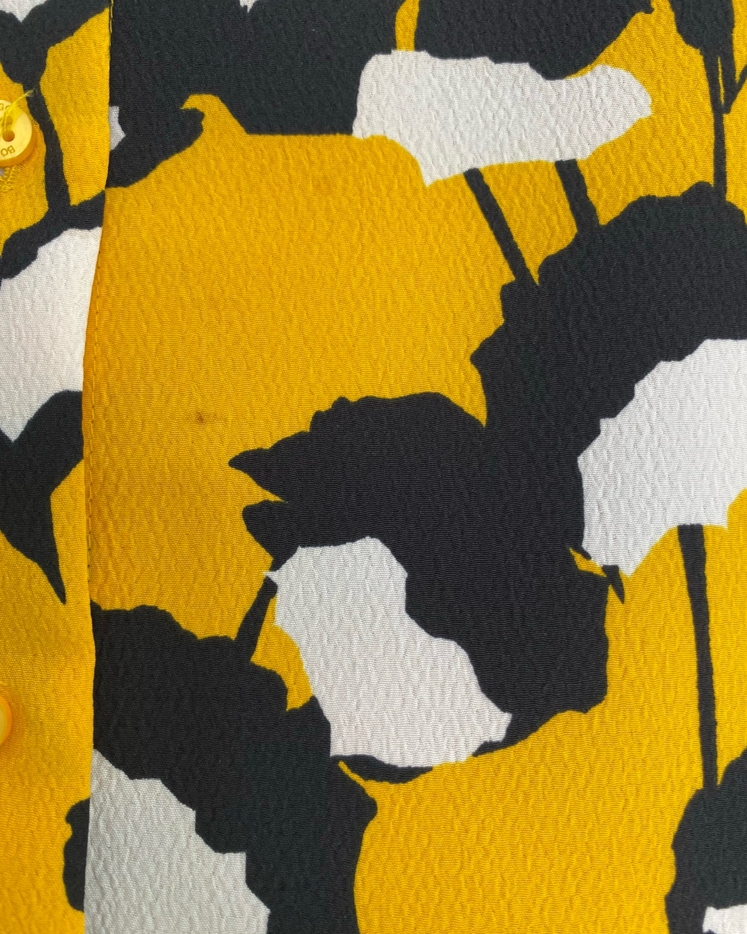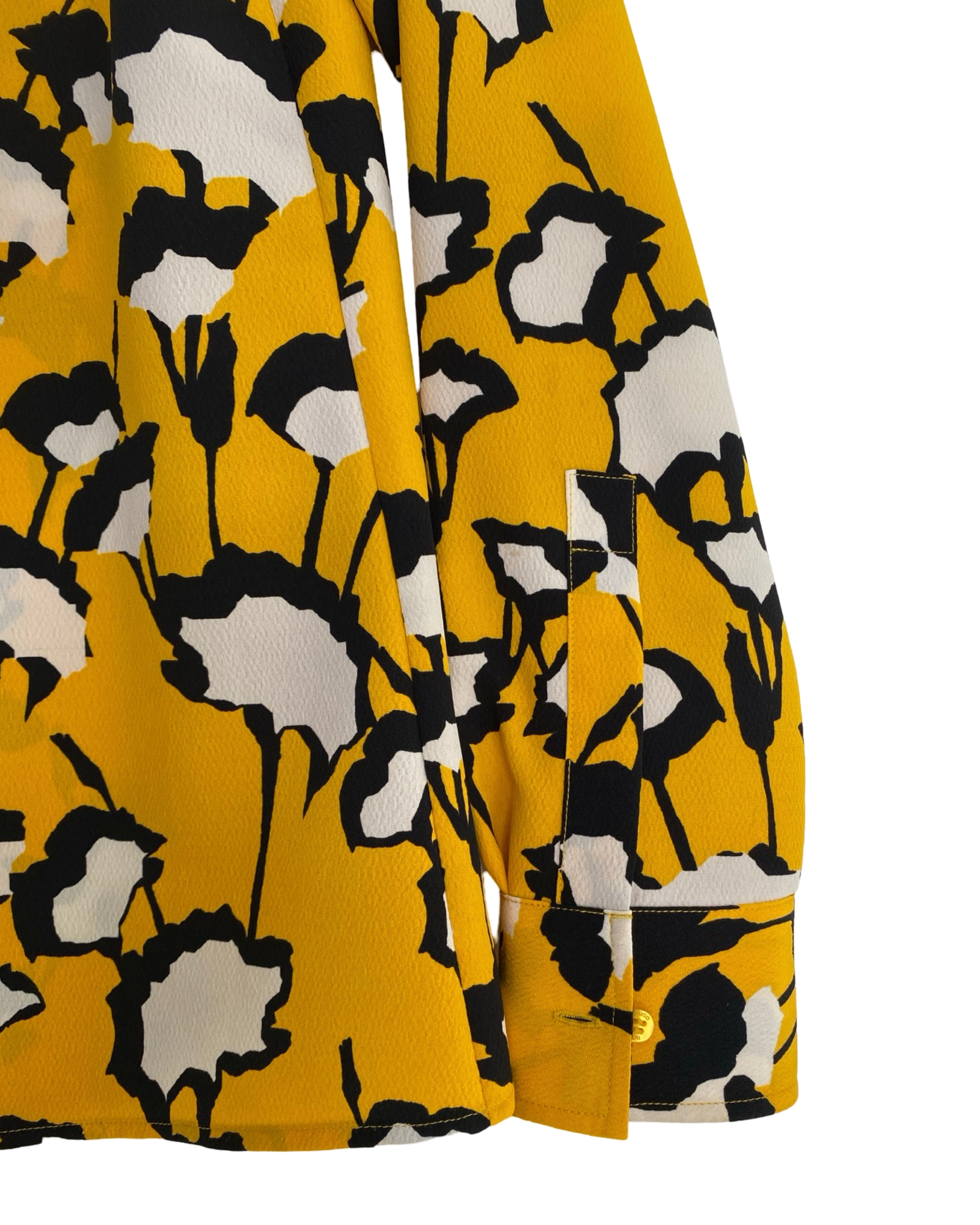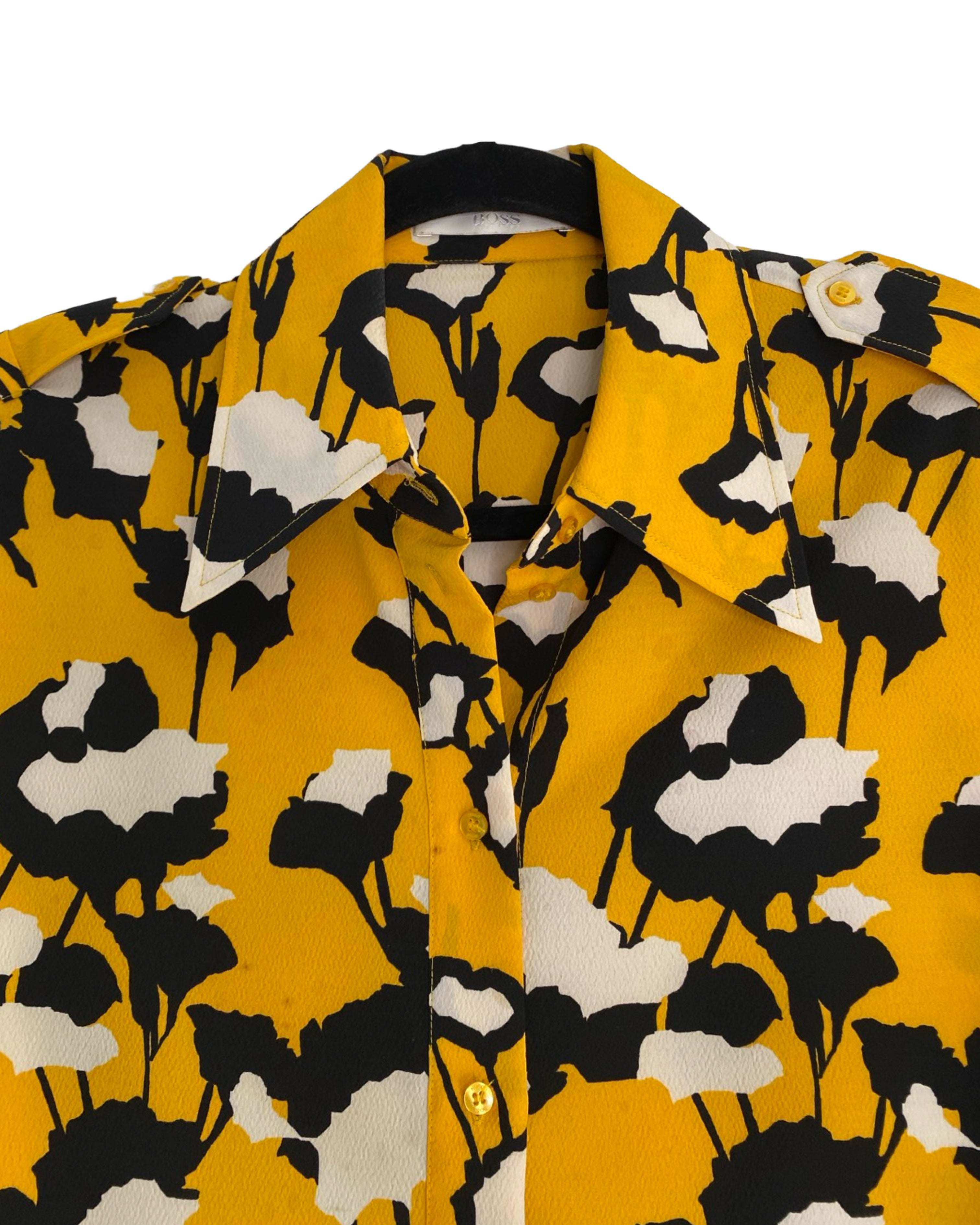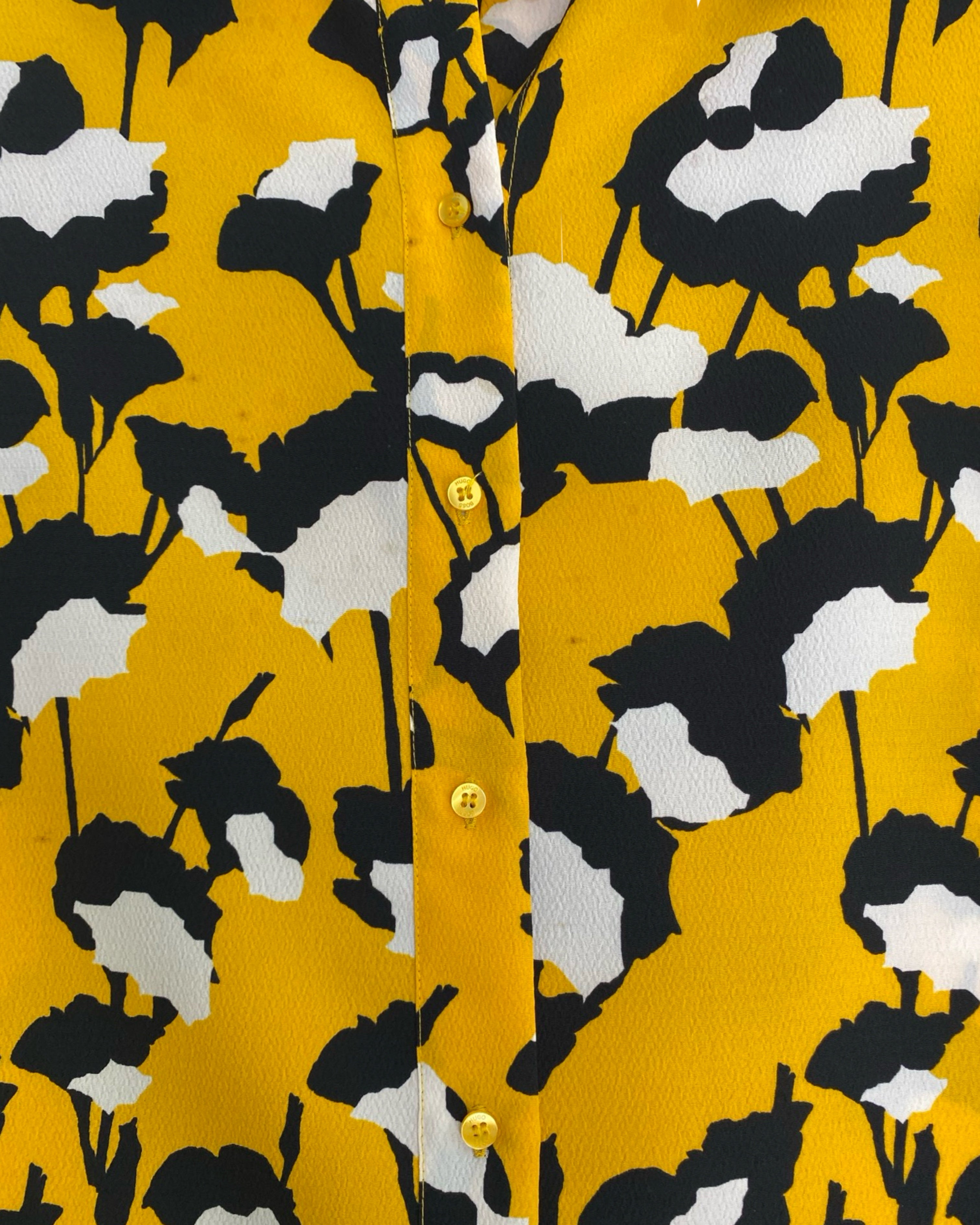 Elevate your style with the Hugo Boss blouse. Made with premium polyester viscose mixed material. This jacket has shiny yellow buttons. This blouse adds a touch of sophistication to your outfit. With a V neckline, it seamlessly combines fashion and comfort. Available in size S.