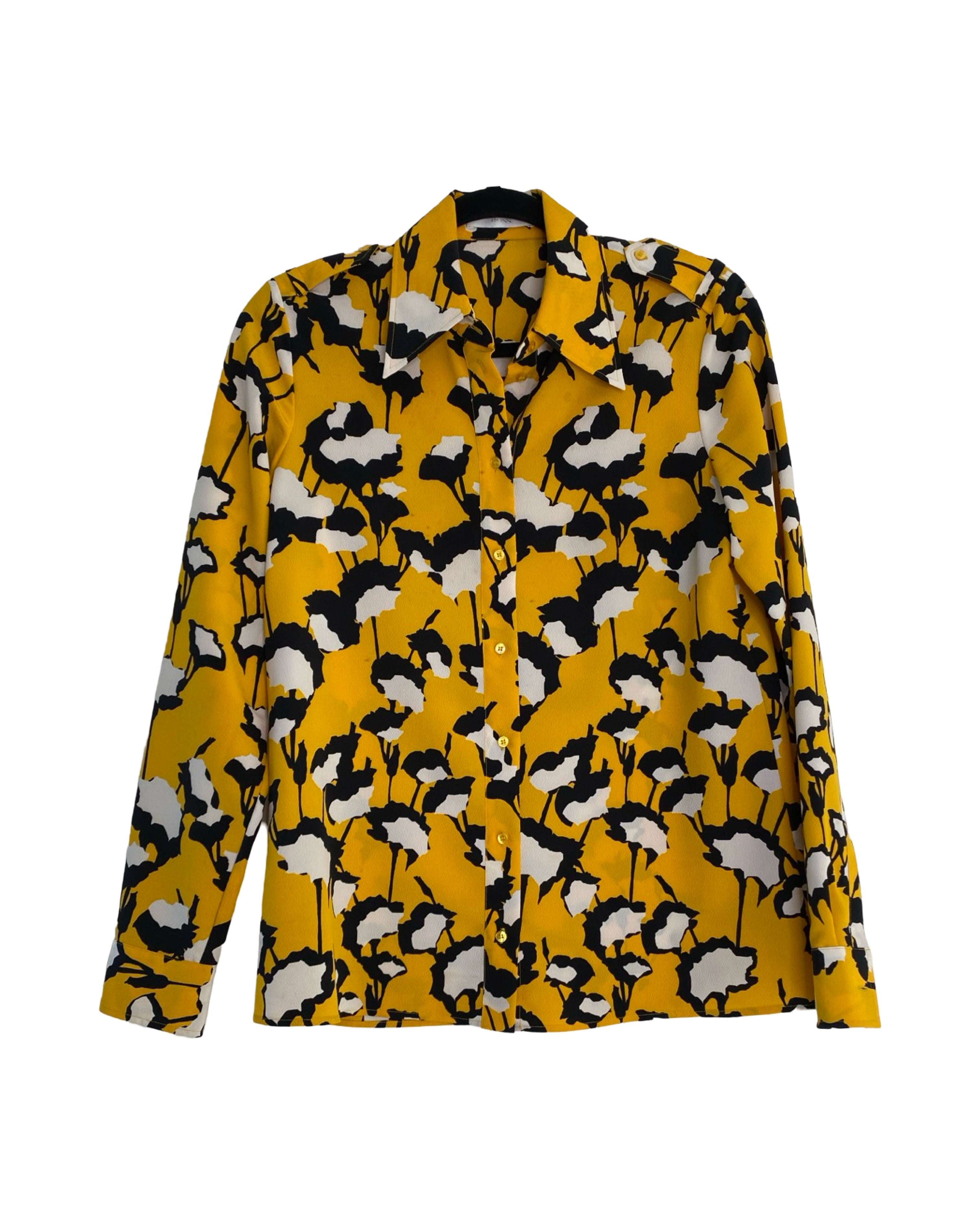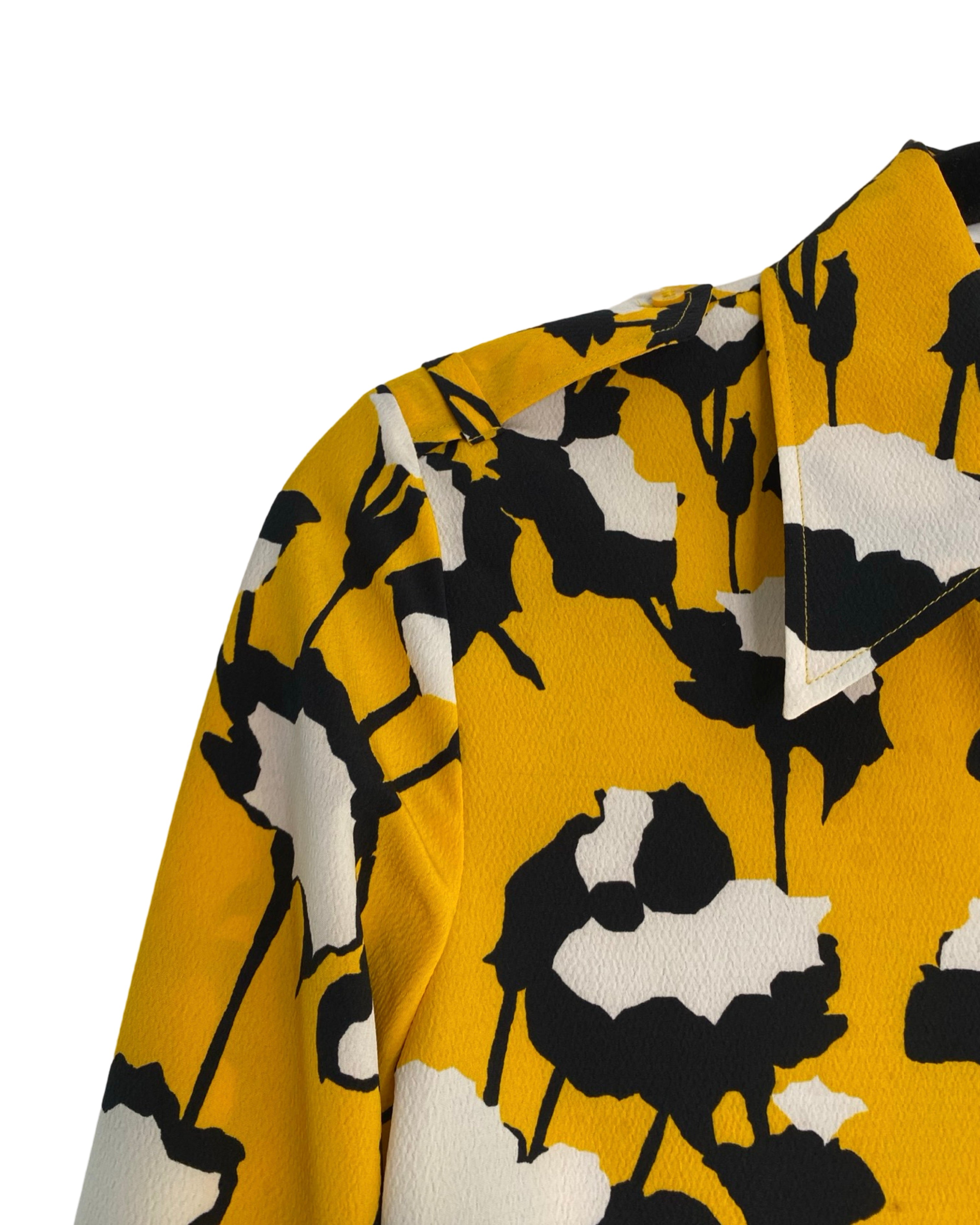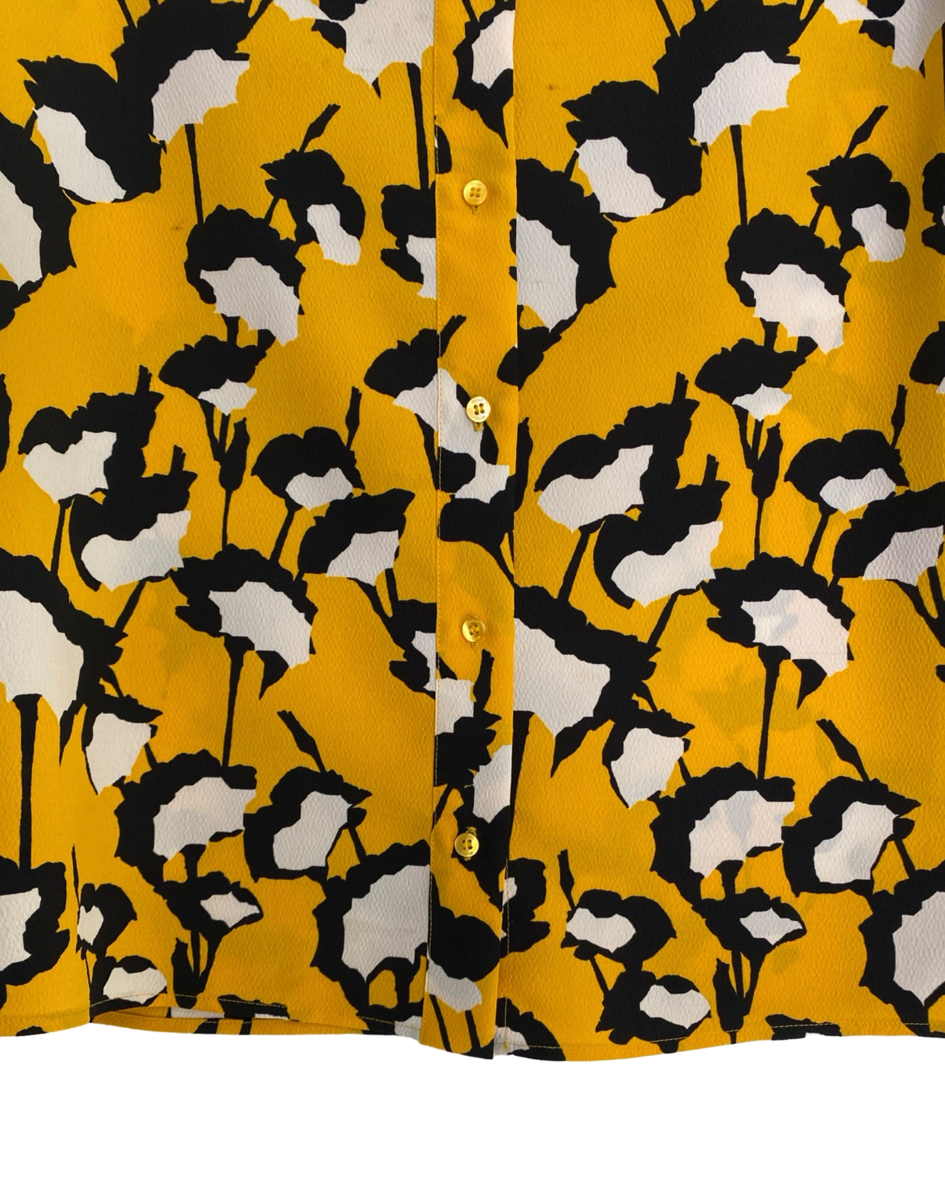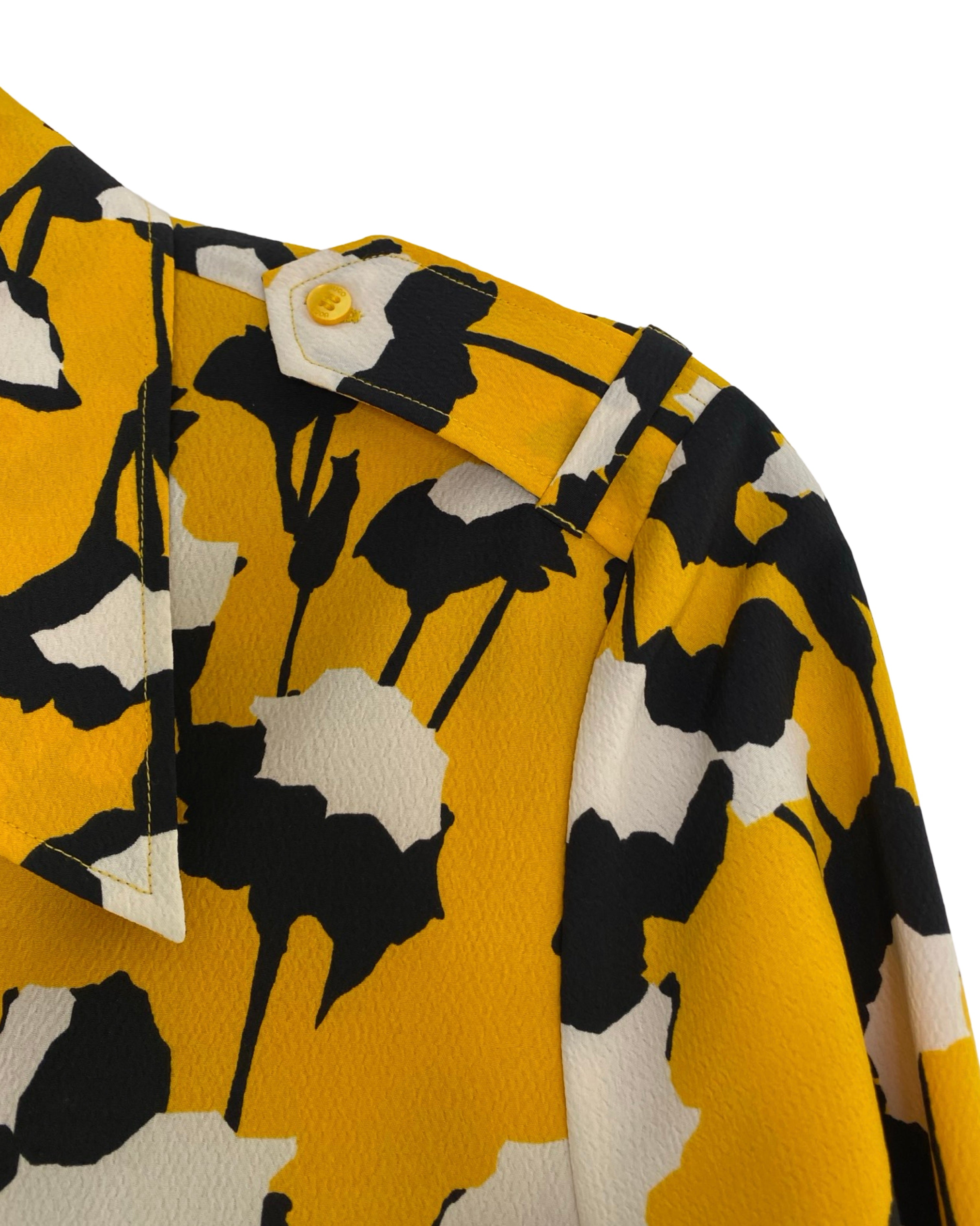Elevate your style with the Hugo Boss blouse. Made with premium polyester viscose mixed material. This jacket has shiny yellow buttons. This blouse adds a touch of sophistication to your outfit. With a V neckline, it seamlessly combines fashion and comfort. Available in size S.