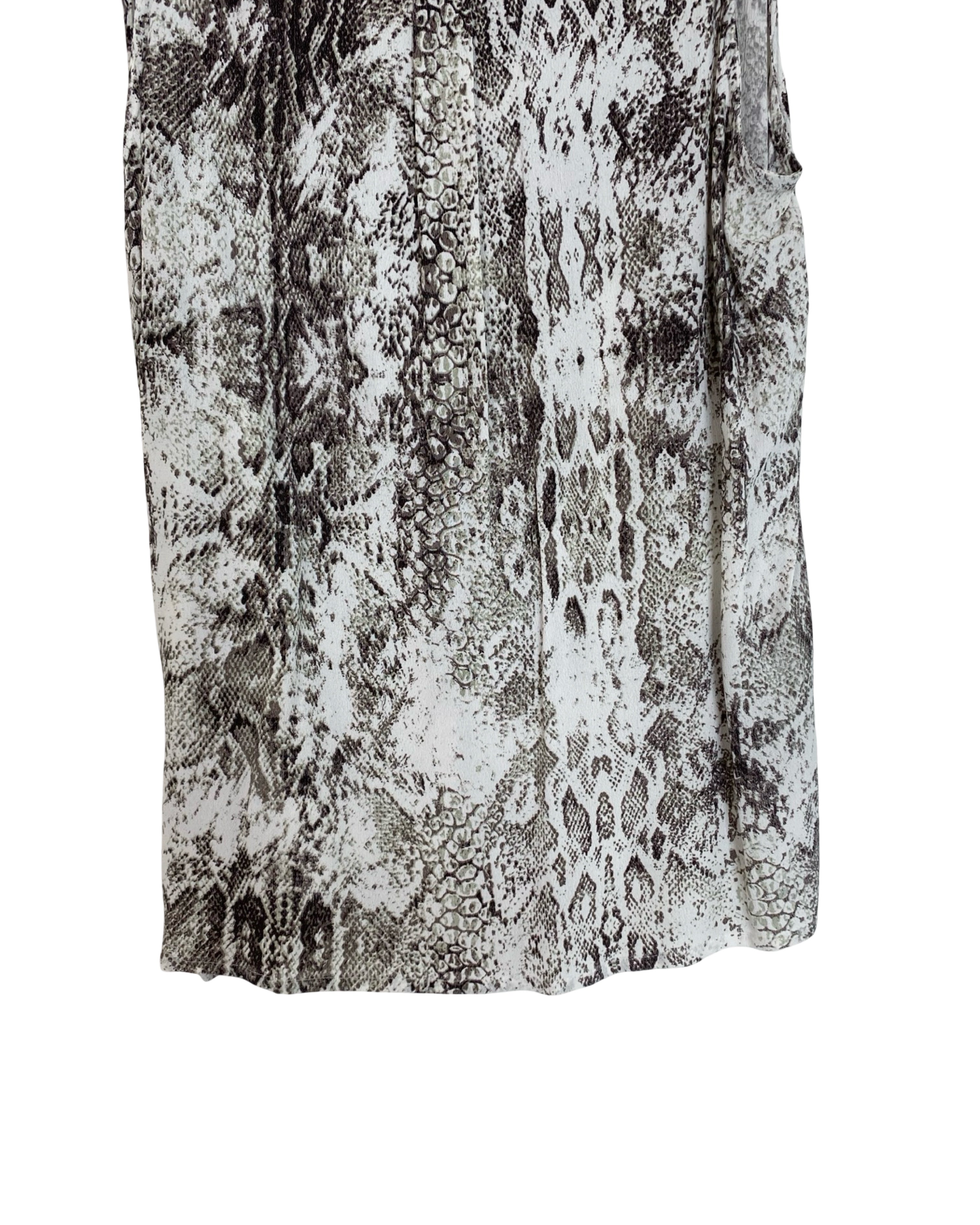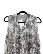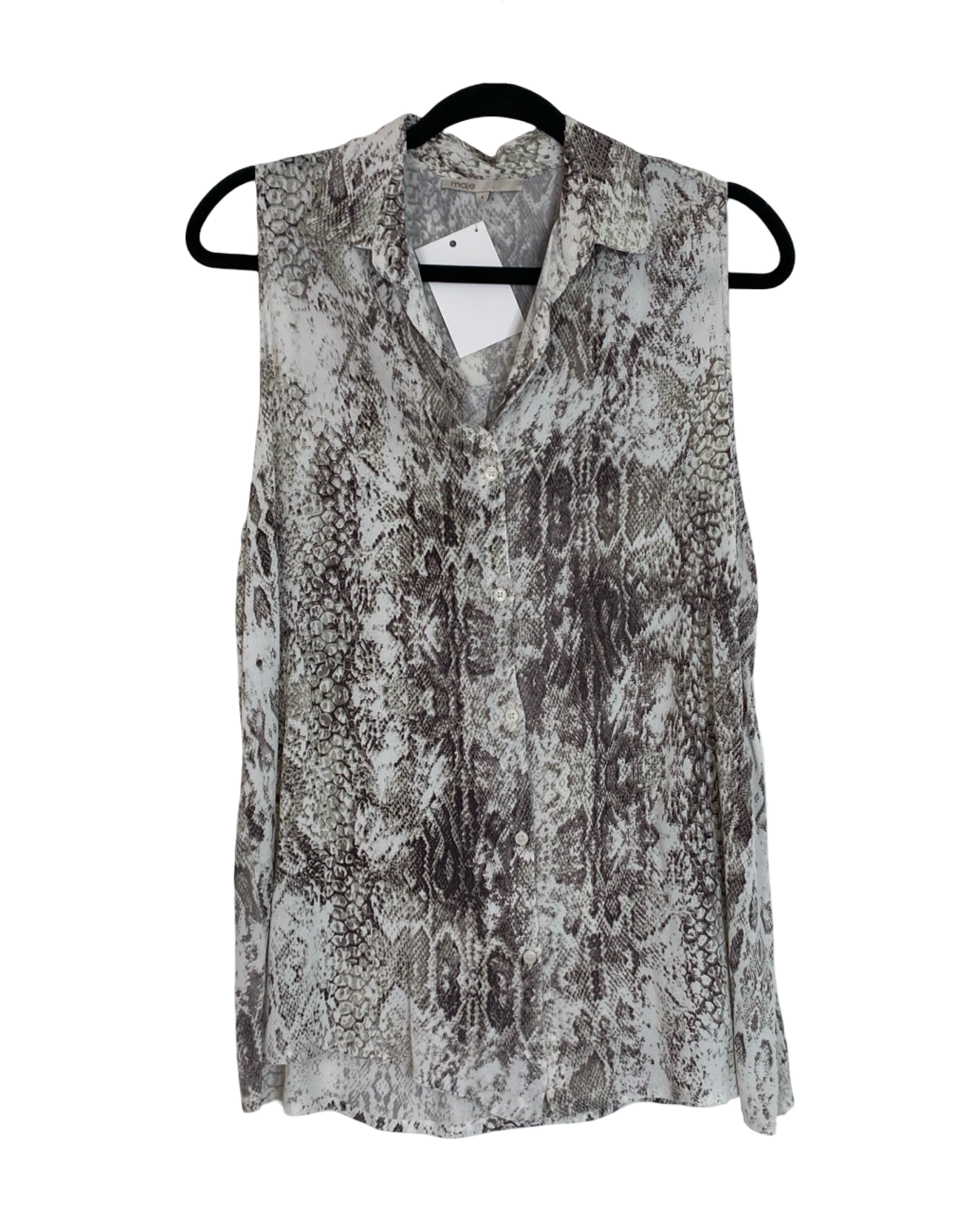Edgy yet sophisticated, this Maje sleeveless top features a subtle grey snake print on soft, lightweight viscose. Its sleek silhouette makes it perfect for layering or wearing solo, adding a touch of Parisian chic to any outfit. Versatile and fashion-forward, this top embodies Maje’s modern, effortless style. Designed in size S, it measures 75 cm in full length and 43 cm from armpit to armpit, finished in a refined grey hue.