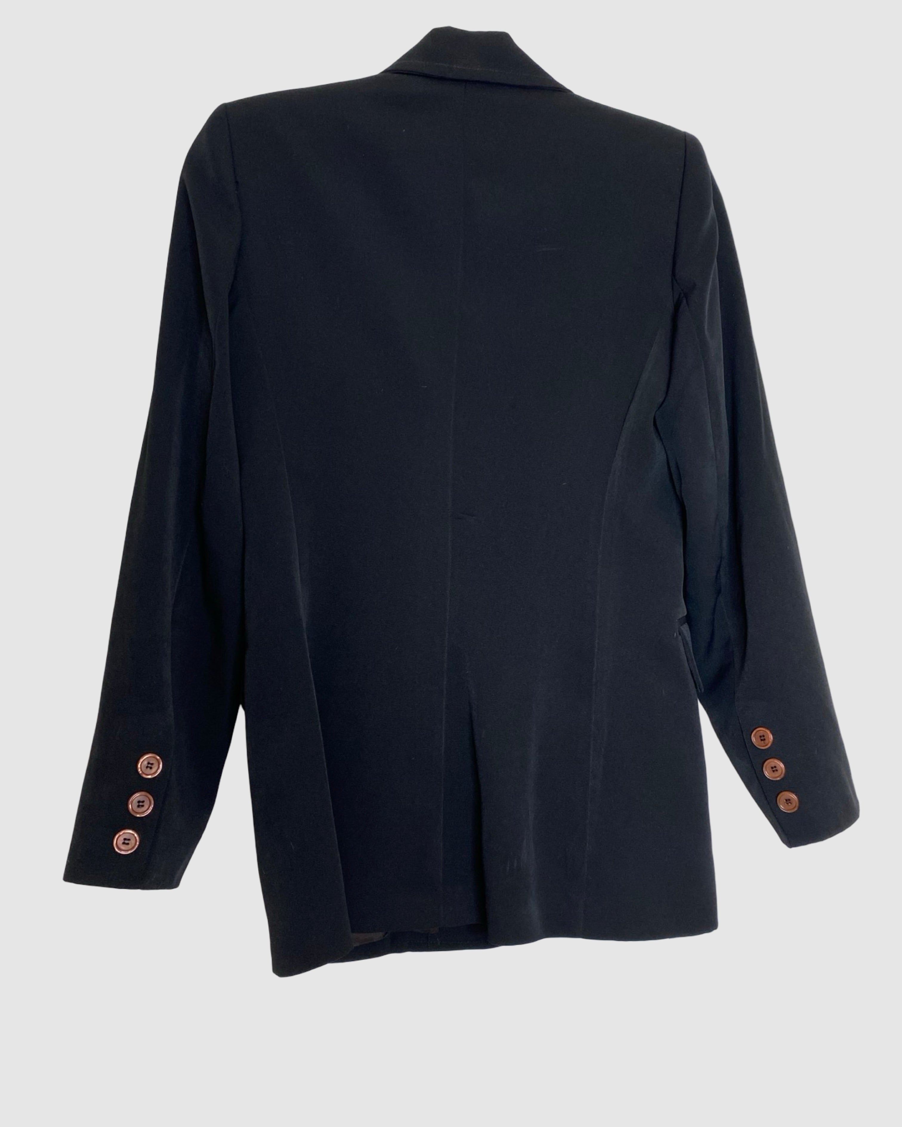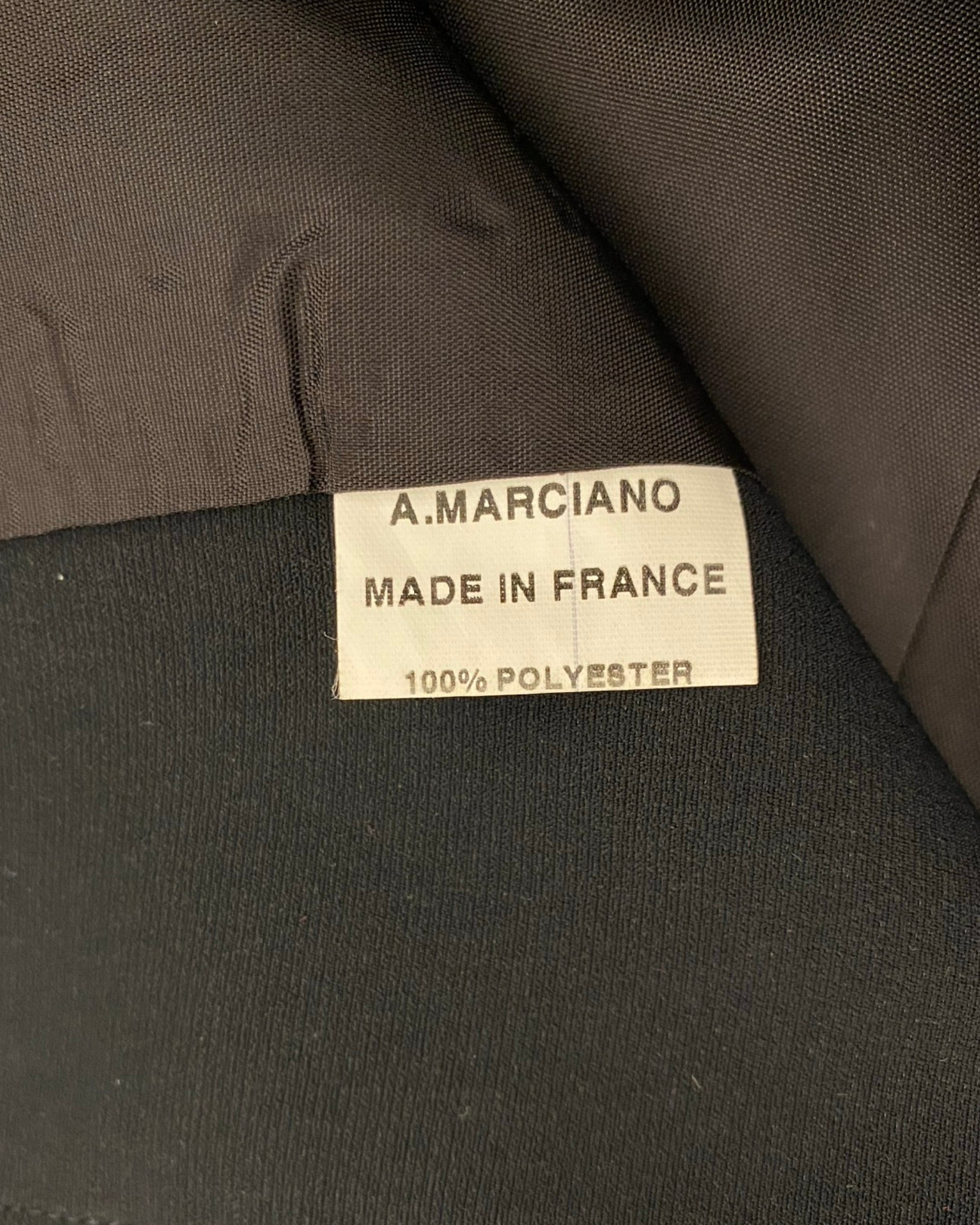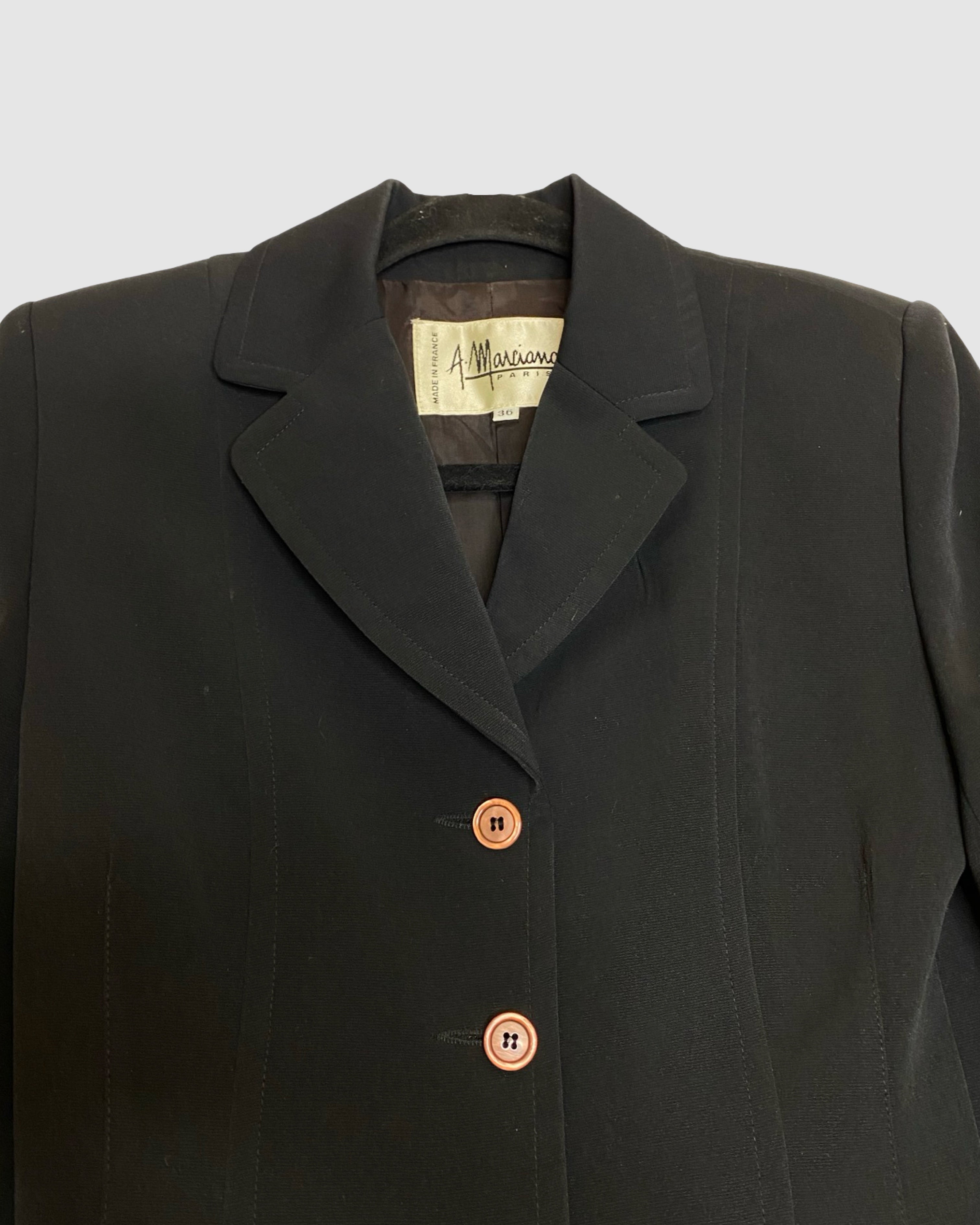 Elegant and sharply tailored, this A. Marciano black blazer features intricate detailed workmanship and distinctive copper-brown buttons for a refined contrast. Crafted from polyester, it’s perfect for both professional and evening wear, blending classic structure with a bold, sophisticated finish. Size: XS.