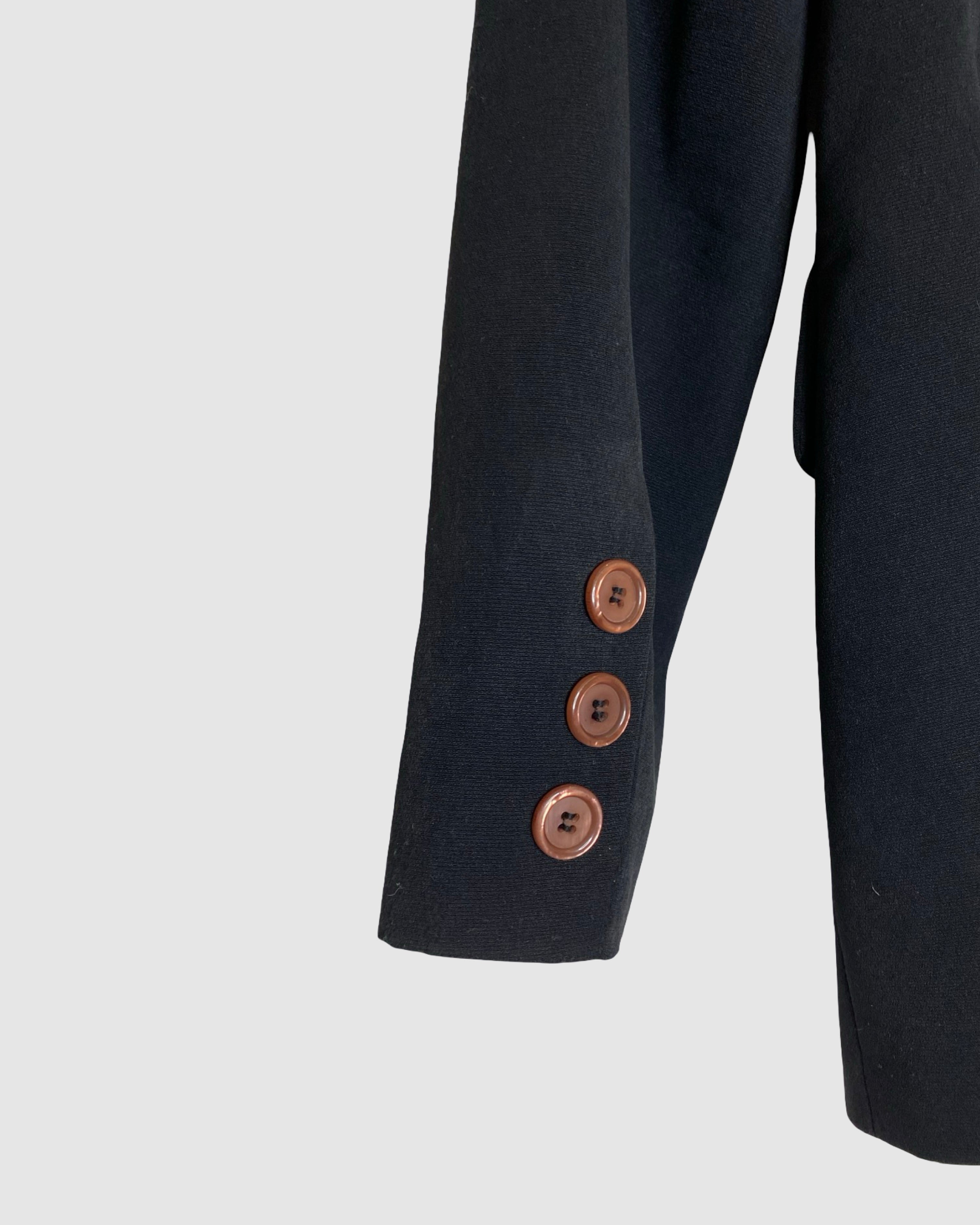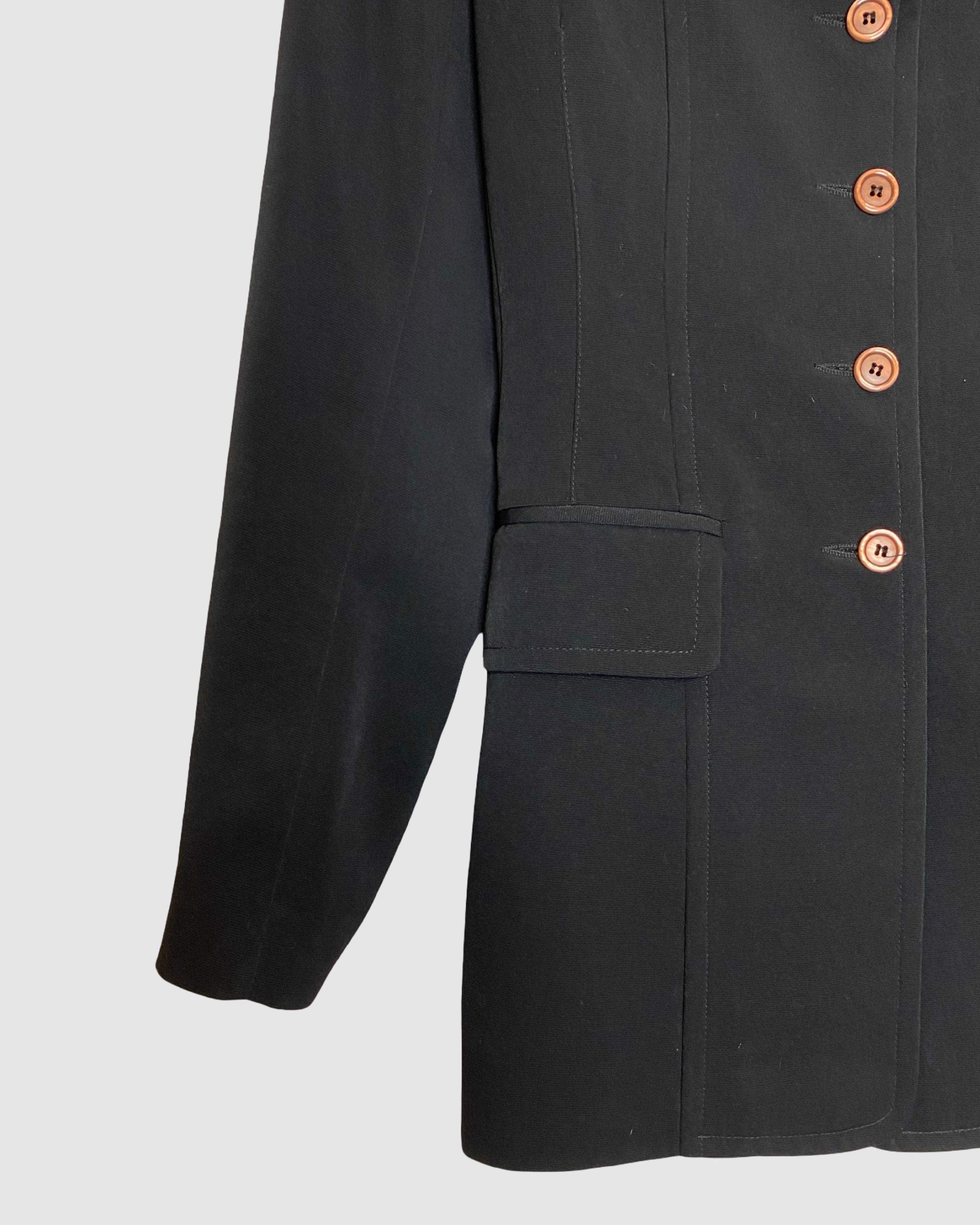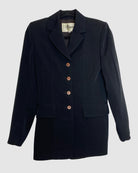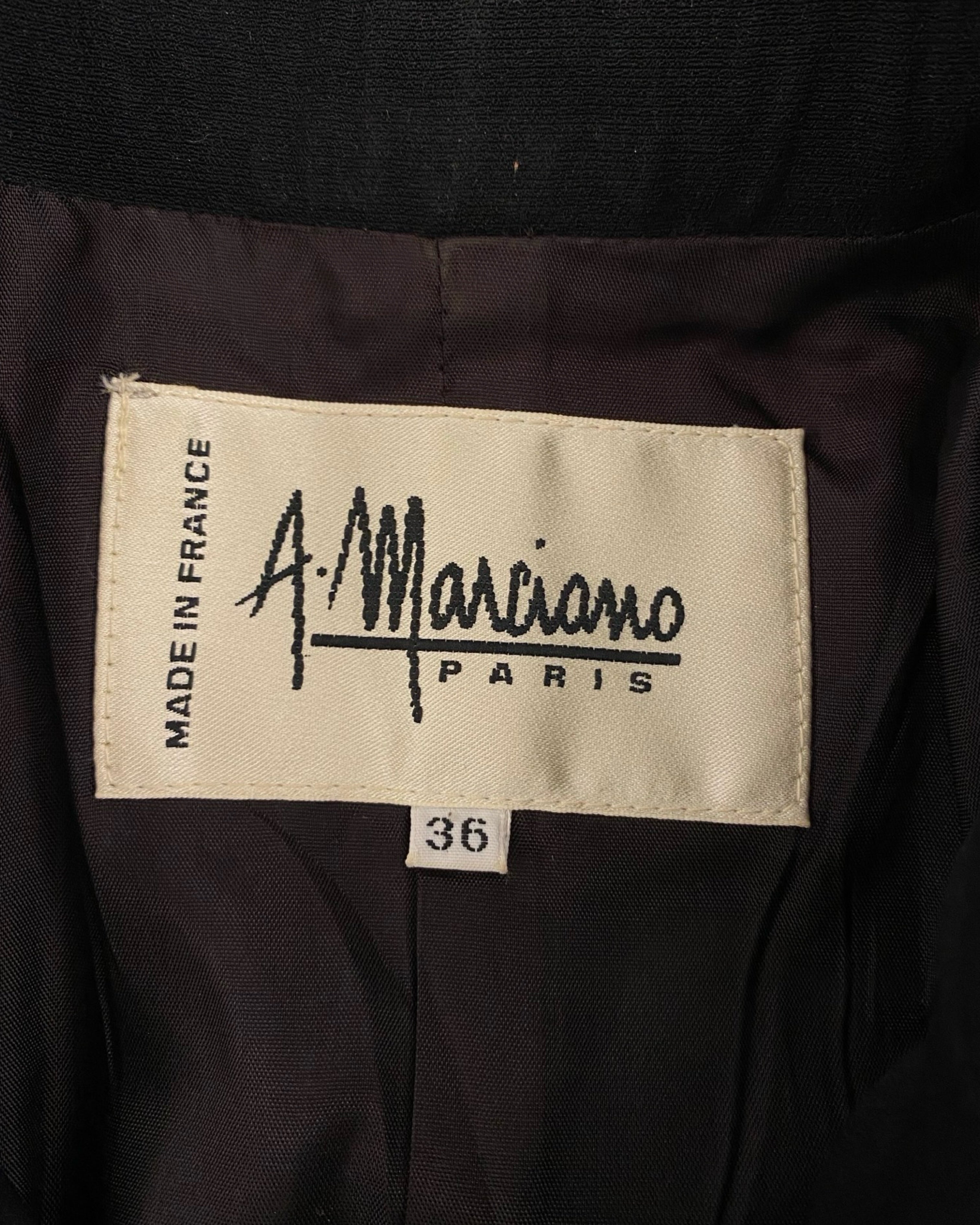 Elegant and sharply tailored, this A. Marciano black blazer features intricate detailed workmanship and distinctive copper-brown buttons for a refined contrast. Crafted from polyester, it’s perfect for both professional and evening wear, blending classic structure with a bold, sophisticated finish. Size: XS.