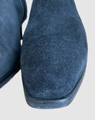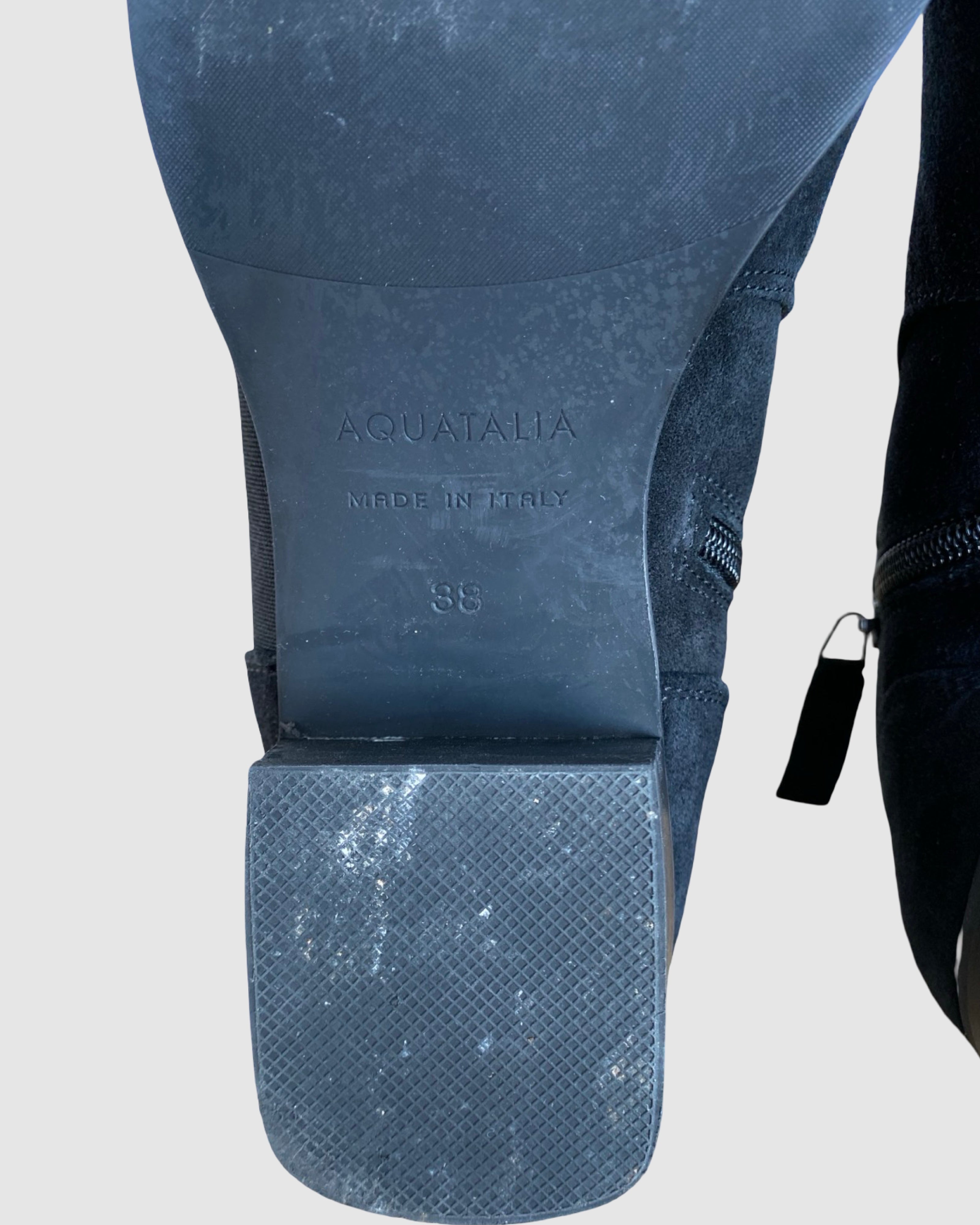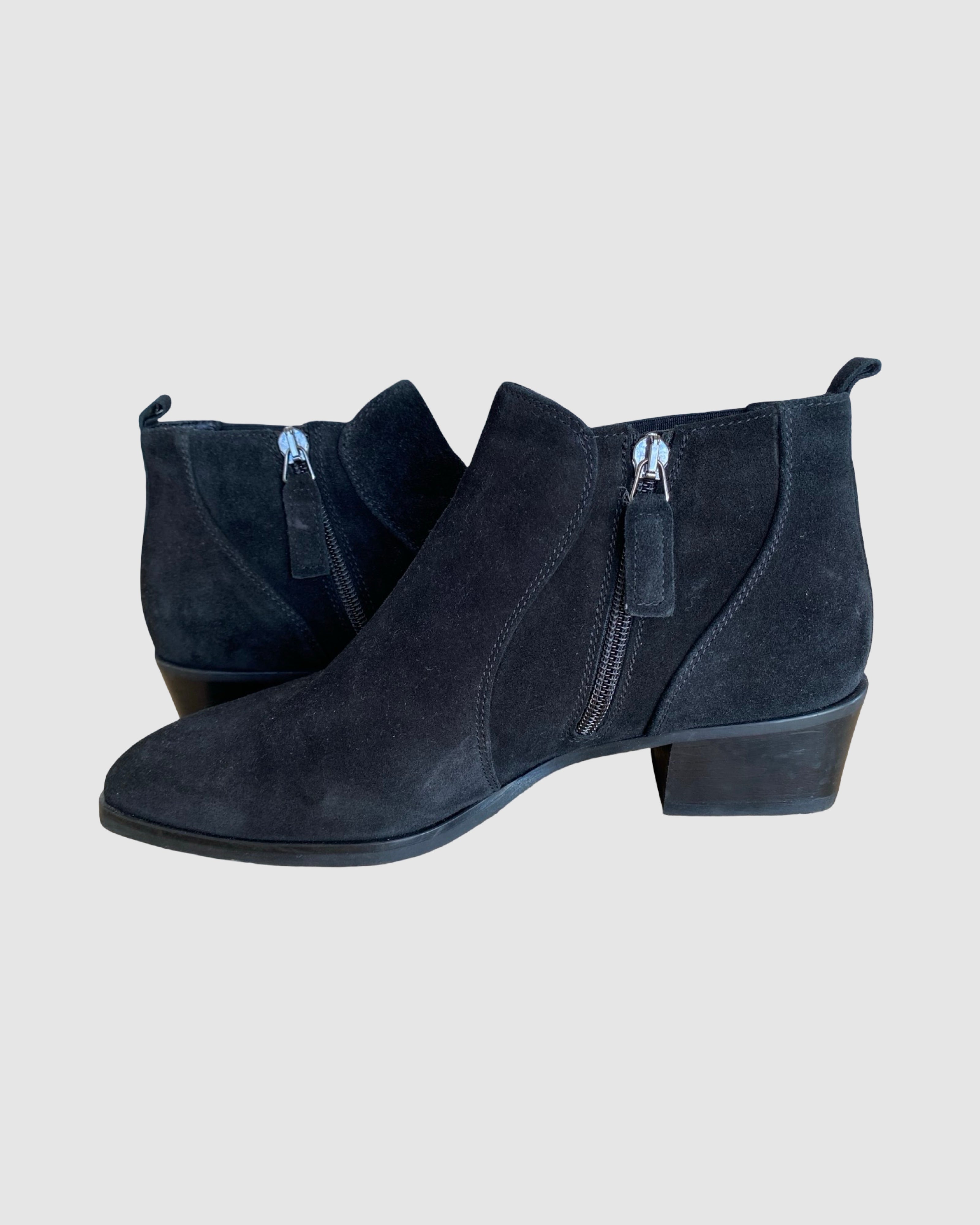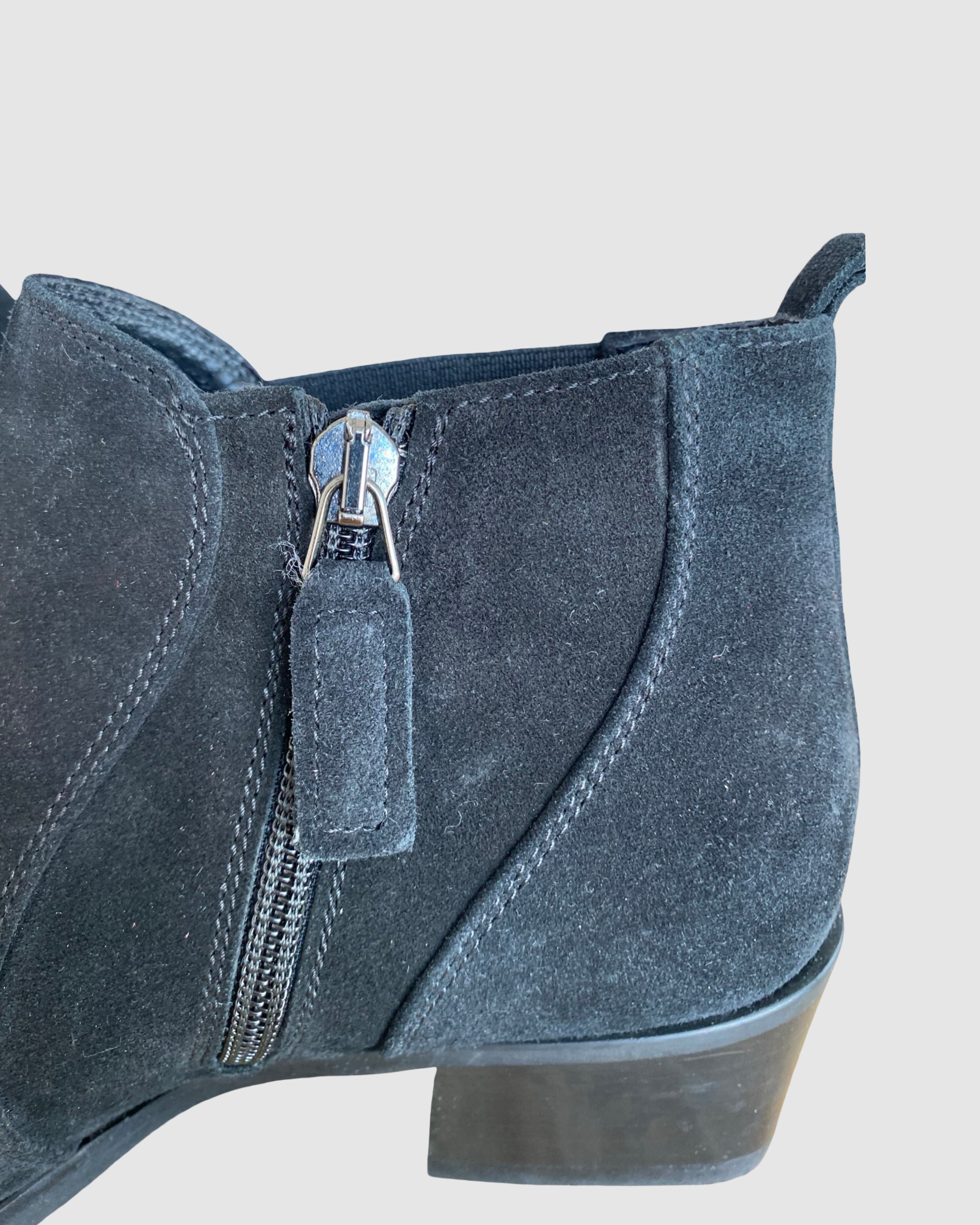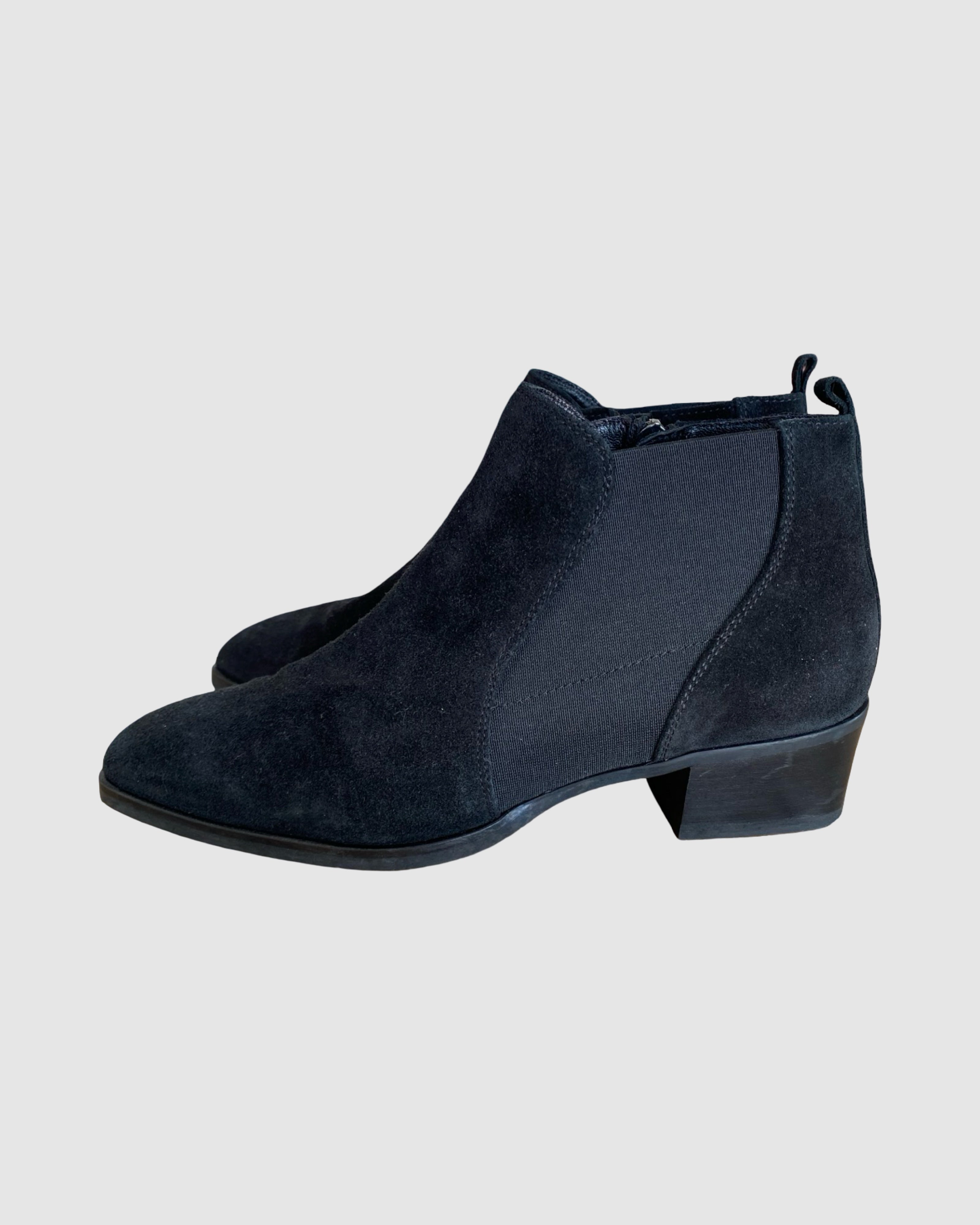 Elevate your everyday style with these sophisticated Aquatalia x Russell Bromley ankle boots. Crafted from luxurious black suede with a refined almond toe silhouette, these boots feature a practical side zipper for effortless wear. The ribbed elastic detailing ensures a comfortable fit, while the supple leather lining provides lasting comfort throughout the day. A timeless investment piece that seamlessly transitions from season to season, perfect for discerning style enthusiasts seeking quality and elegance.