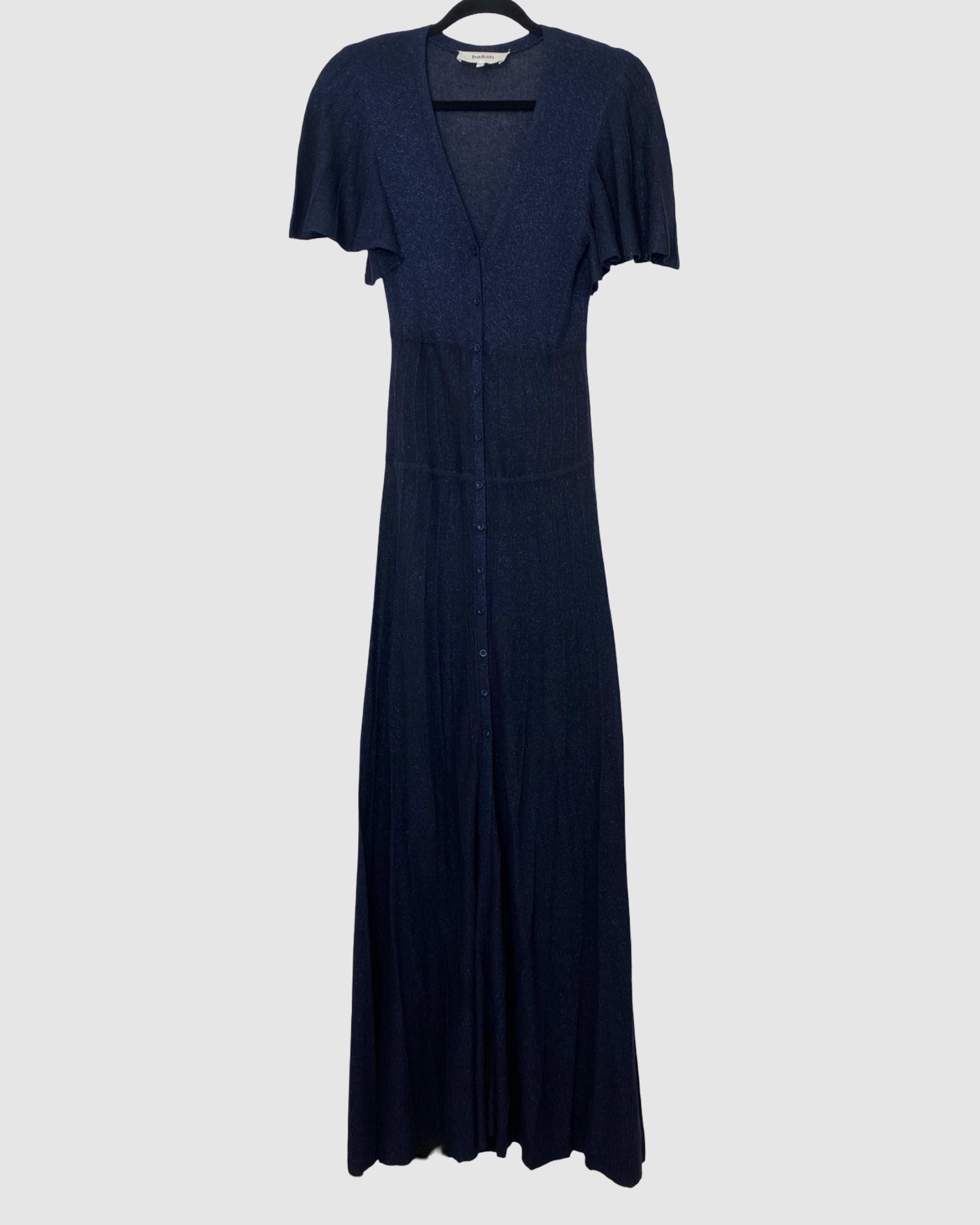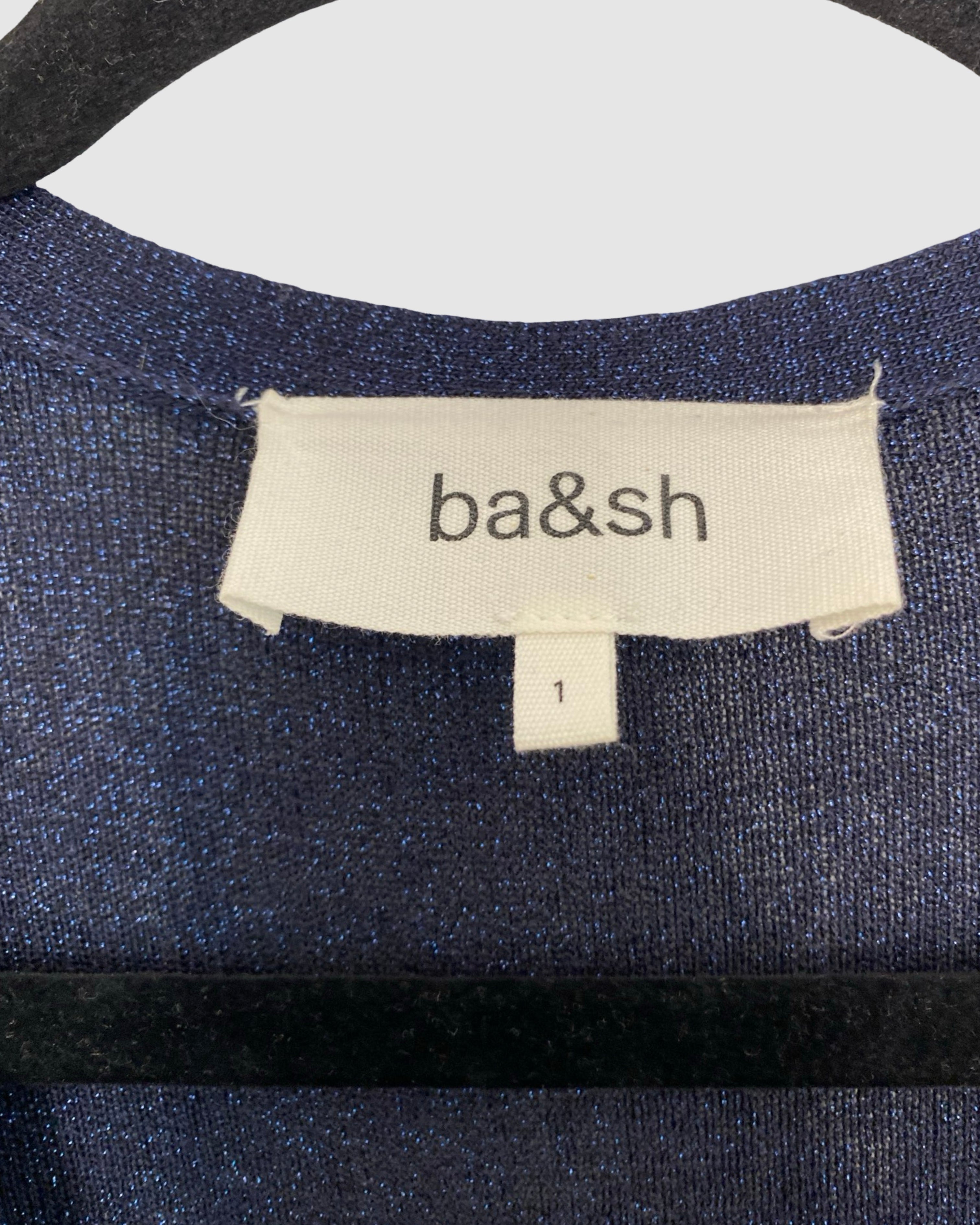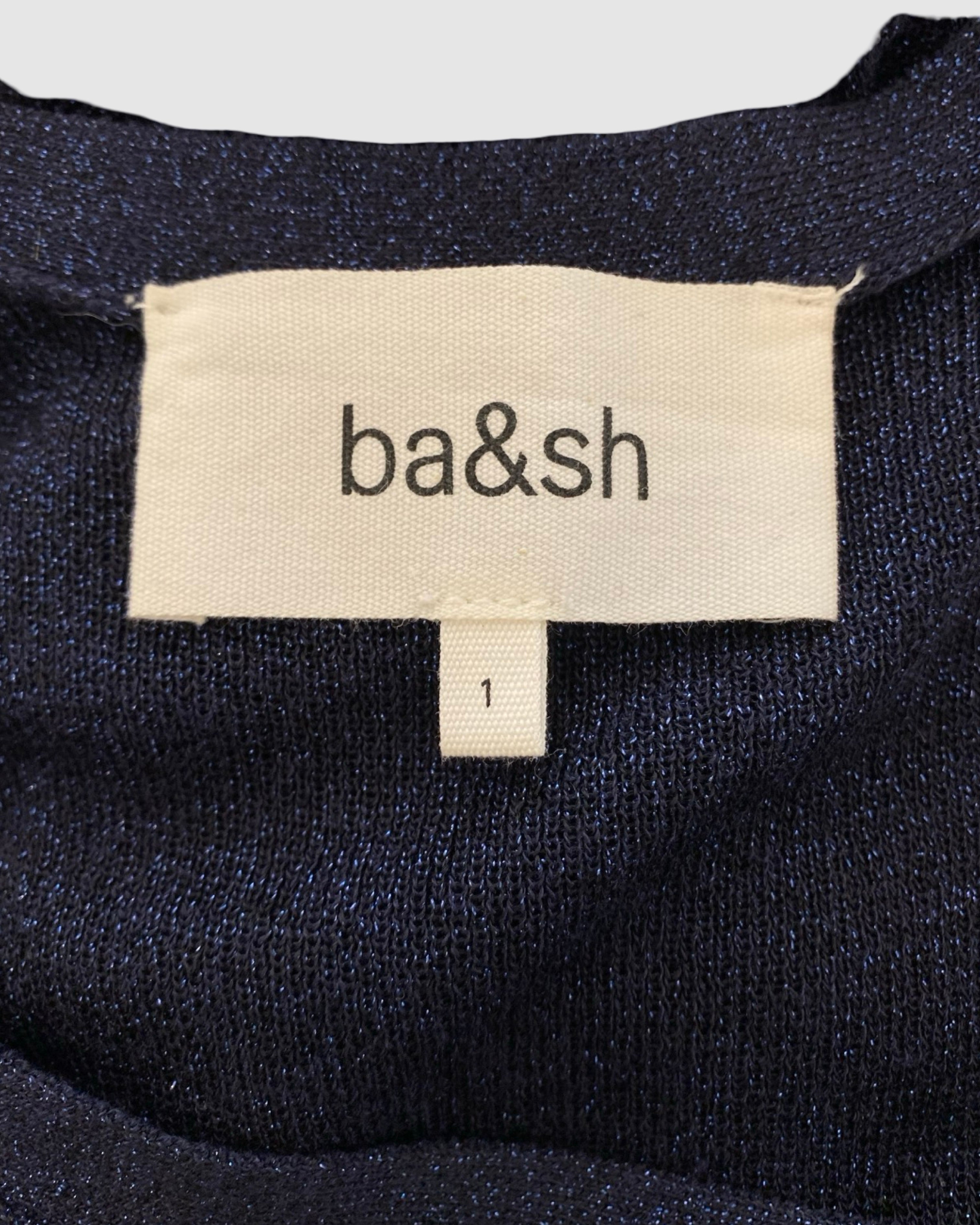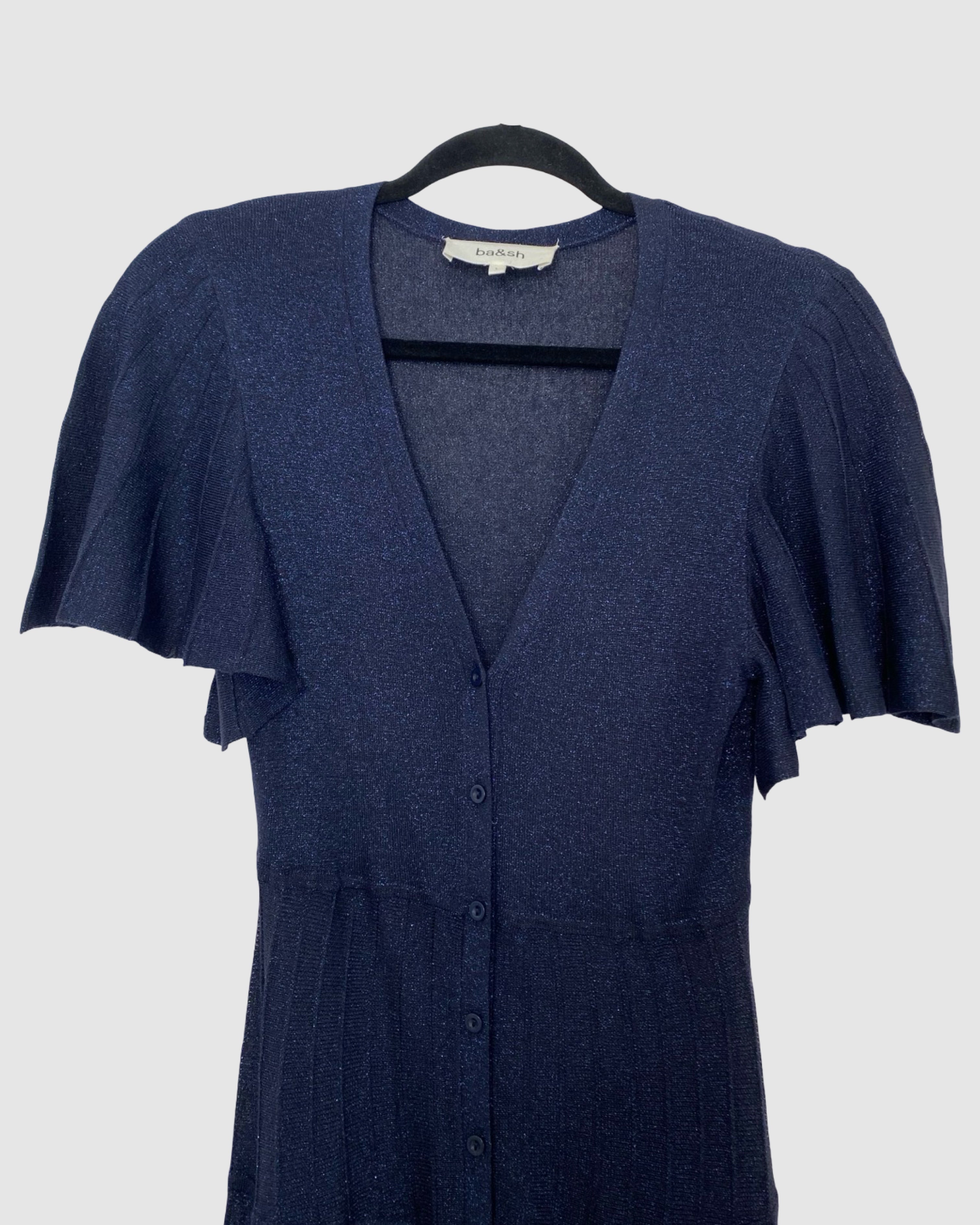 Shimmering and elegant, this ba&sh long dress features a blue glitter finish with a fluid, flowy silhouette and a subtle slit for added movement. Designed to catch the light beautifully, it creates a striking yet feminine look—perfect for evening wear or special occasions. Size: S.