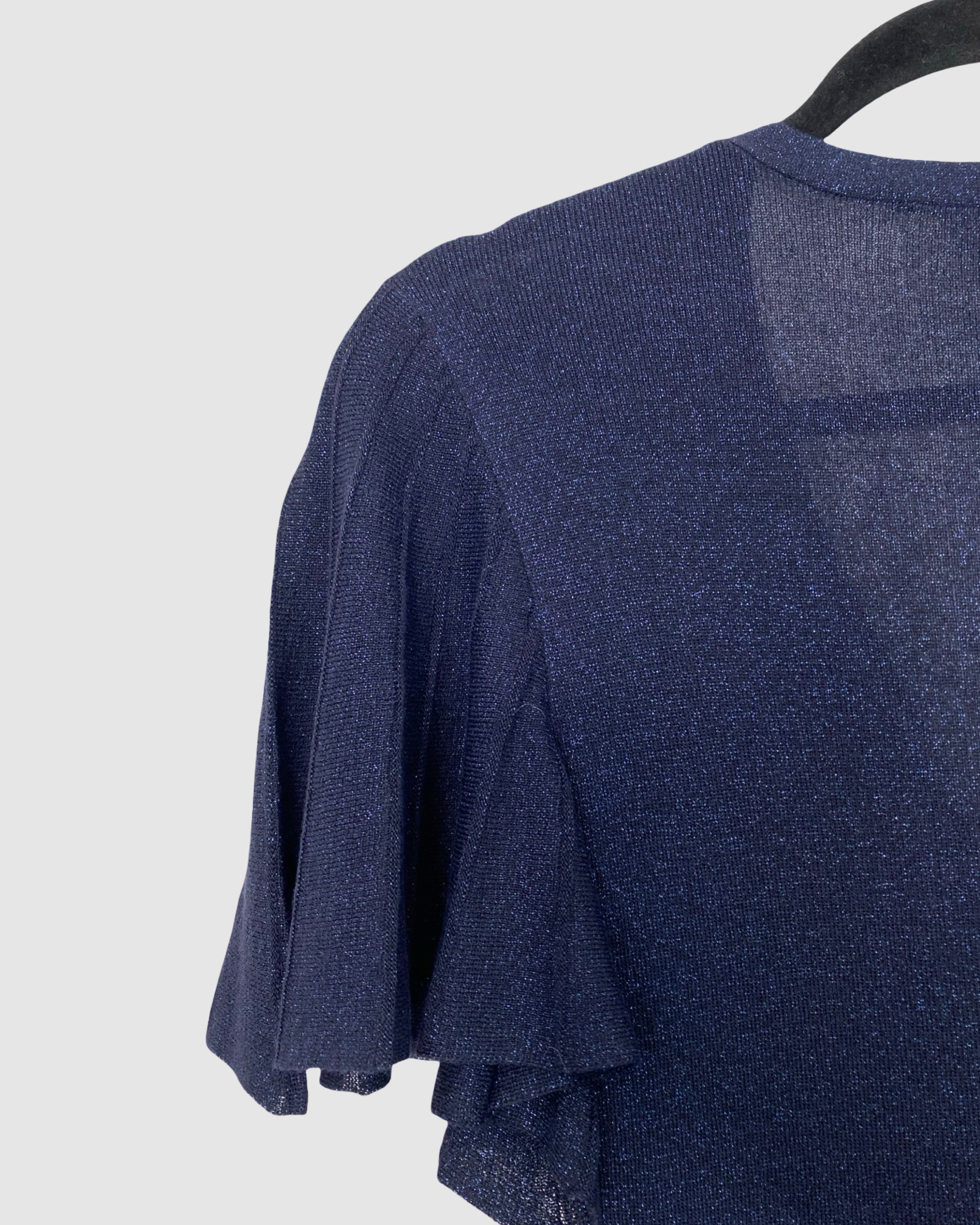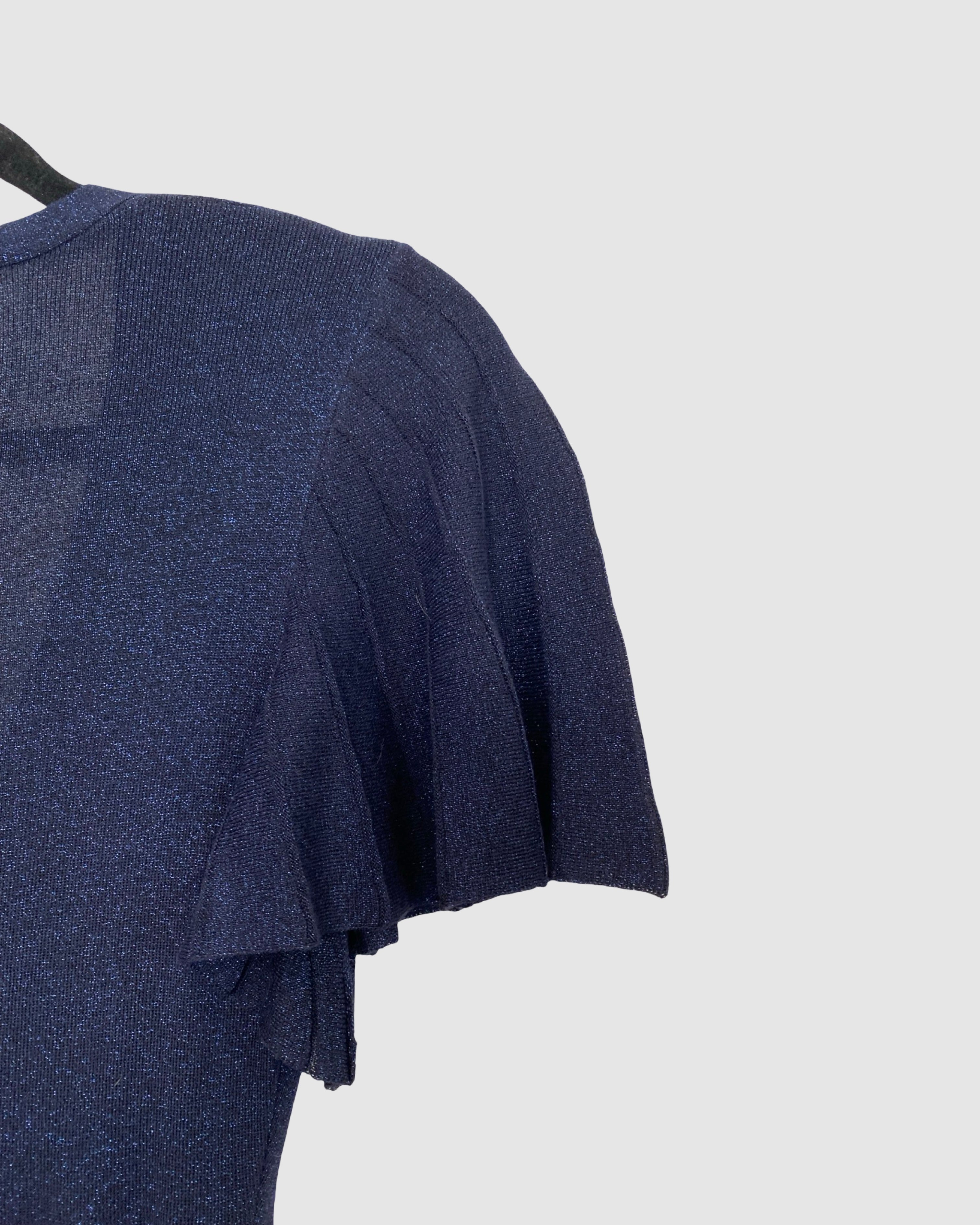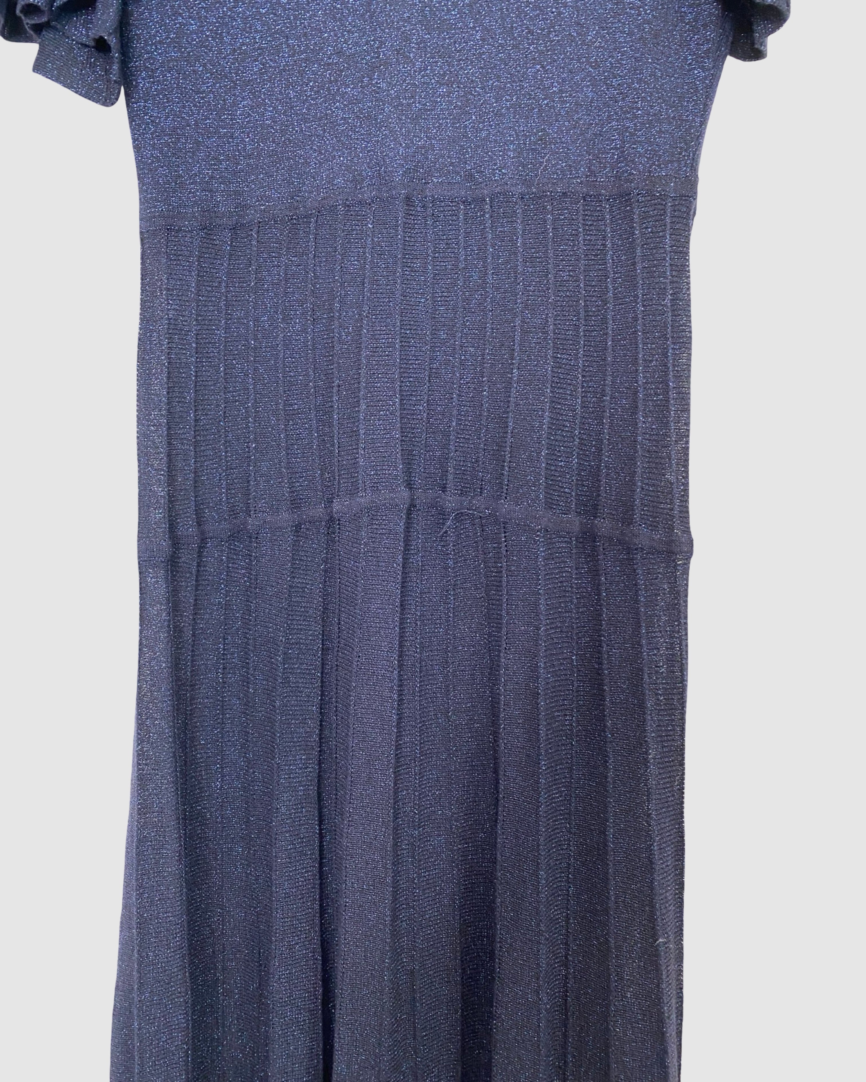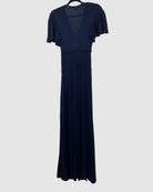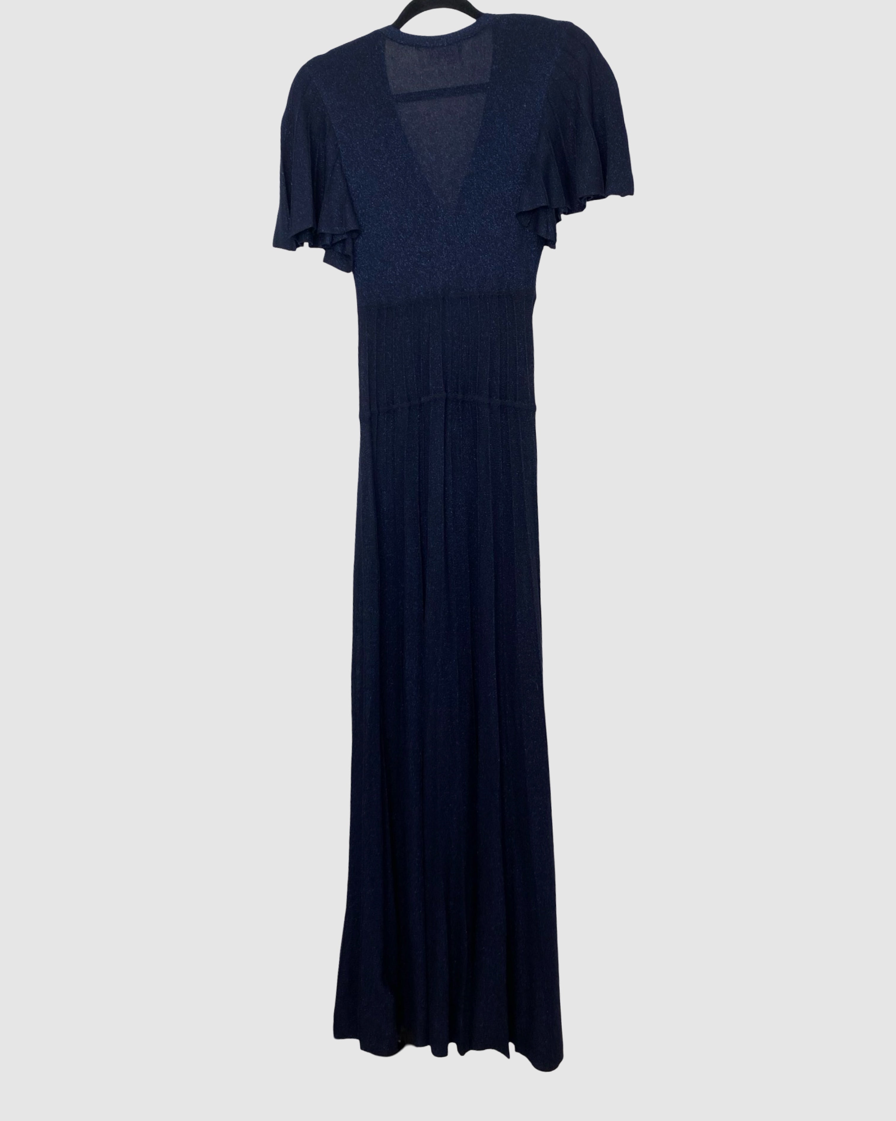 Shimmering and elegant, this ba&sh long dress features a blue glitter finish with a fluid, flowy silhouette and a subtle slit for added movement. Designed to catch the light beautifully, it creates a striking yet feminine look—perfect for evening wear or special occasions. Size: S.