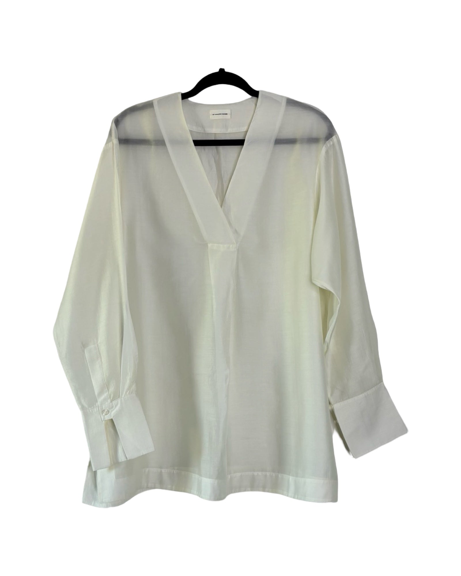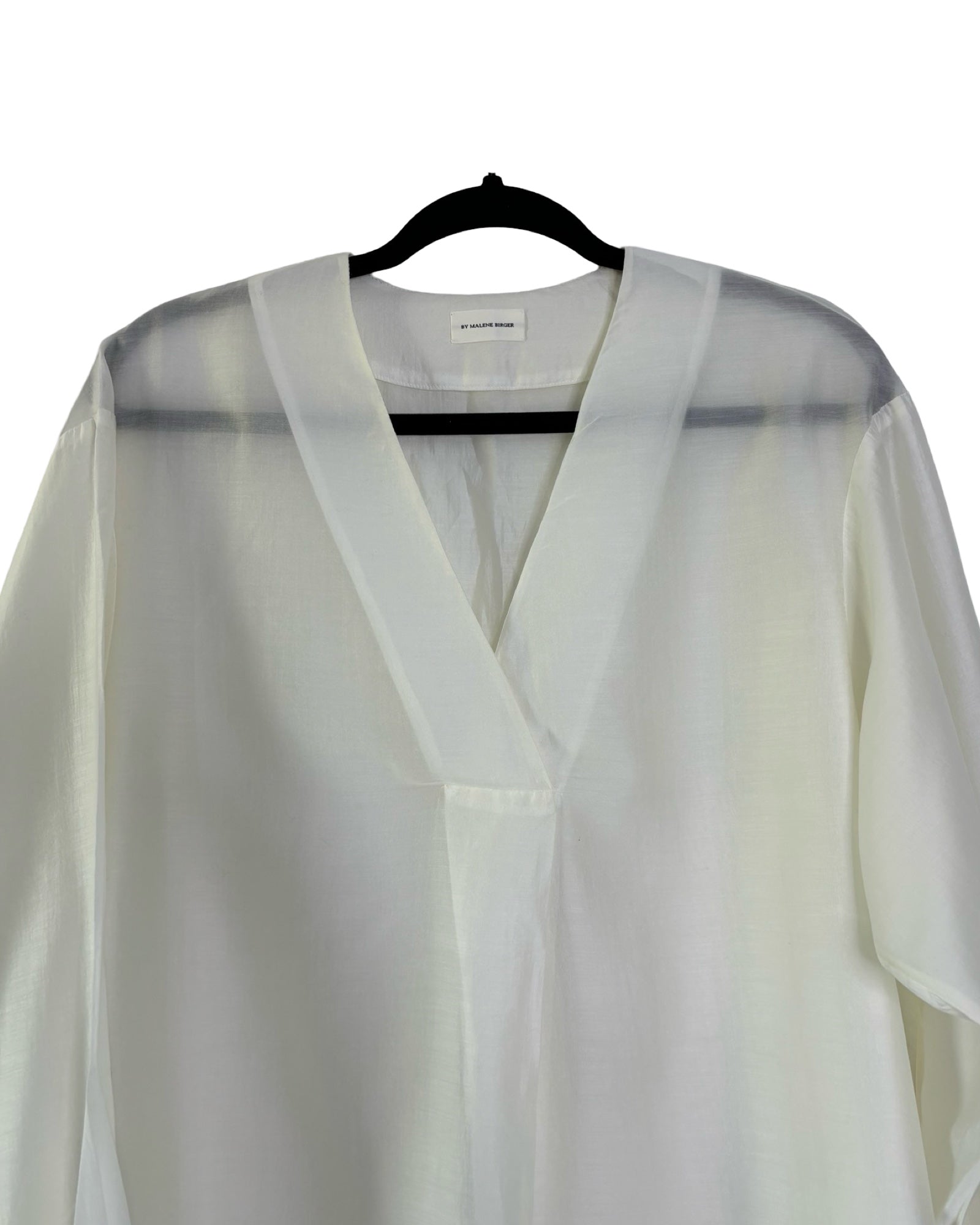 Get ready to feel effortlessly chic in the By Malene Birger blouse. Made from a luxurious silk blend material, this off-white/beige blouse is the perfect addition to your summer wardrobe. With a flattering v-neckline and airy material and feminine accents on the sleeves, this blouse is as good as new and will make you stand out in any crowd.