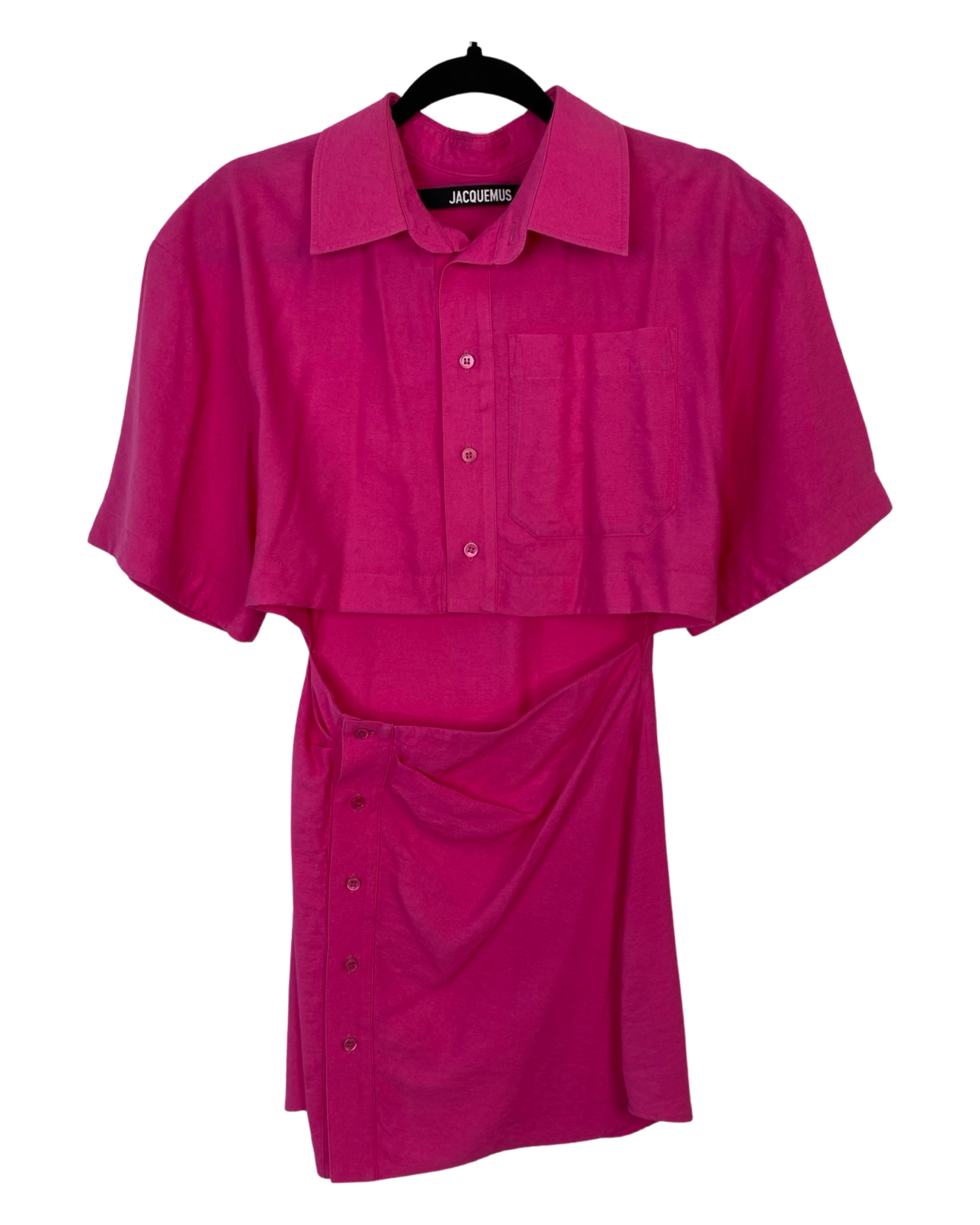 Feel fabulous in our Jacquemus dress! Made with a soft viscose and polyamide blend, this mini dress features a hot pink color and playful cut-outs. The length of 85 cm and fitted waist of 30 cm will accentuate your figure. In great condition, with little signs of wear.
